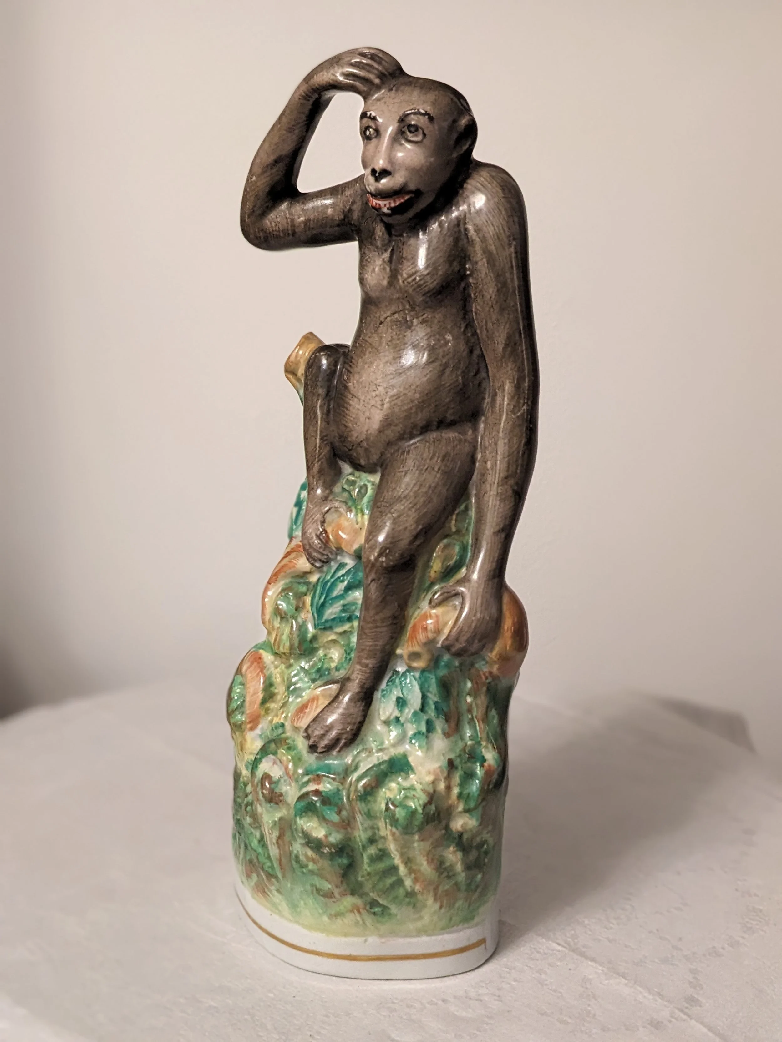 A rare 19th century Staffordshire figure of a monkey sitting atop a pile of bananas