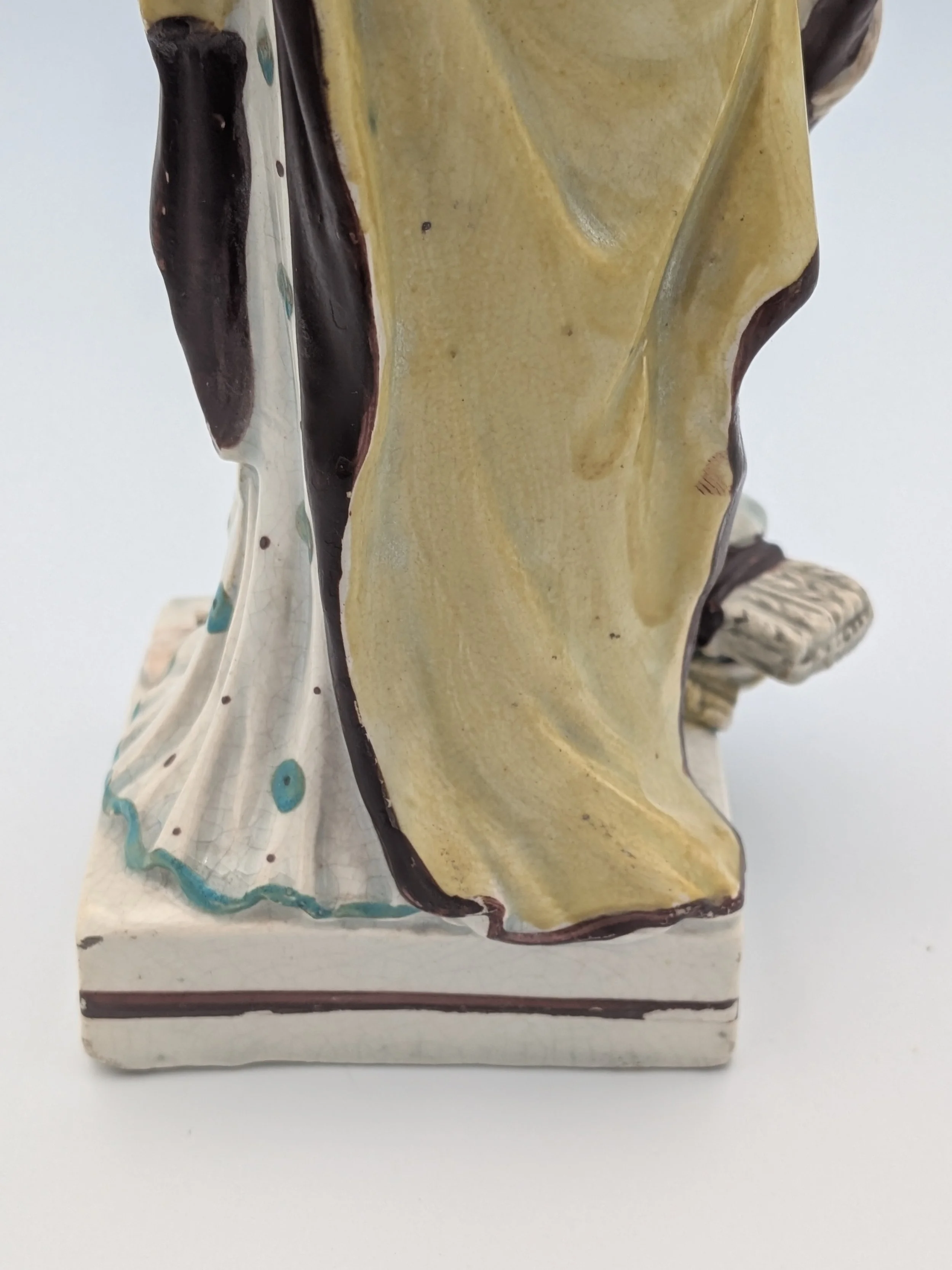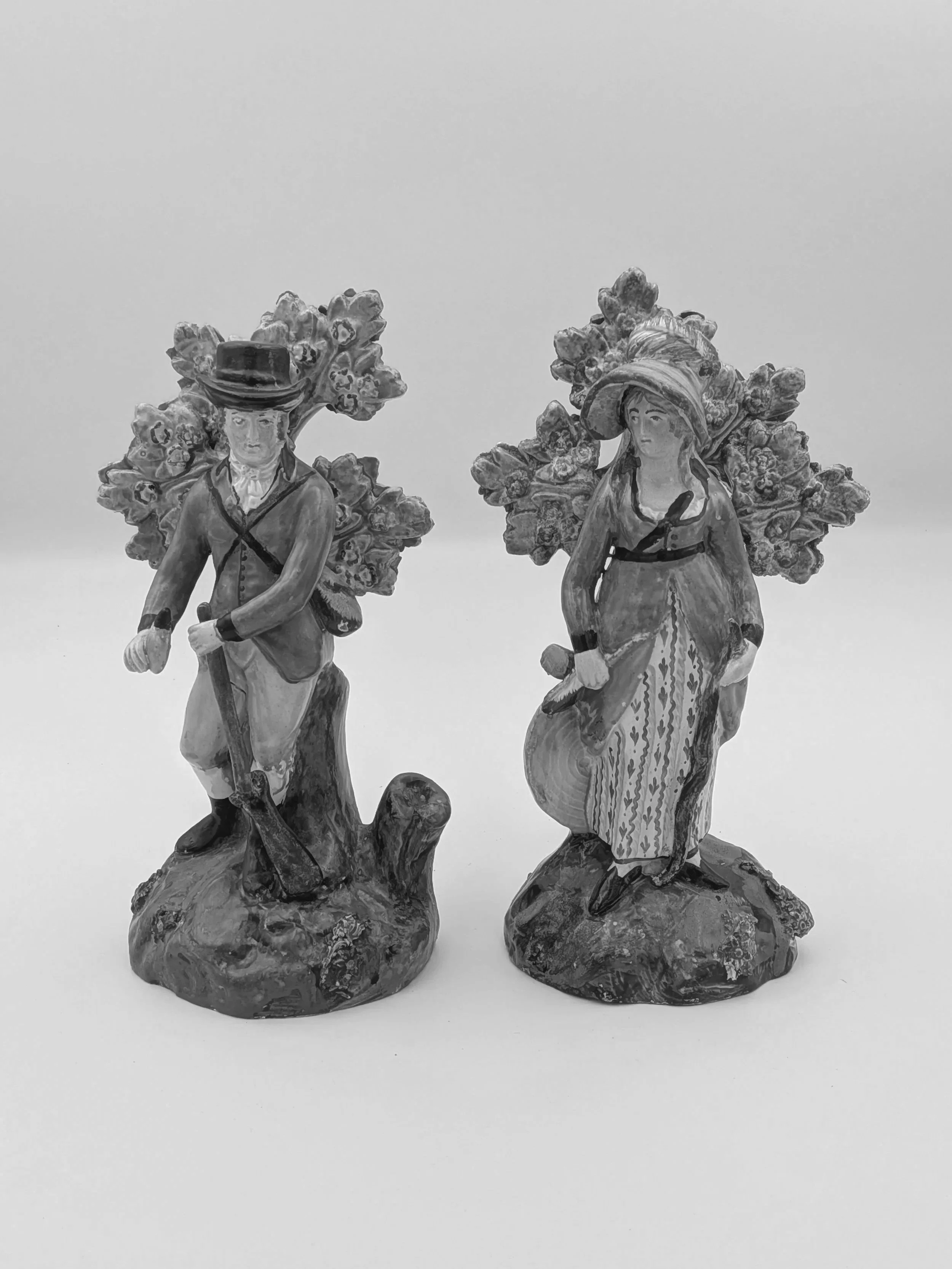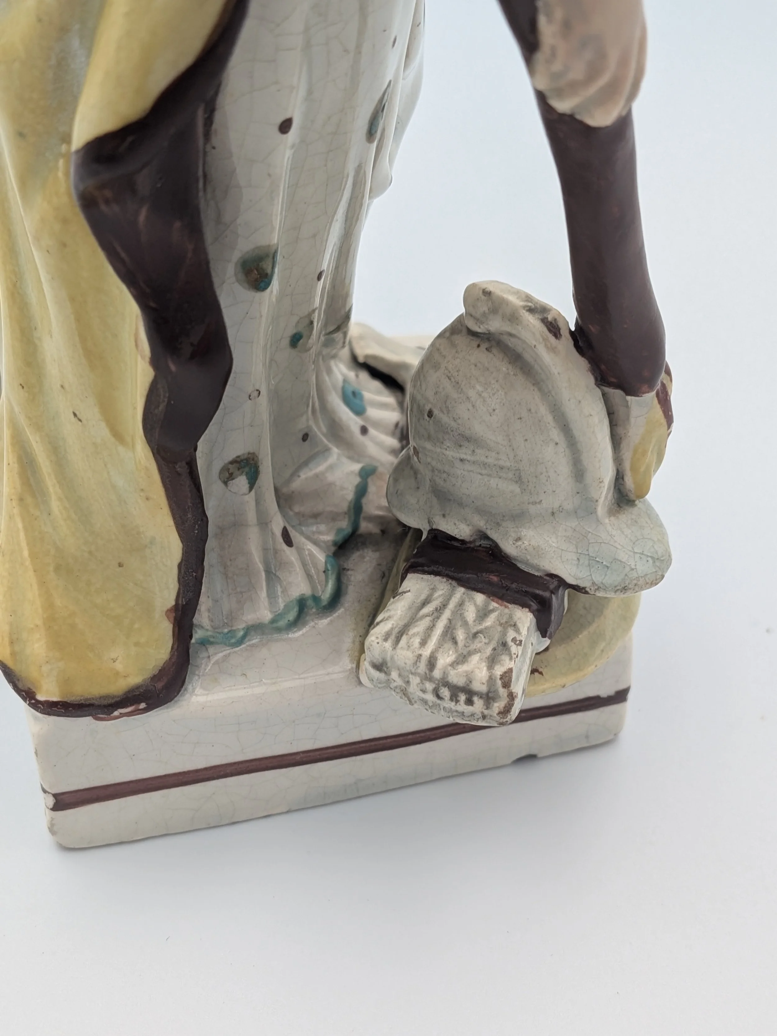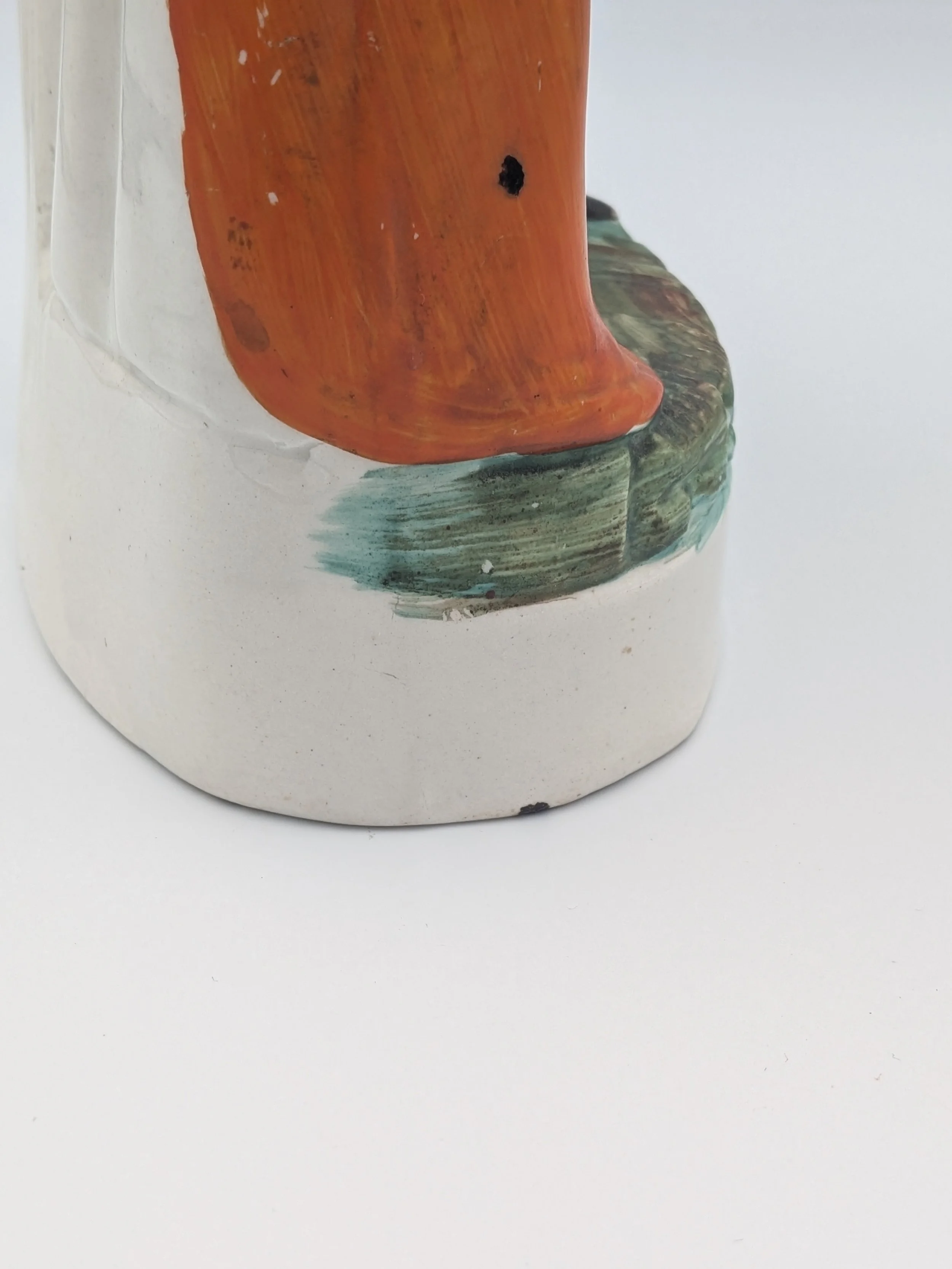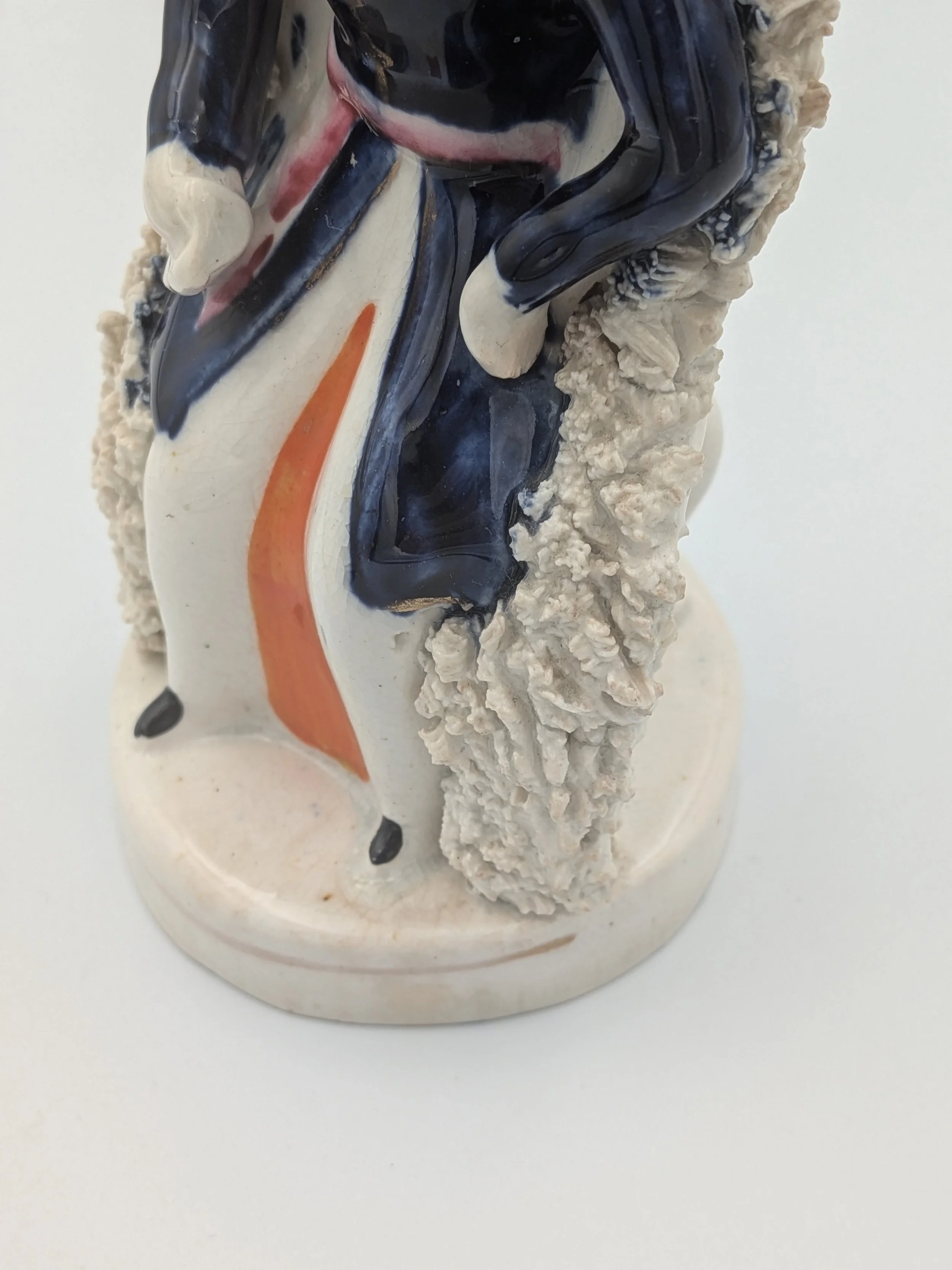 Staffordshire earthenware figures were produced from the late 18th century to the mid 20th century. Early (pre-1840) Staffordshire figures tend to be decorated ‘in the round’ and fairly elaborate with several handmade, press-moulded components including separately crafted limbs and bocage (leaves).