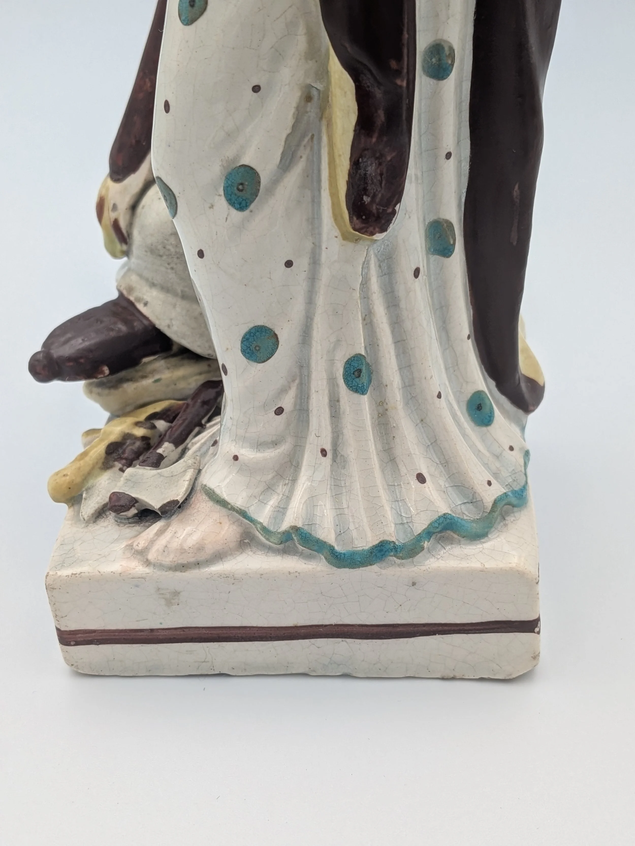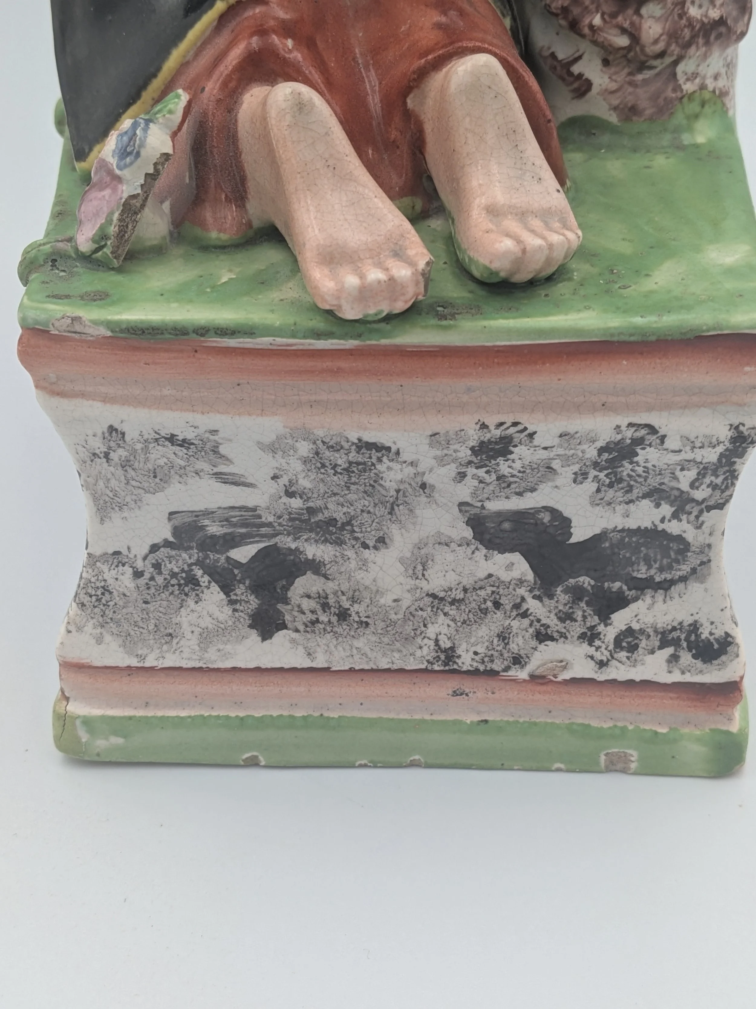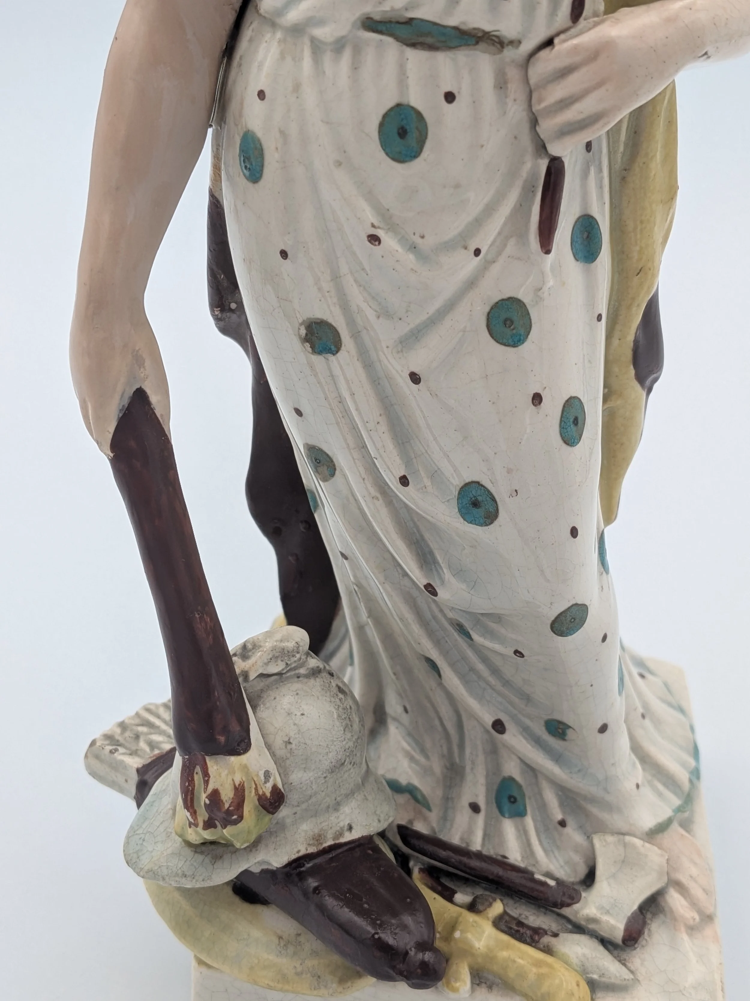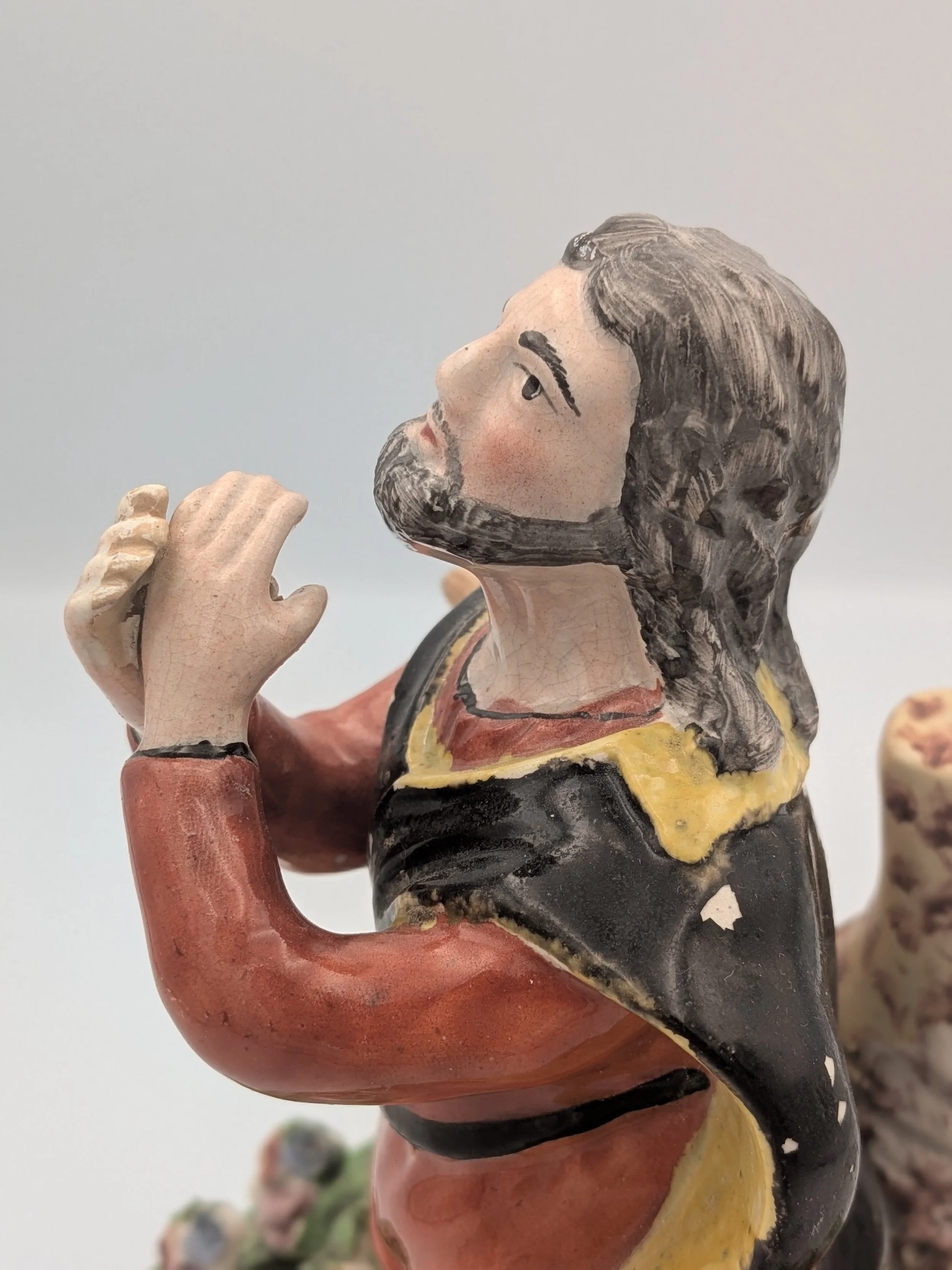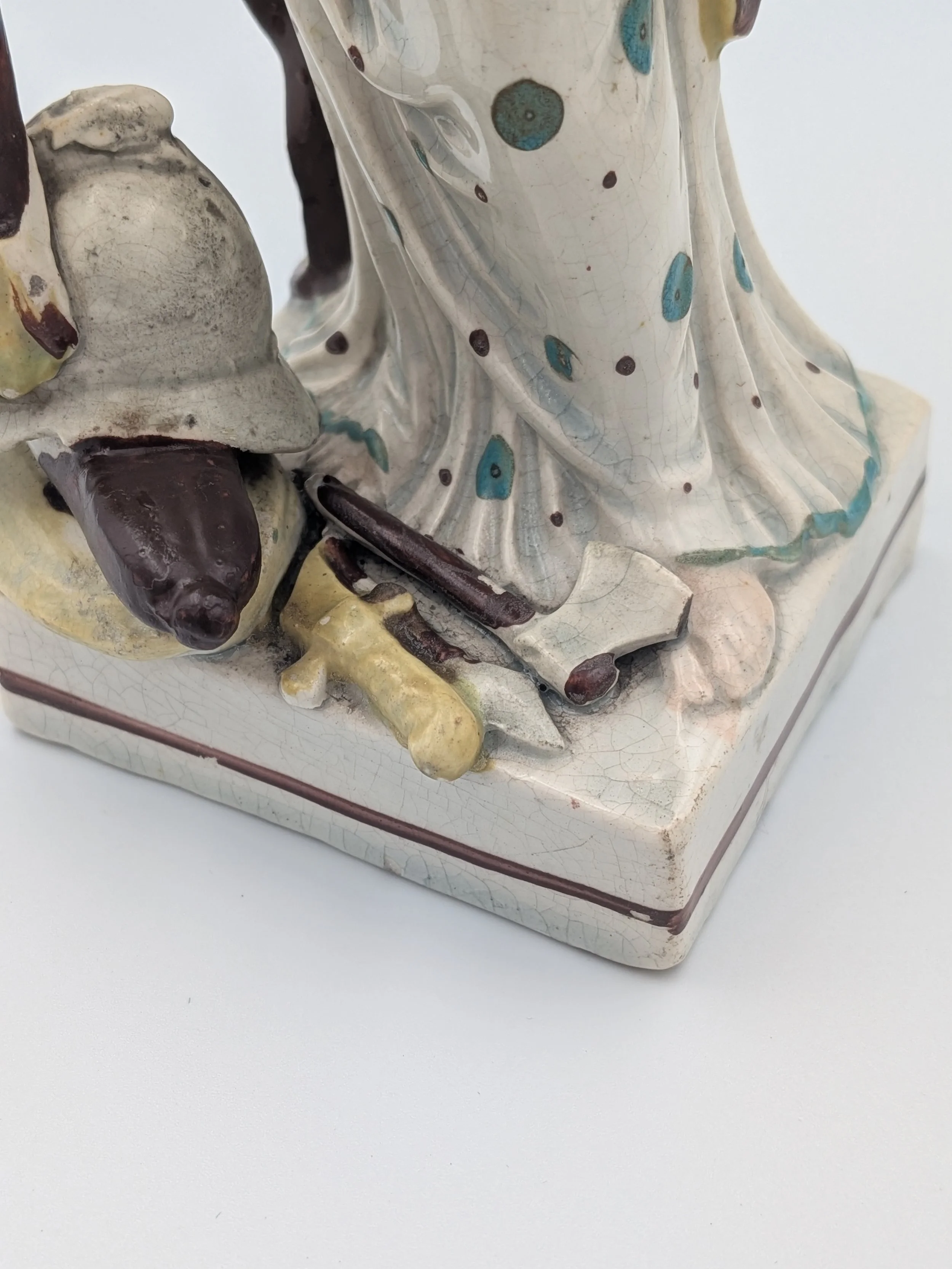Staffordshire earthenware figures were produced from the late 18th century to the mid 20th century. Early (pre-1840) Staffordshire figures tend to be decorated ‘in the round’ and fairly elaborate with several handmade, press-moulded components including separately crafted limbs and bocage (leaves).
