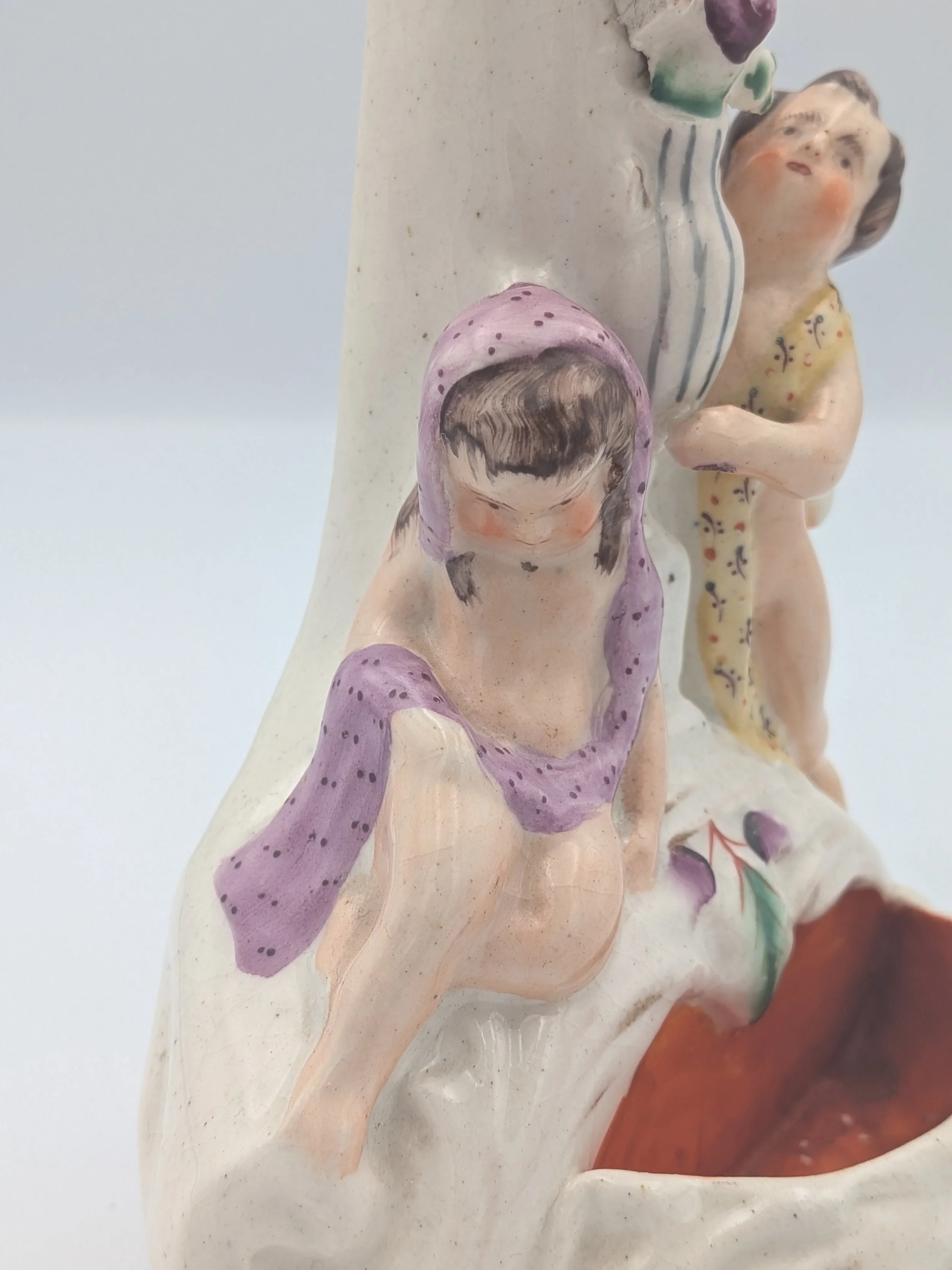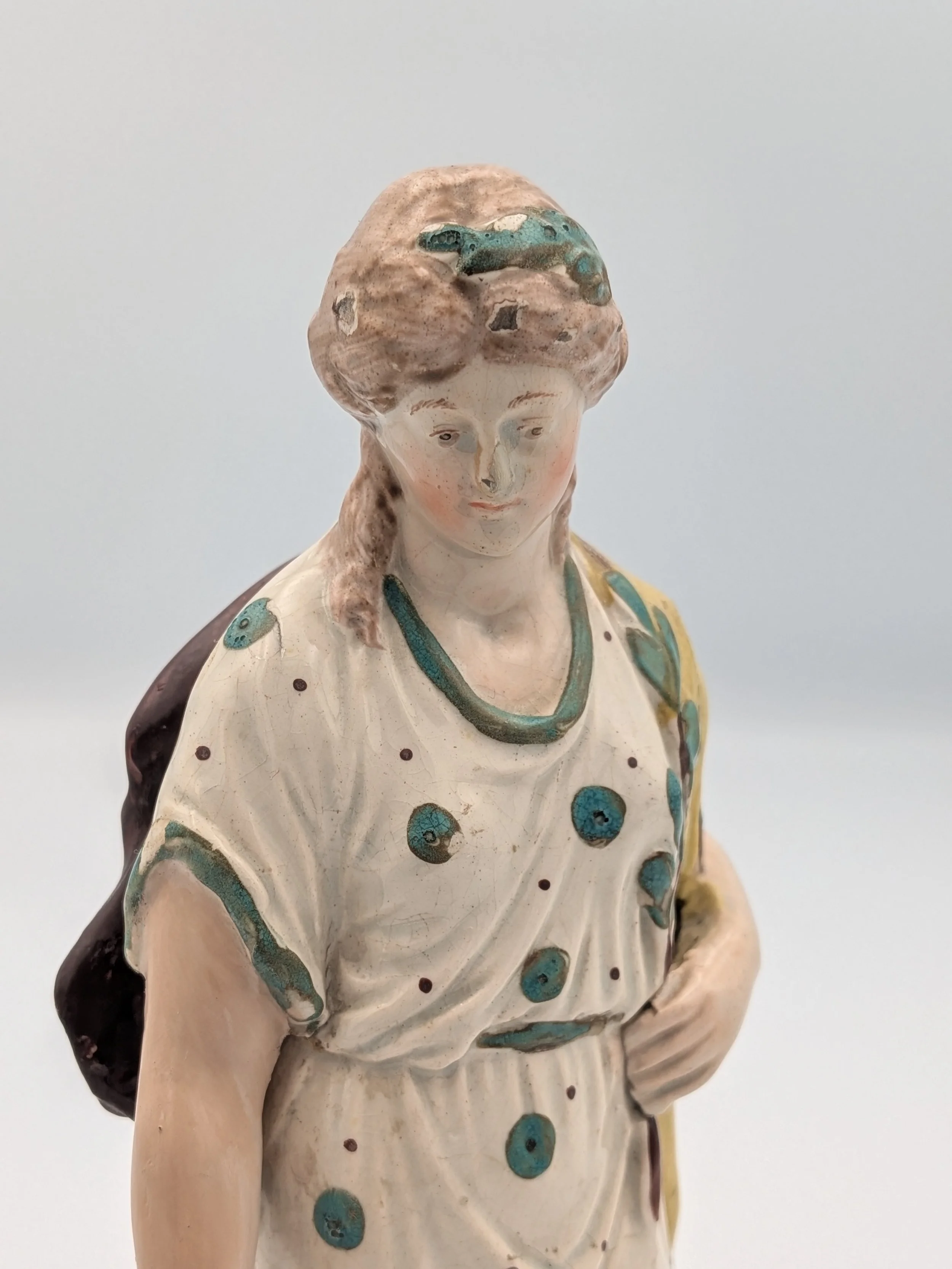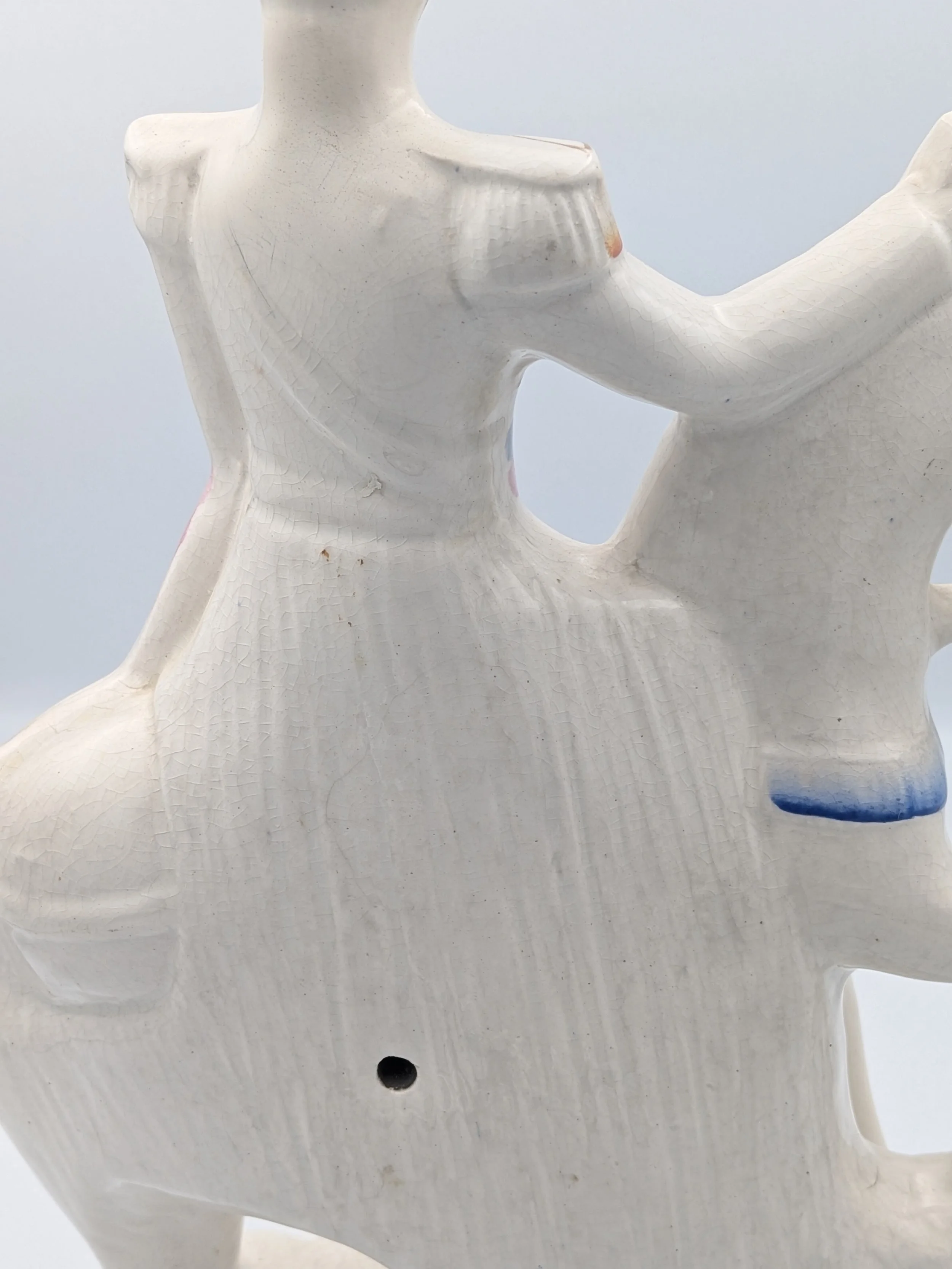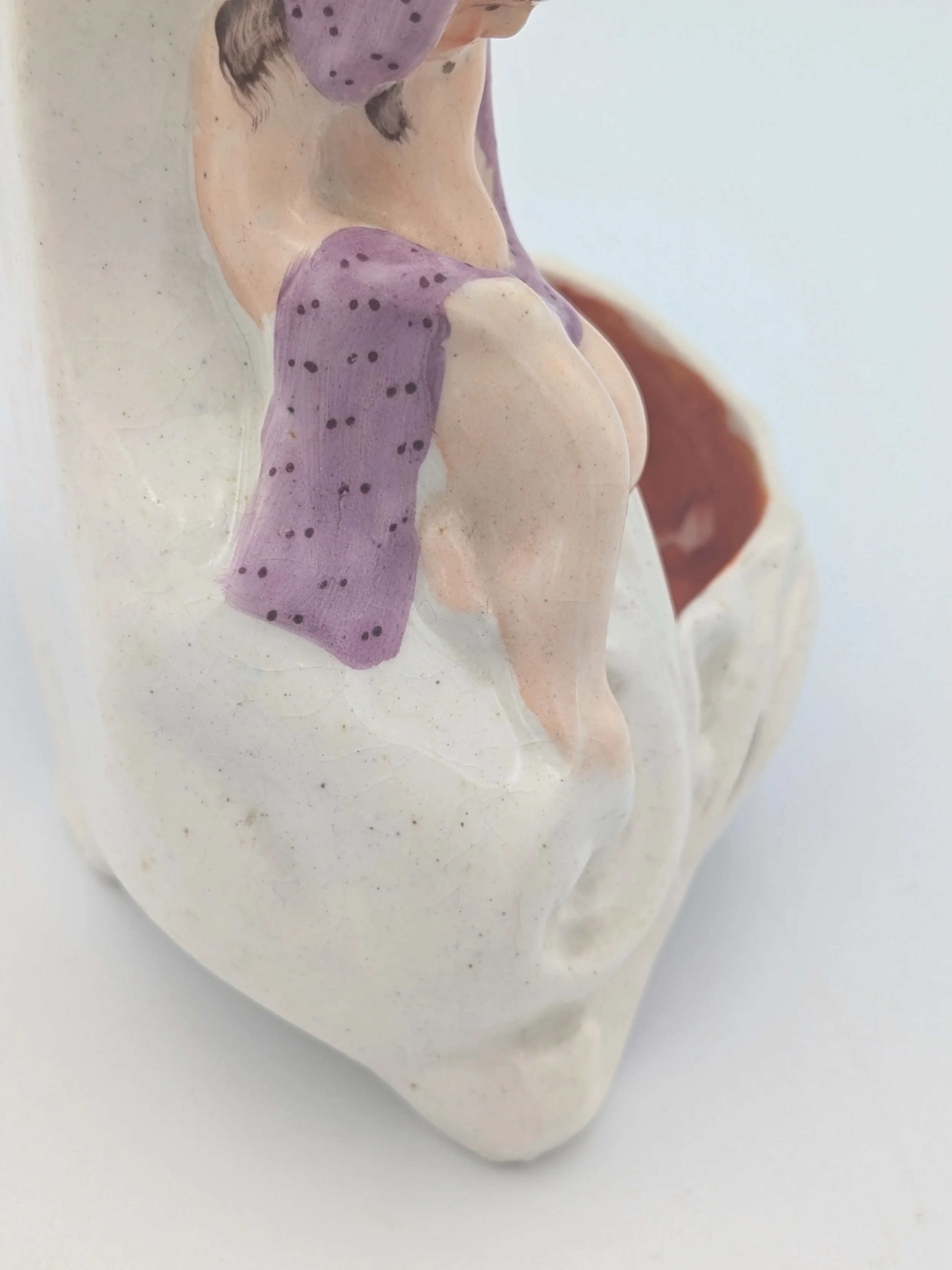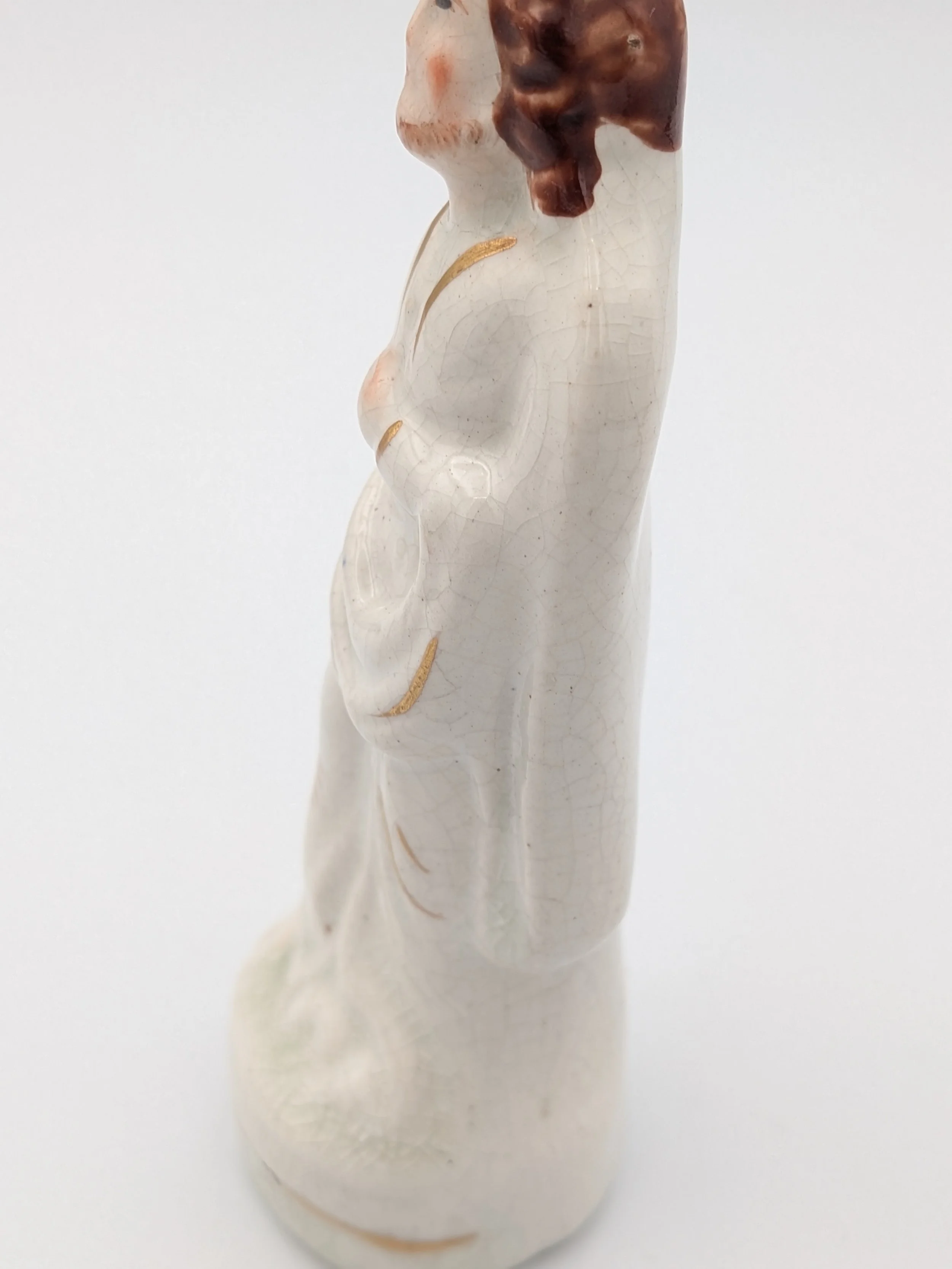 Staffordshire earthenware figures were produced from the late 18th century to the mid 20th century. Early (pre-1840) Staffordshire figures tend to be decorated ‘in the round’ and fairly elaborate with several handmade, press-moulded components including separately crafted limbs and bocage (leaves).