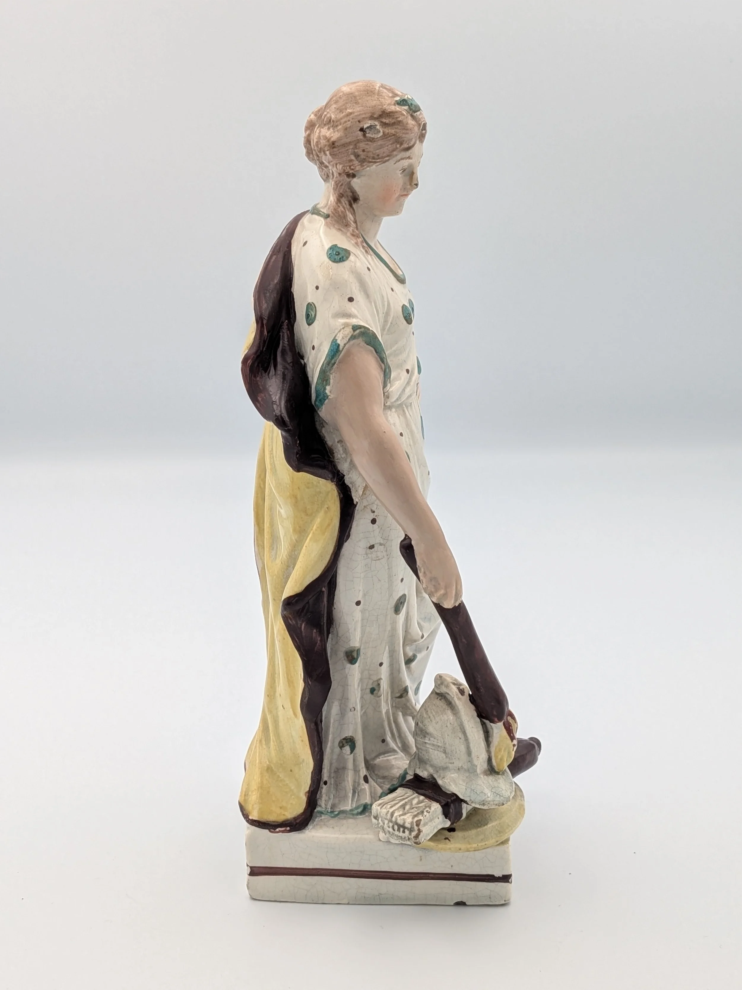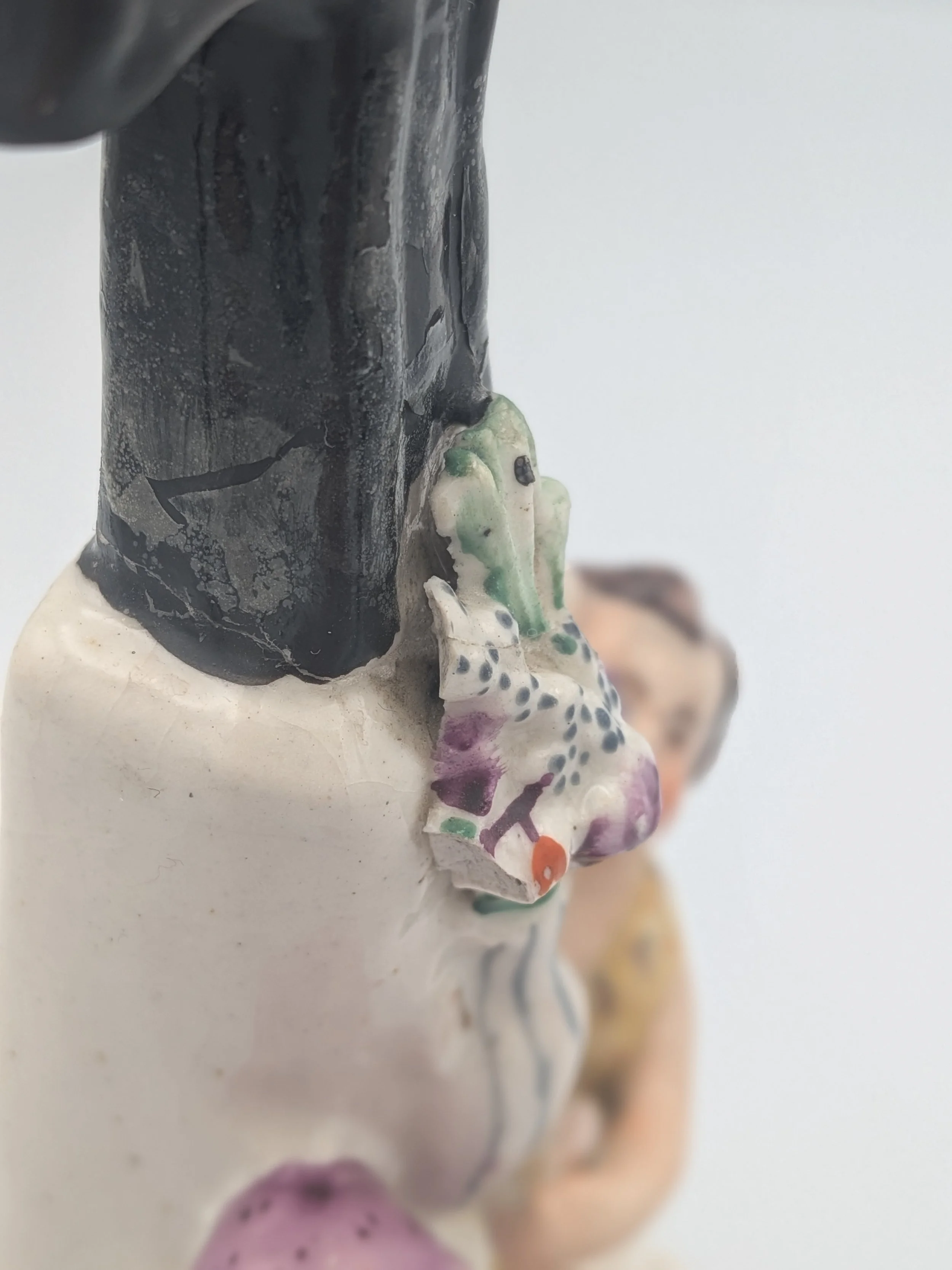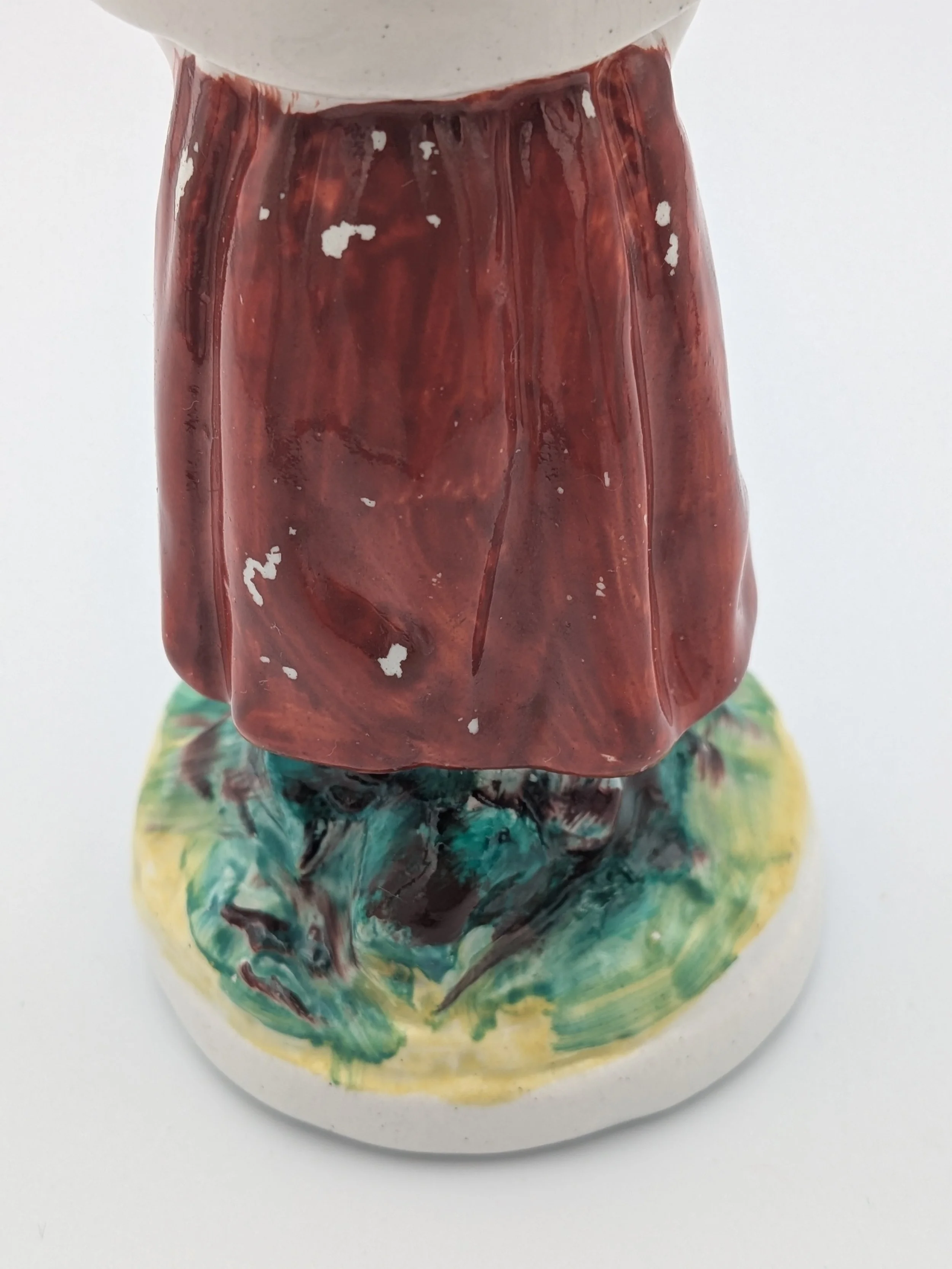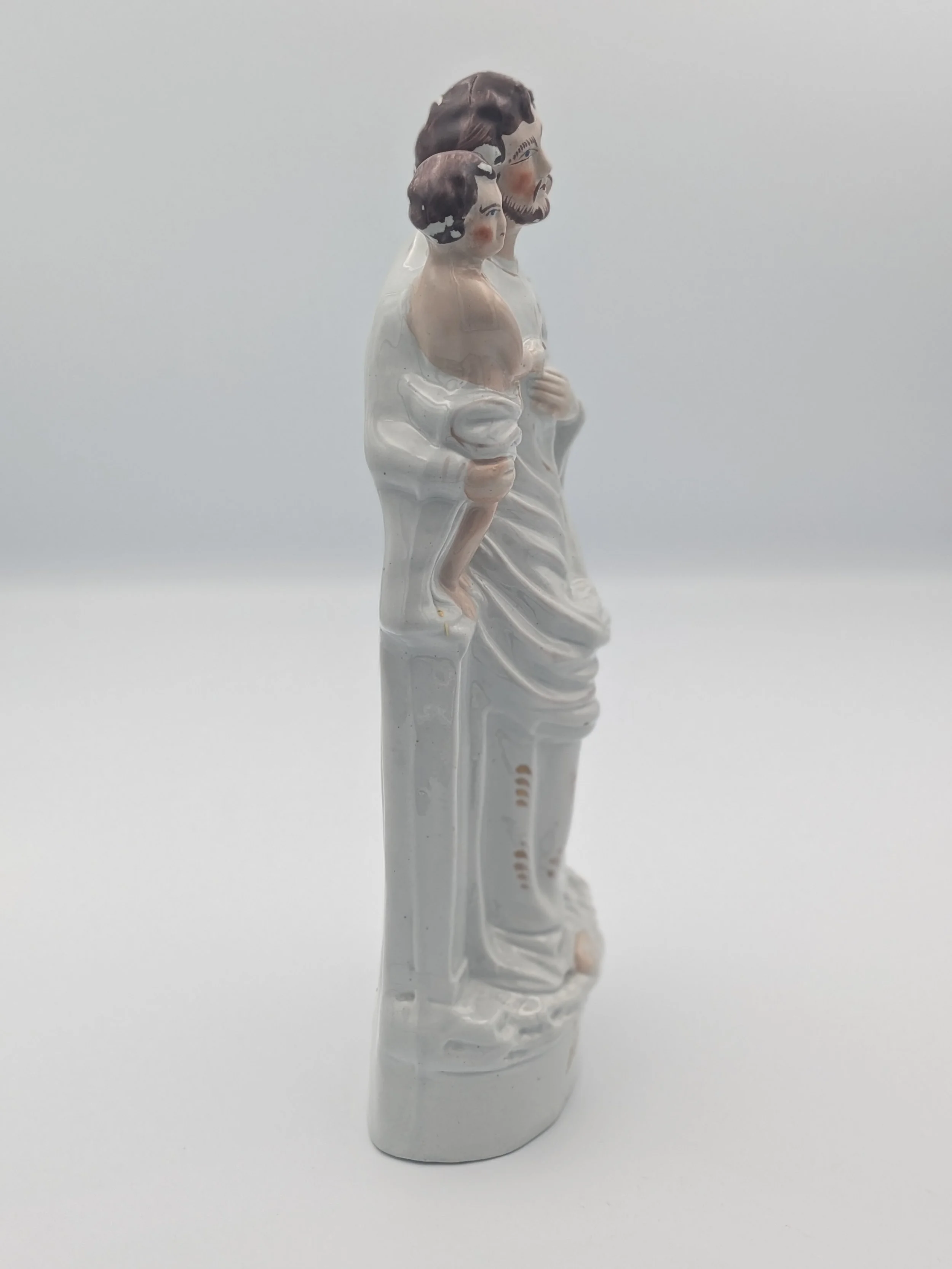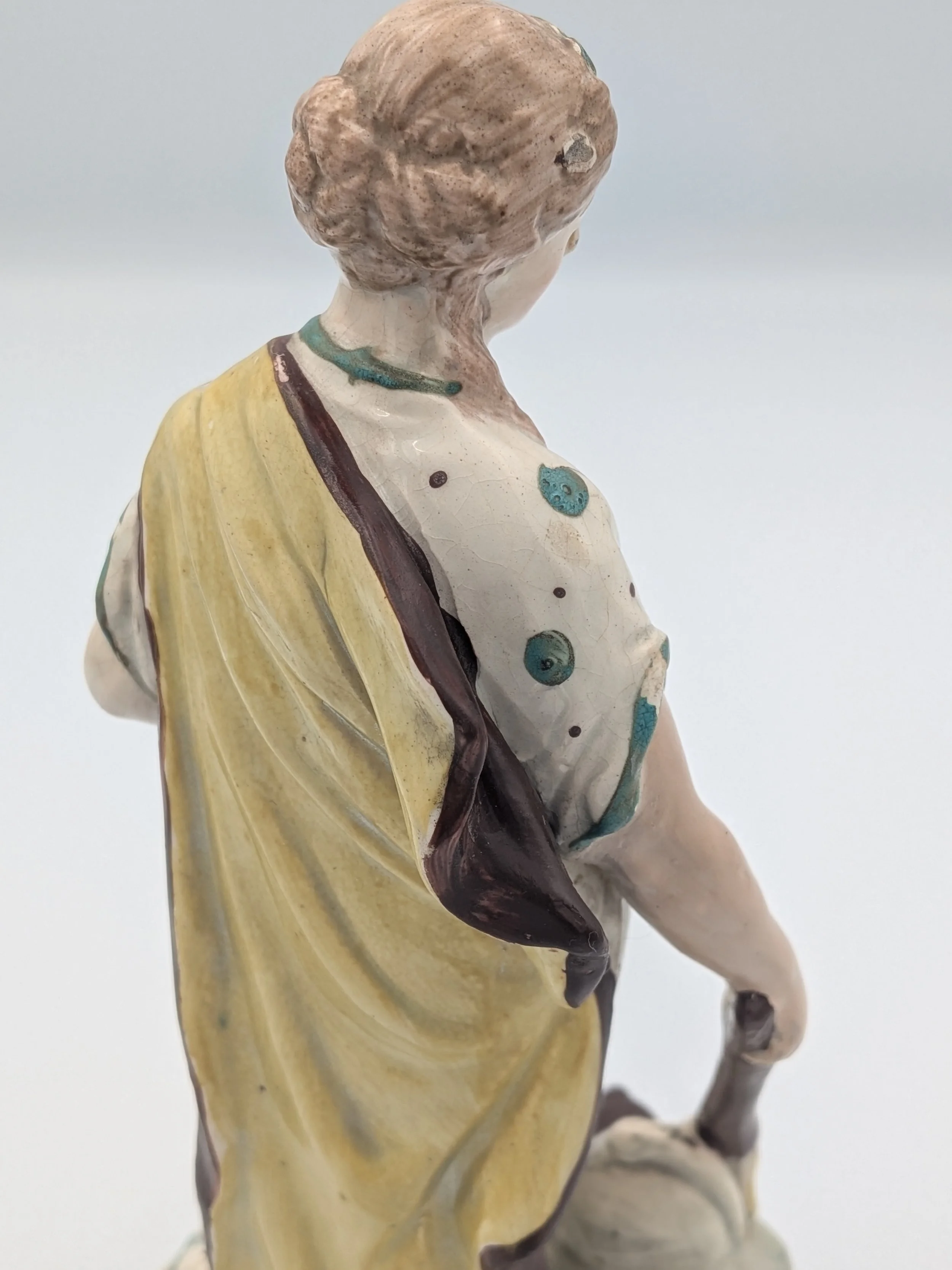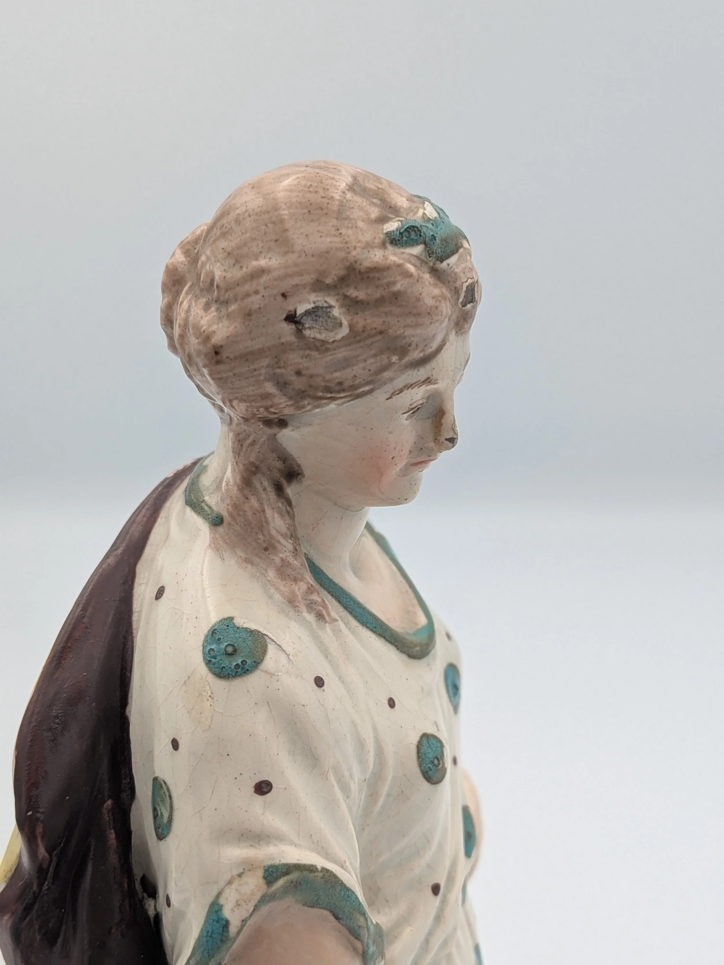 Staffordshire earthenware figures were produced from the late 18th century to the mid 20th century. Early (pre-1840) Staffordshire figures tend to be decorated ‘in the round’ and fairly elaborate with several handmade, press-moulded components including separately crafted limbs and bocage (leaves).