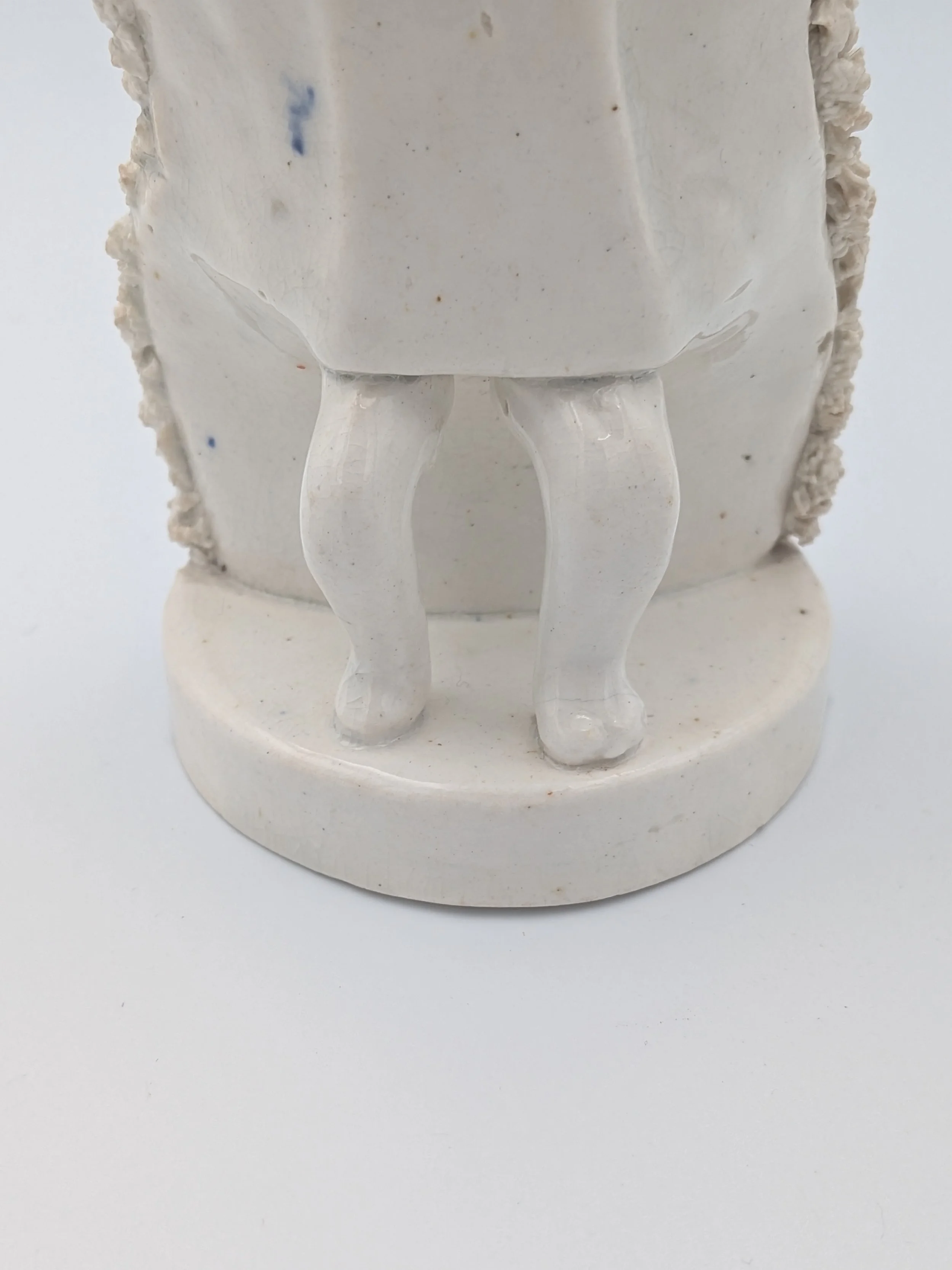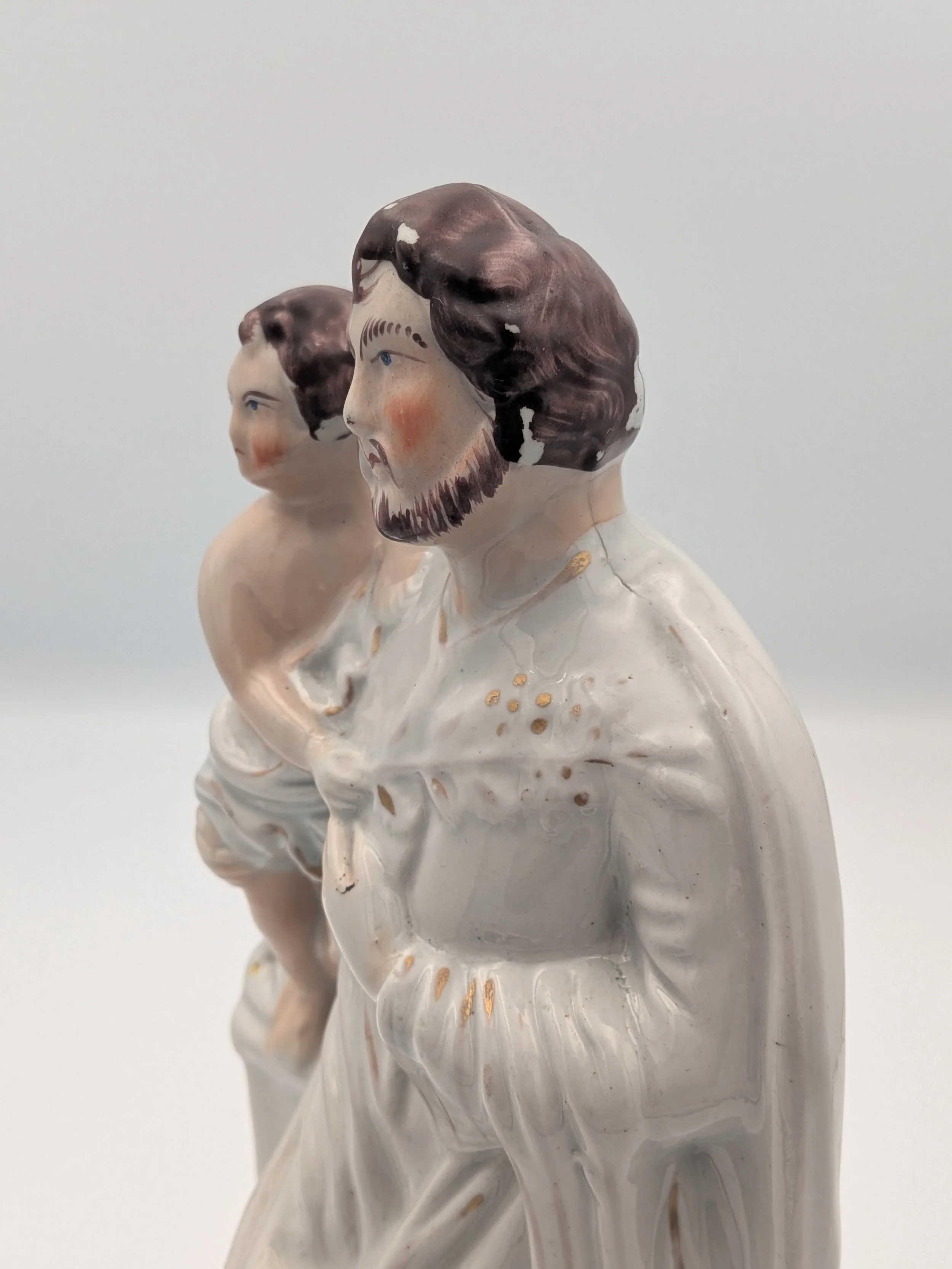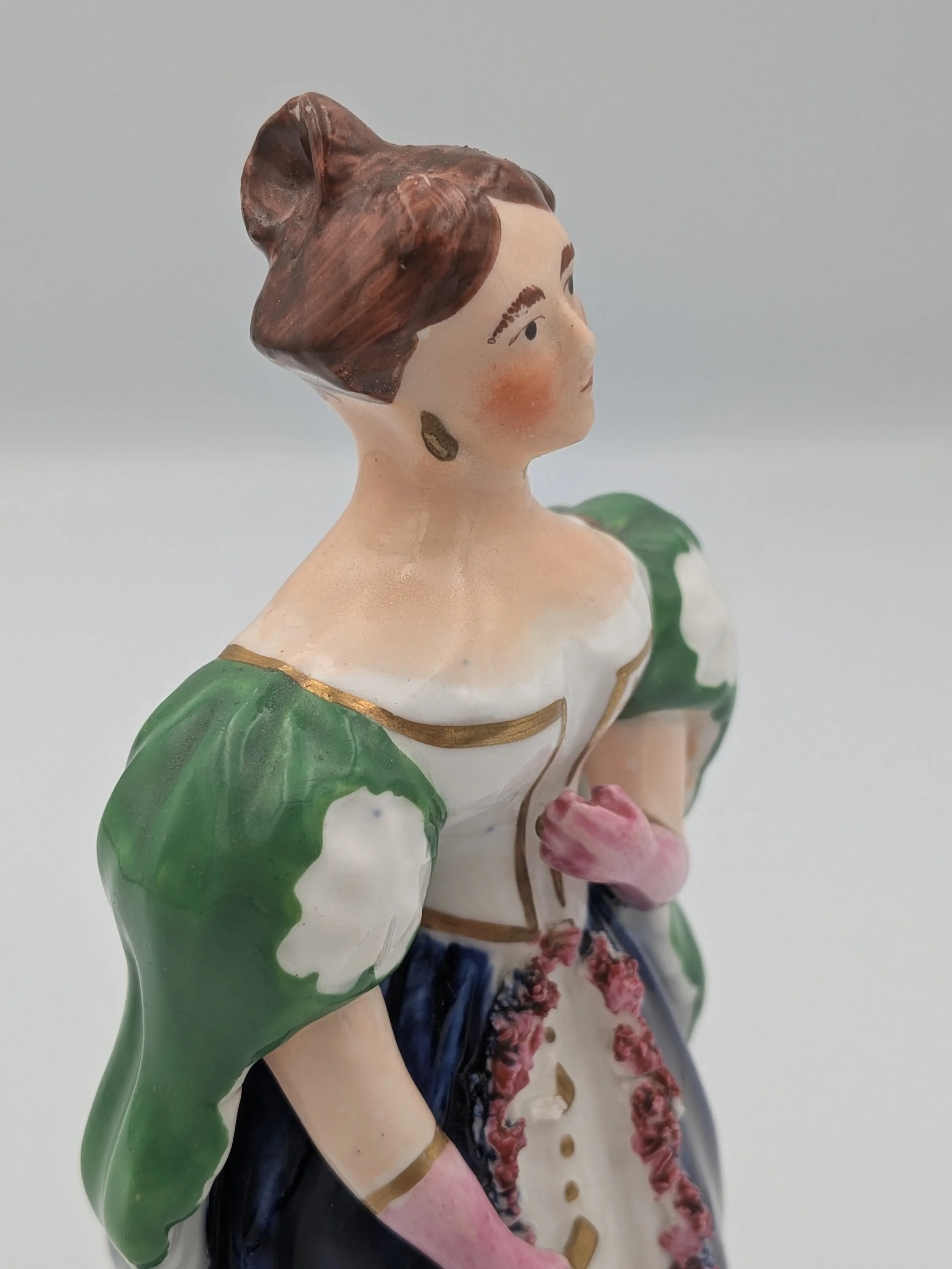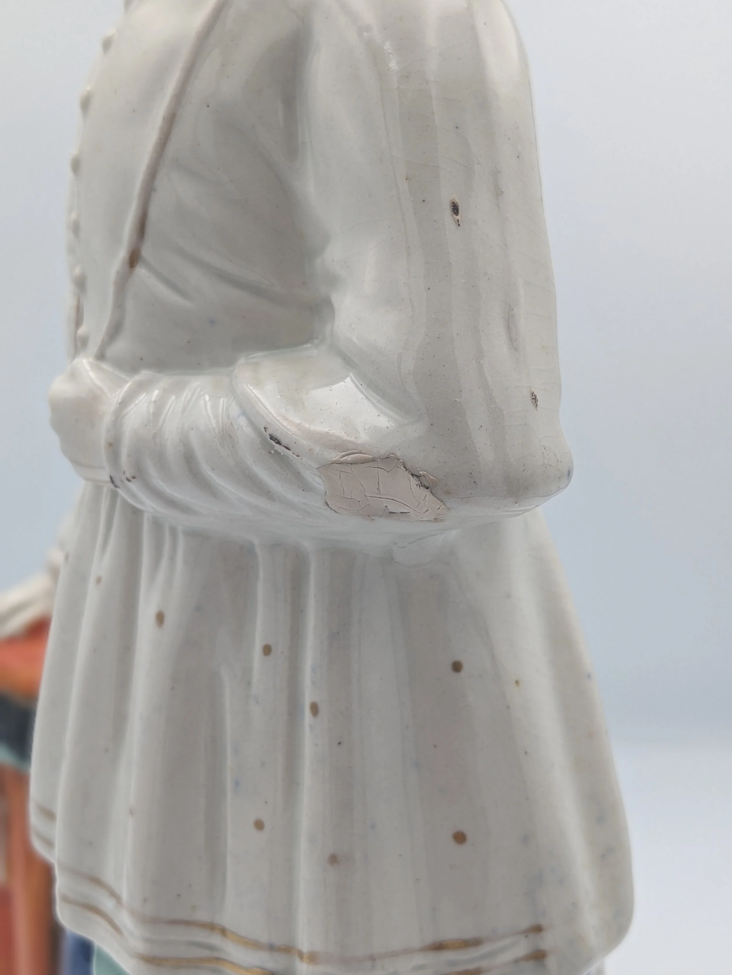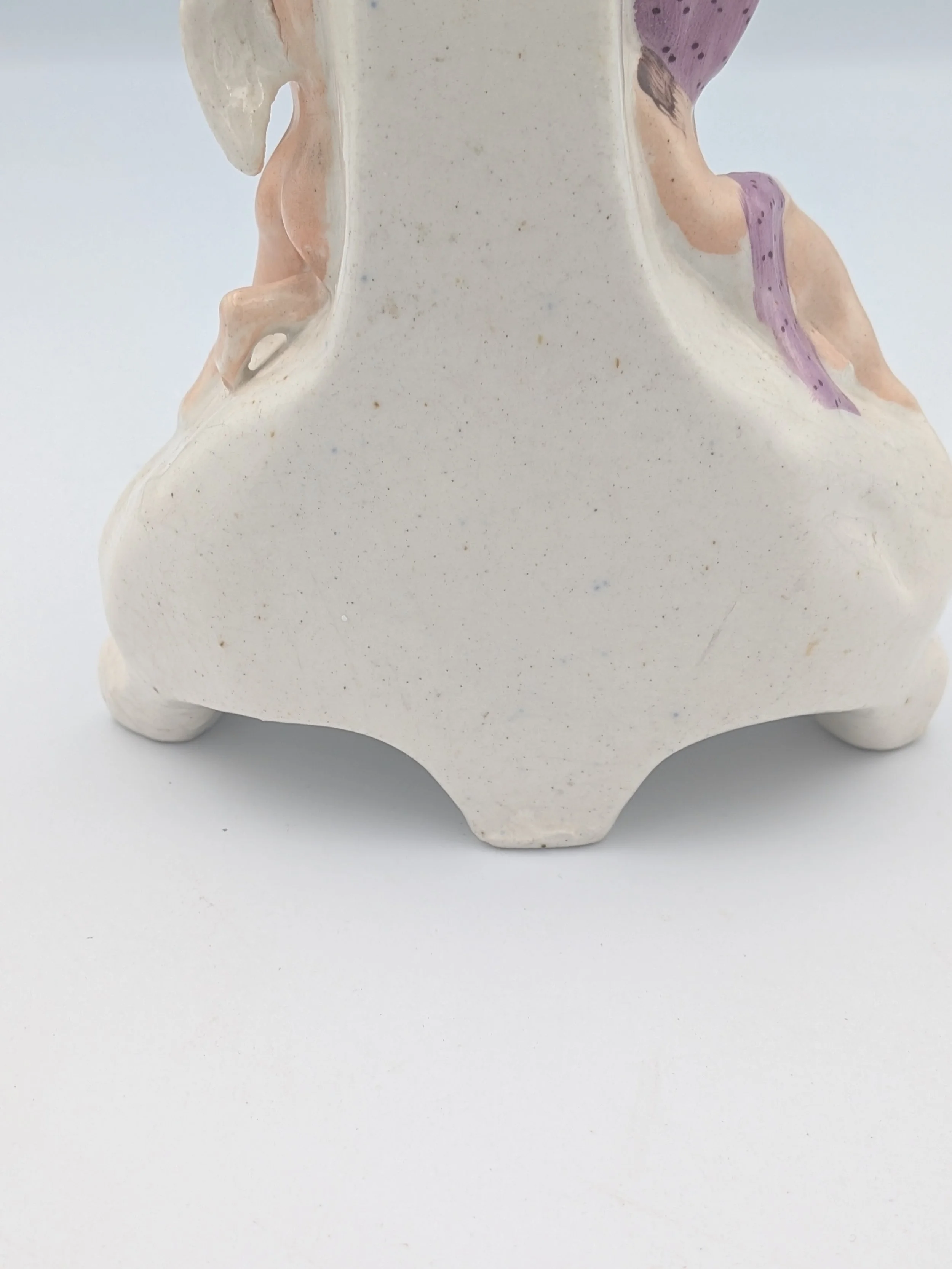 Staffordshire earthenware figures were produced from the late 18th century to the mid 20th century. Early (pre-1840) Staffordshire figures tend to be decorated ‘in the round’ and fairly elaborate with several handmade, press-moulded components including separately crafted limbs and bocage (leaves).