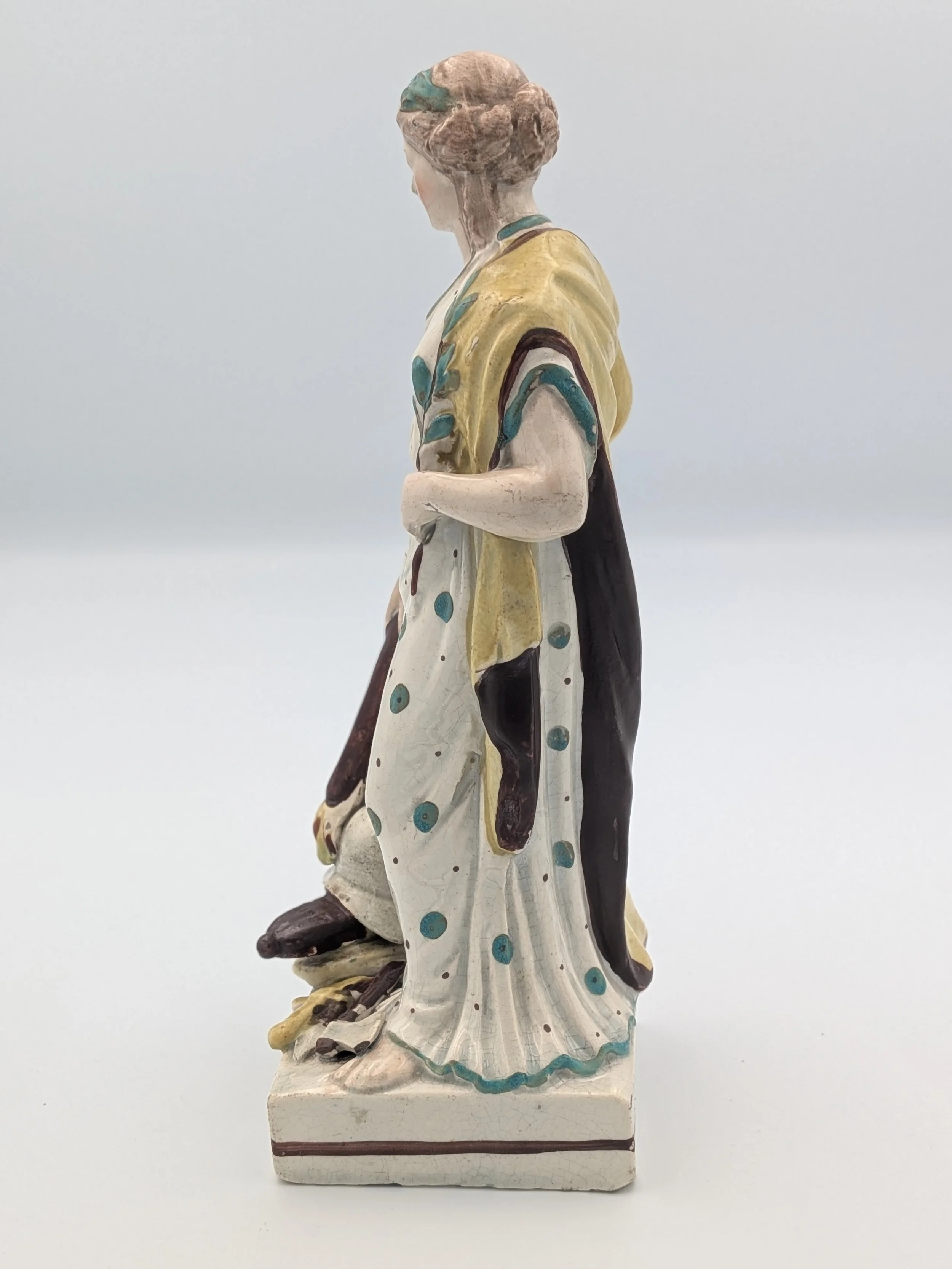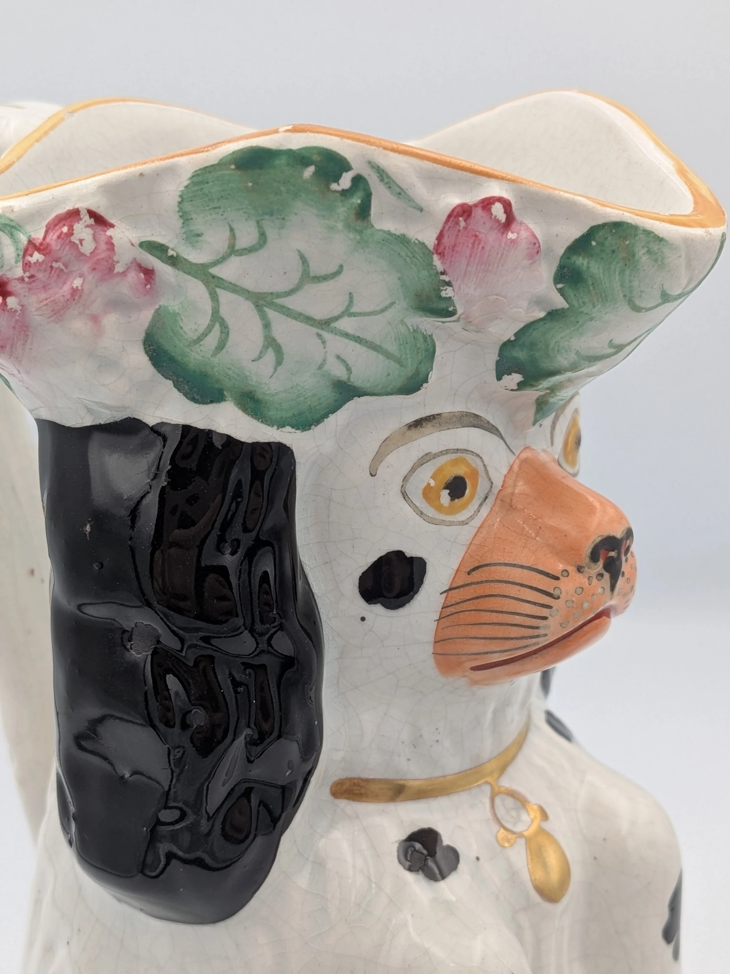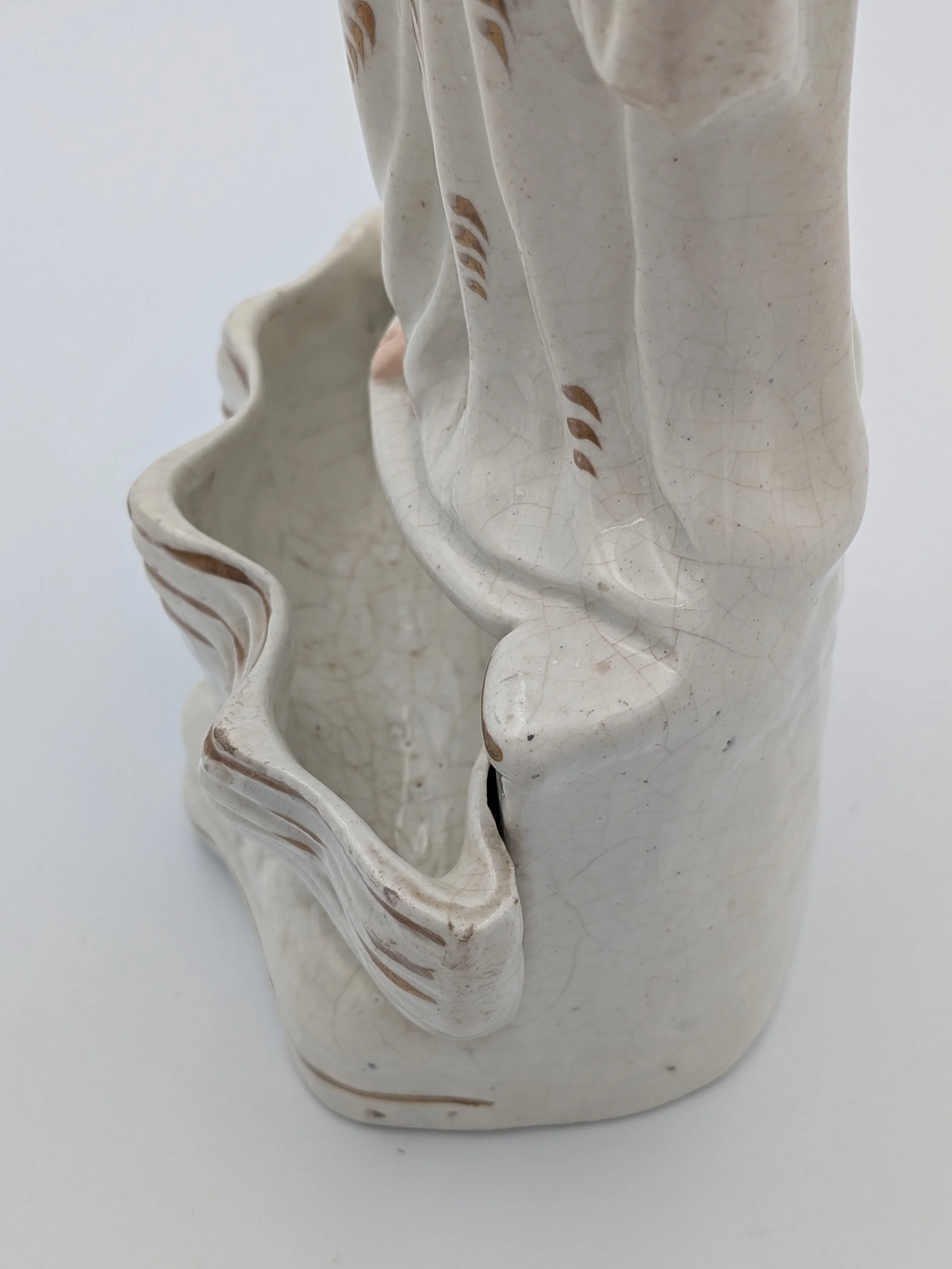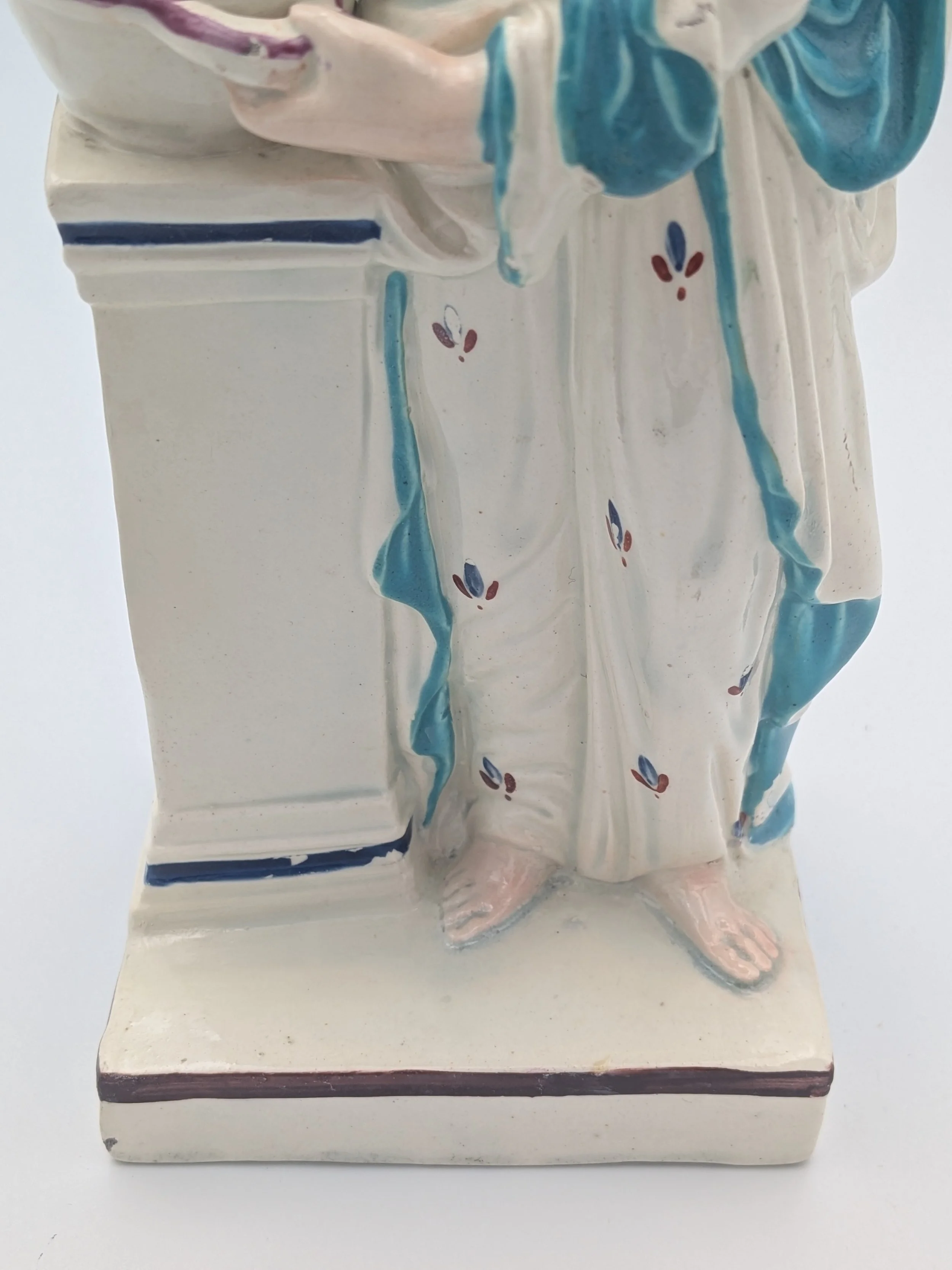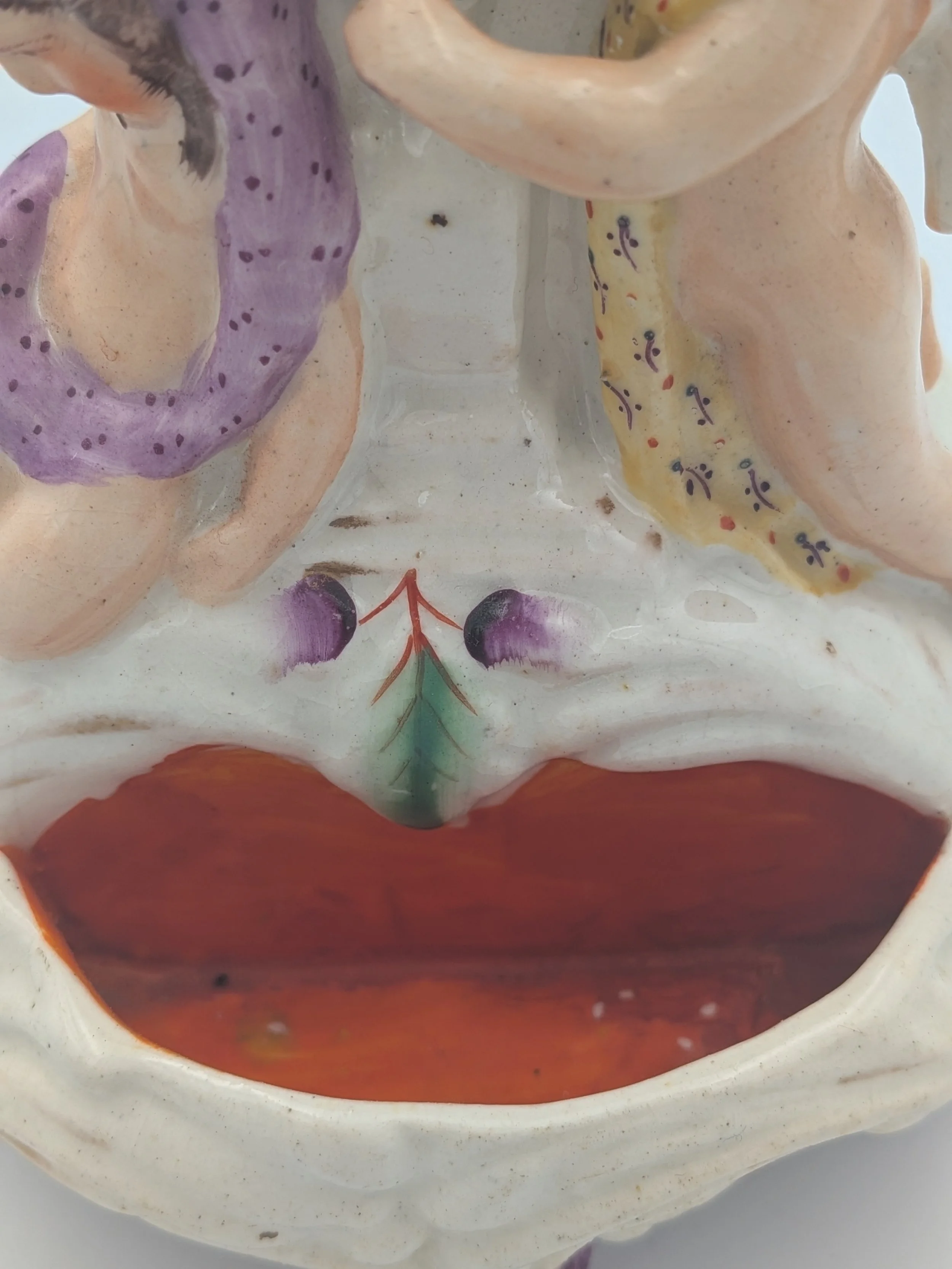 Staffordshire earthenware figures were produced from the late 18th century to the mid 20th century. Early (pre-1840) Staffordshire figures tend to be decorated ‘in the round’ and fairly elaborate with several handmade, press-moulded components including separately crafted limbs and bocage (leaves).