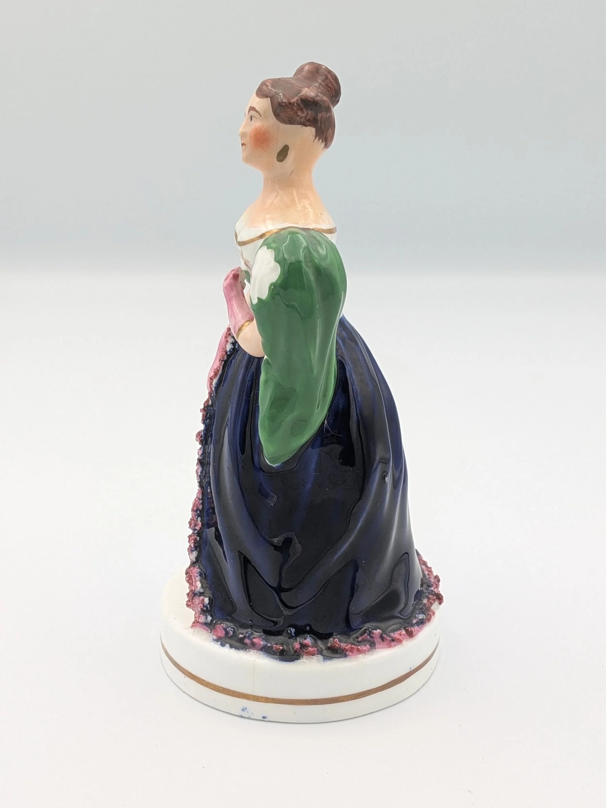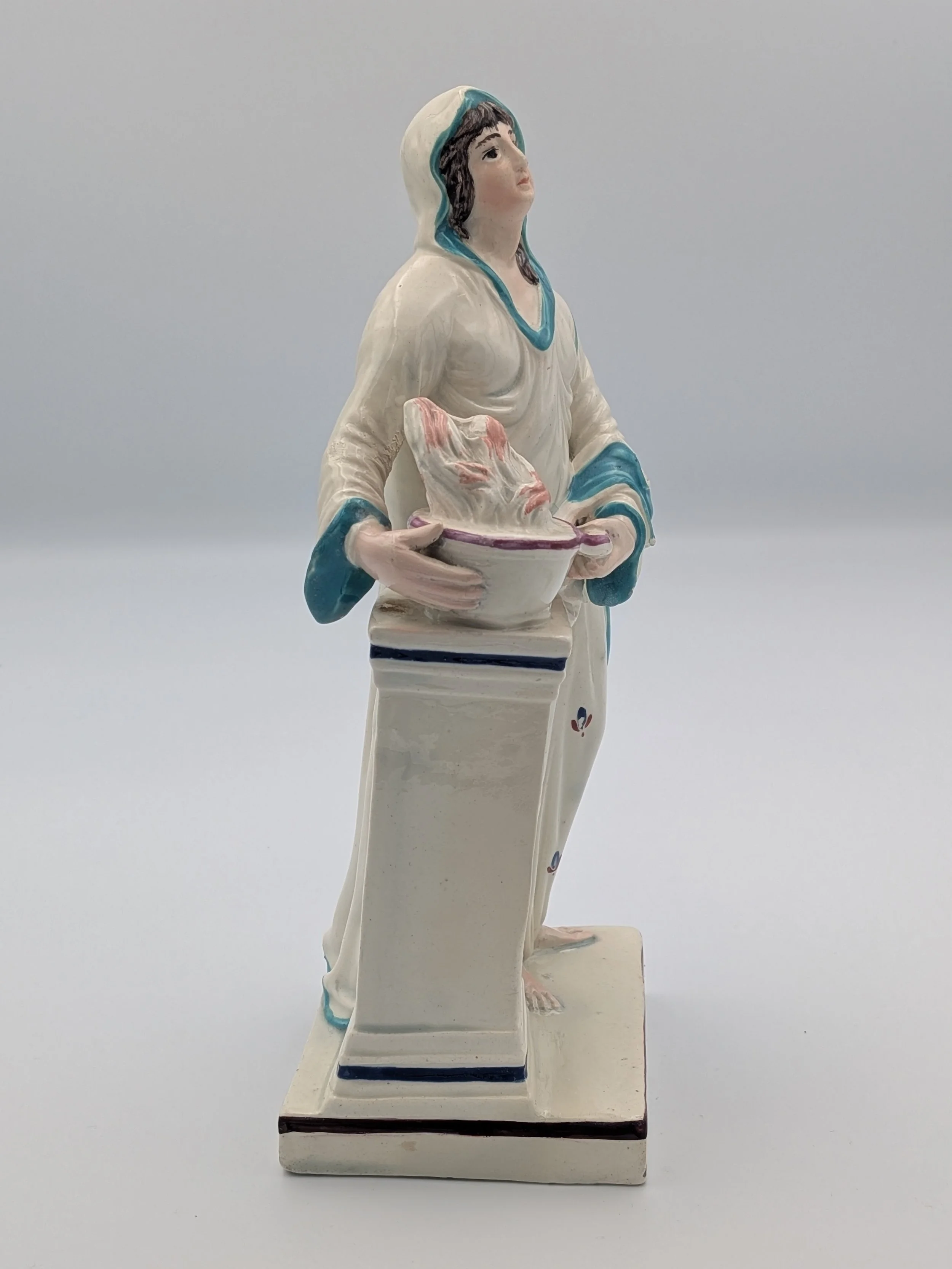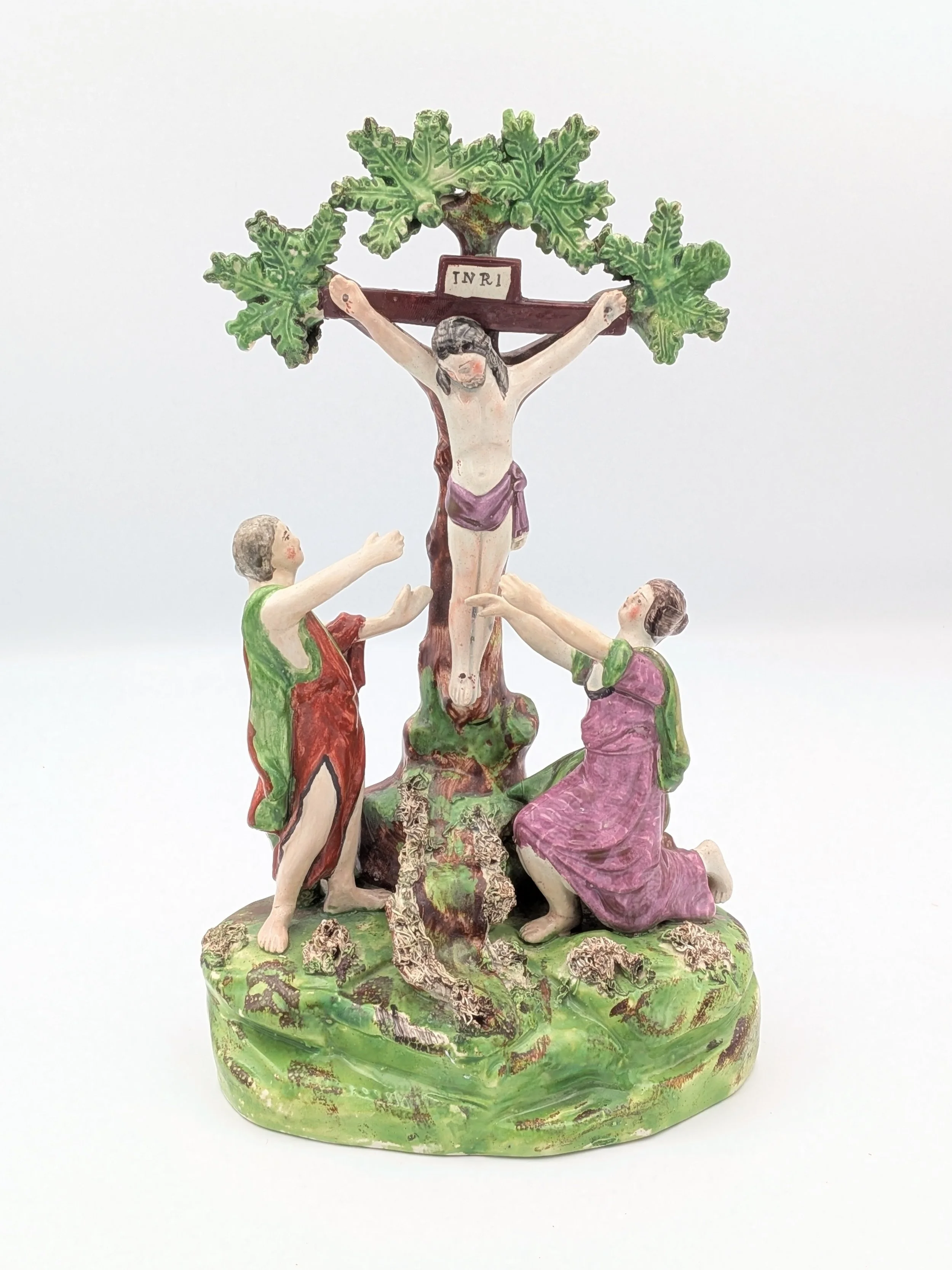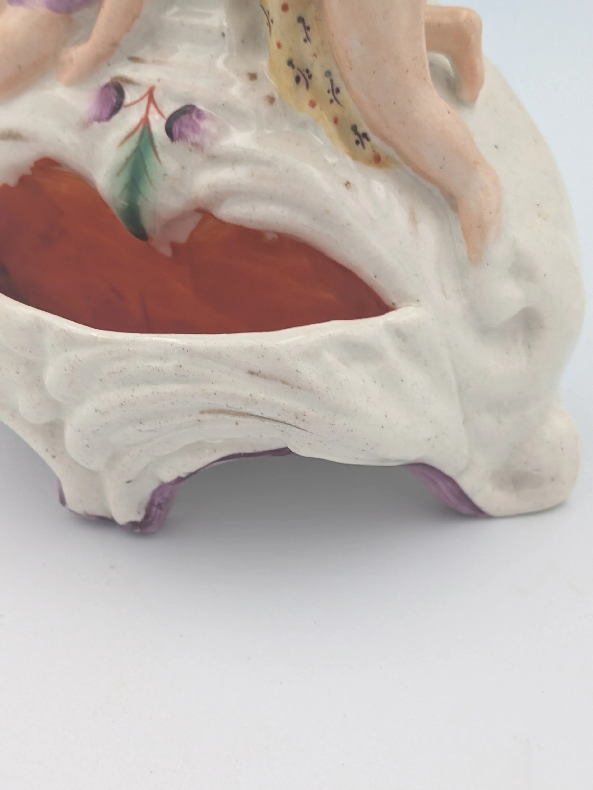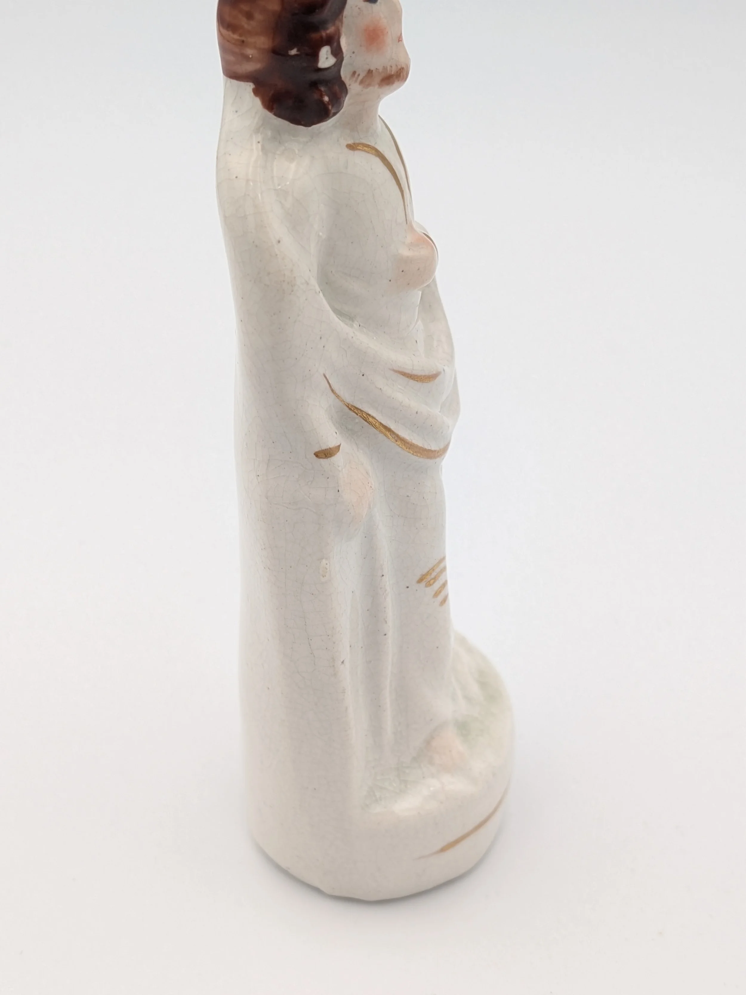 Staffordshire earthenware figures were produced from the late 18th century to the mid 20th century. Early (pre-1840) Staffordshire figures tend to be decorated ‘in the round’ and fairly elaborate with several handmade, press-moulded components including separately crafted limbs and bocage (leaves).