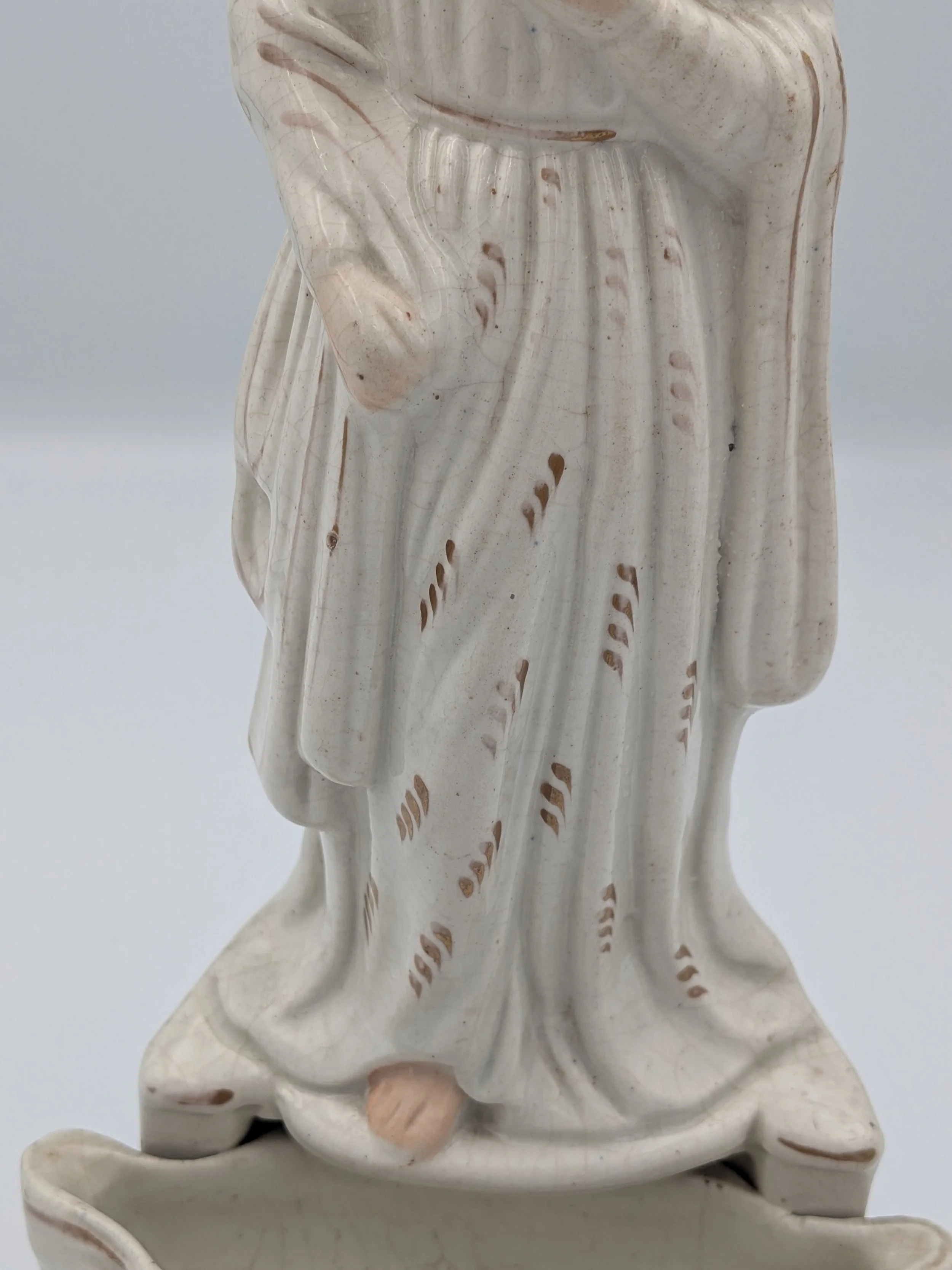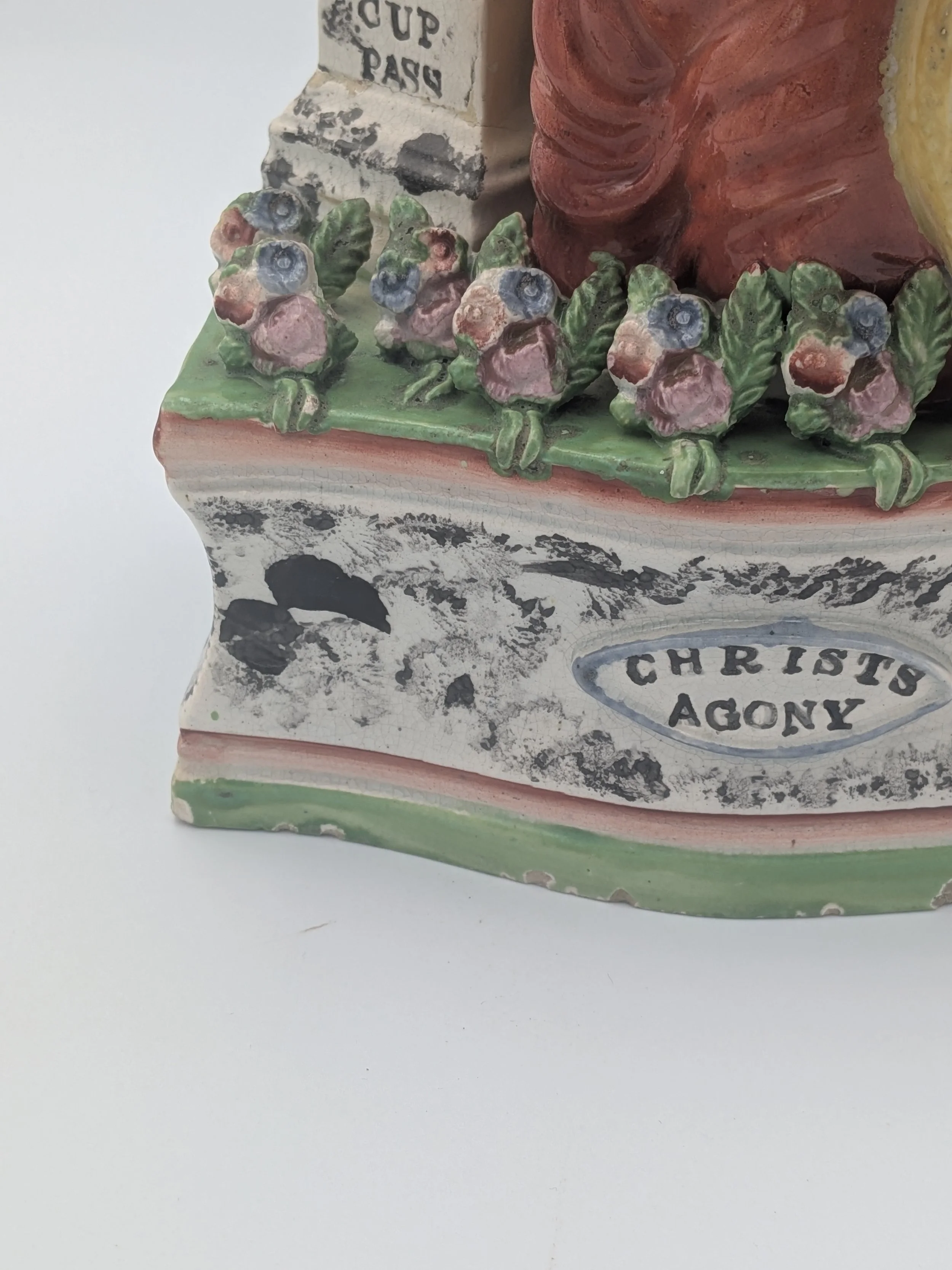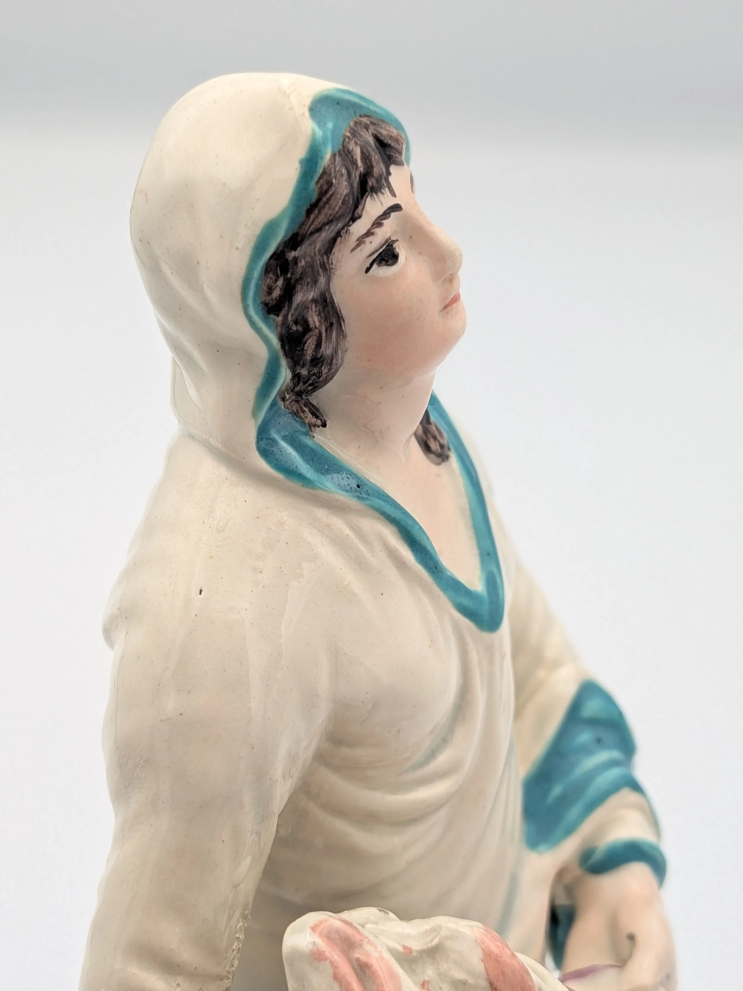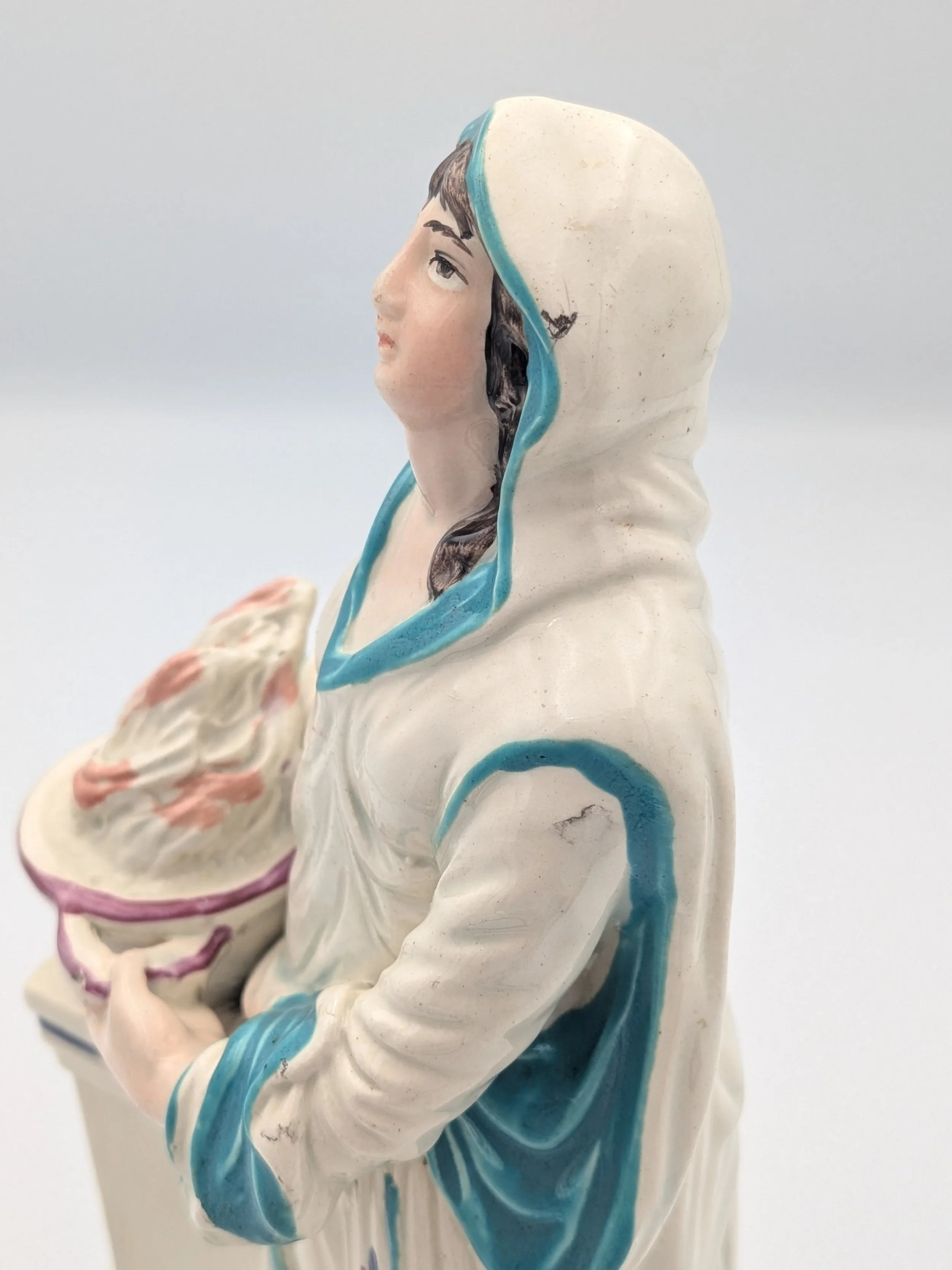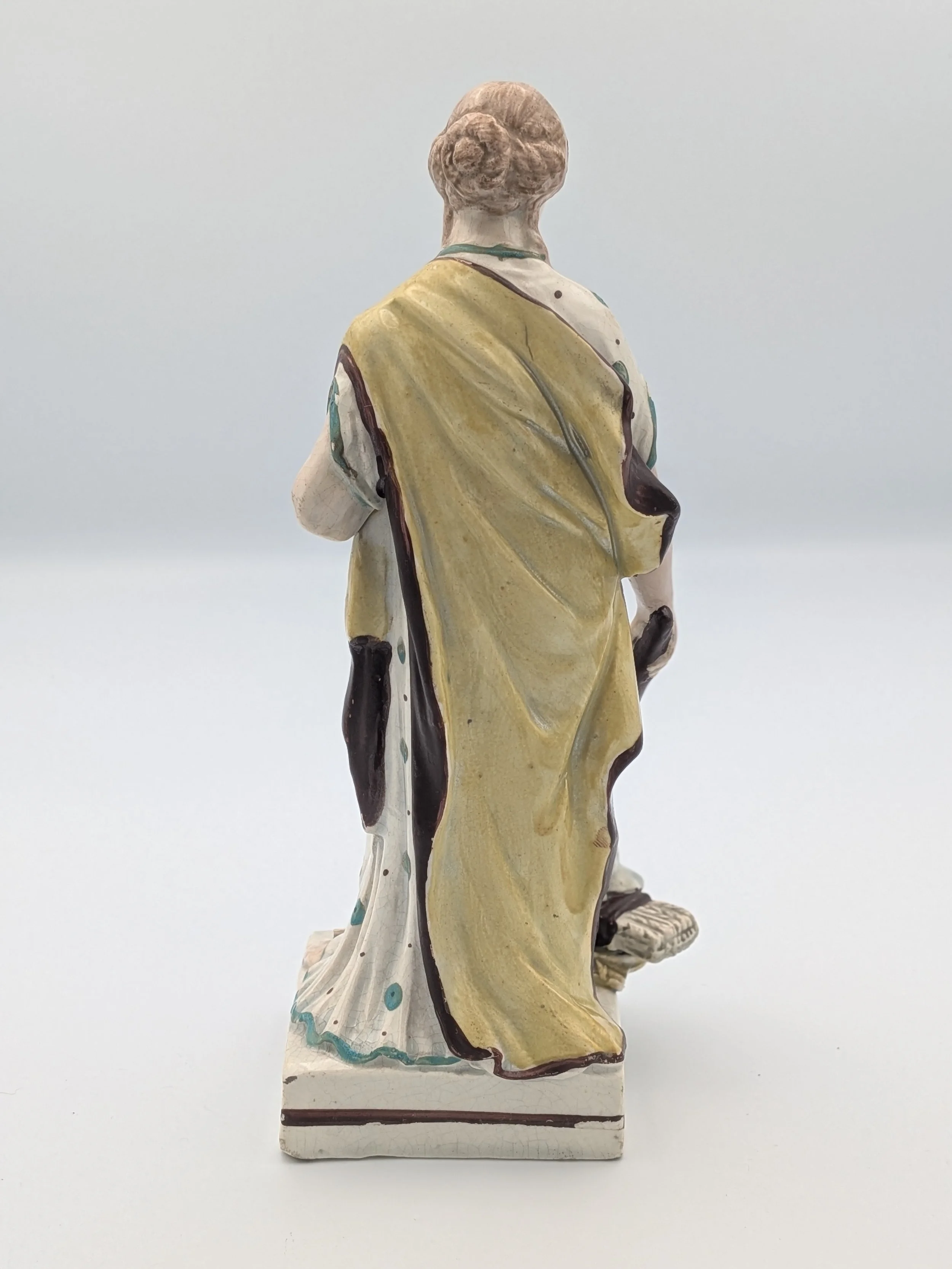 Staffordshire earthenware figures were produced from the late 18th century to the mid 20th century. Early (pre-1840) Staffordshire figures tend to be decorated ‘in the round’ and fairly elaborate with several handmade, press-moulded components including separately crafted limbs and bocage (leaves).