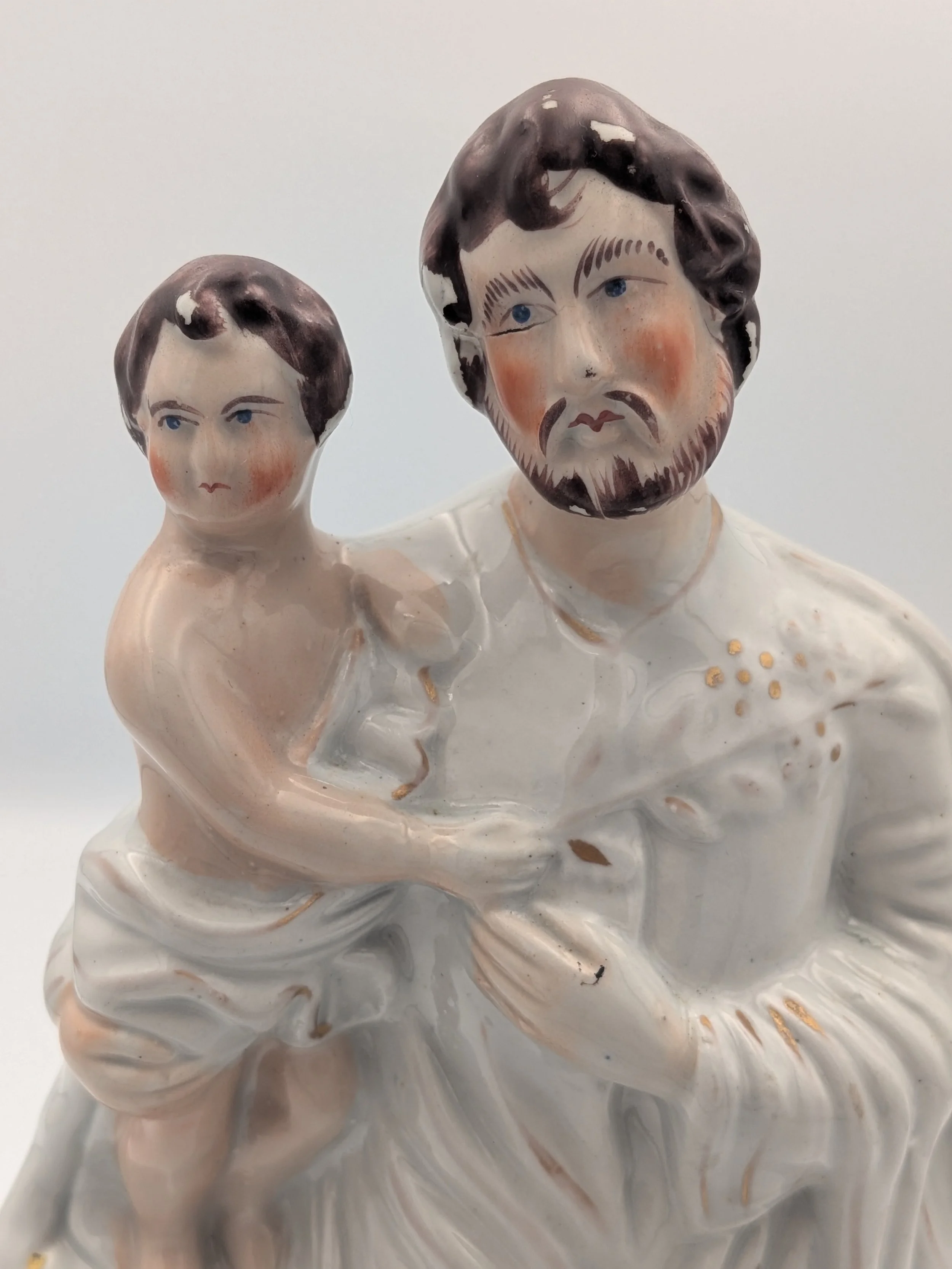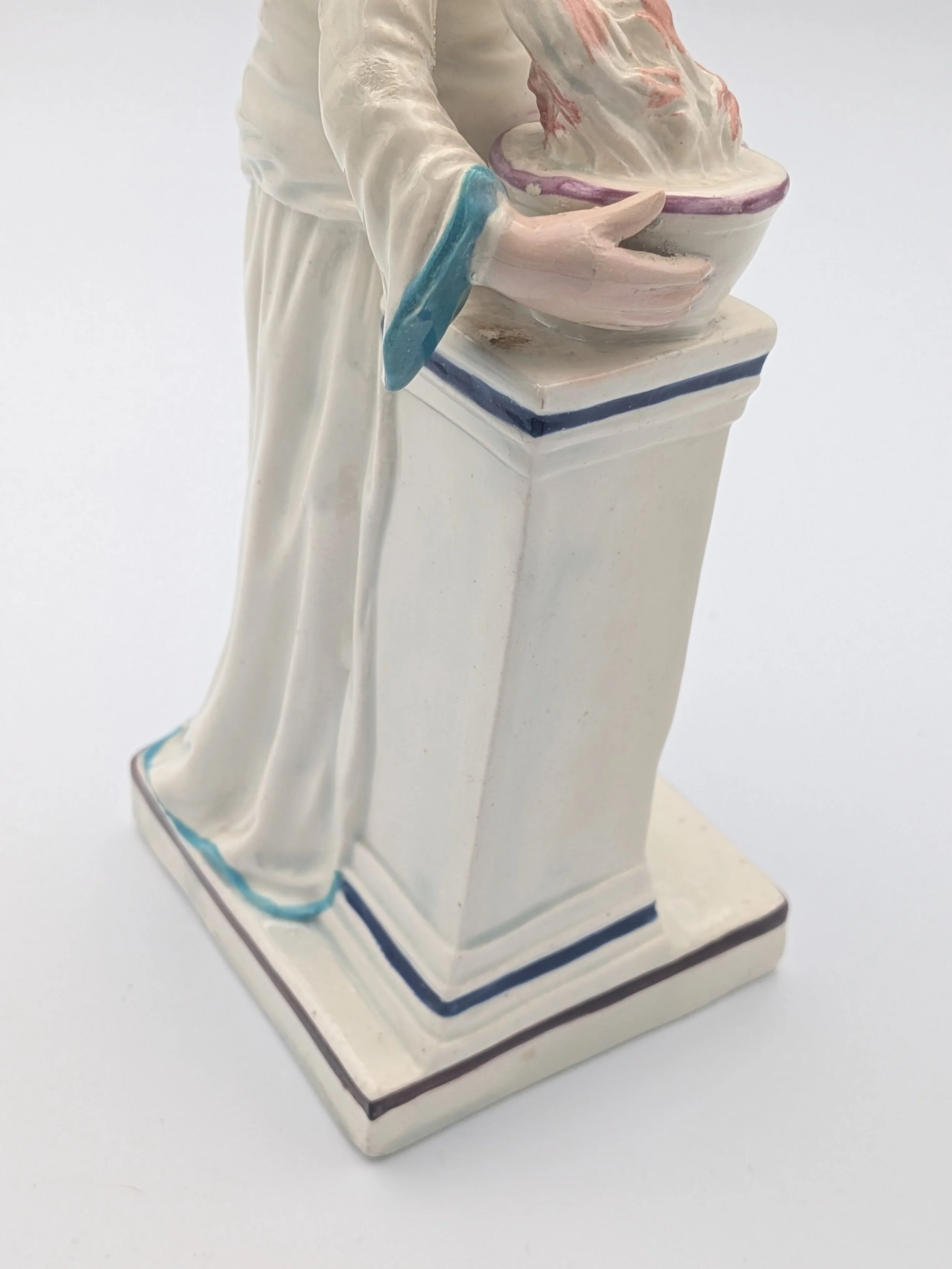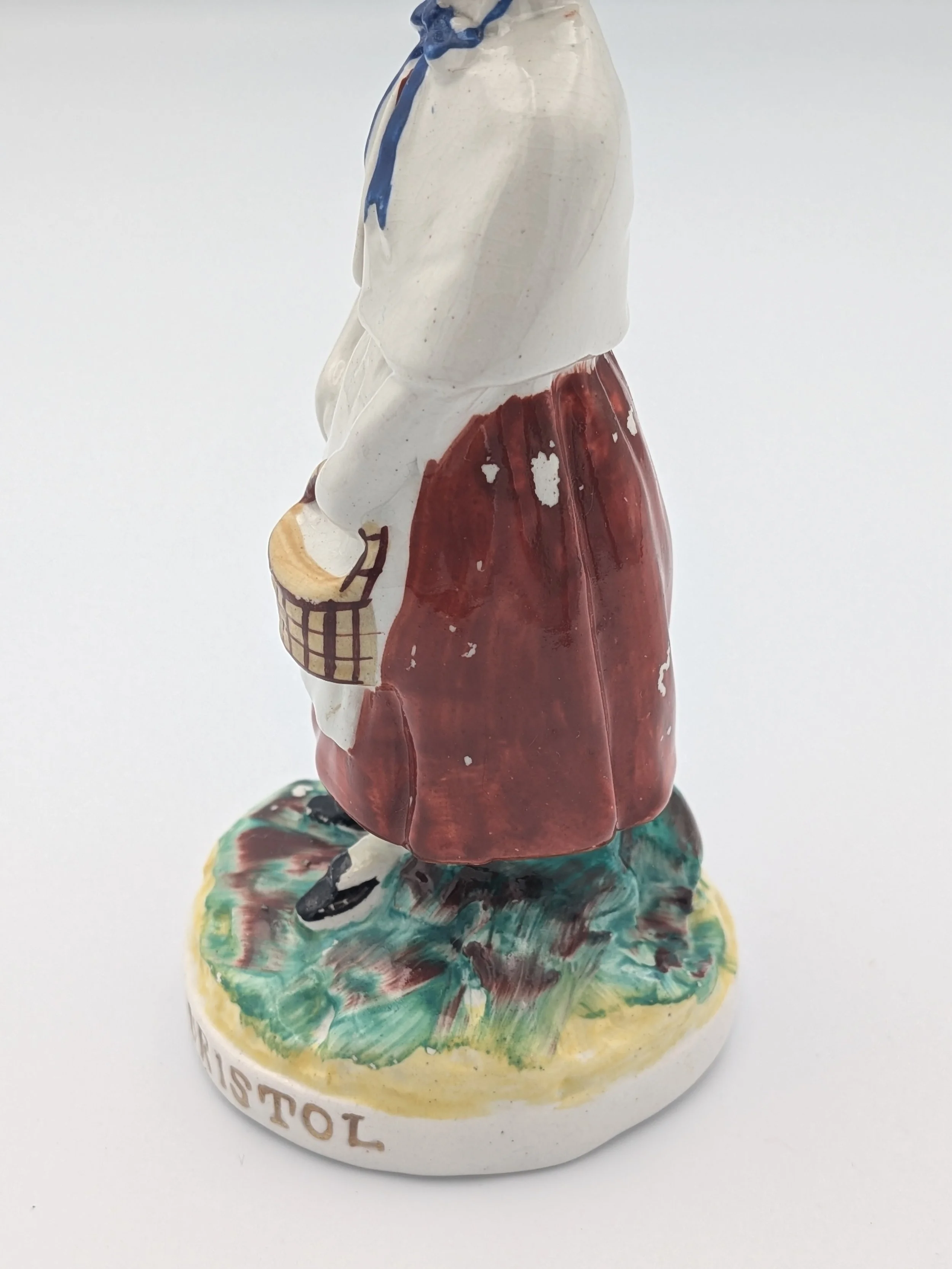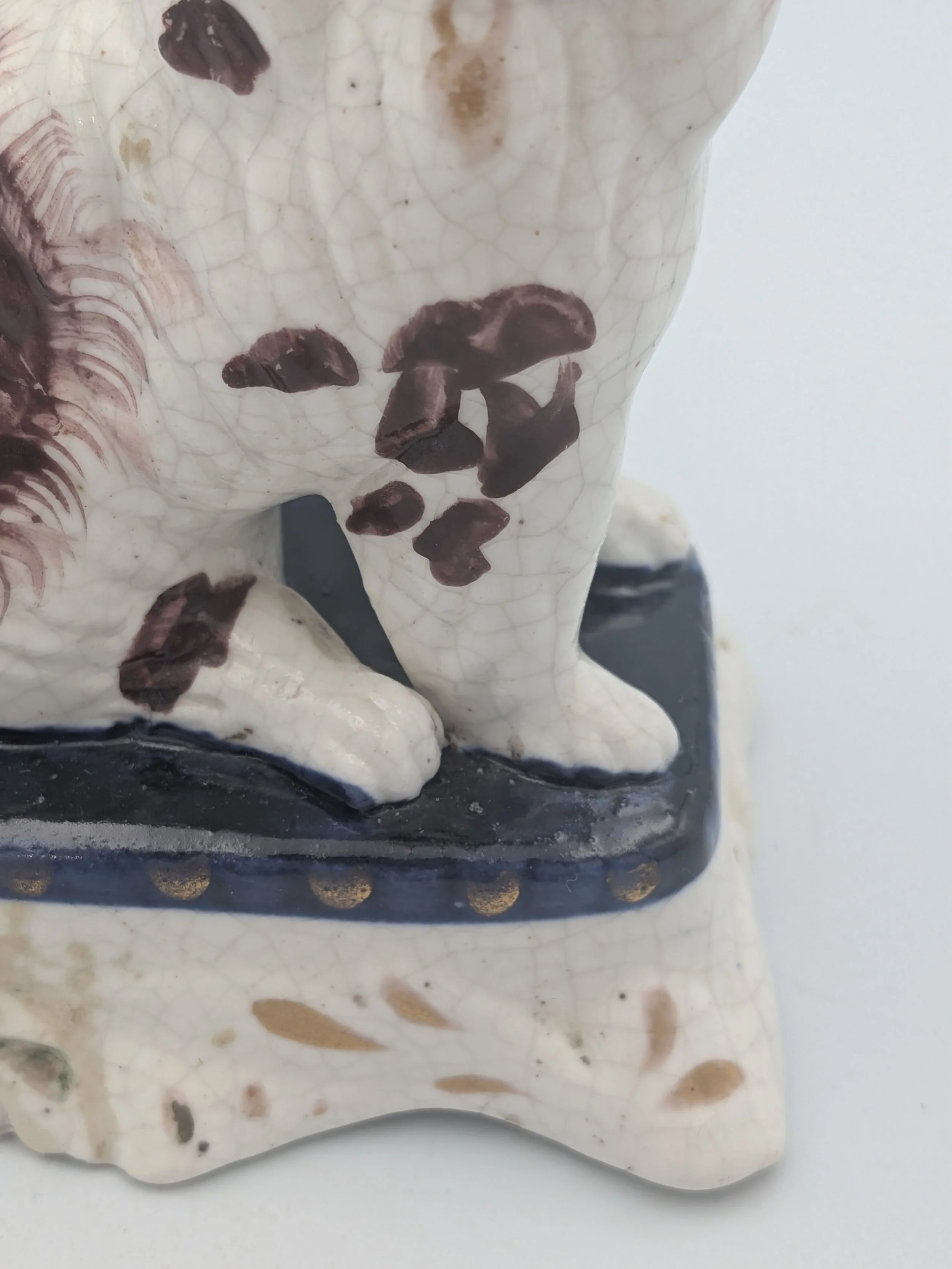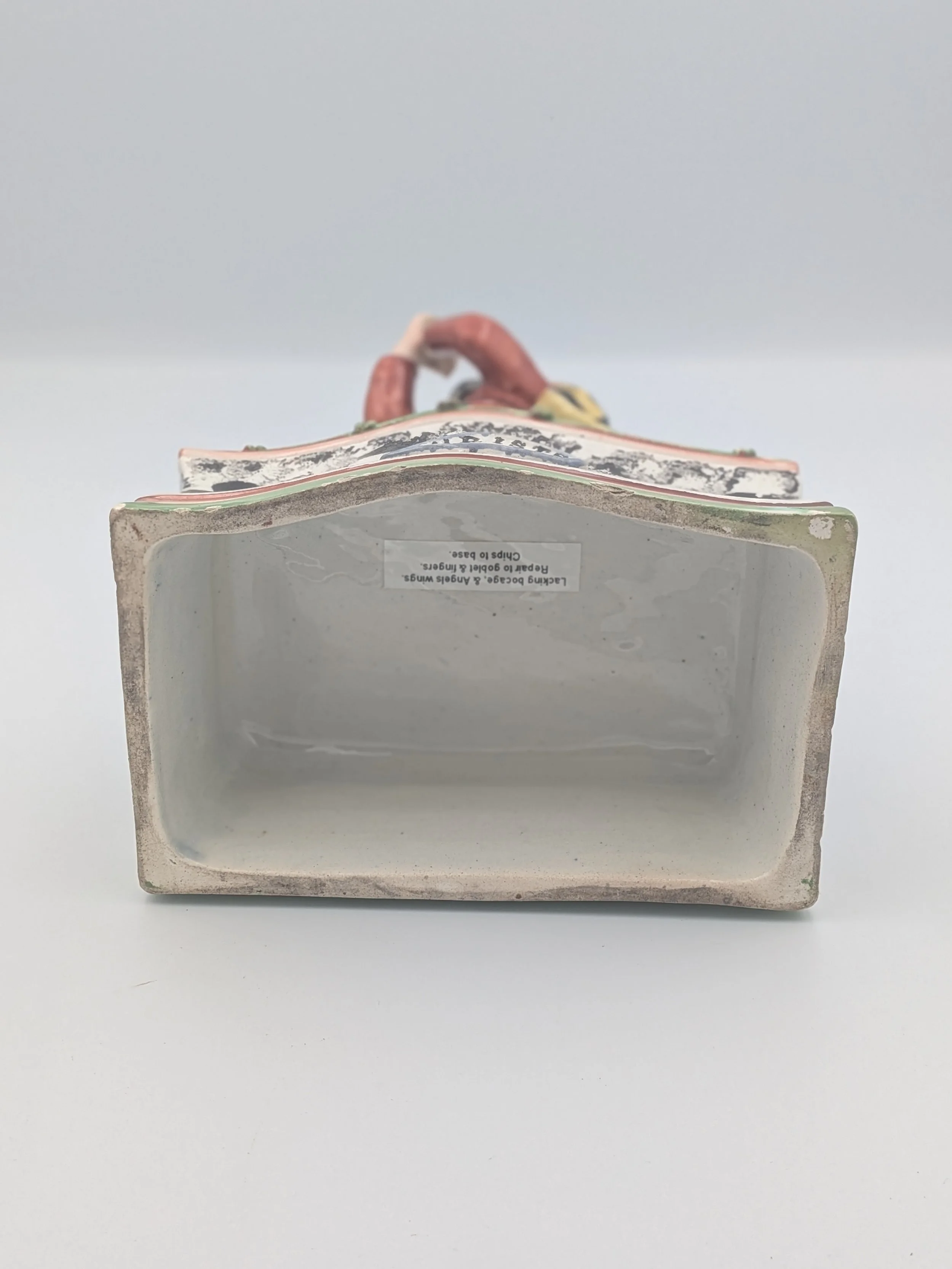 Staffordshire earthenware figures were produced from the late 18th century to the mid 20th century. Early (pre-1840) Staffordshire figures tend to be decorated ‘in the round’ and fairly elaborate with several handmade, press-moulded components including separately crafted limbs and bocage (leaves).