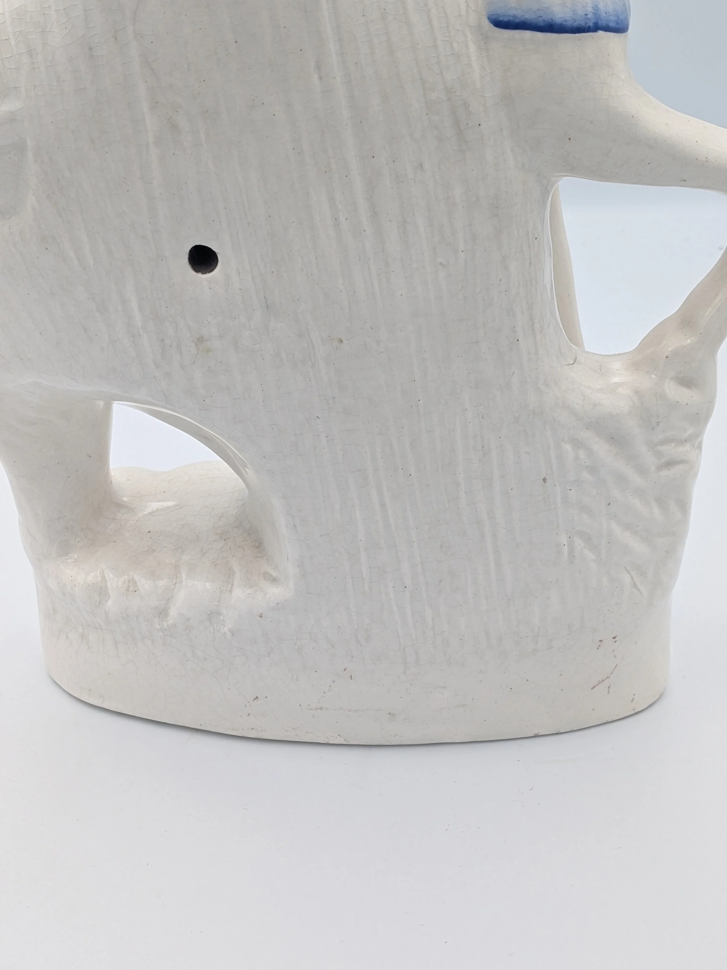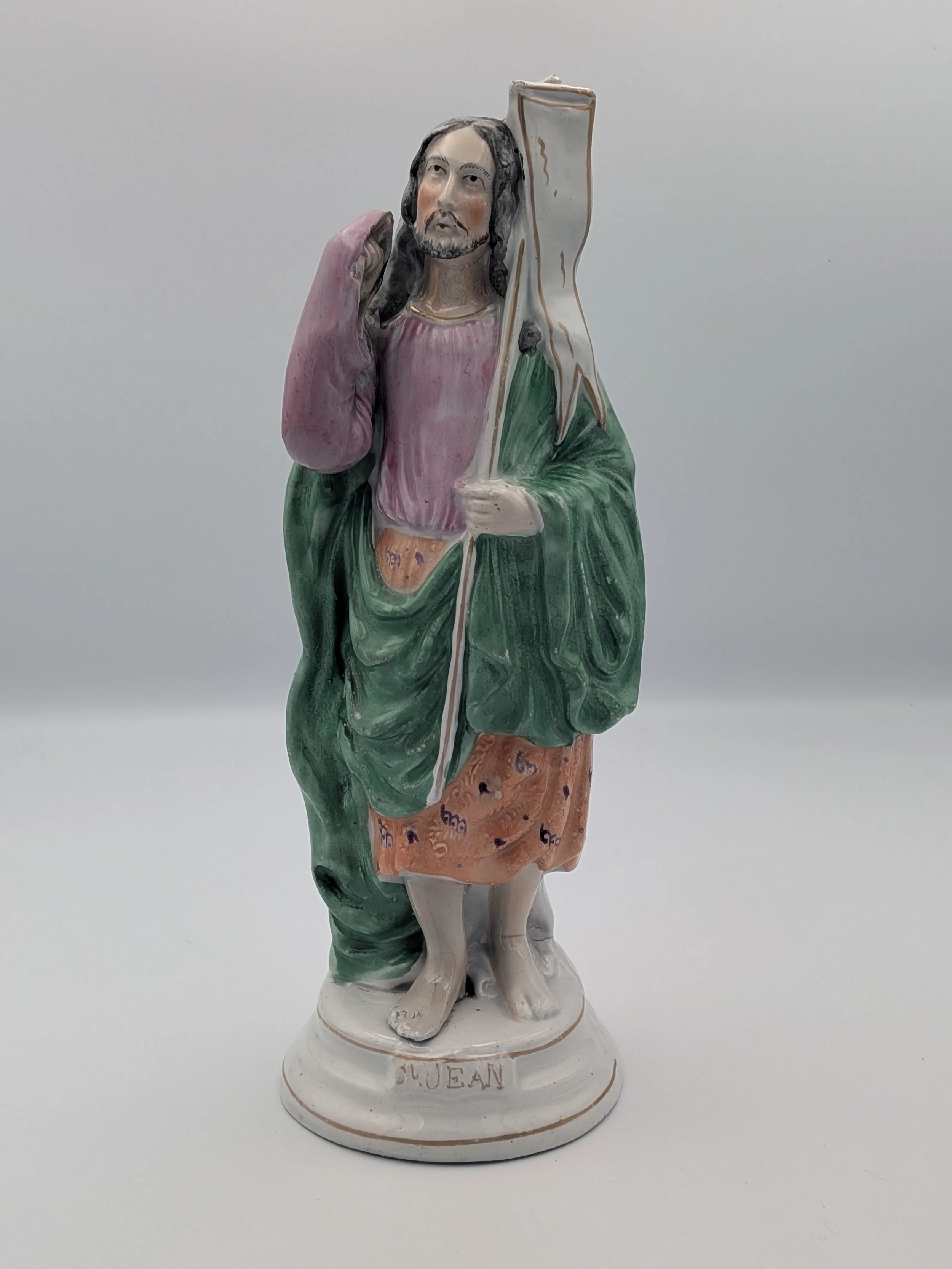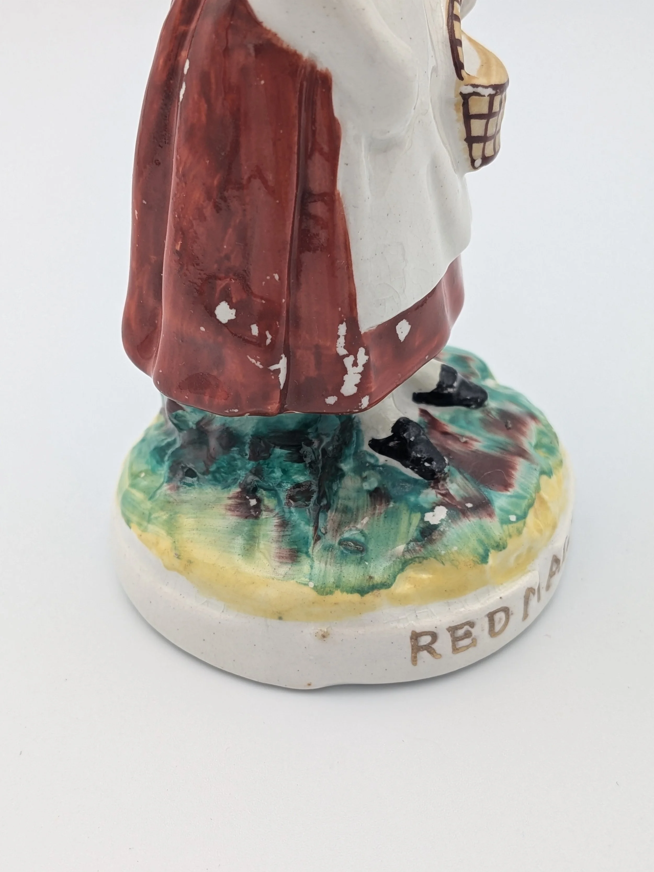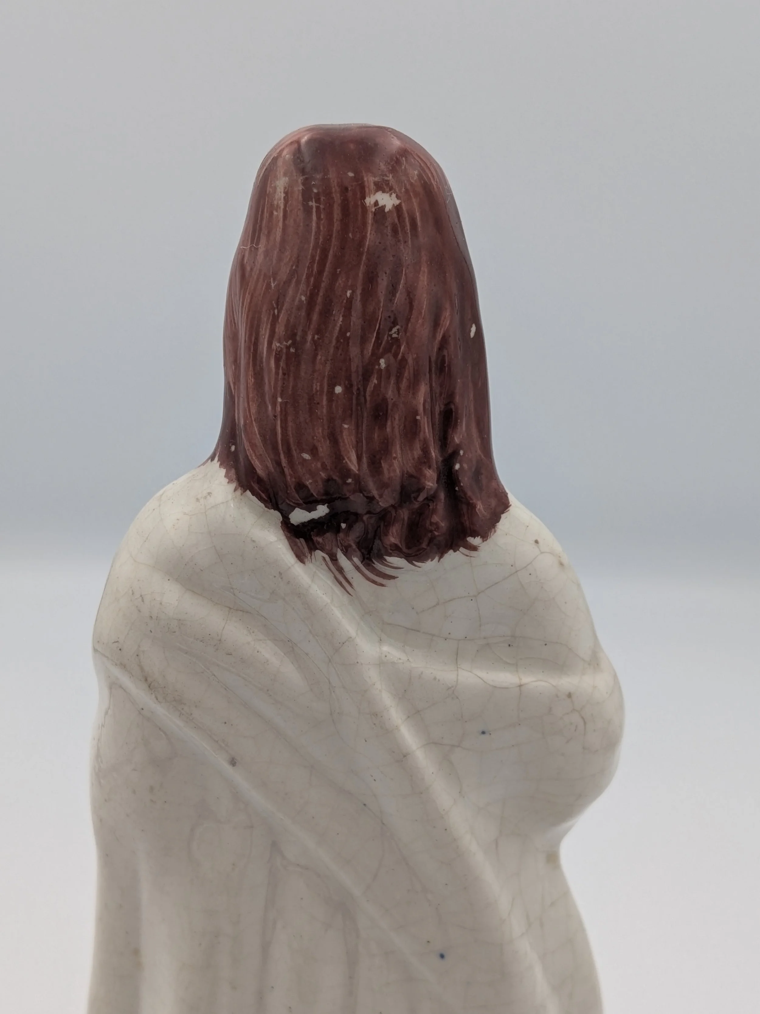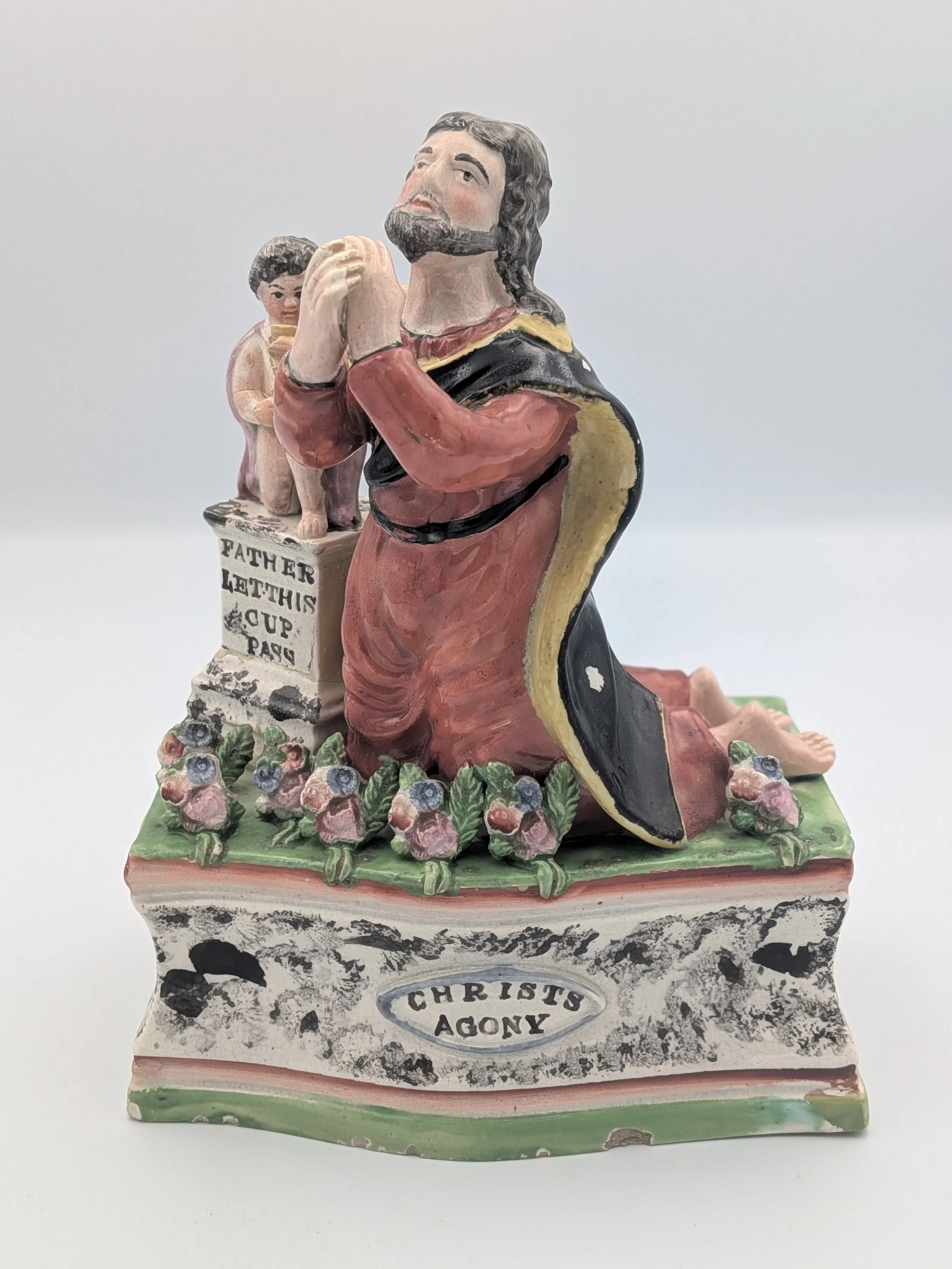 Staffordshire earthenware figures were produced from the late 18th century to the mid 20th century. Early (pre-1840) Staffordshire figures tend to be decorated ‘in the round’ and fairly elaborate with several handmade, press-moulded components including separately crafted limbs and bocage (leaves).