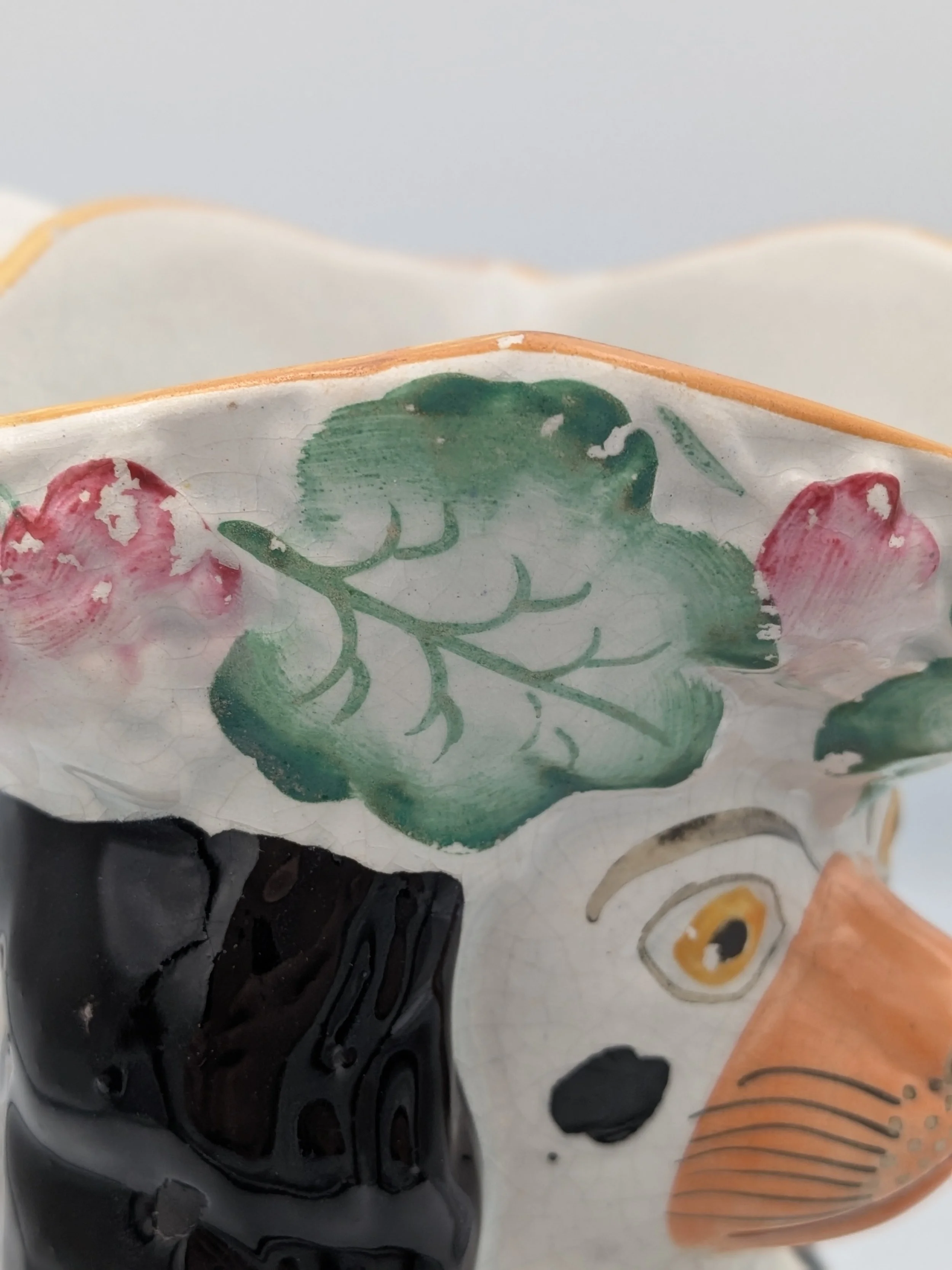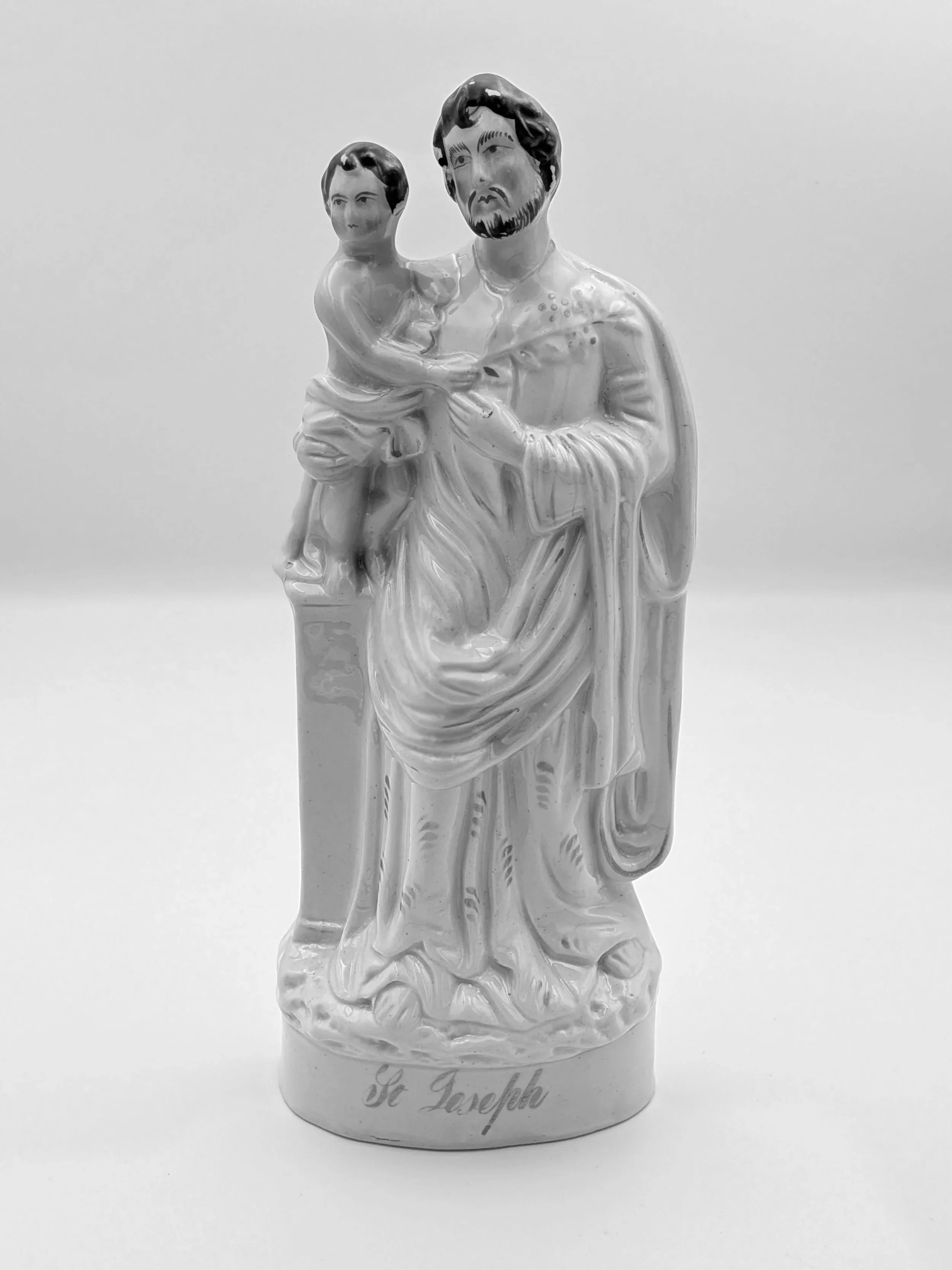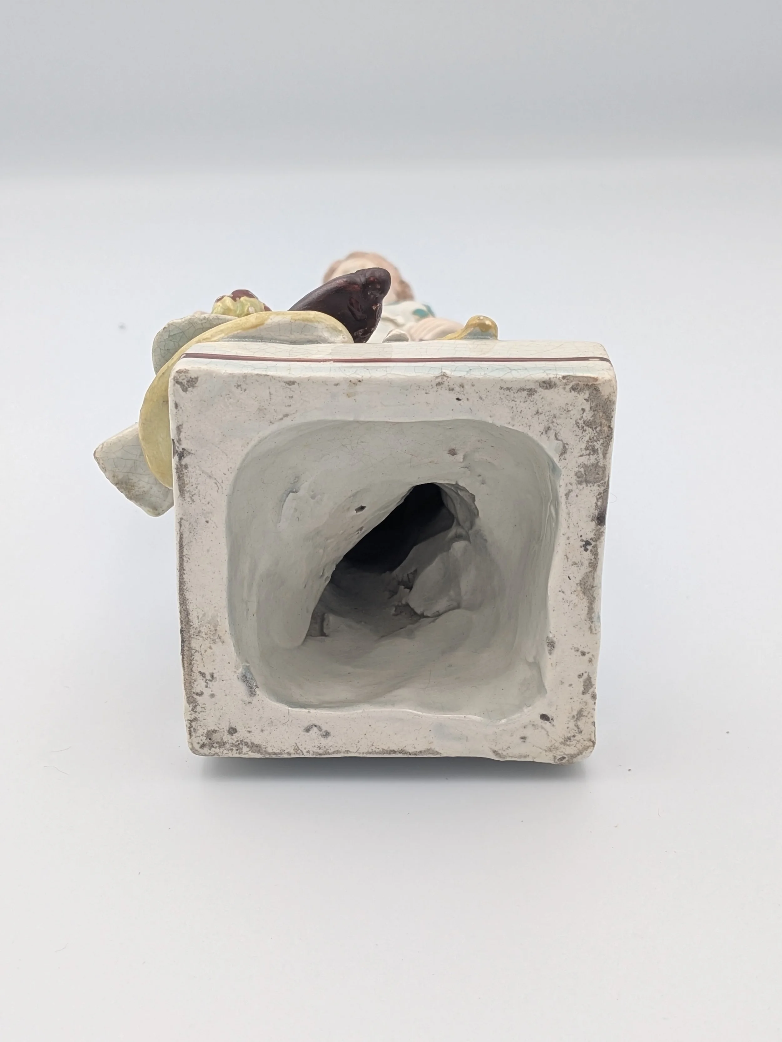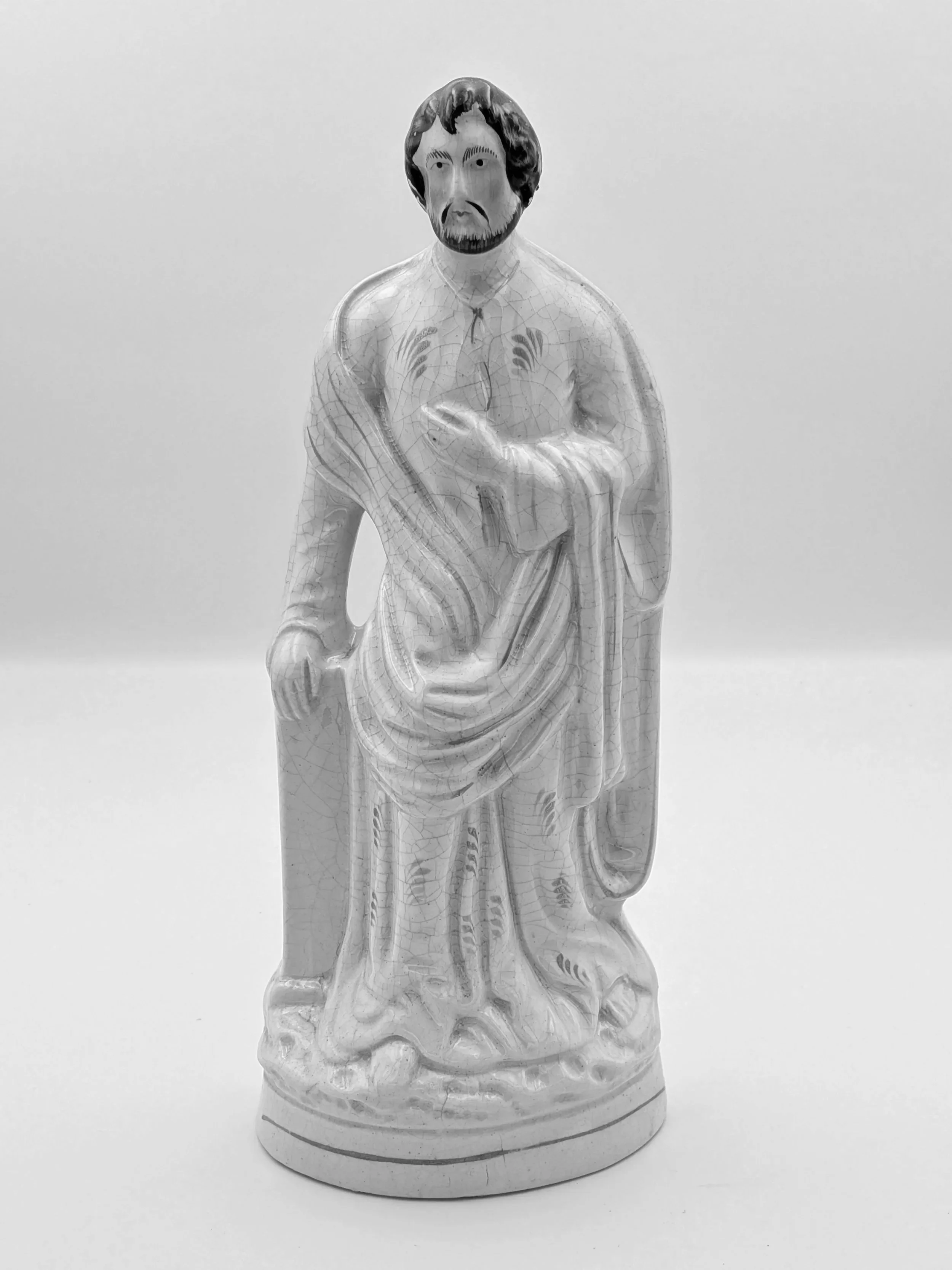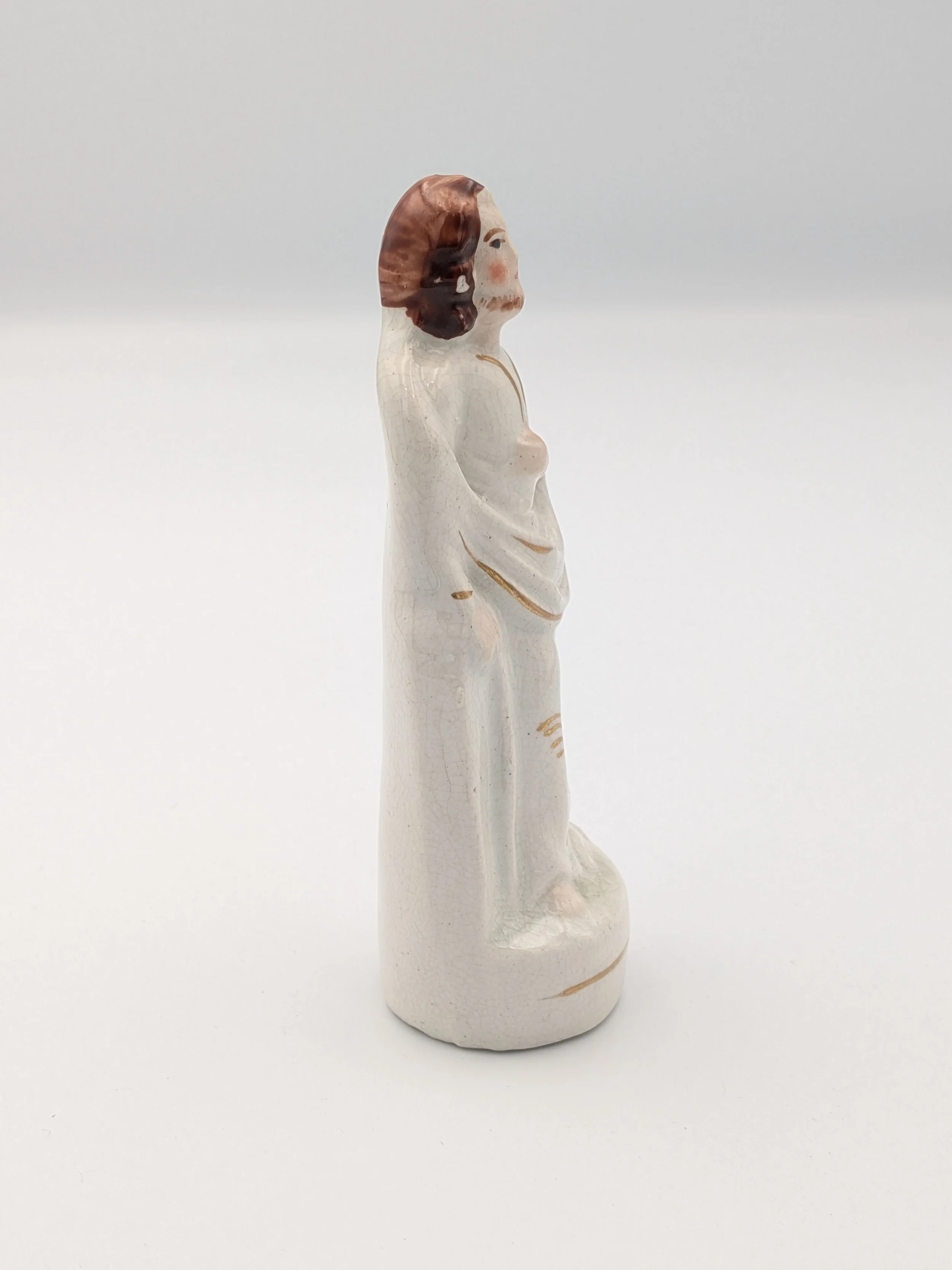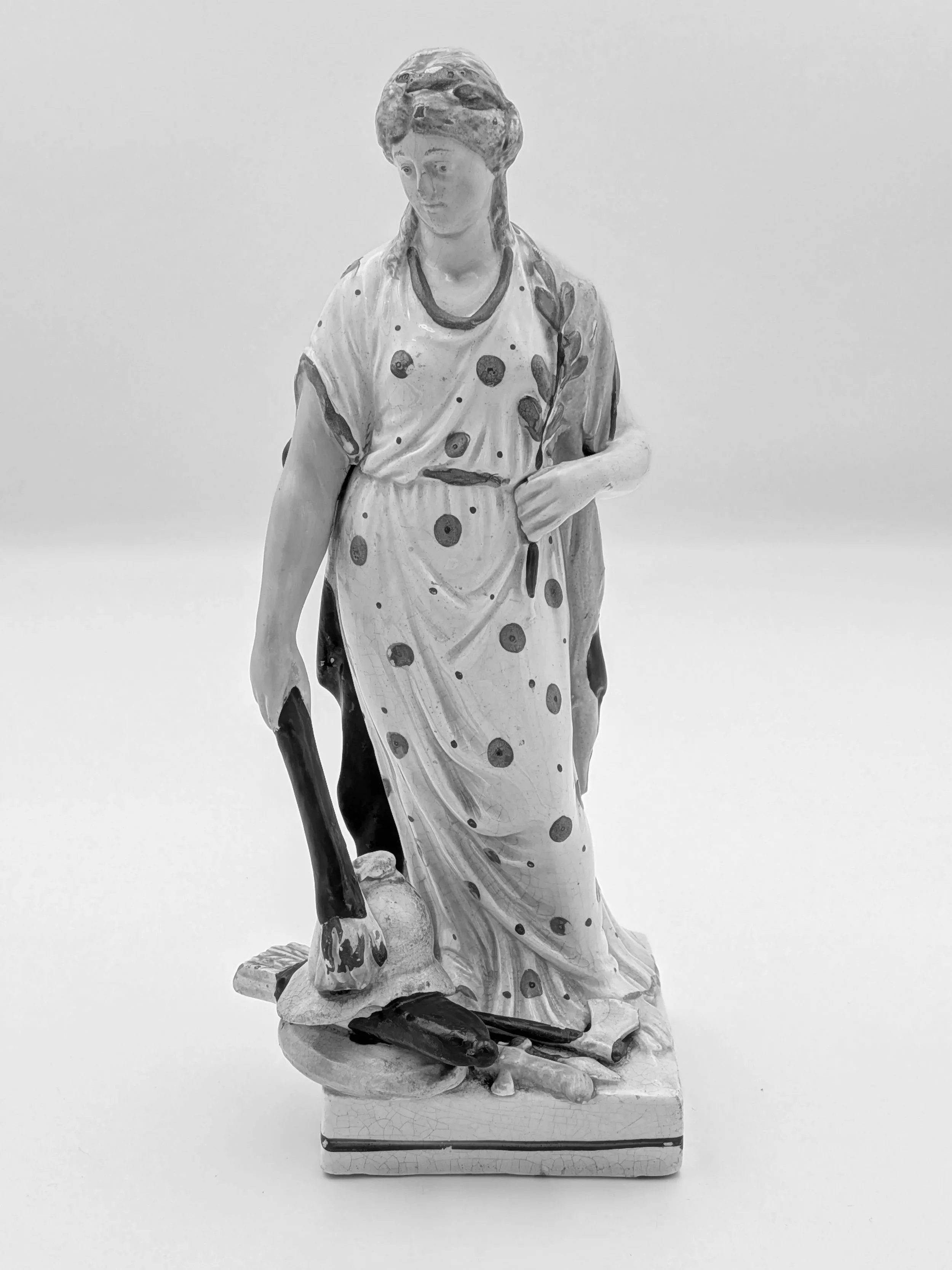 Staffordshire earthenware figures were produced from the late 18th century to the mid 20th century. Early (pre-1840) Staffordshire figures tend to be decorated ‘in the round’ and fairly elaborate with several handmade, press-moulded components including separately crafted limbs and bocage (leaves).