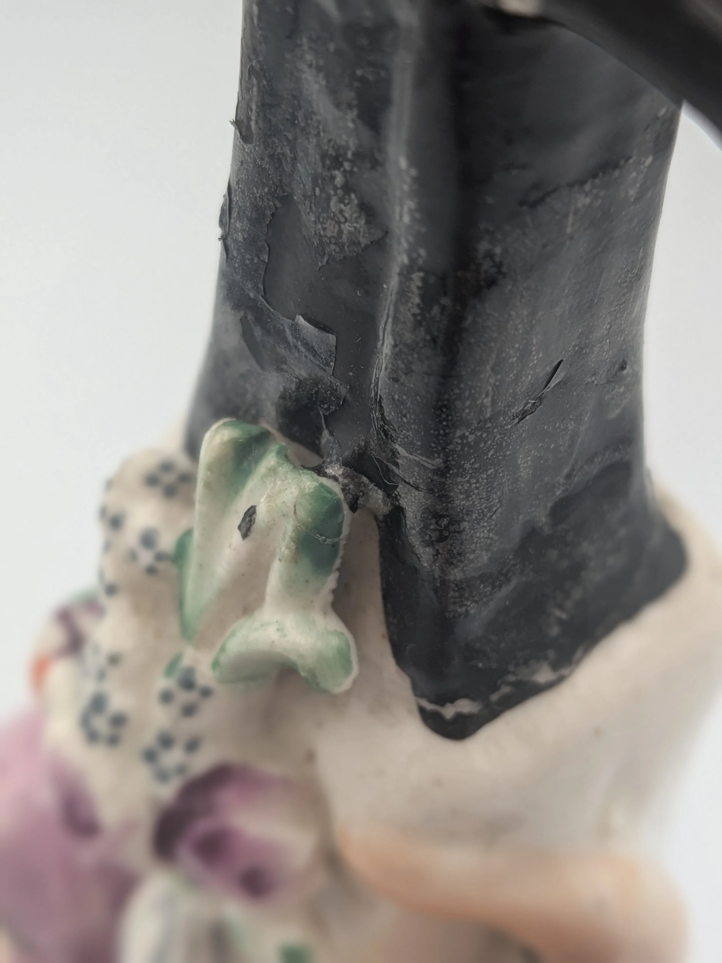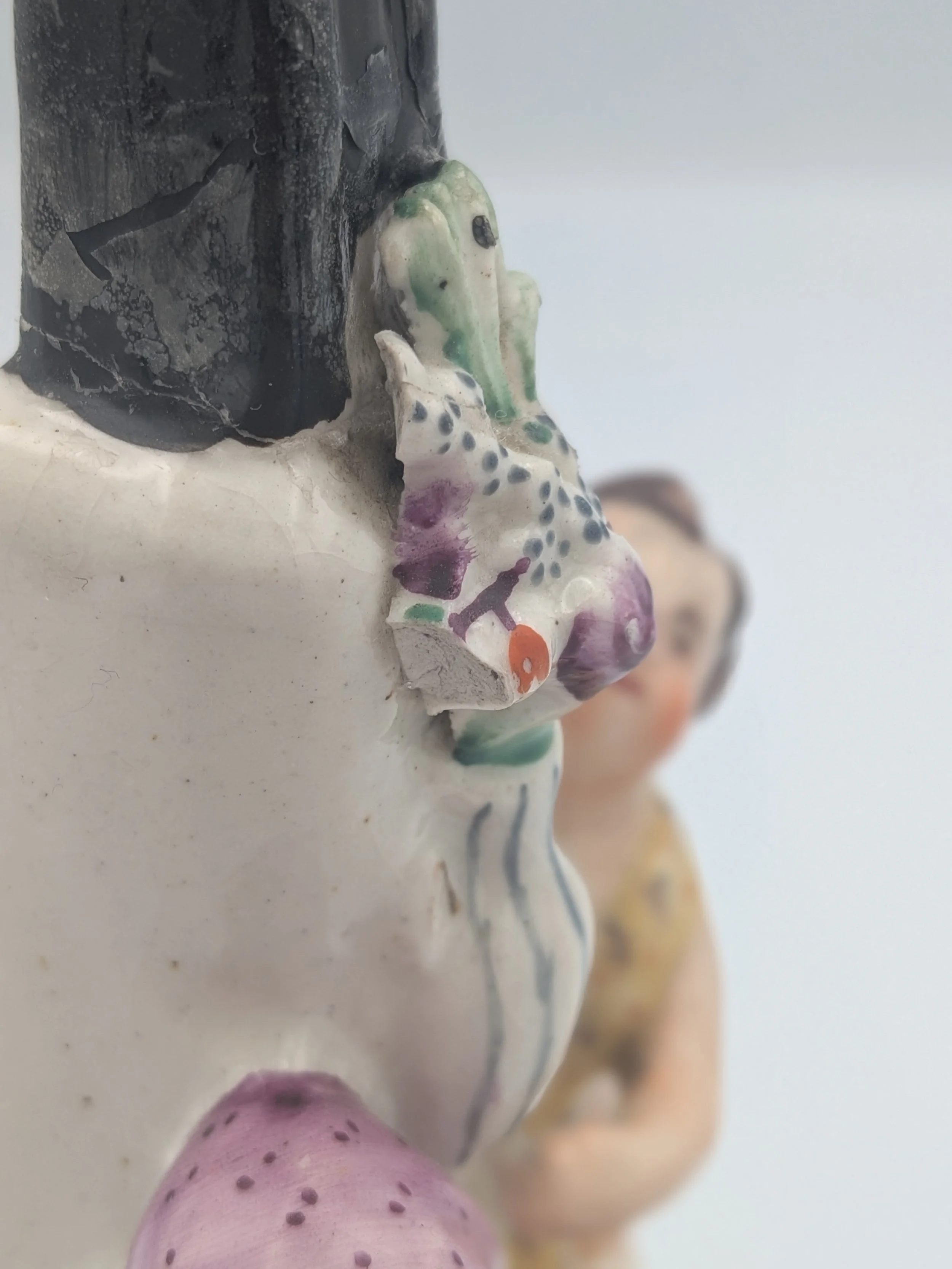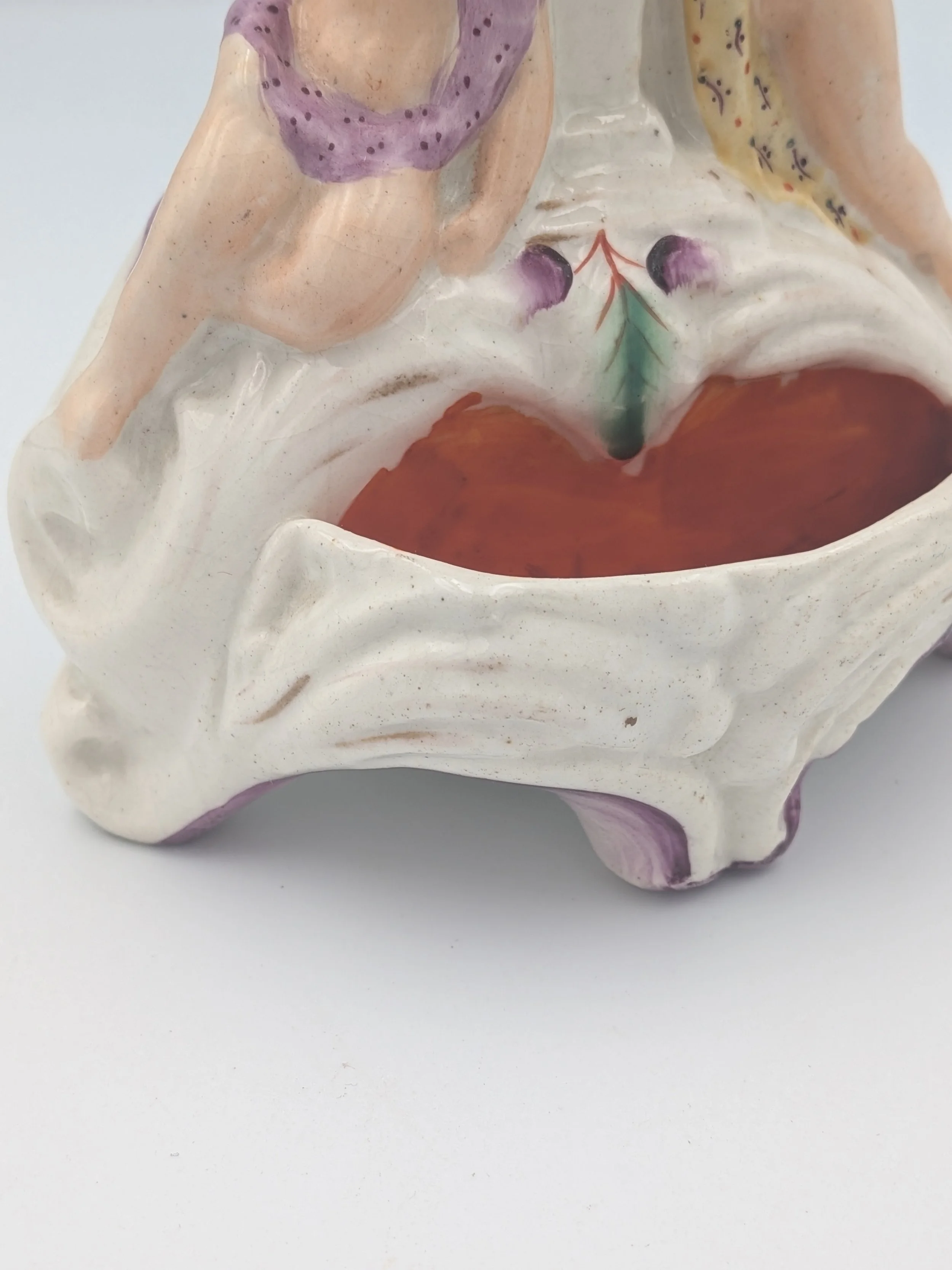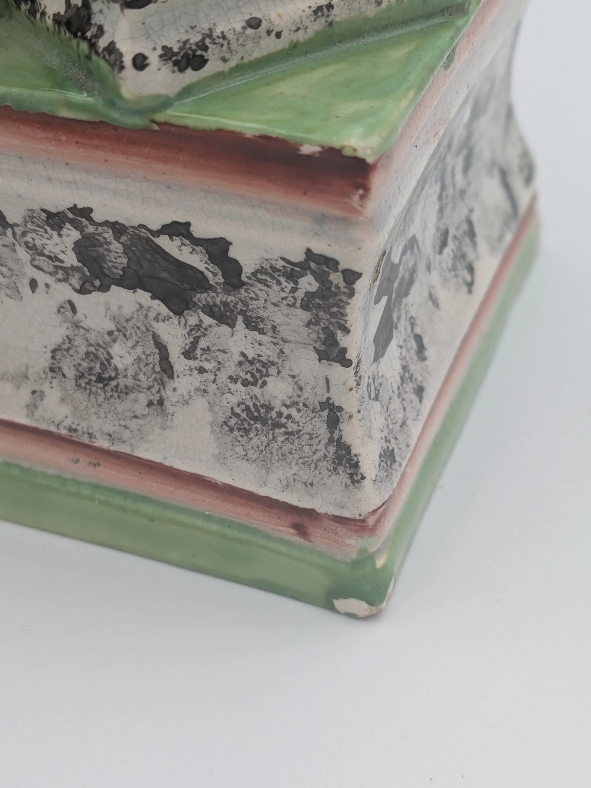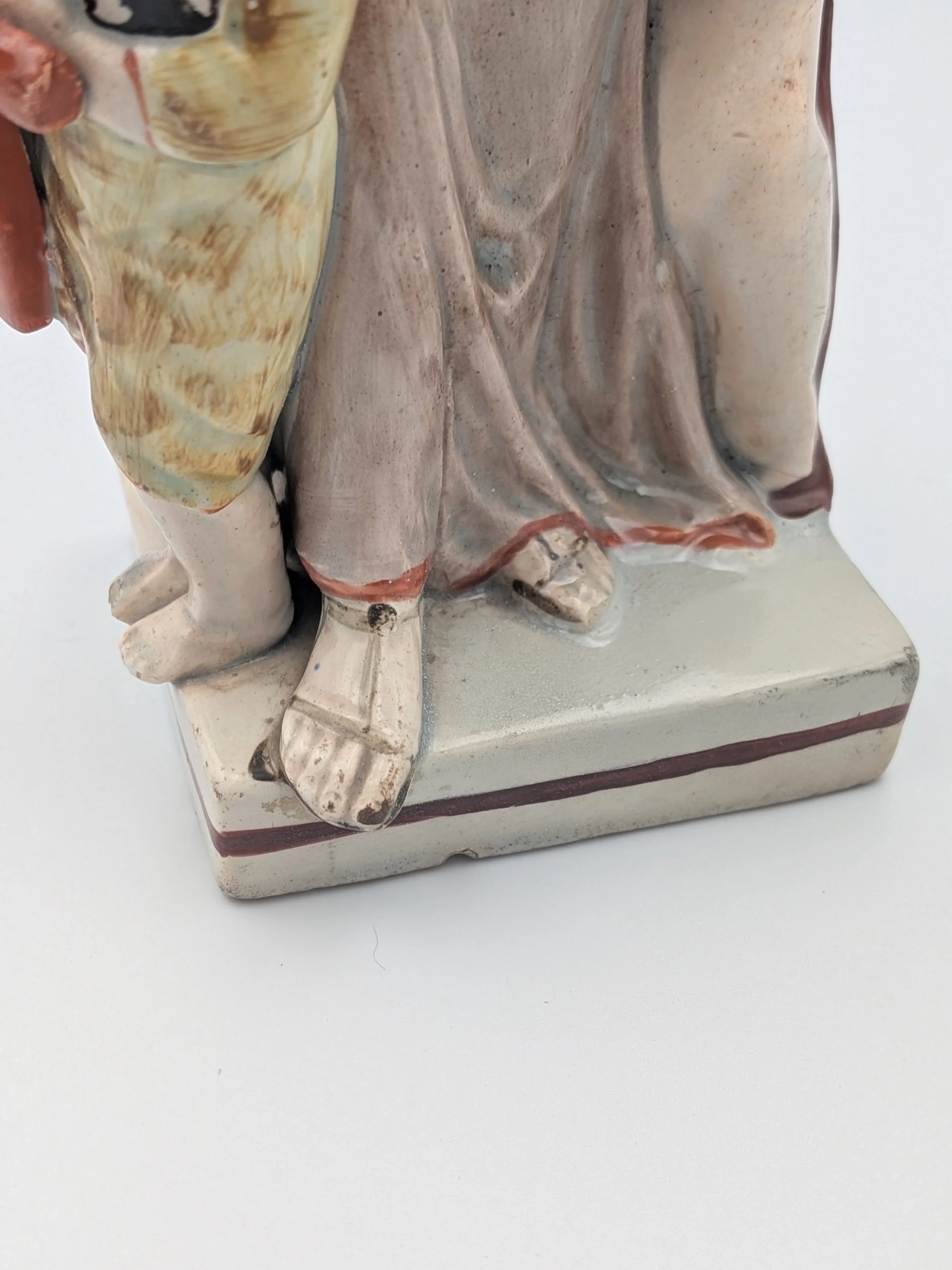 Staffordshire earthenware figures were produced from the late 18th century to the mid 20th century. Early (pre-1840) Staffordshire figures tend to be decorated ‘in the round’ and fairly elaborate with several handmade, press-moulded components including separately crafted limbs and bocage (leaves).