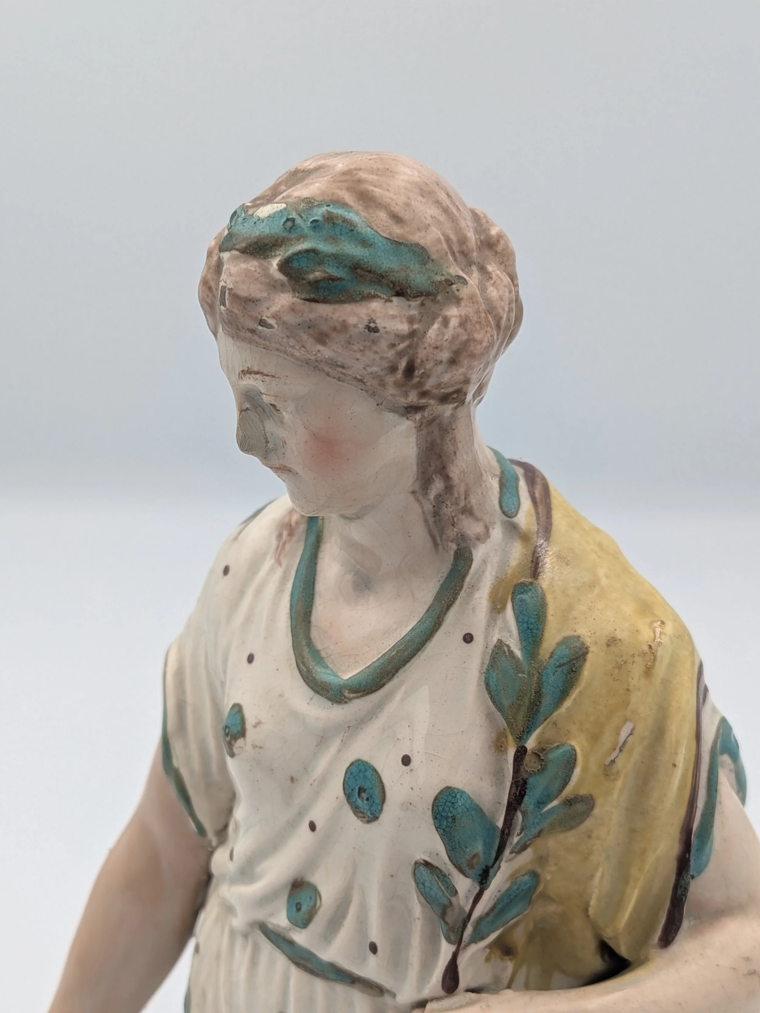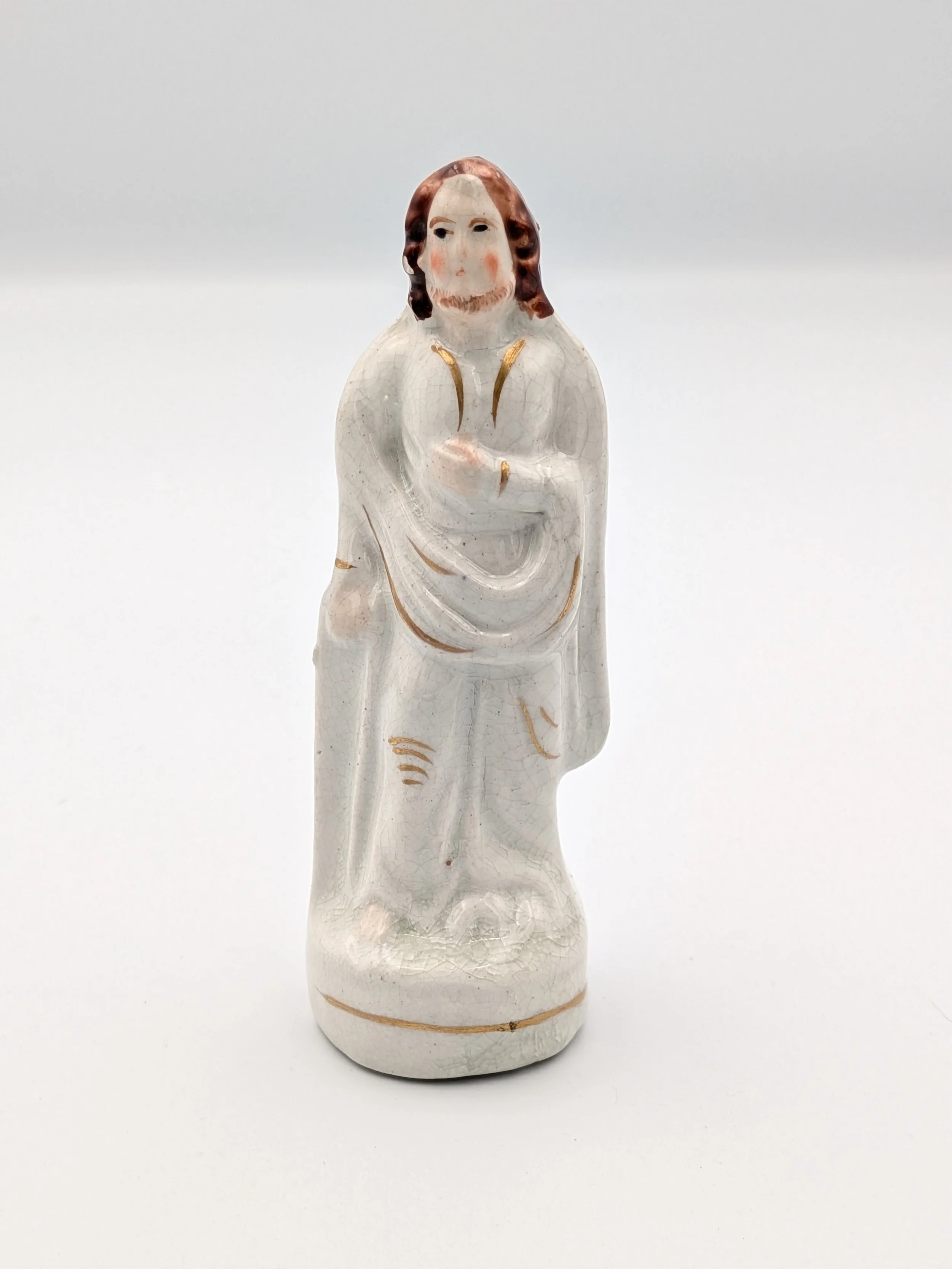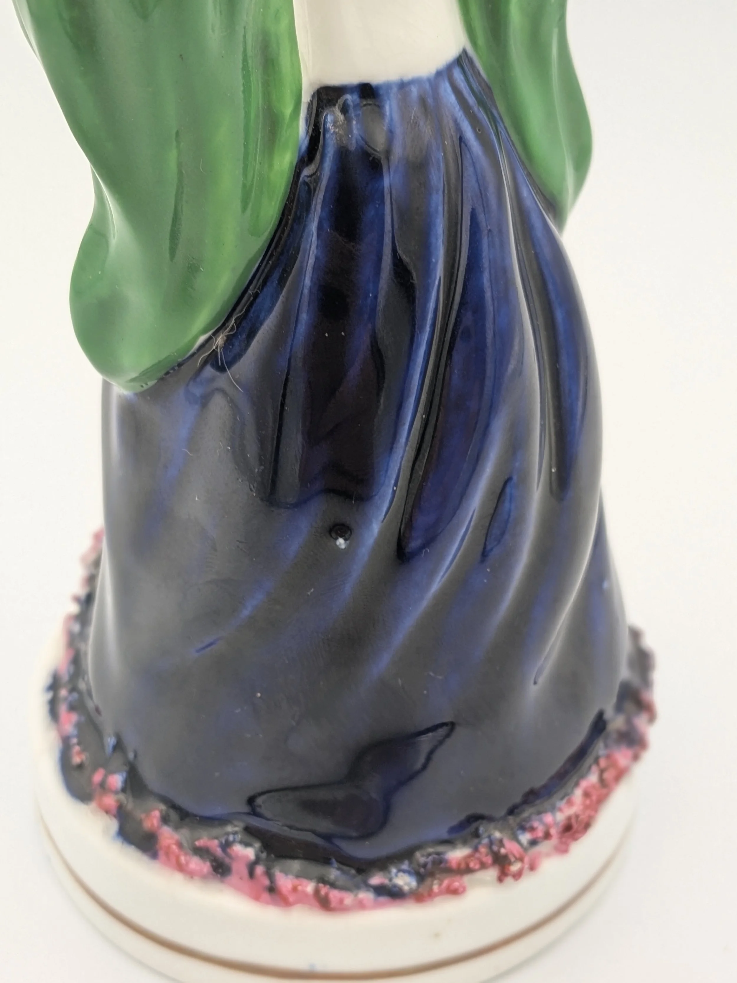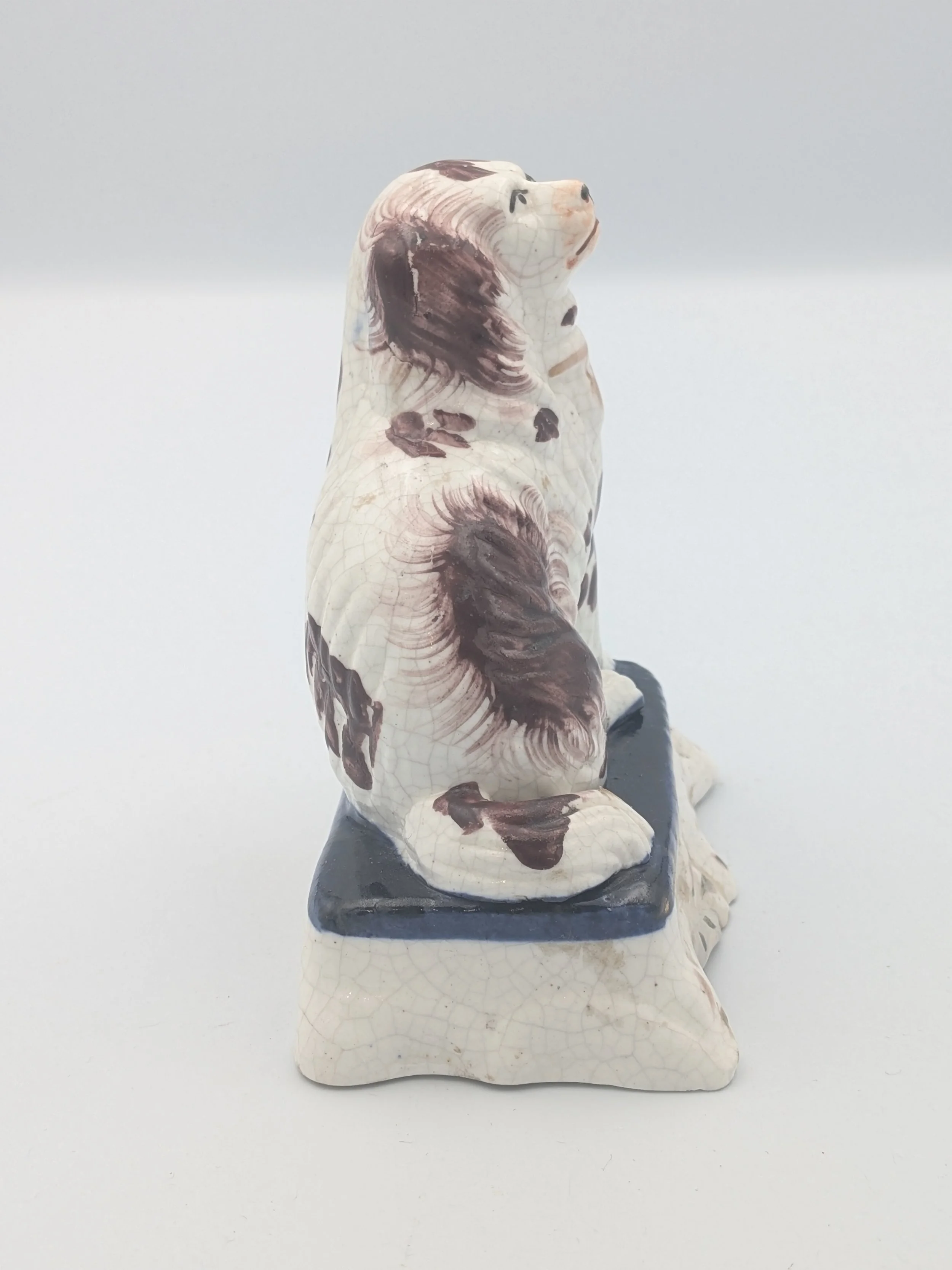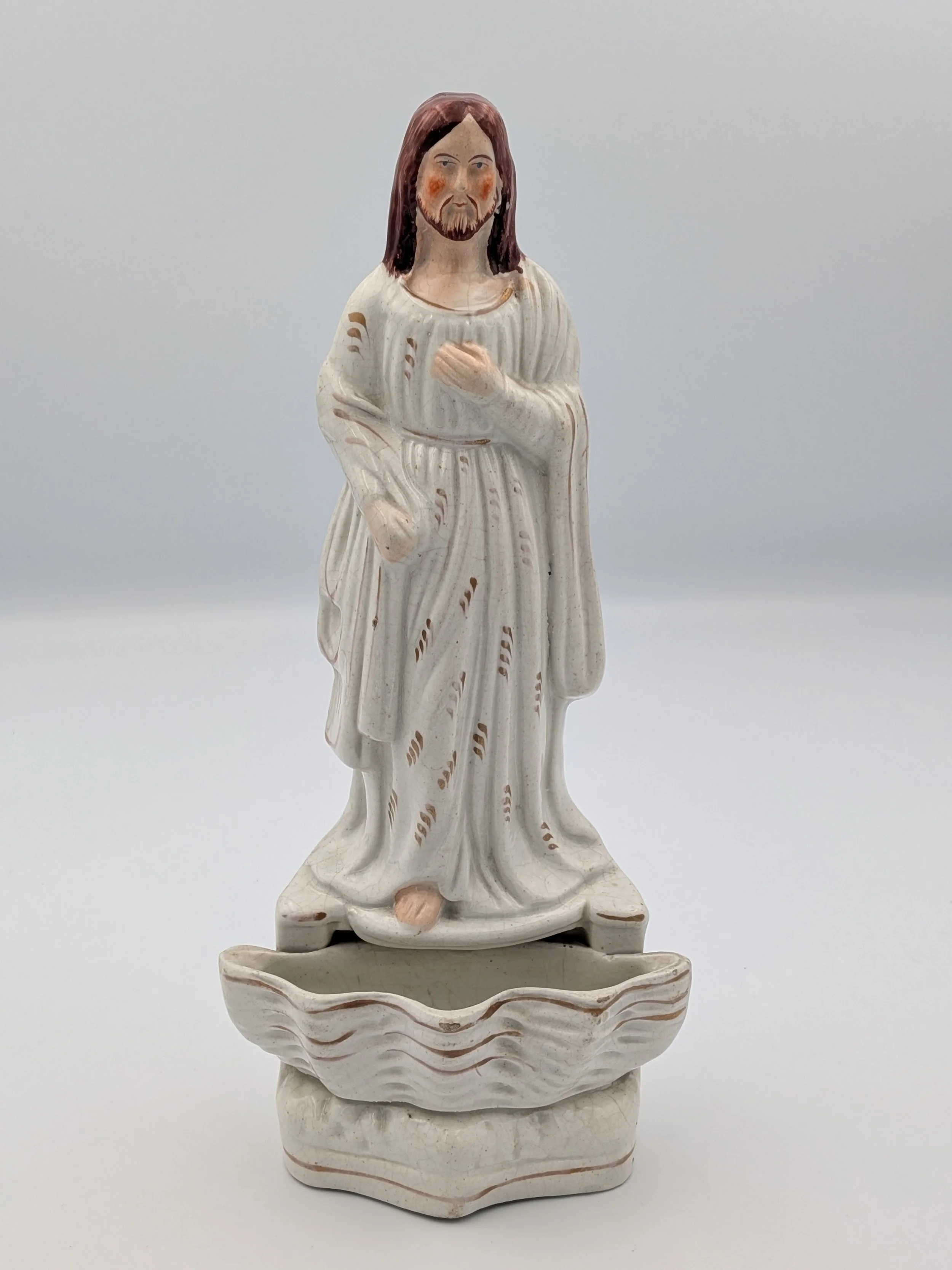 Staffordshire earthenware figures were produced from the late 18th century to the mid 20th century. Early (pre-1840) Staffordshire figures tend to be decorated ‘in the round’ and fairly elaborate with several handmade, press-moulded components including separately crafted limbs and bocage (leaves).