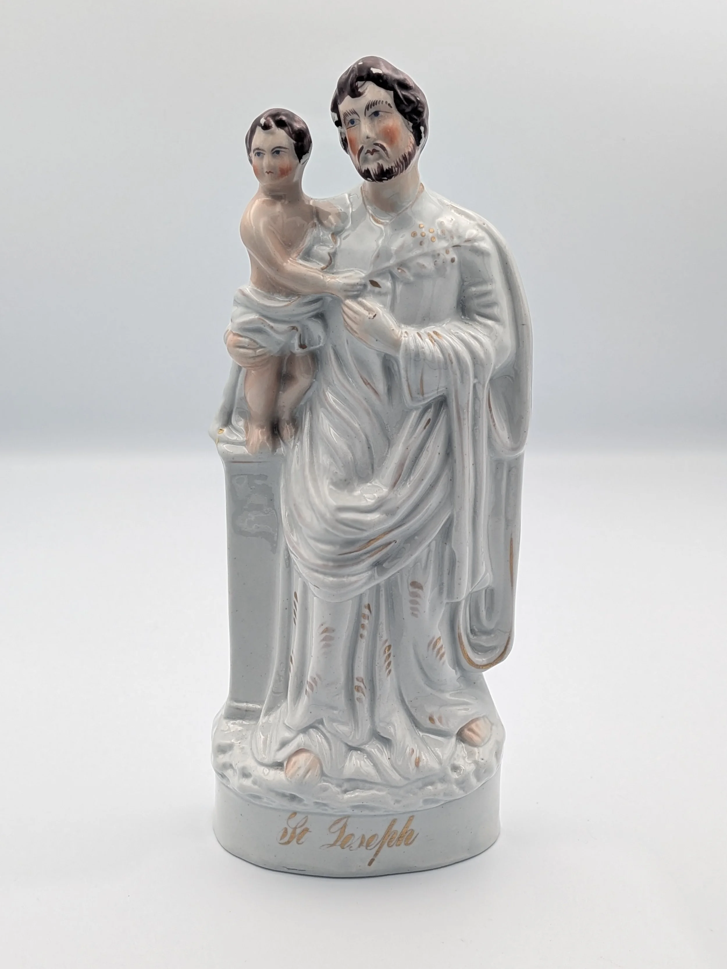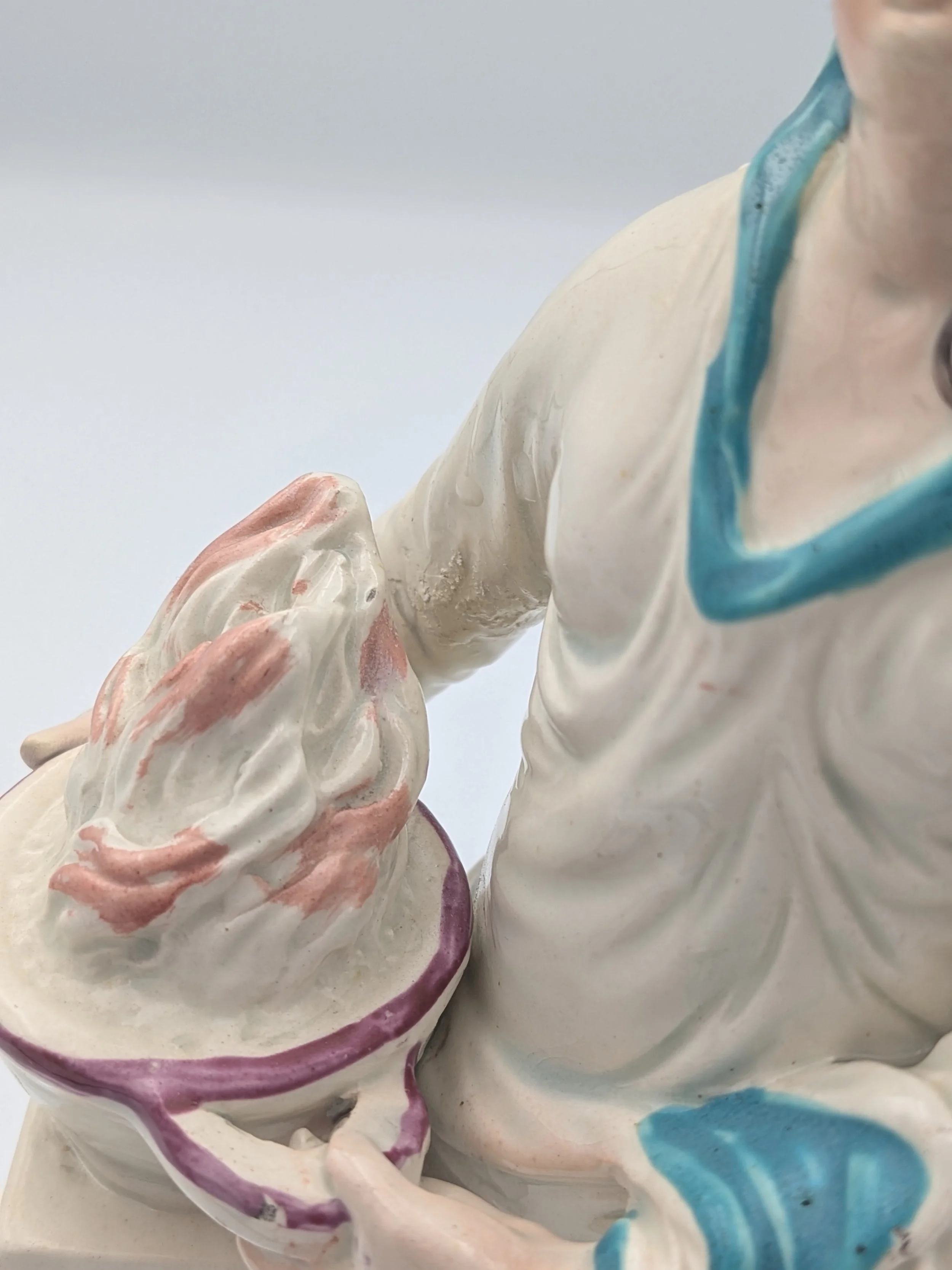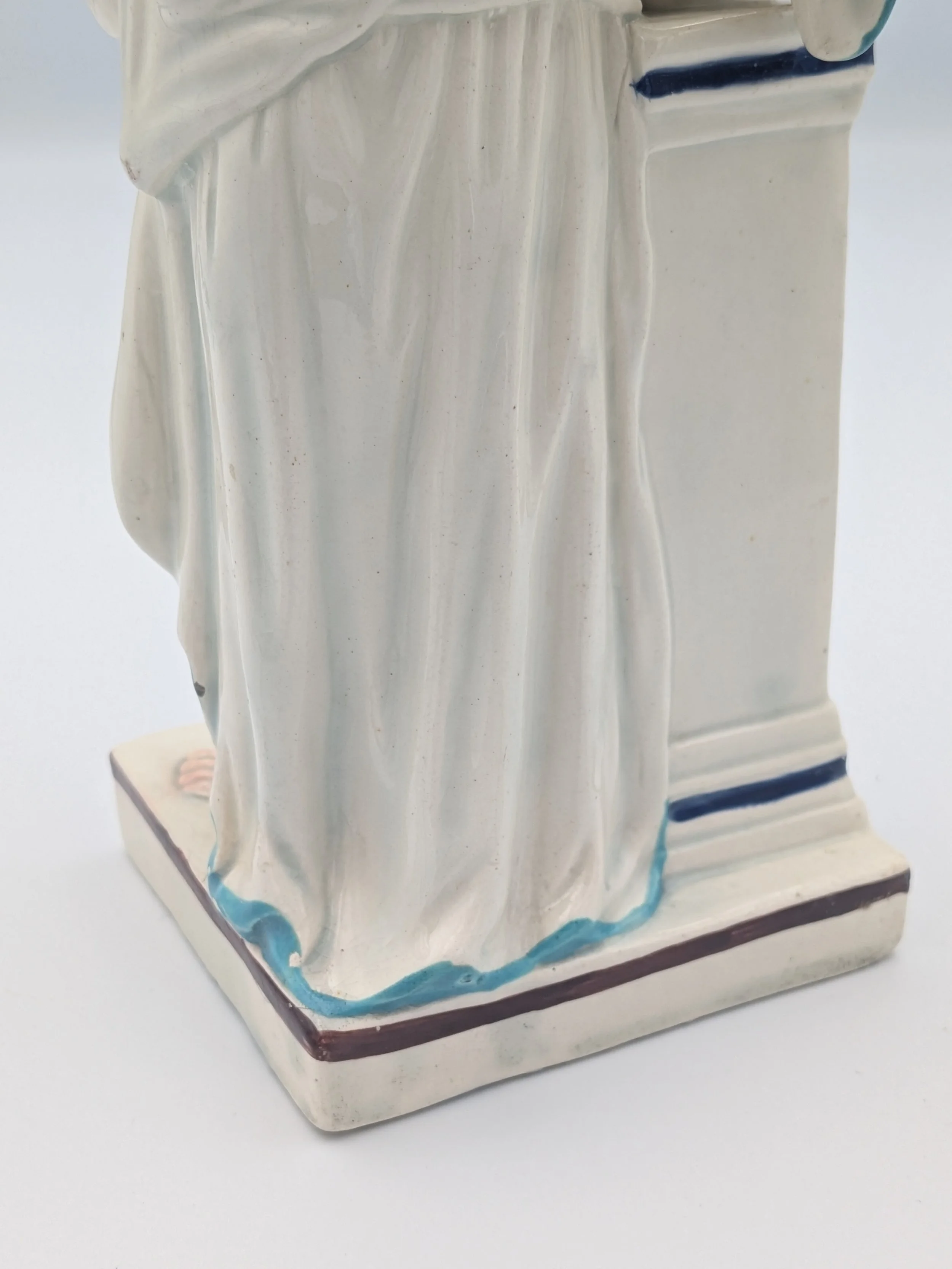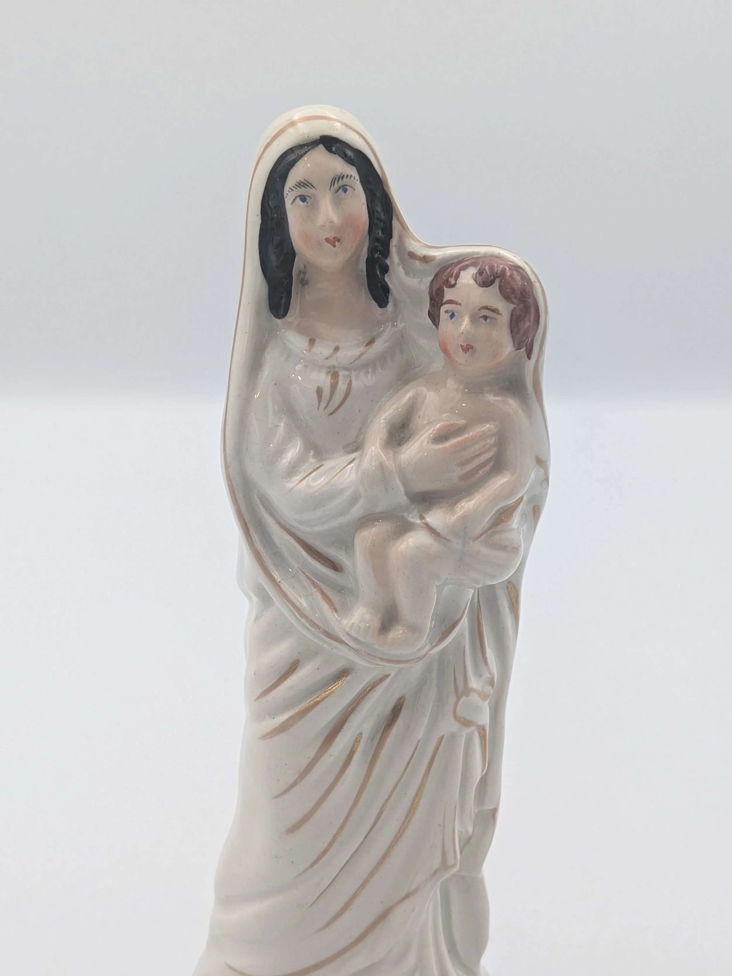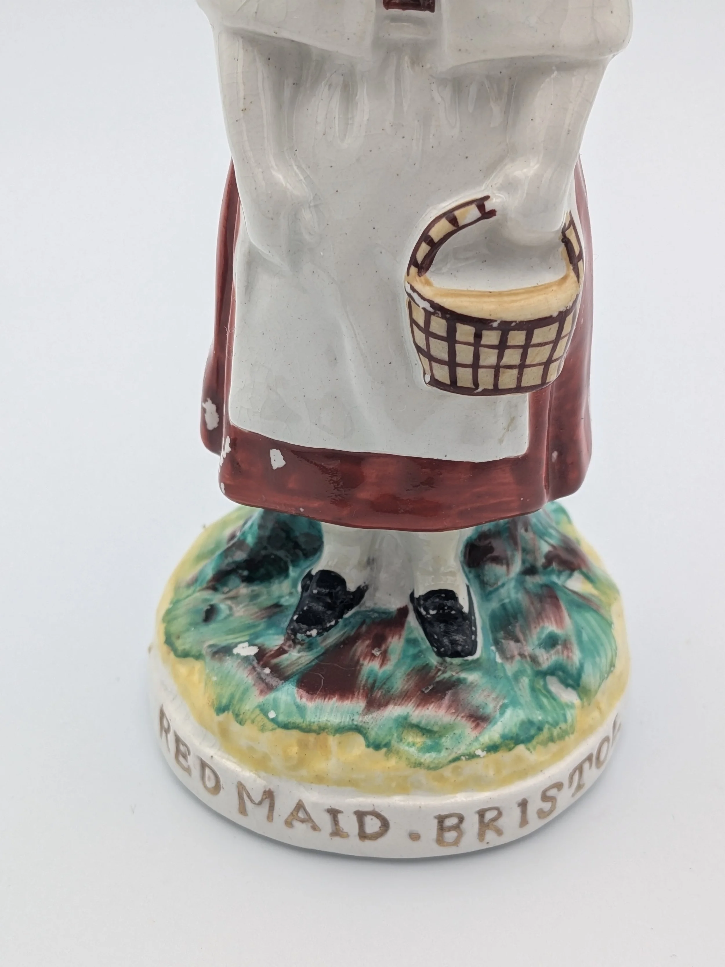 Staffordshire earthenware figures were produced from the late 18th century to the mid 20th century. Early (pre-1840) Staffordshire figures tend to be decorated ‘in the round’ and fairly elaborate with several handmade, press-moulded components including separately crafted limbs and bocage (leaves).