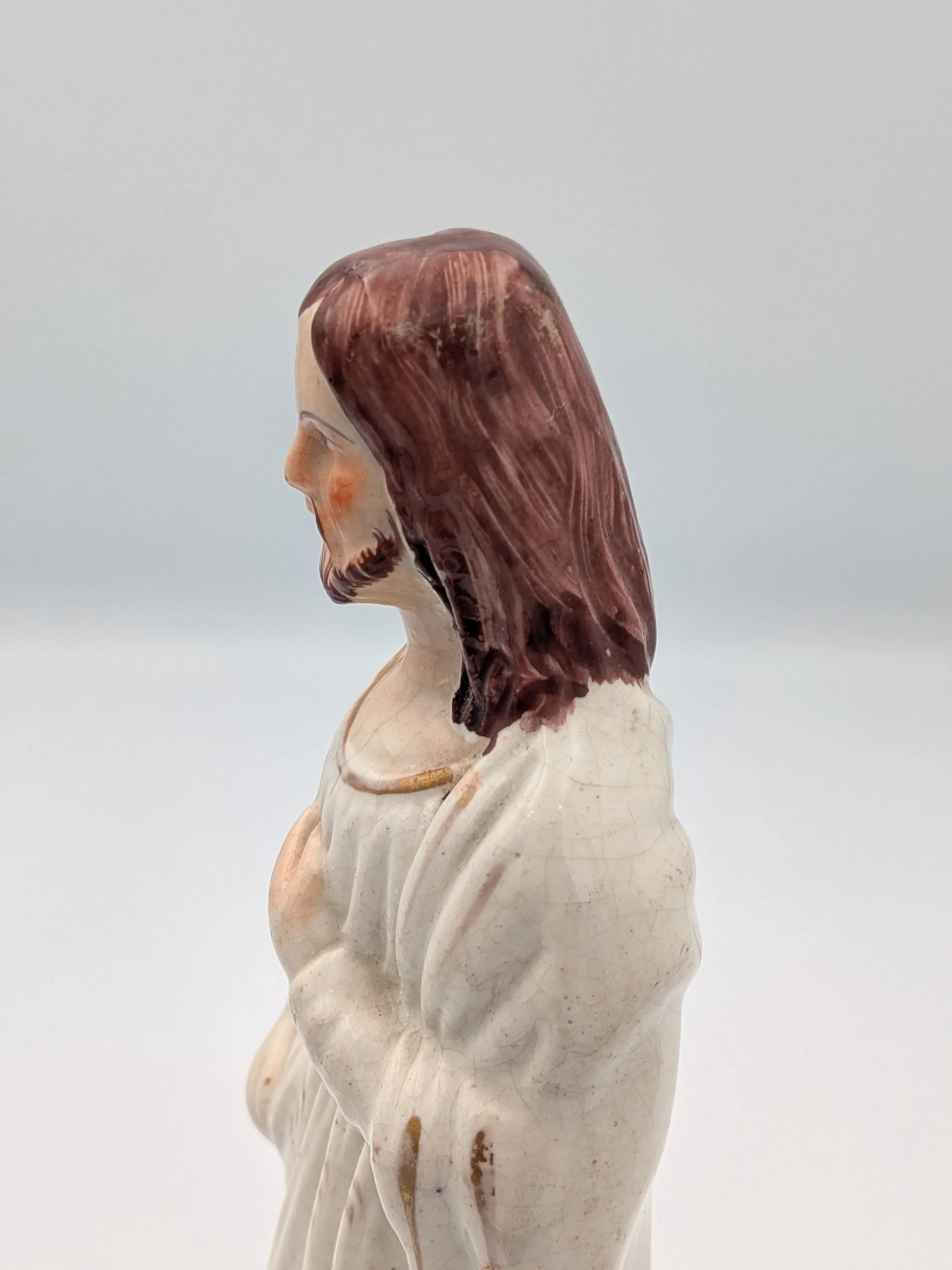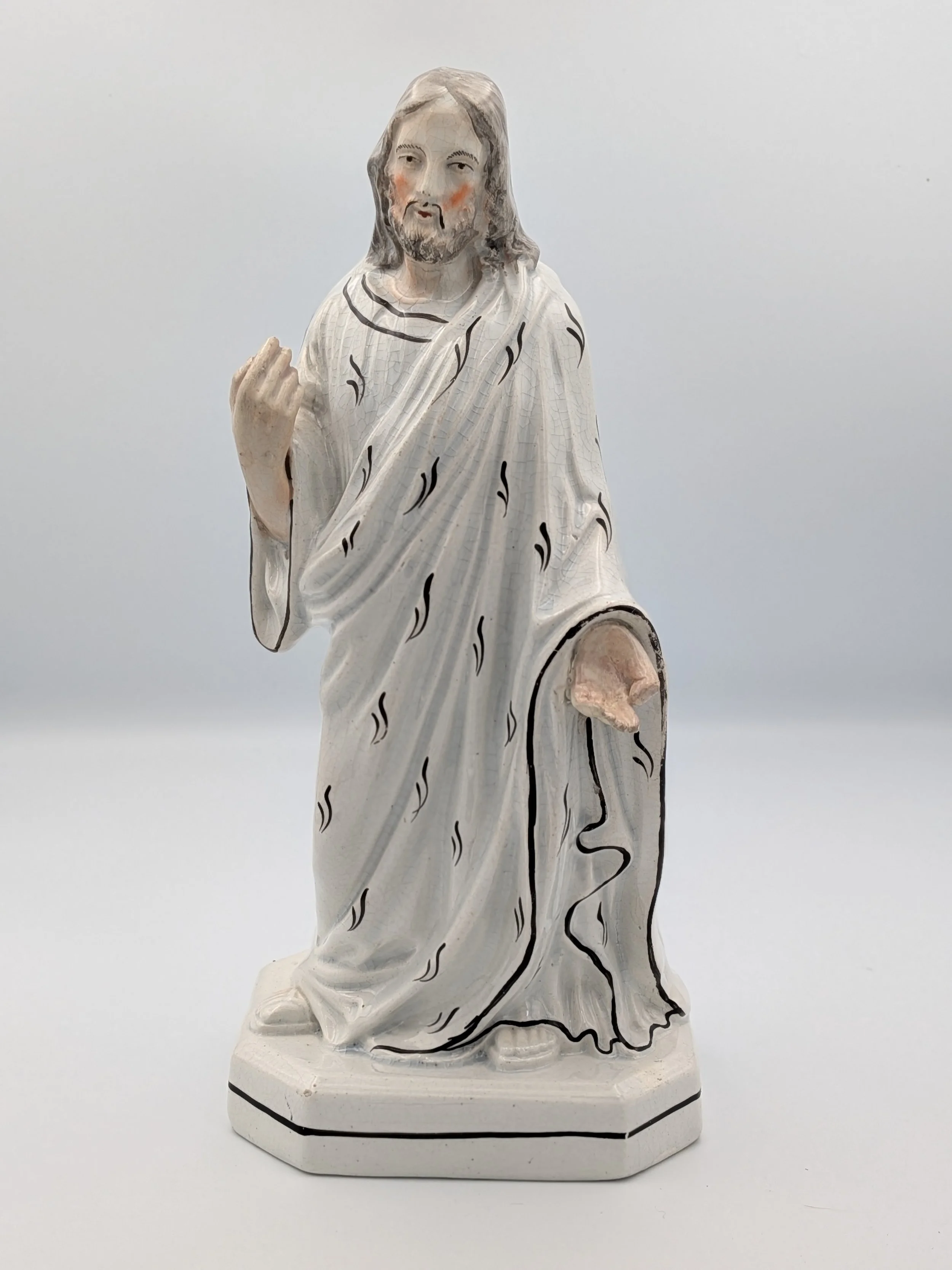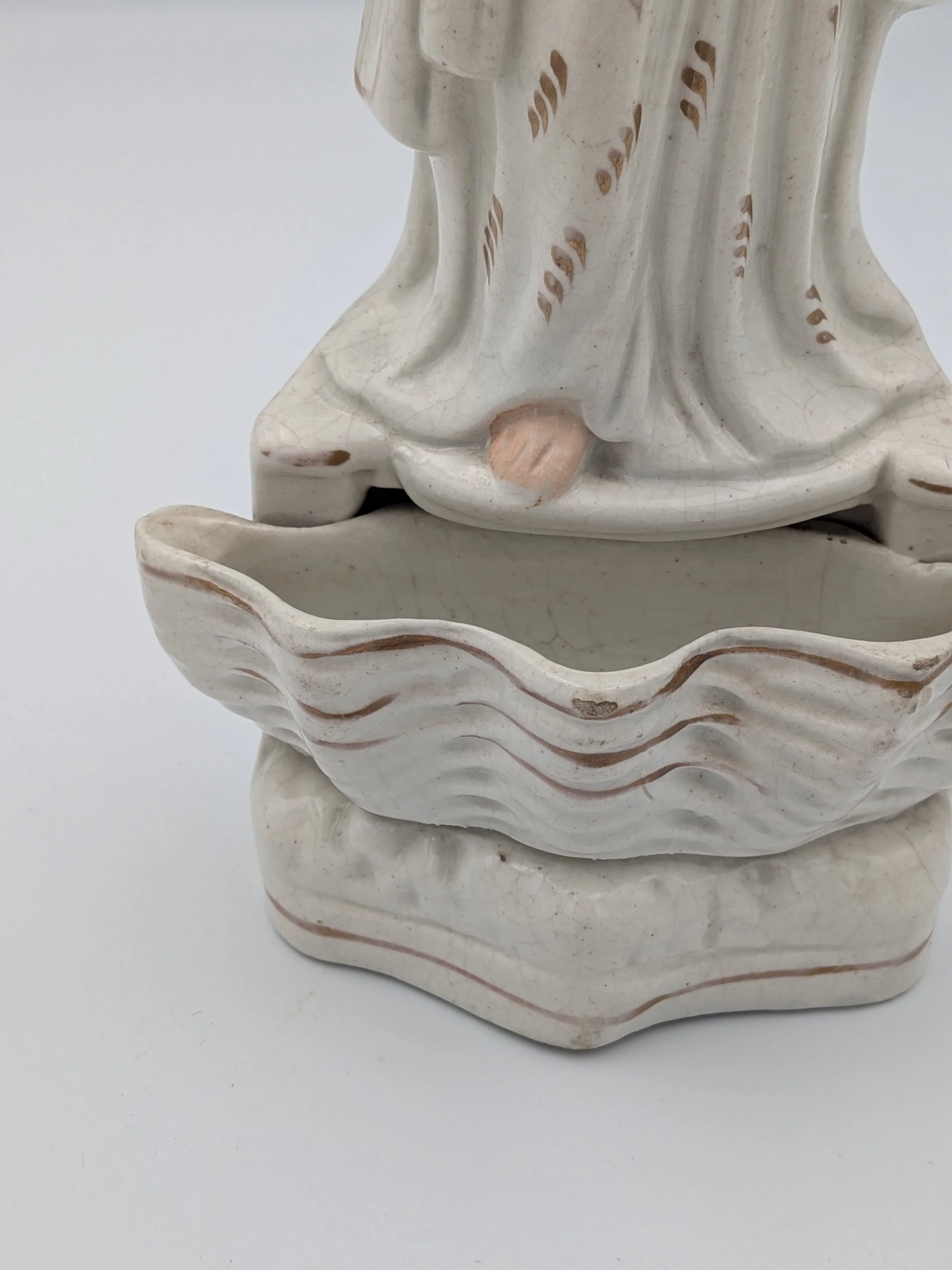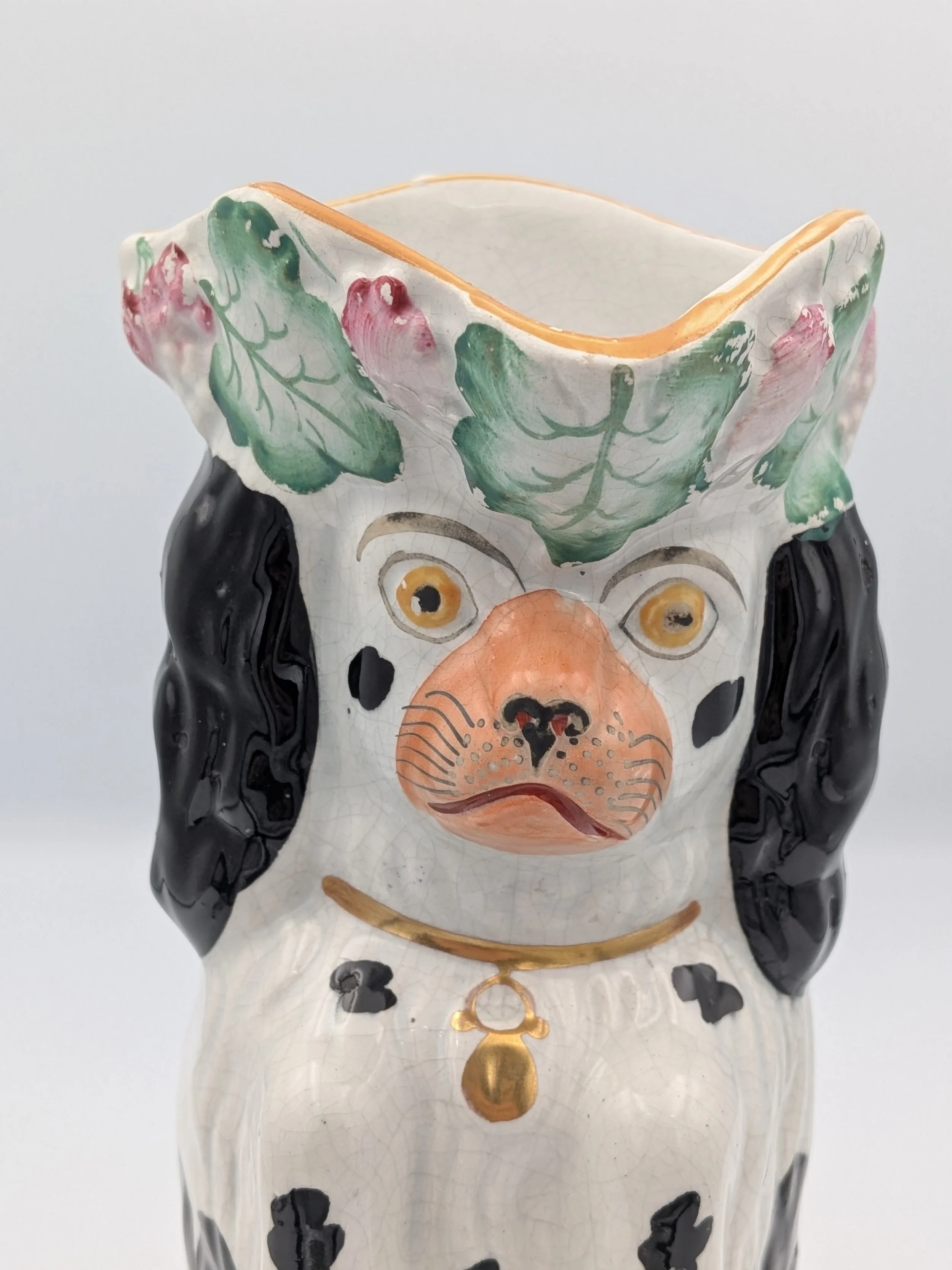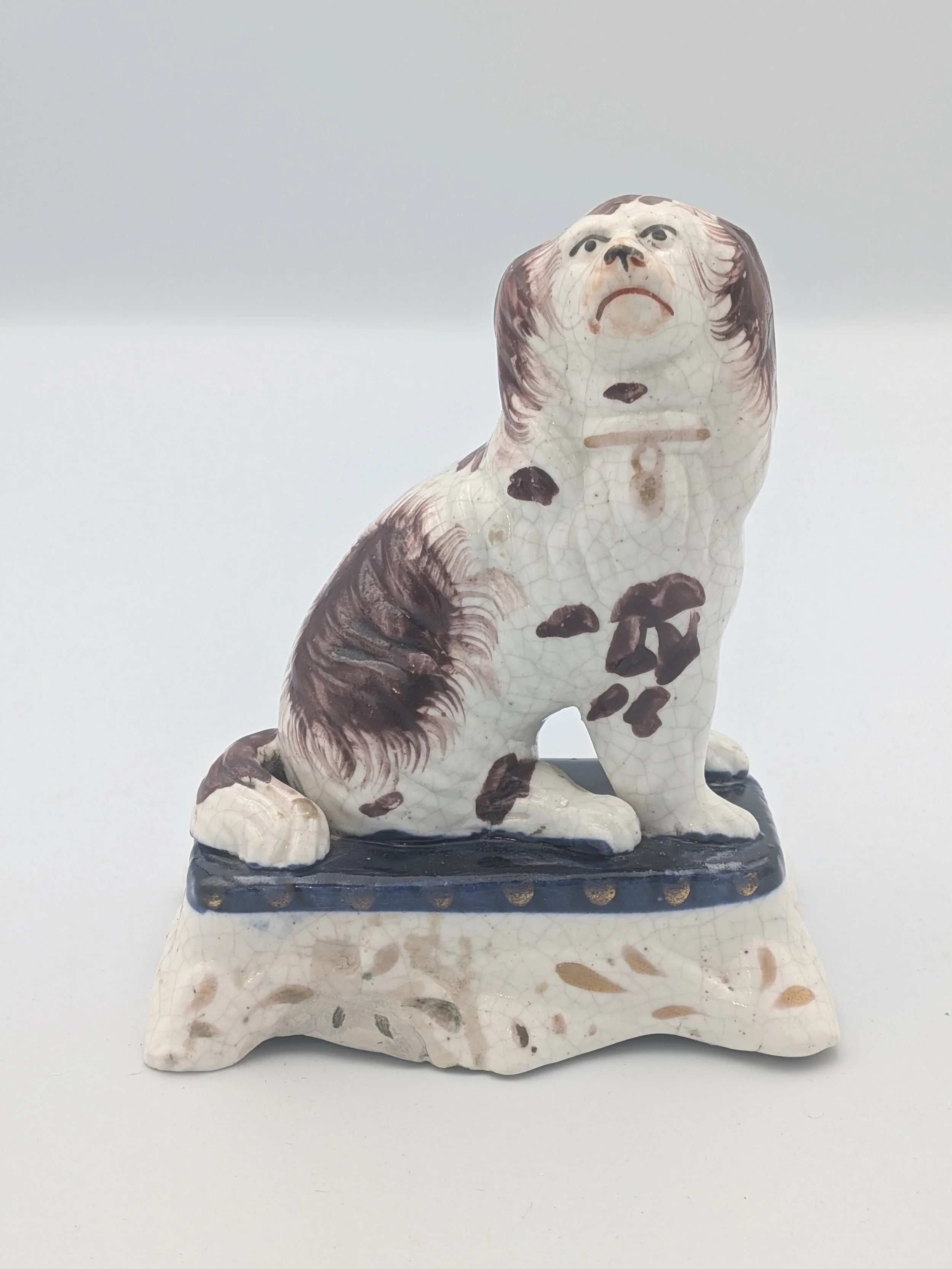 Staffordshire earthenware figures were produced from the late 18th century to the mid 20th century. Early (pre-1840) Staffordshire figures tend to be decorated ‘in the round’ and fairly elaborate with several handmade, press-moulded components including separately crafted limbs and bocage (leaves).