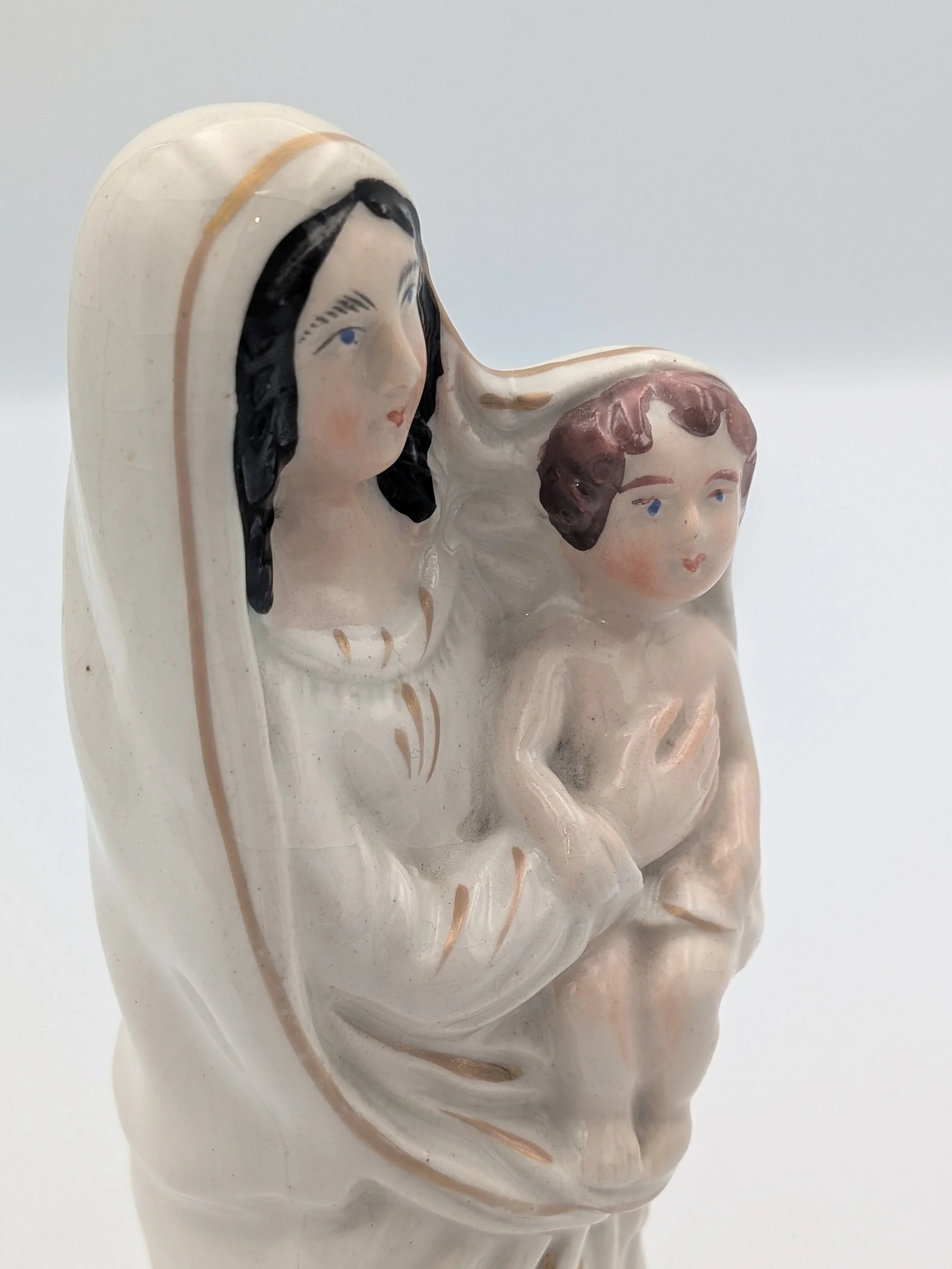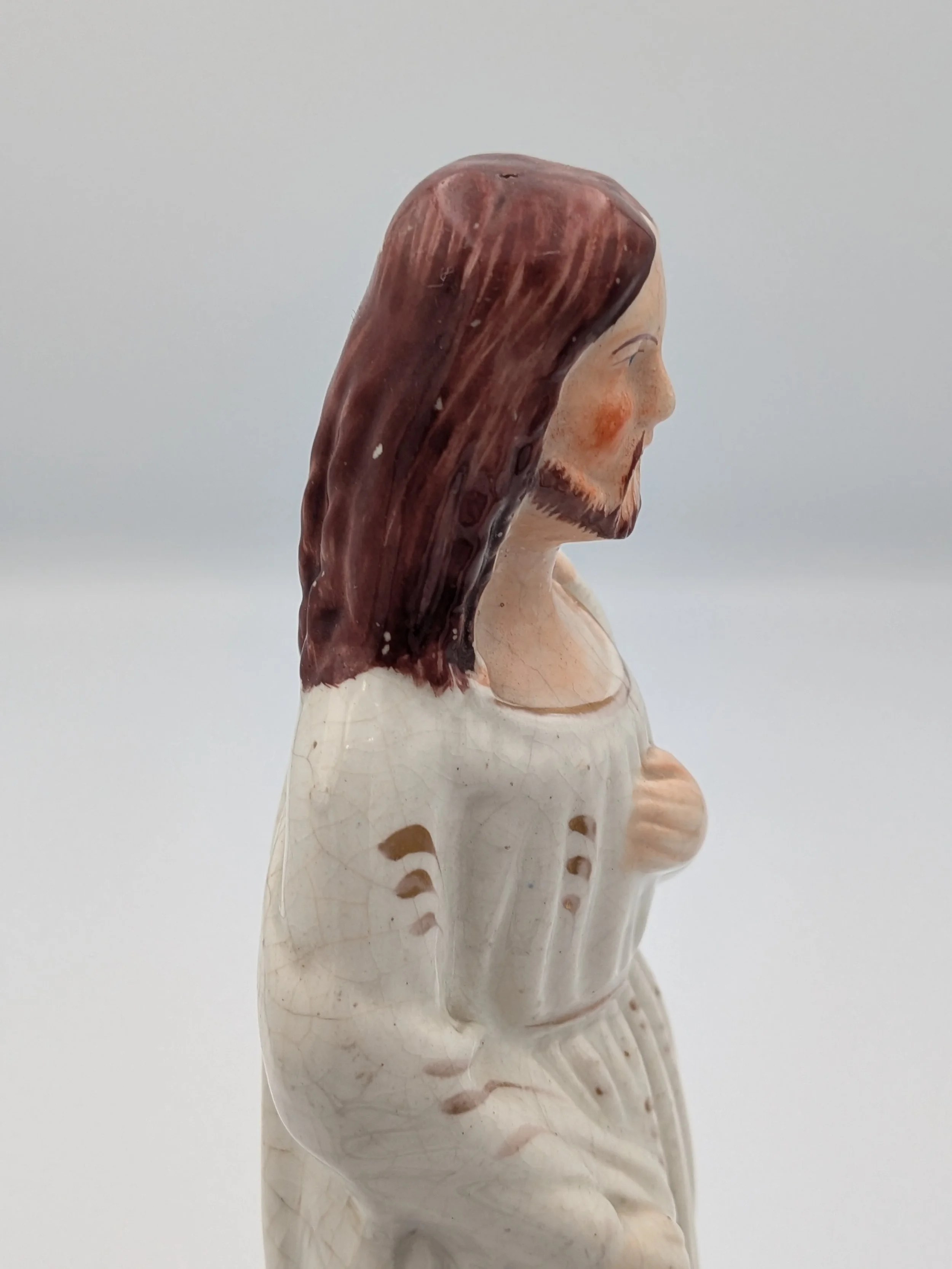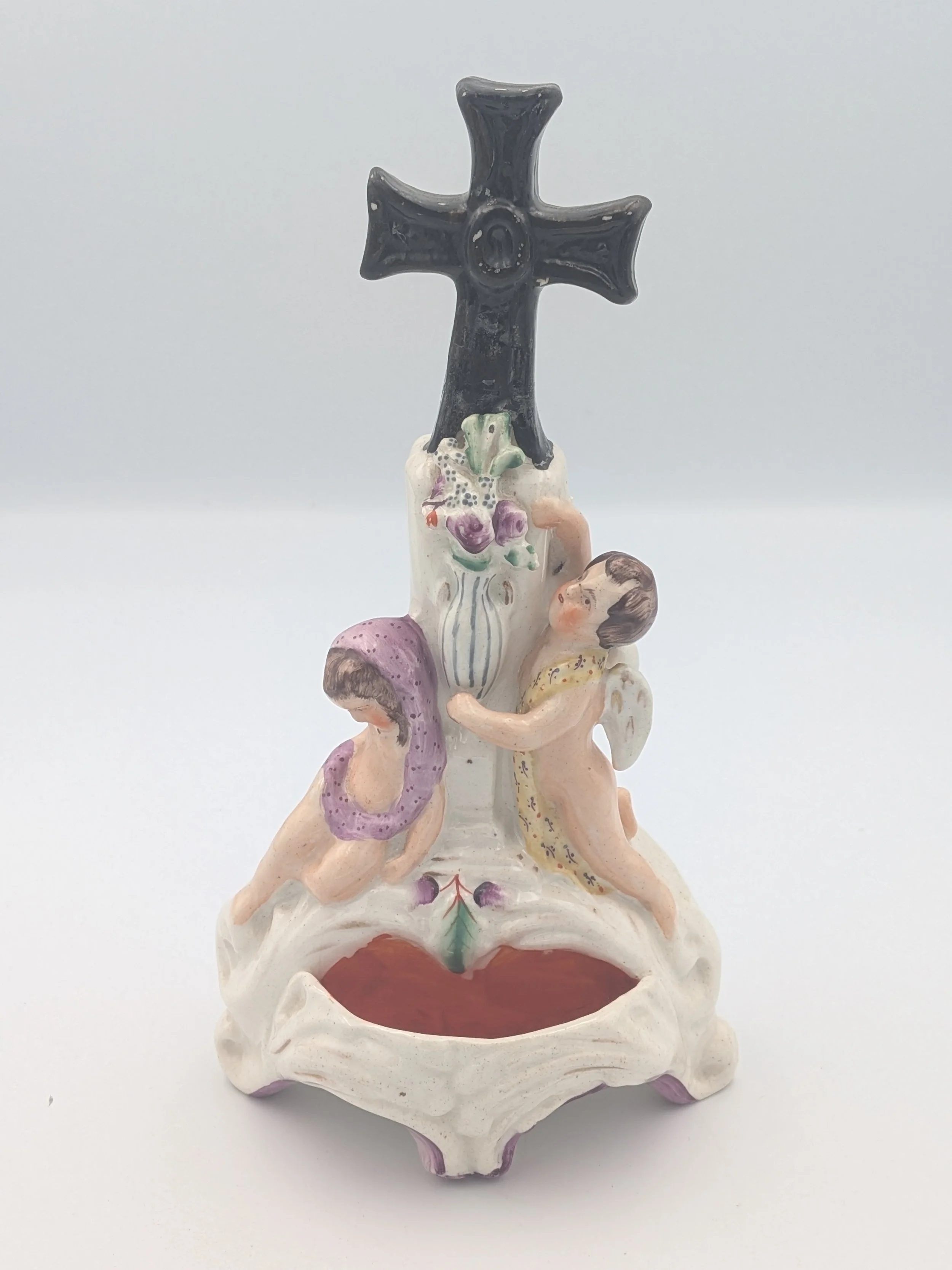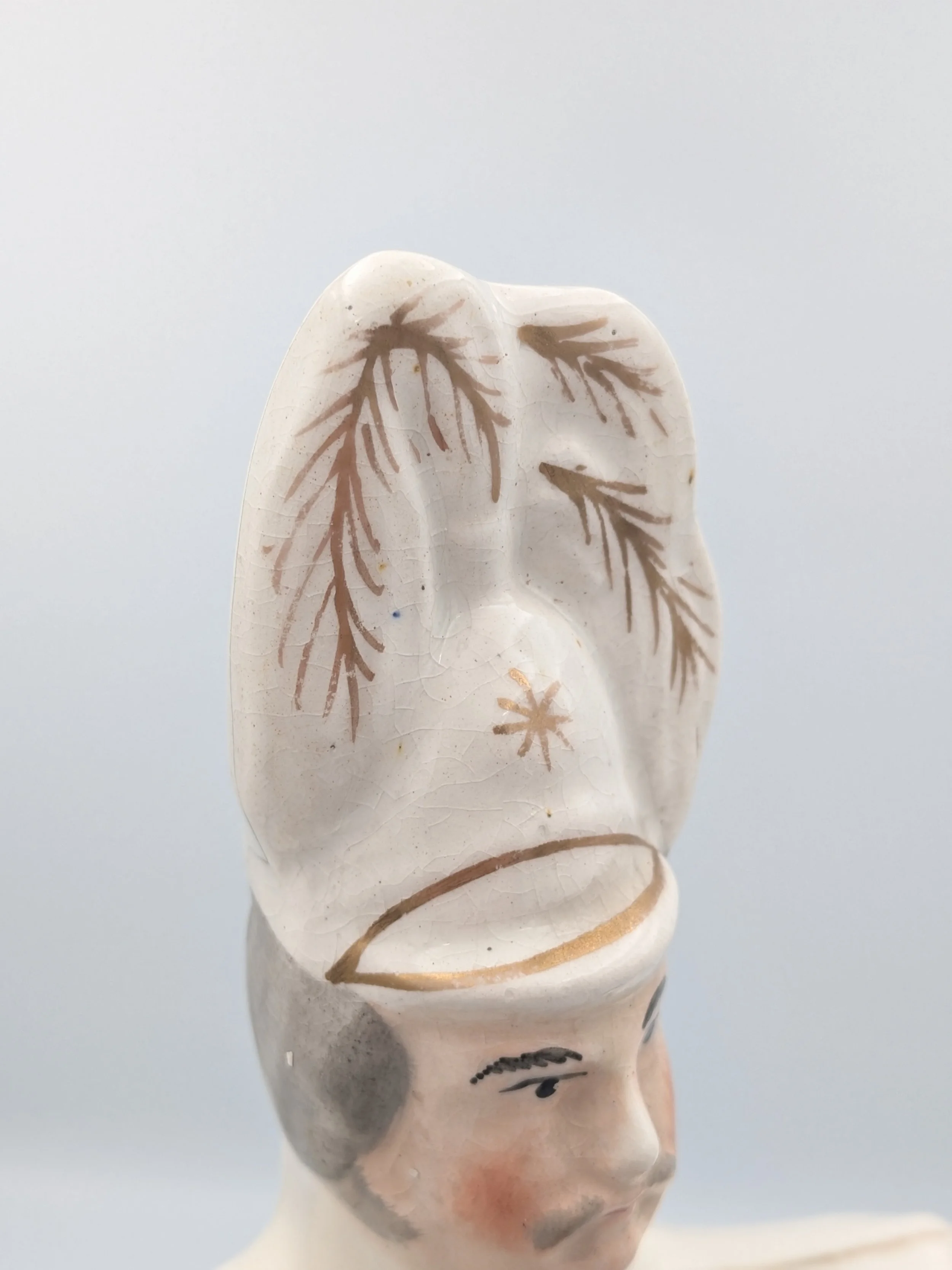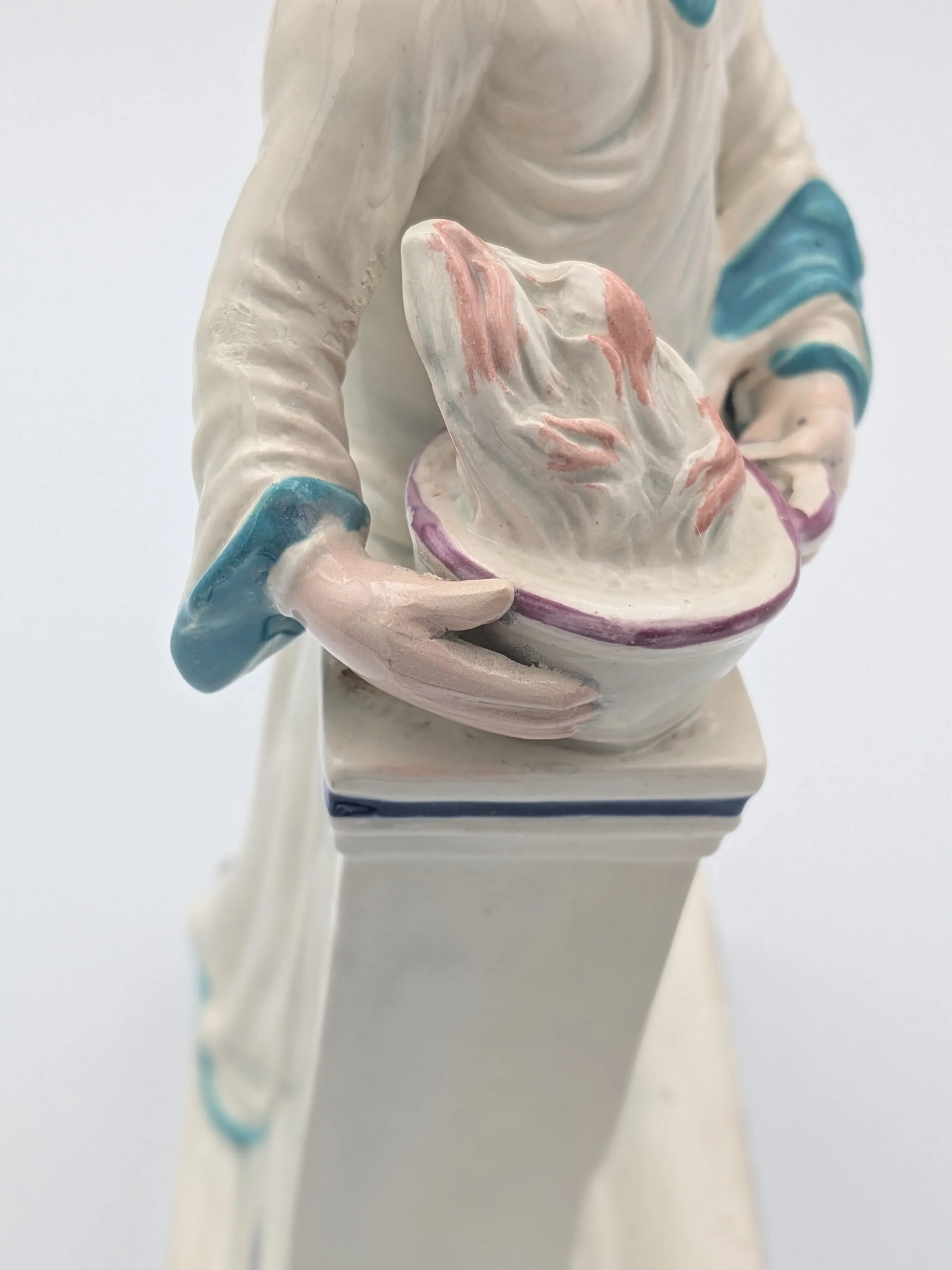 Staffordshire earthenware figures were produced from the late 18th century to the mid 20th century. Early (pre-1840) Staffordshire figures tend to be decorated ‘in the round’ and fairly elaborate with several handmade, press-moulded components including separately crafted limbs and bocage (leaves).