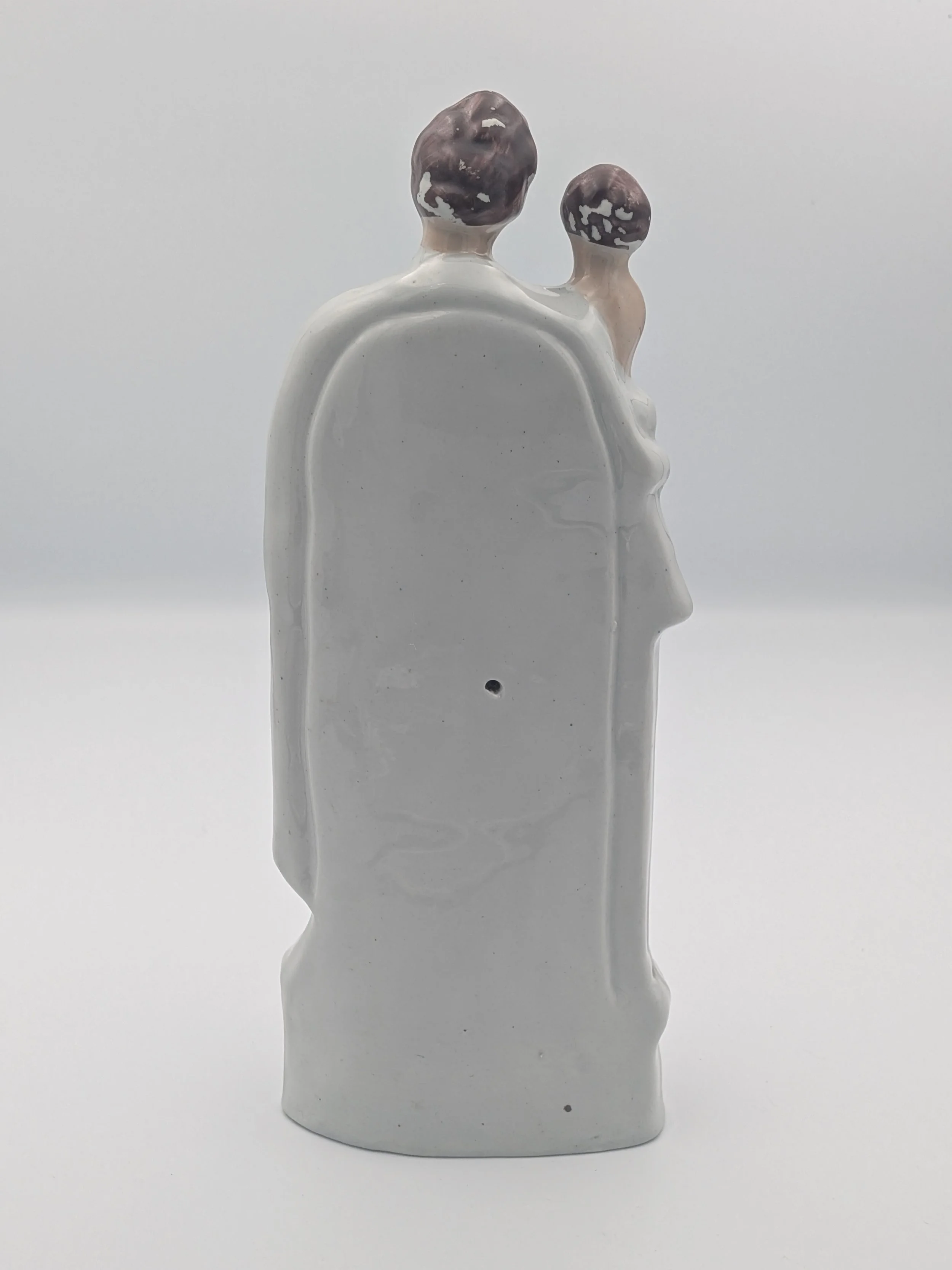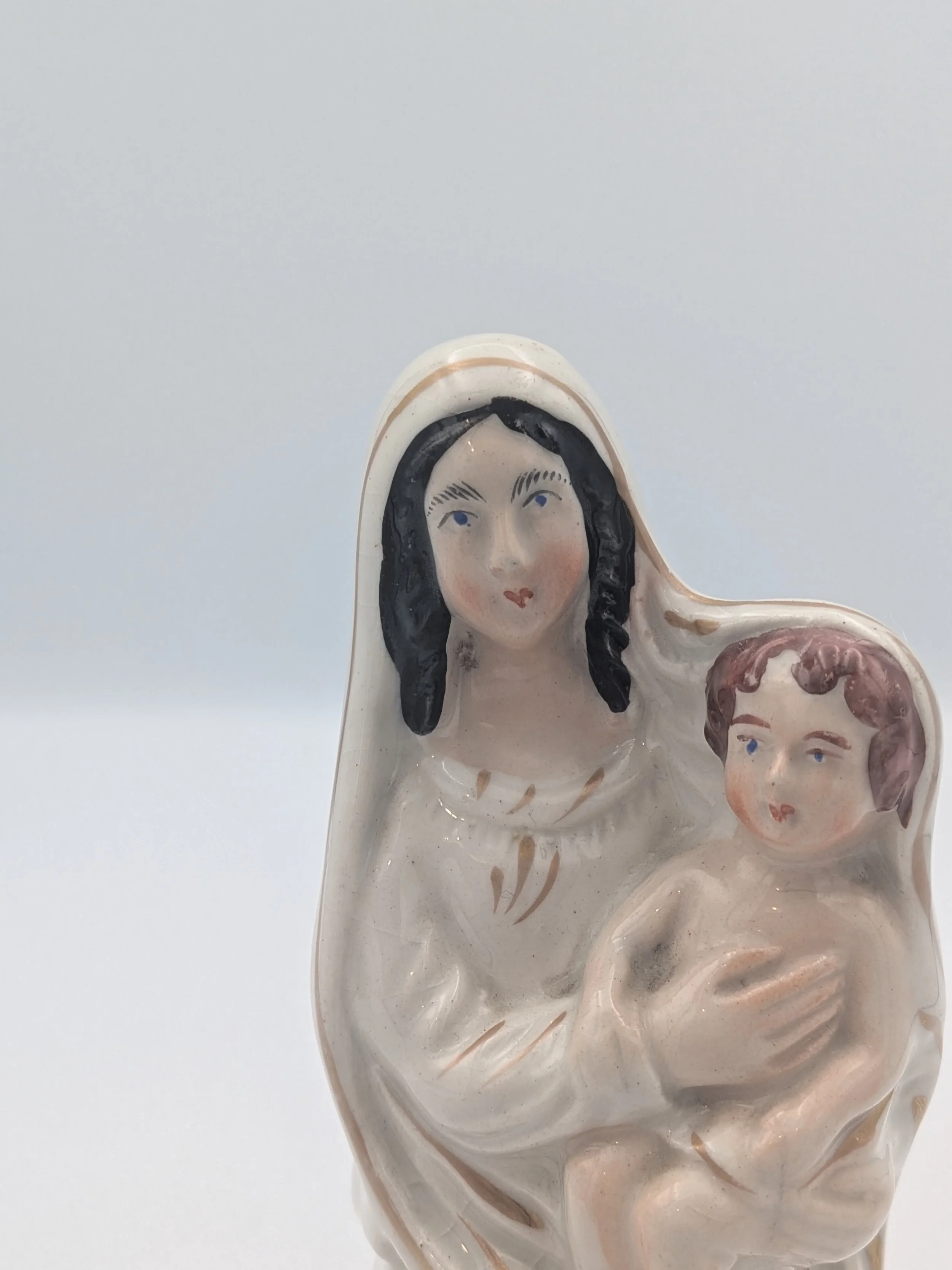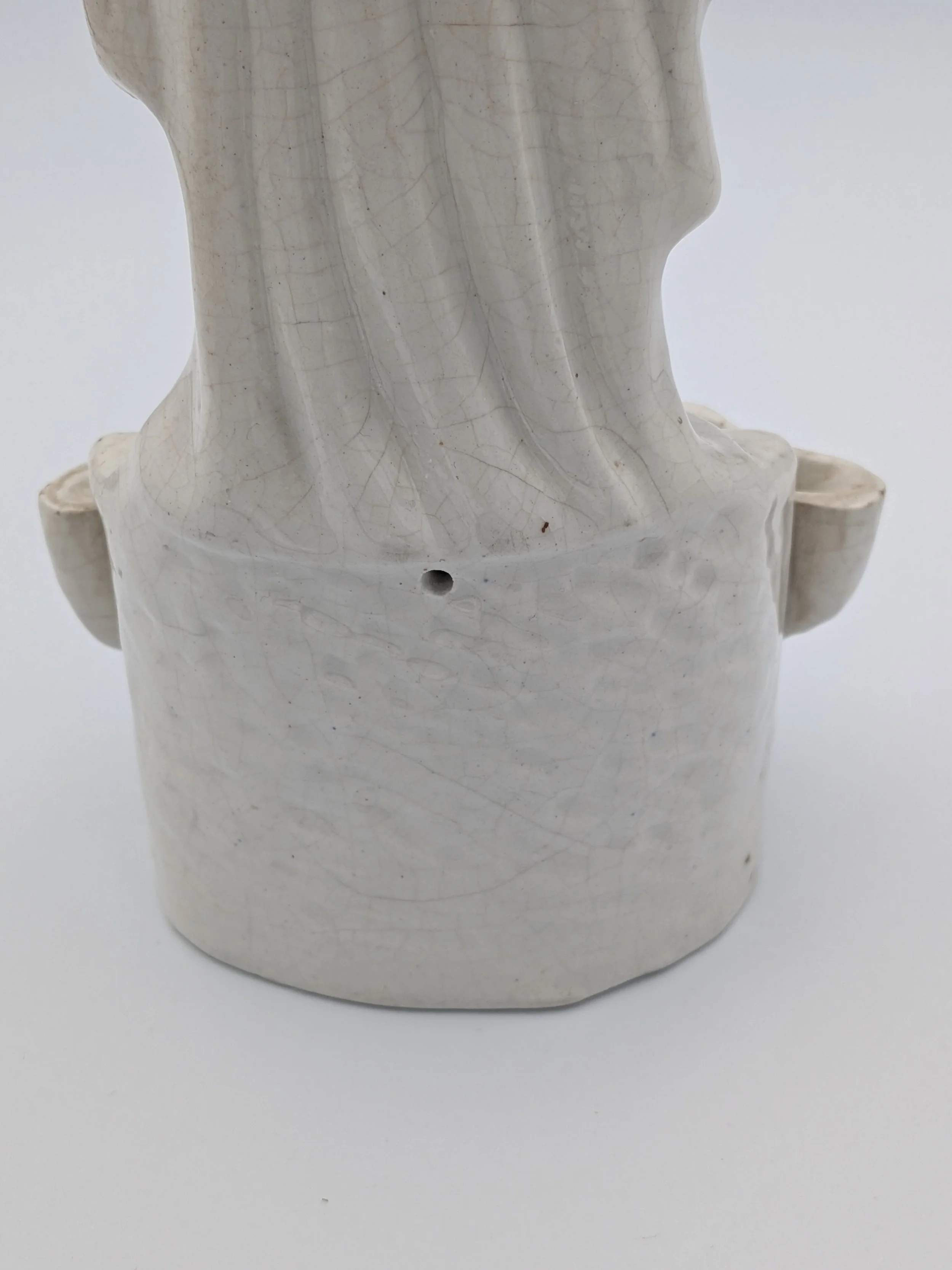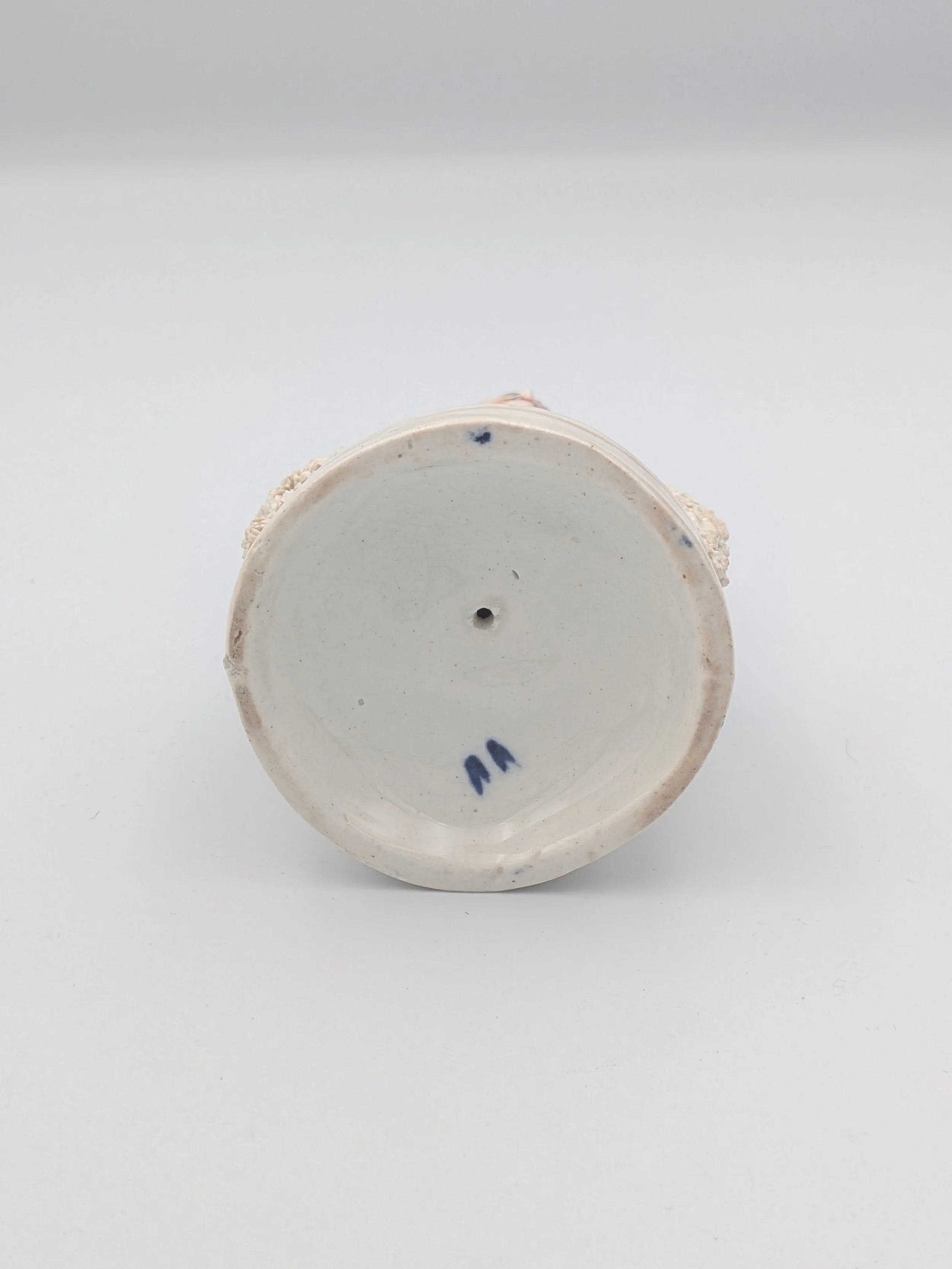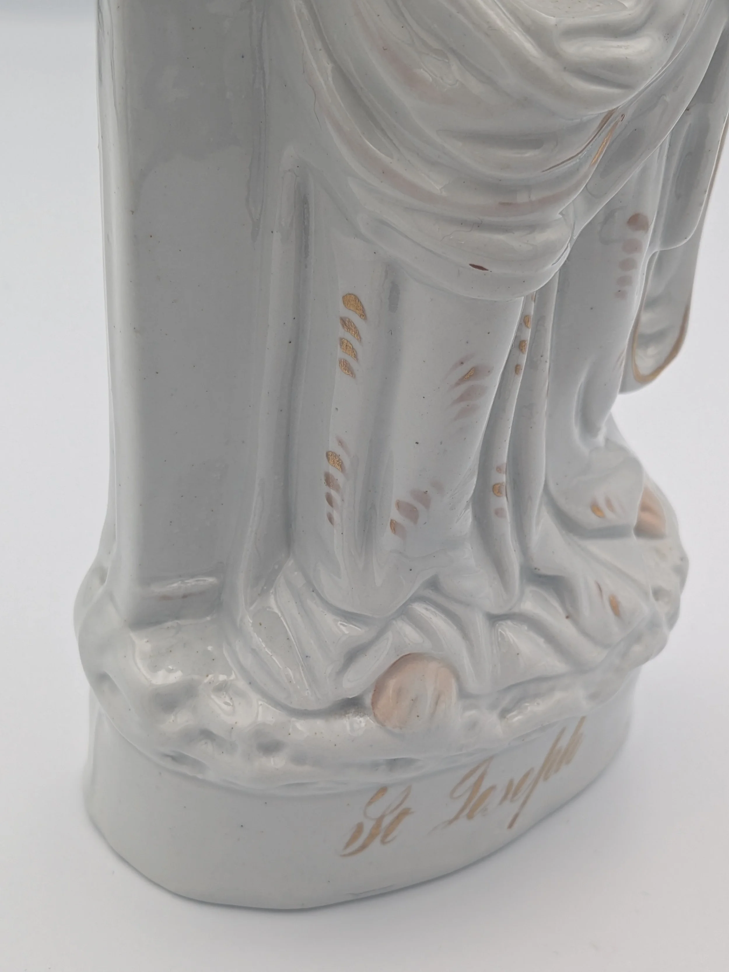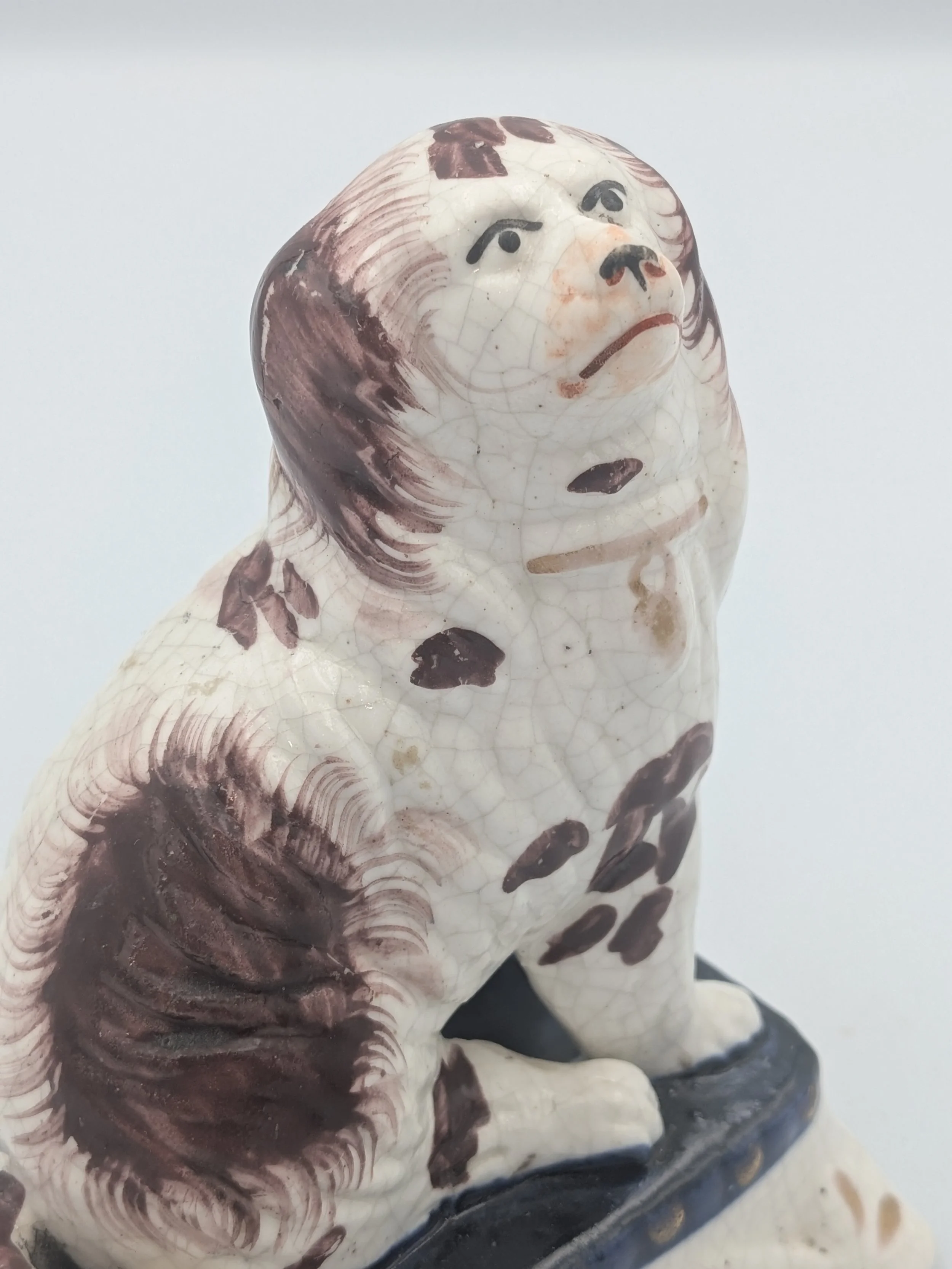 Staffordshire earthenware figures were produced from the late 18th century to the mid 20th century. Early (pre-1840) Staffordshire figures tend to be decorated ‘in the round’ and fairly elaborate with several handmade, press-moulded components including separately crafted limbs and bocage (leaves).