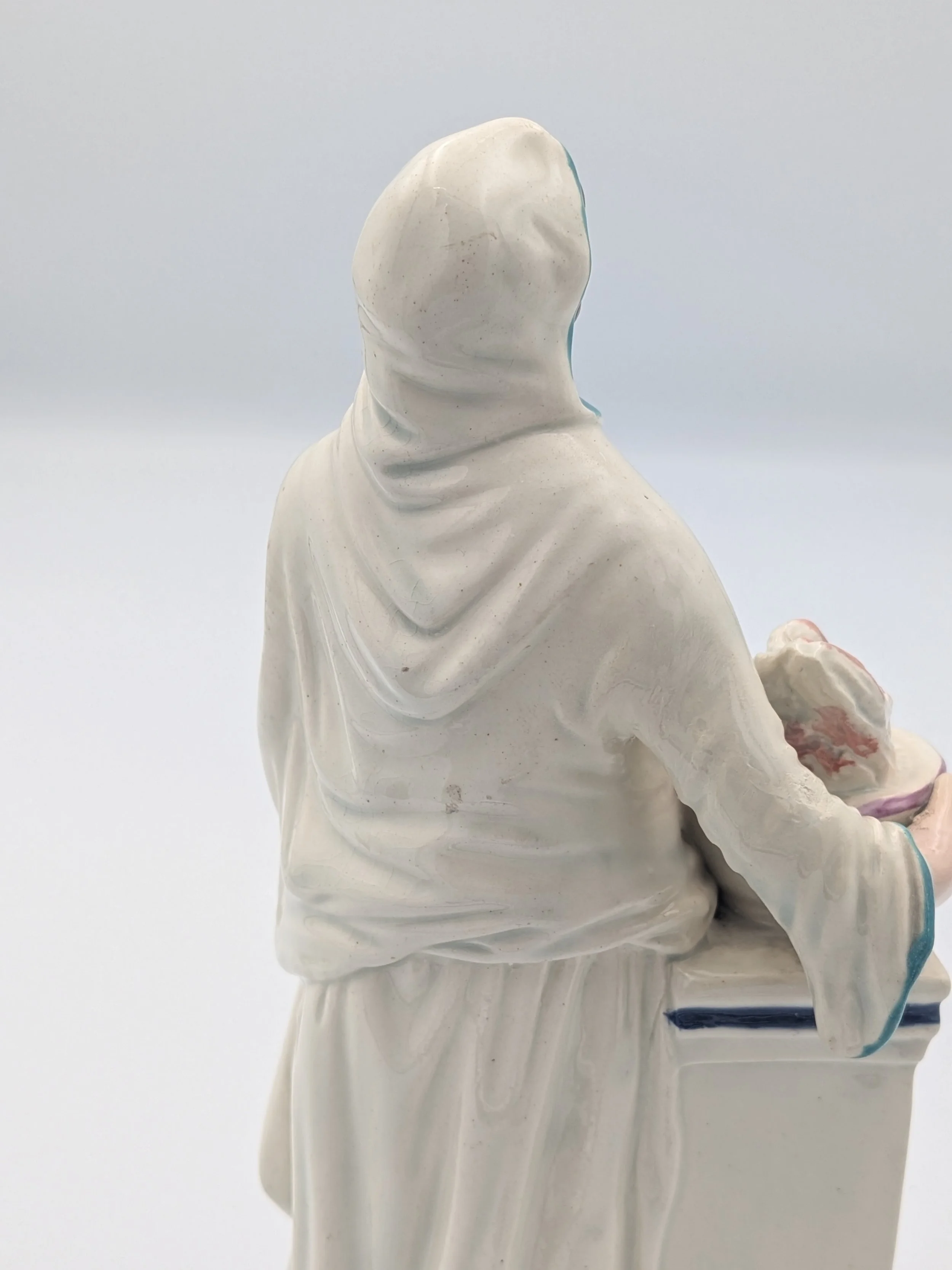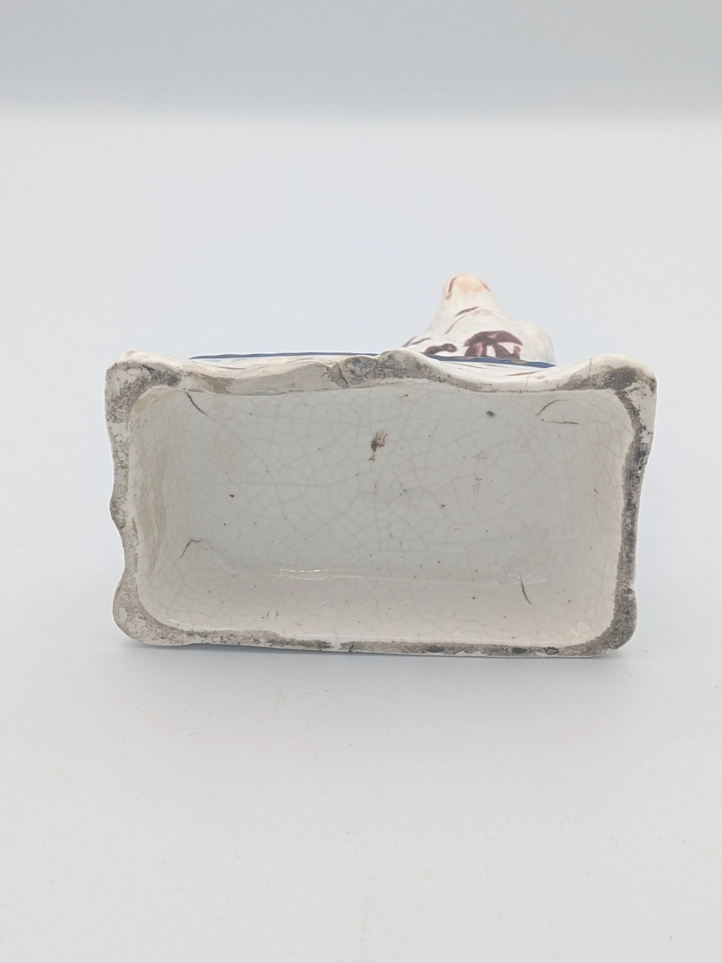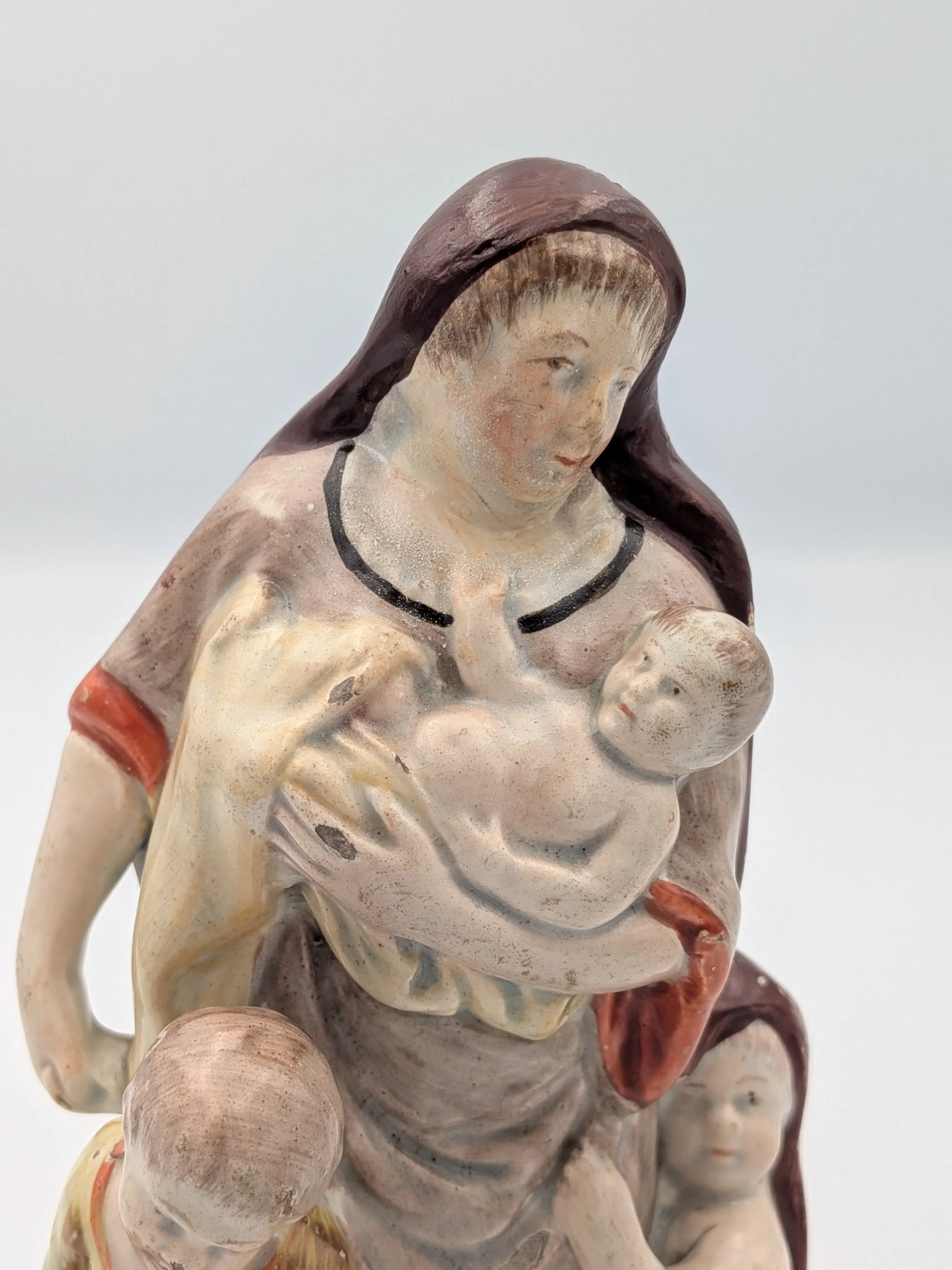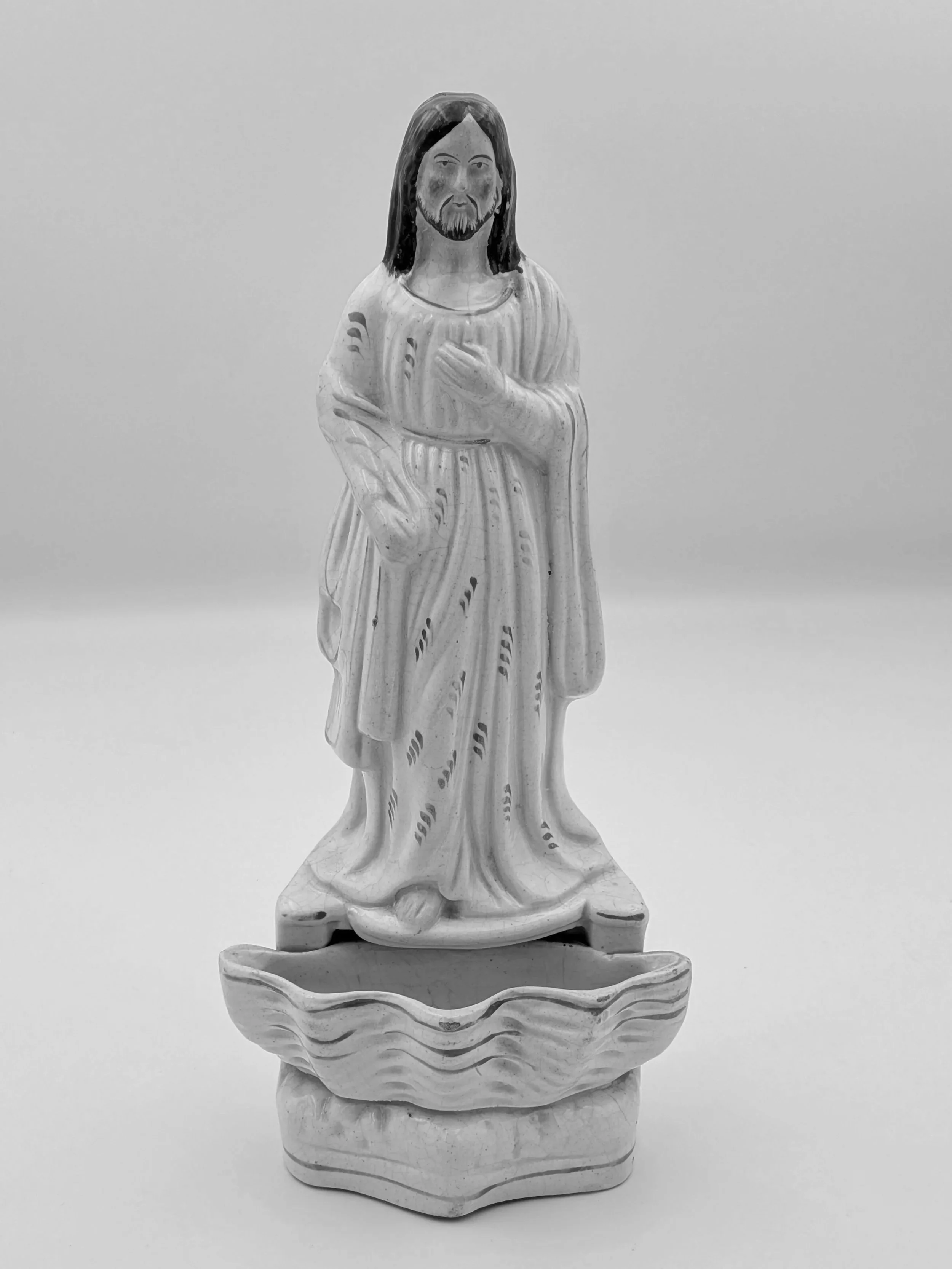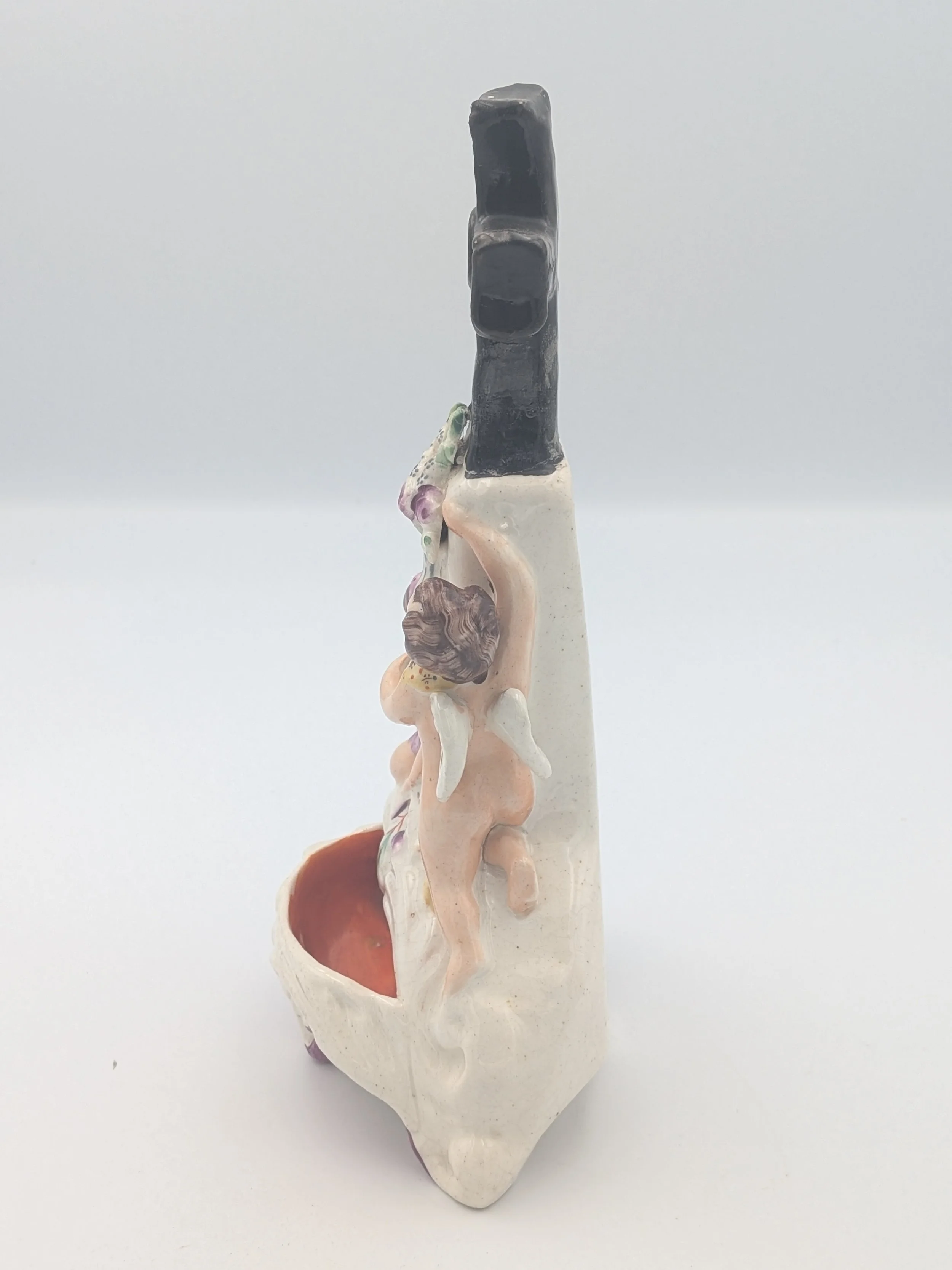 Staffordshire earthenware figures were produced from the late 18th century to the mid 20th century. Early (pre-1840) Staffordshire figures tend to be decorated ‘in the round’ and fairly elaborate with several handmade, press-moulded components including separately crafted limbs and bocage (leaves).