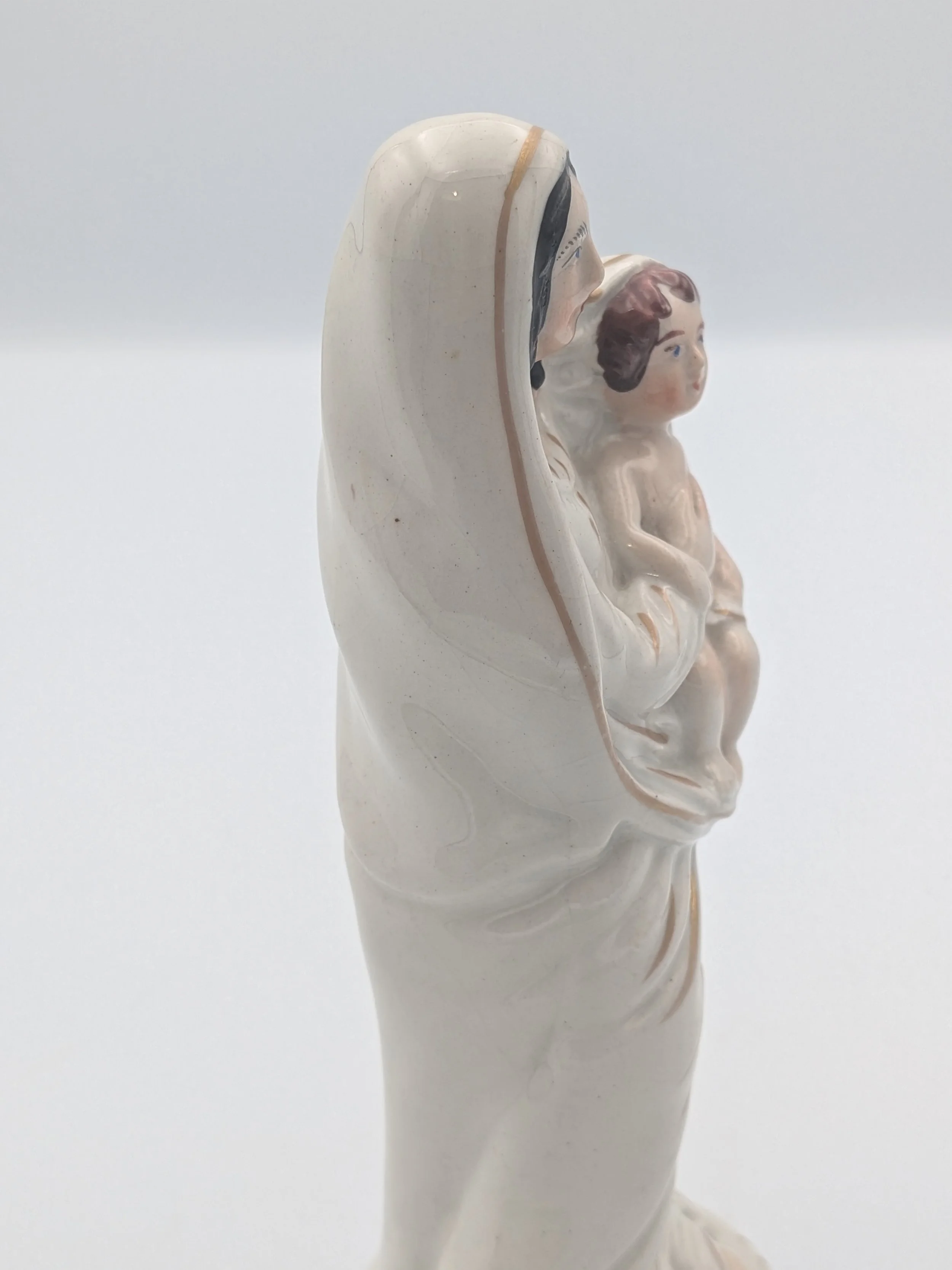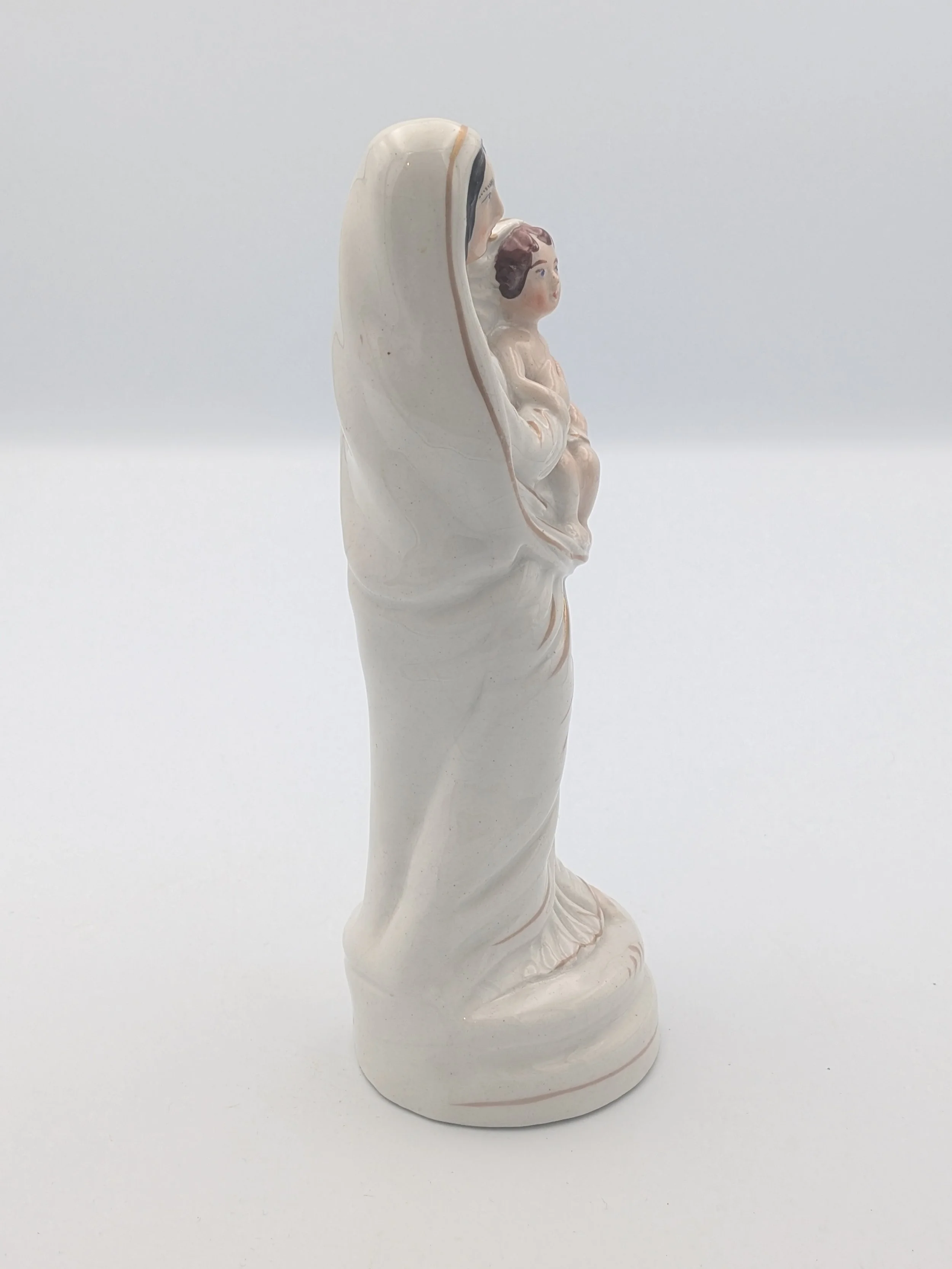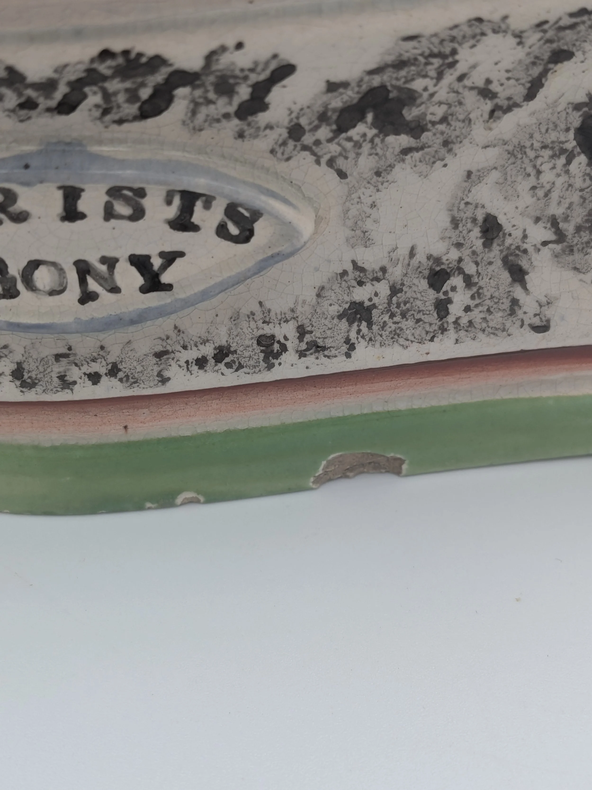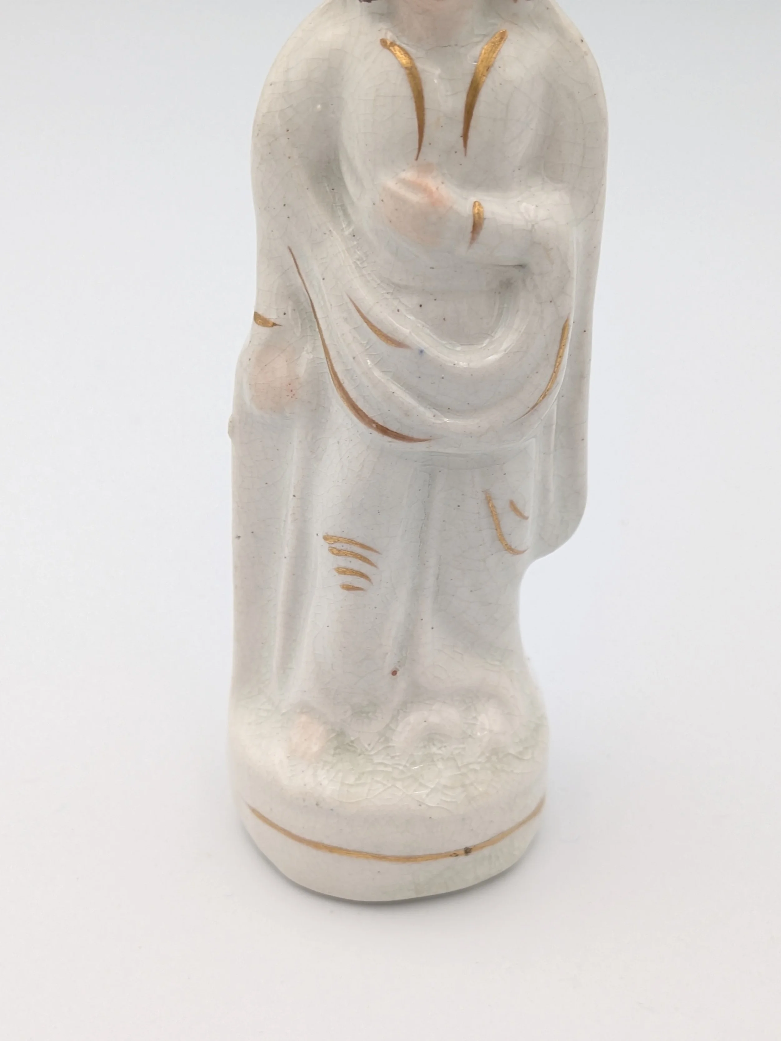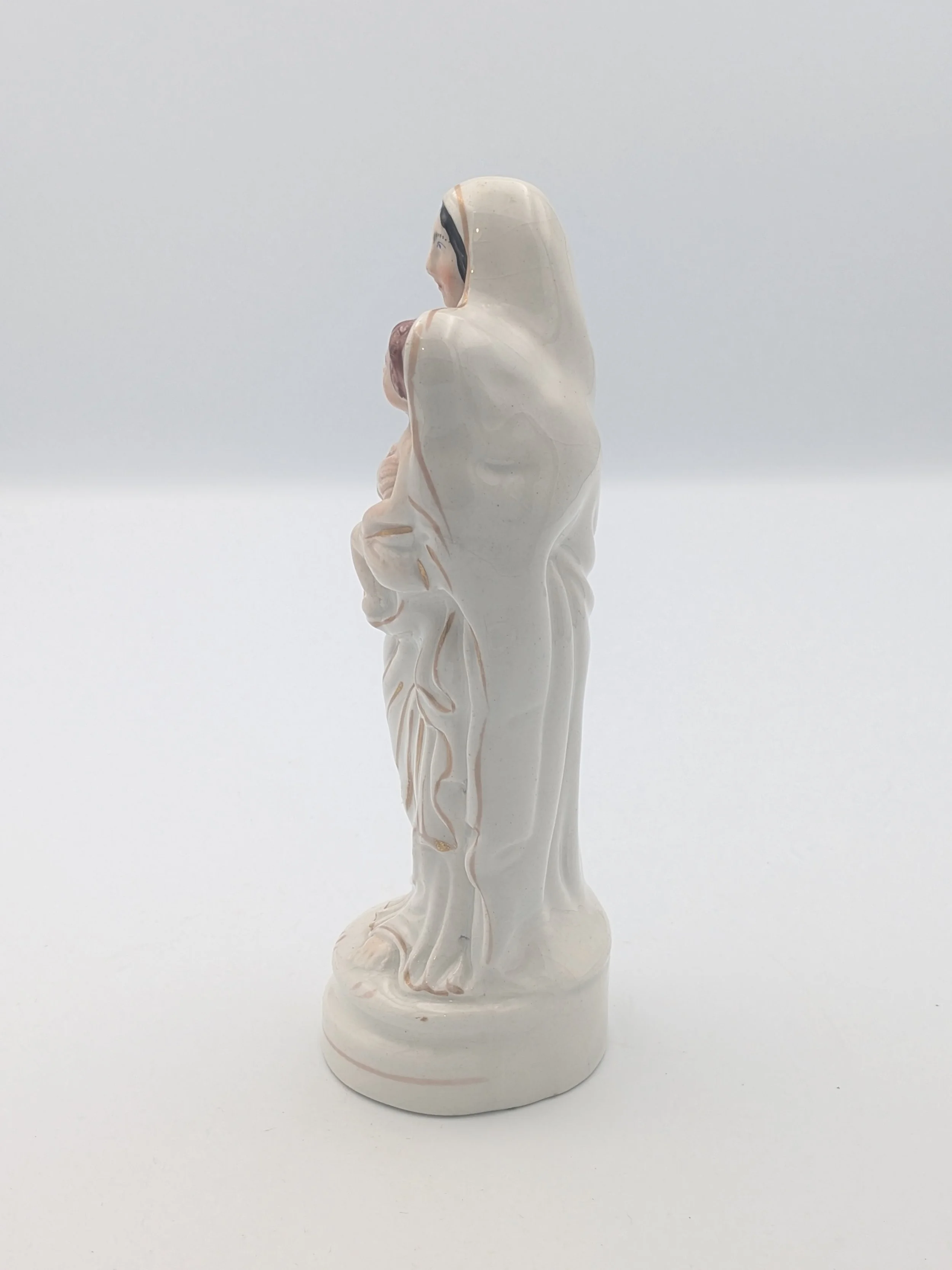 Staffordshire earthenware figures were produced from the late 18th century to the mid 20th century. Early (pre-1840) Staffordshire figures tend to be decorated ‘in the round’ and fairly elaborate with several handmade, press-moulded components including separately crafted limbs and bocage (leaves).