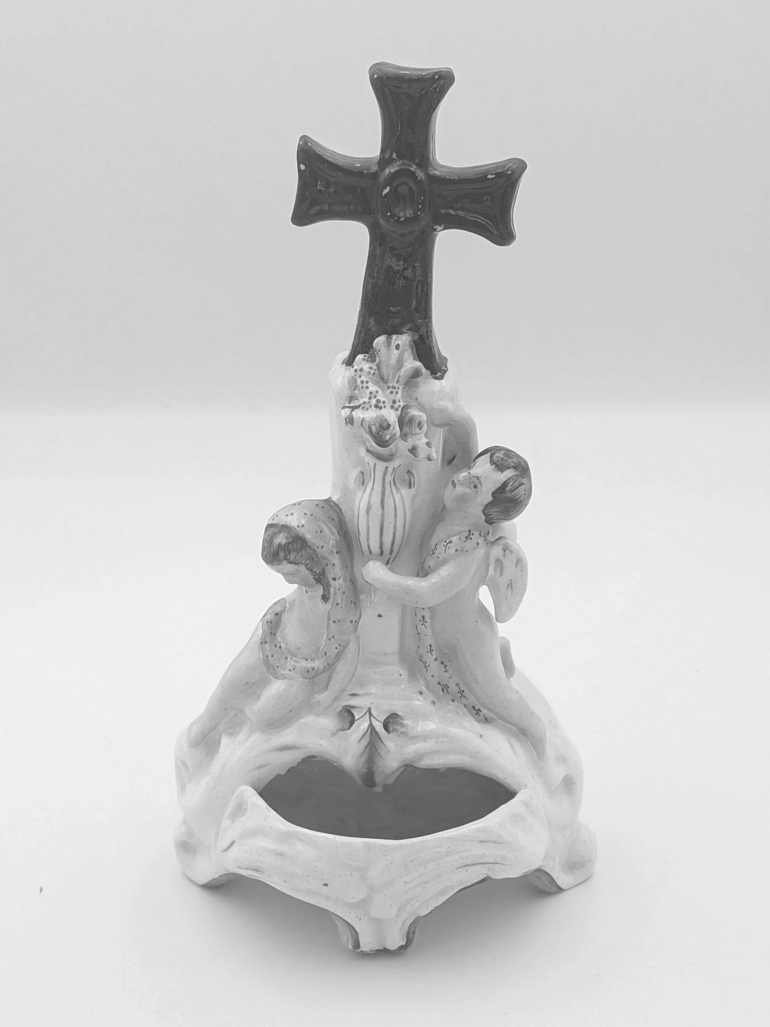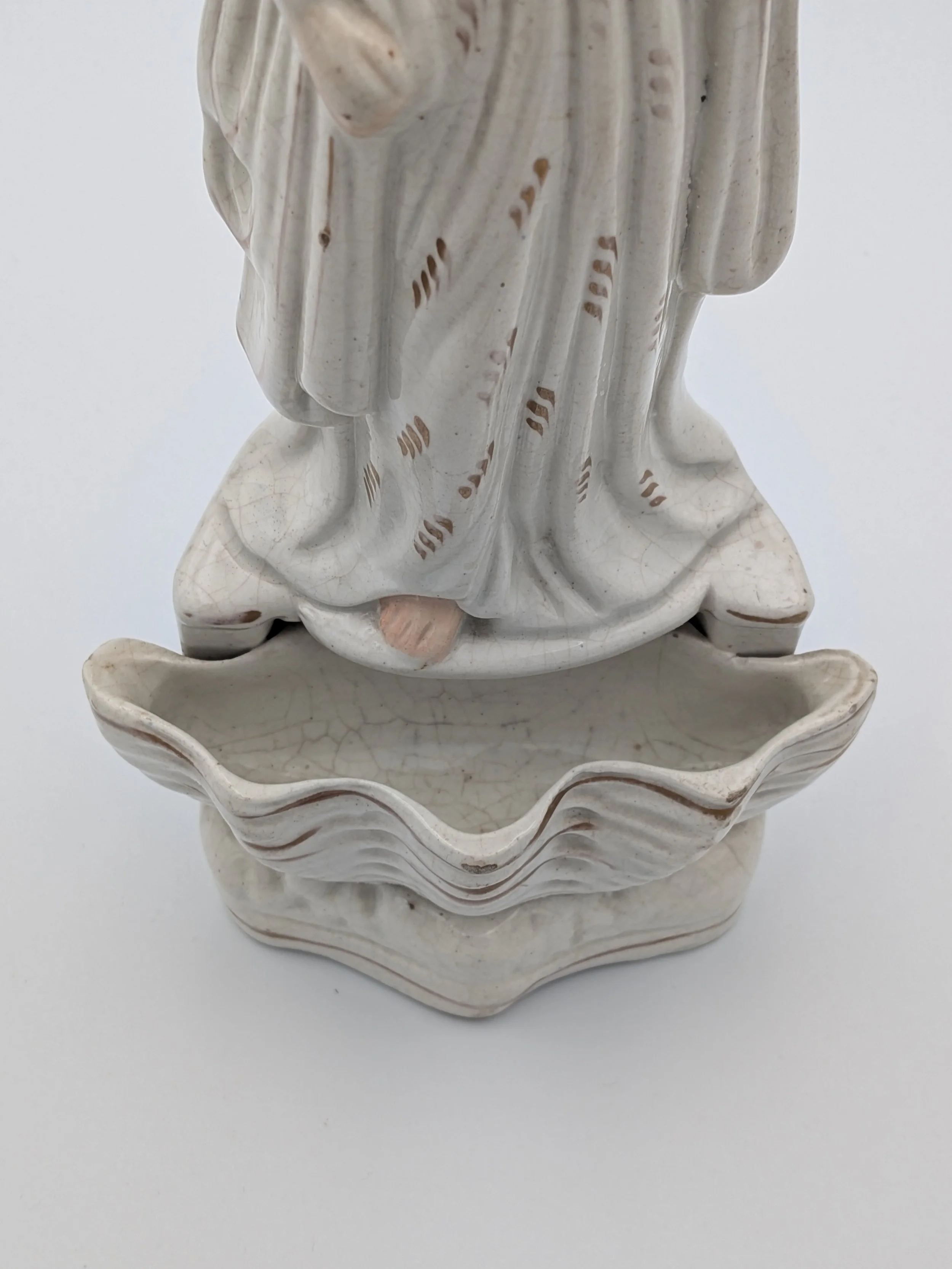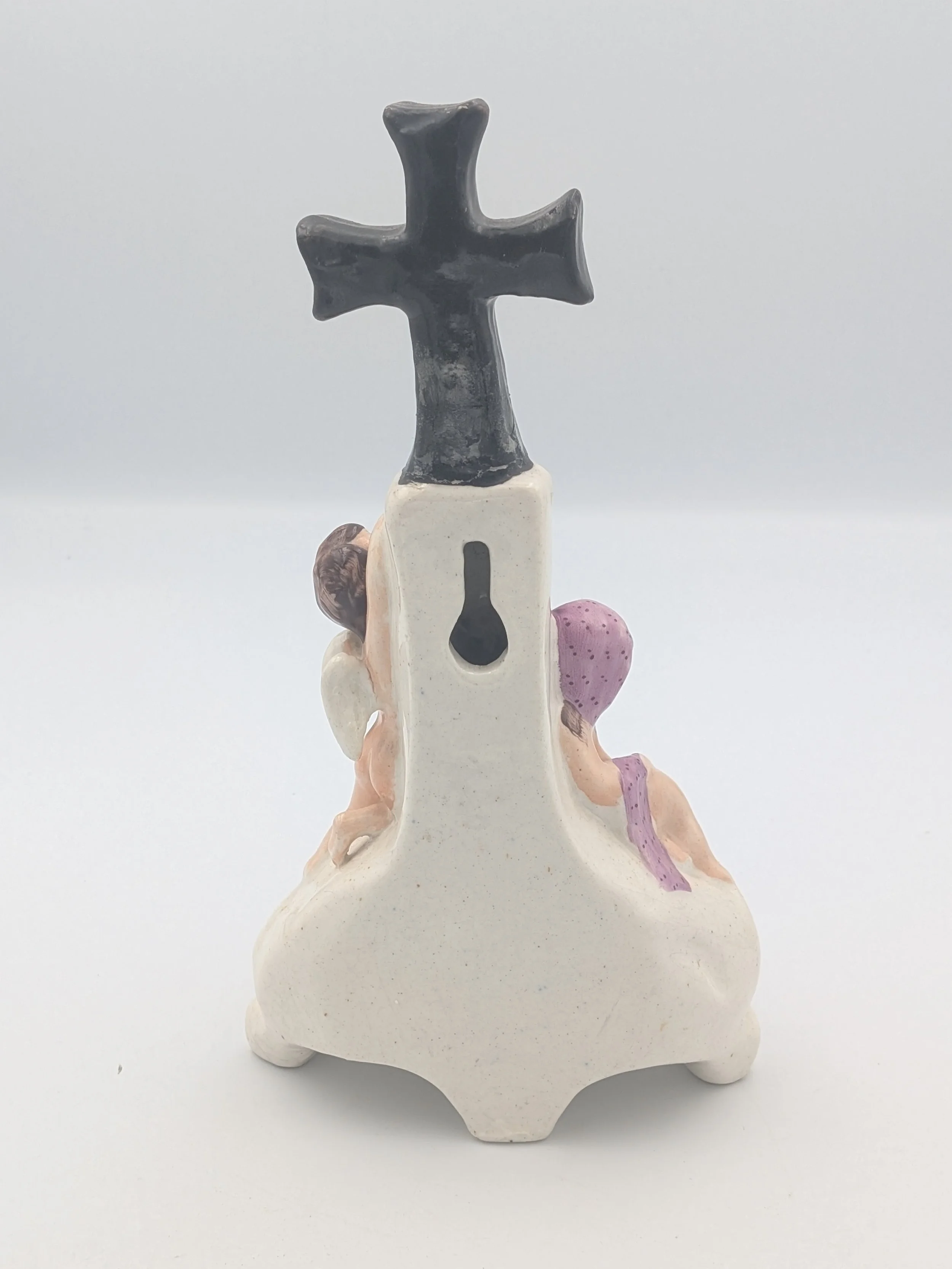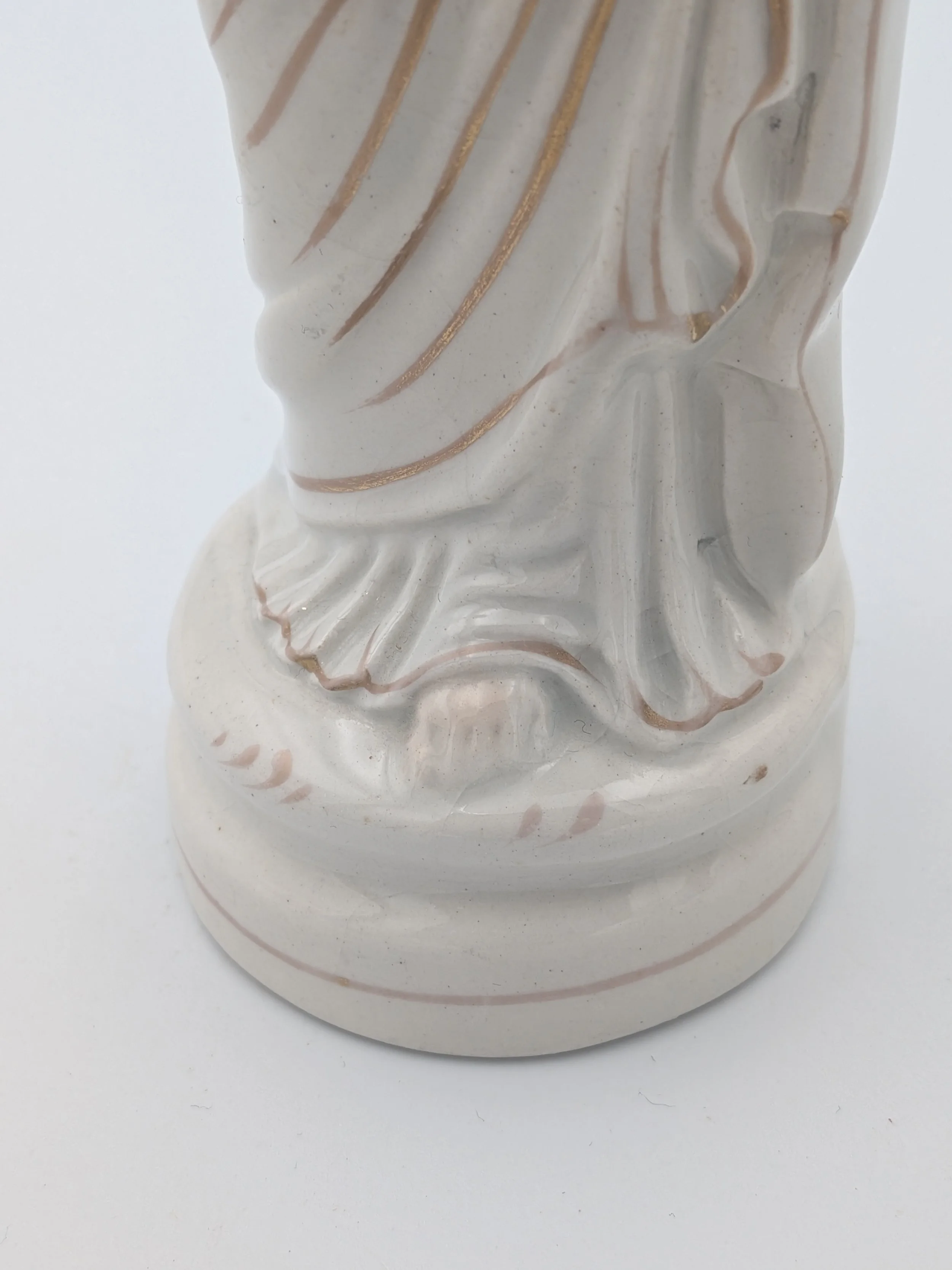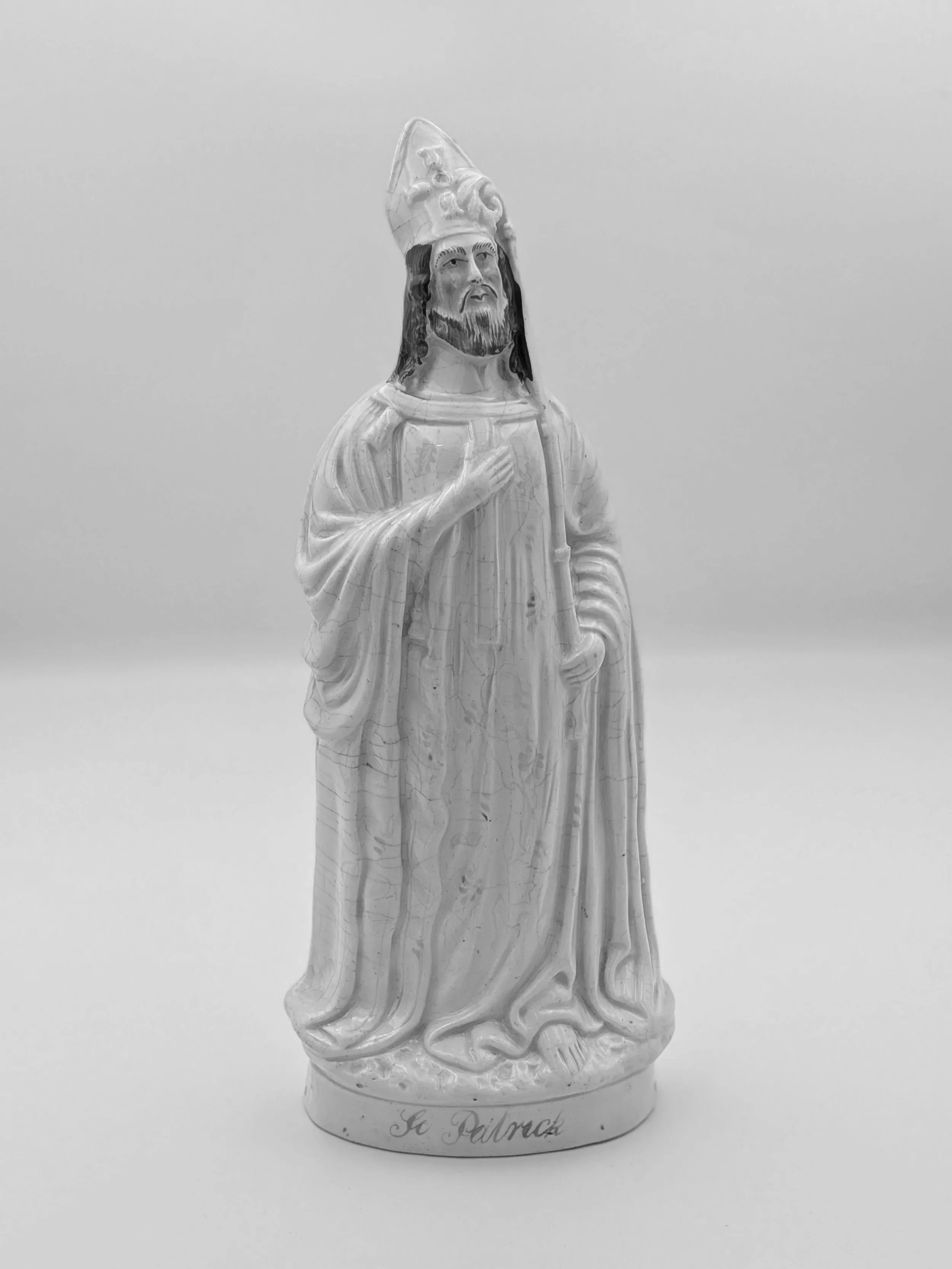 Staffordshire earthenware figures were produced from the late 18th century to the mid 20th century. Early (pre-1840) Staffordshire figures tend to be decorated ‘in the round’ and fairly elaborate with several handmade, press-moulded components including separately crafted limbs and bocage (leaves).