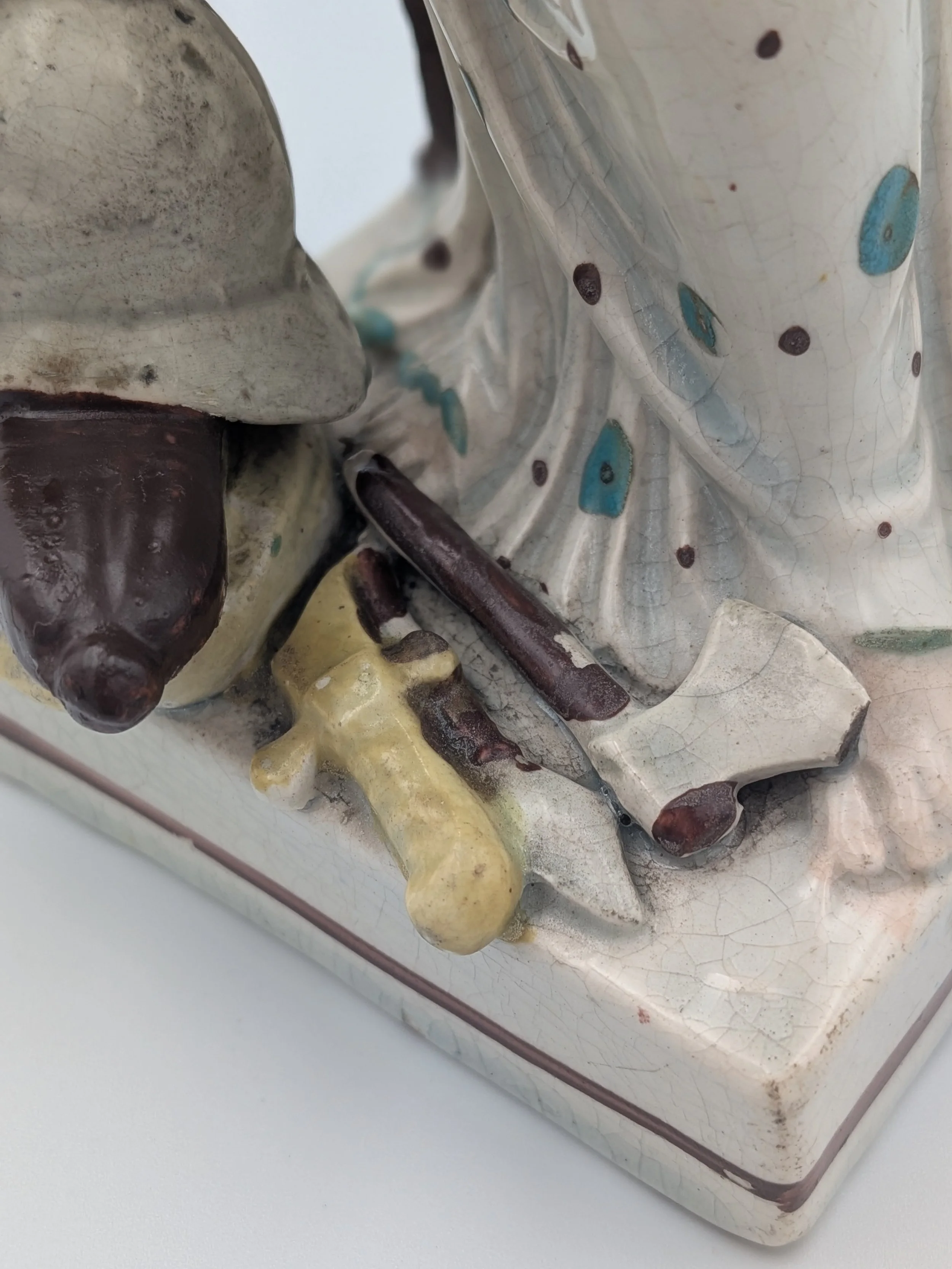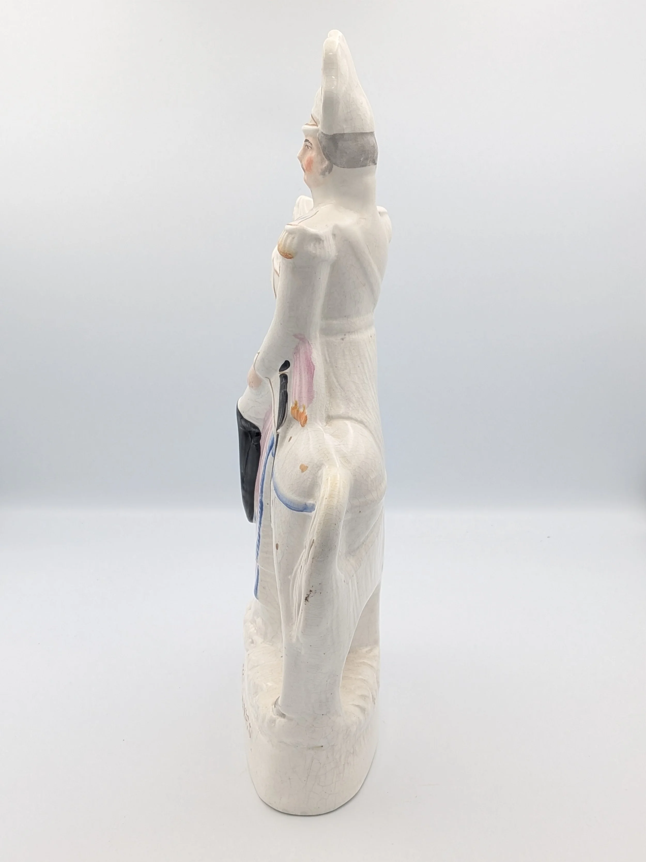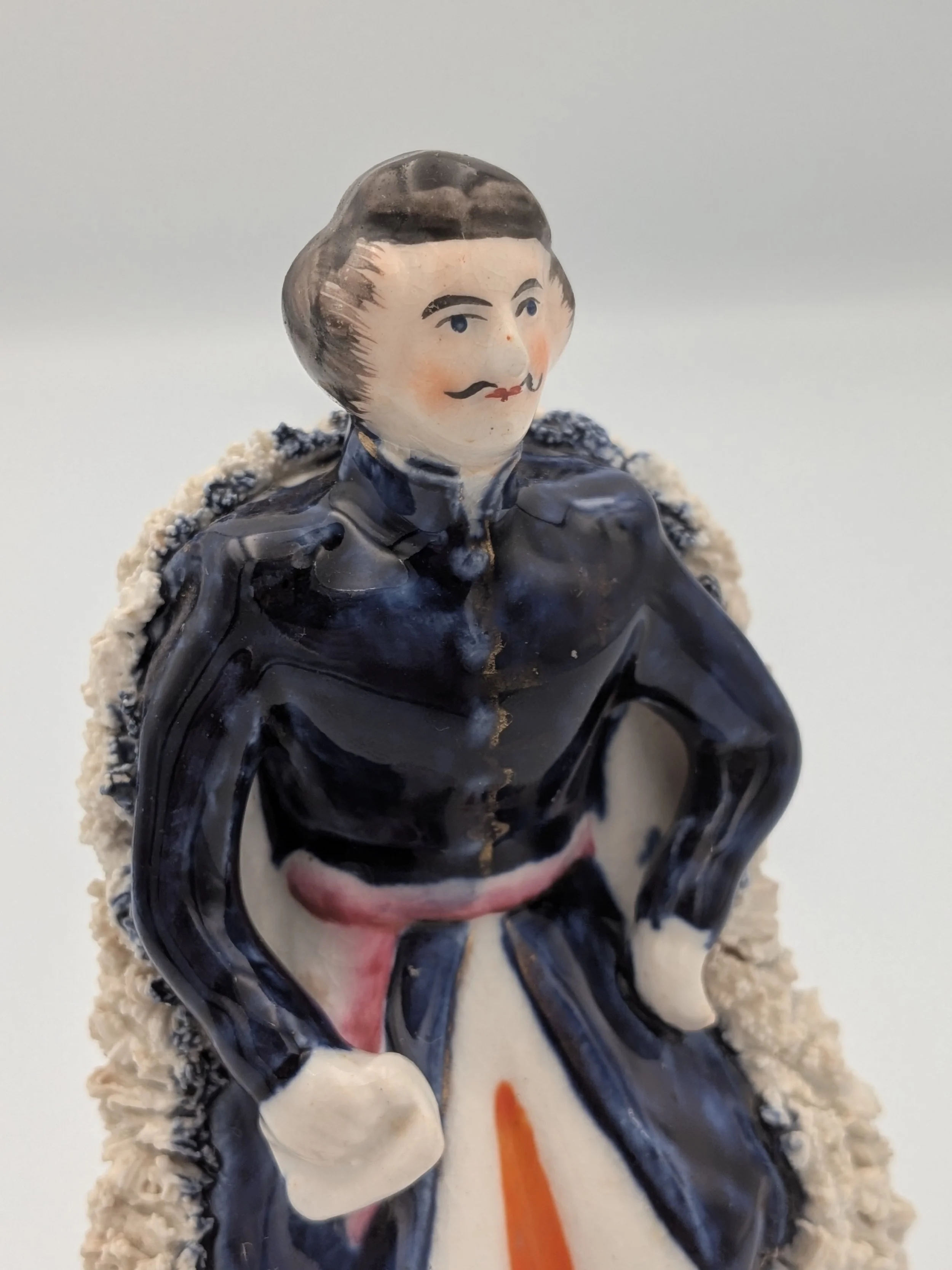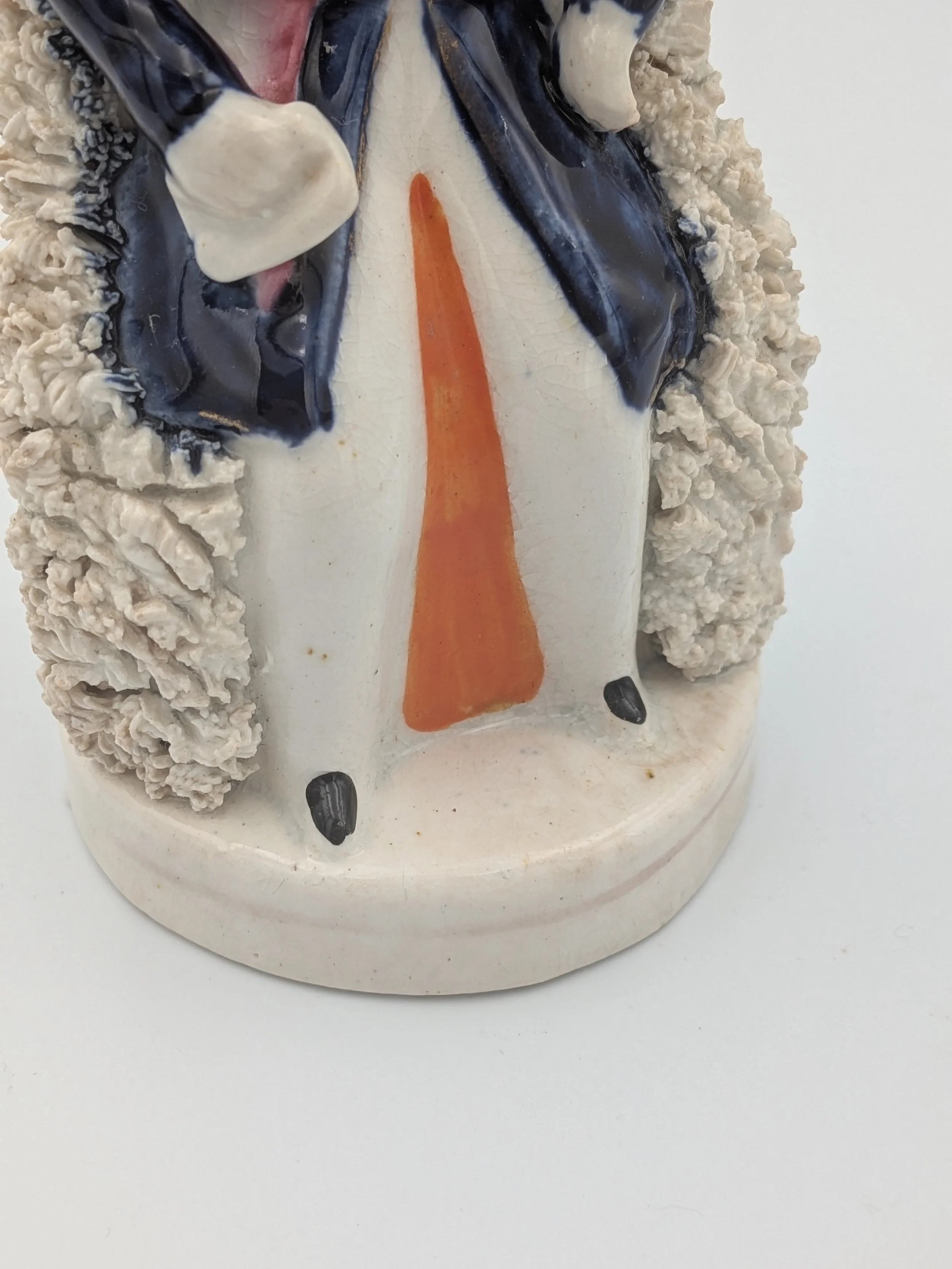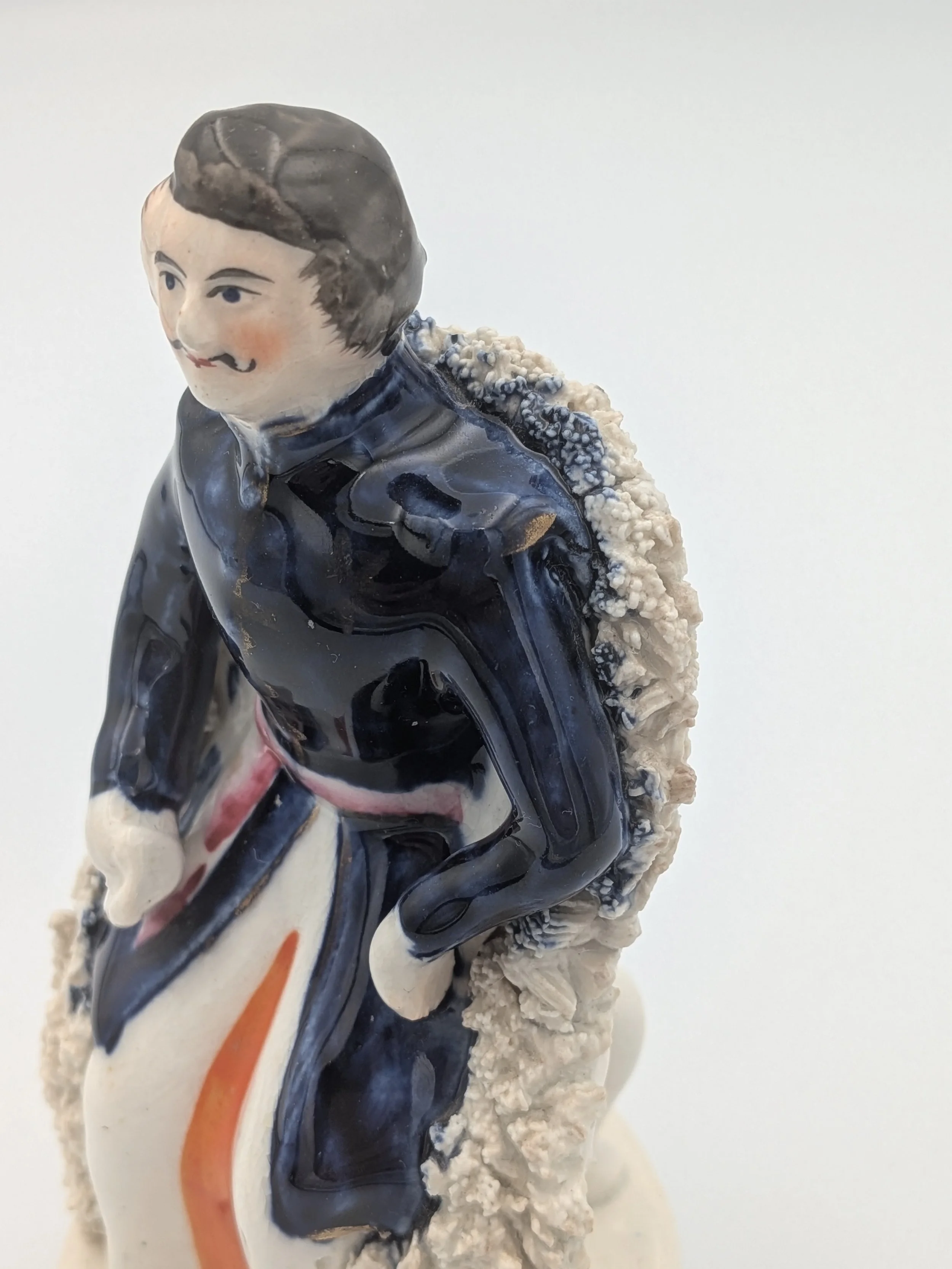 From the 1840s onwards, the market for Staffordshire figures boomed and potters moved to a simpler, more ‘streamlined’ production style, with many figures decorated on the frontside only (‘flatbacks’) and most figures being produced from a single press mould. The remarkably legible effect this simple and efficient production method could produce is one of the great attraction of Victorian Staffordshire figures.