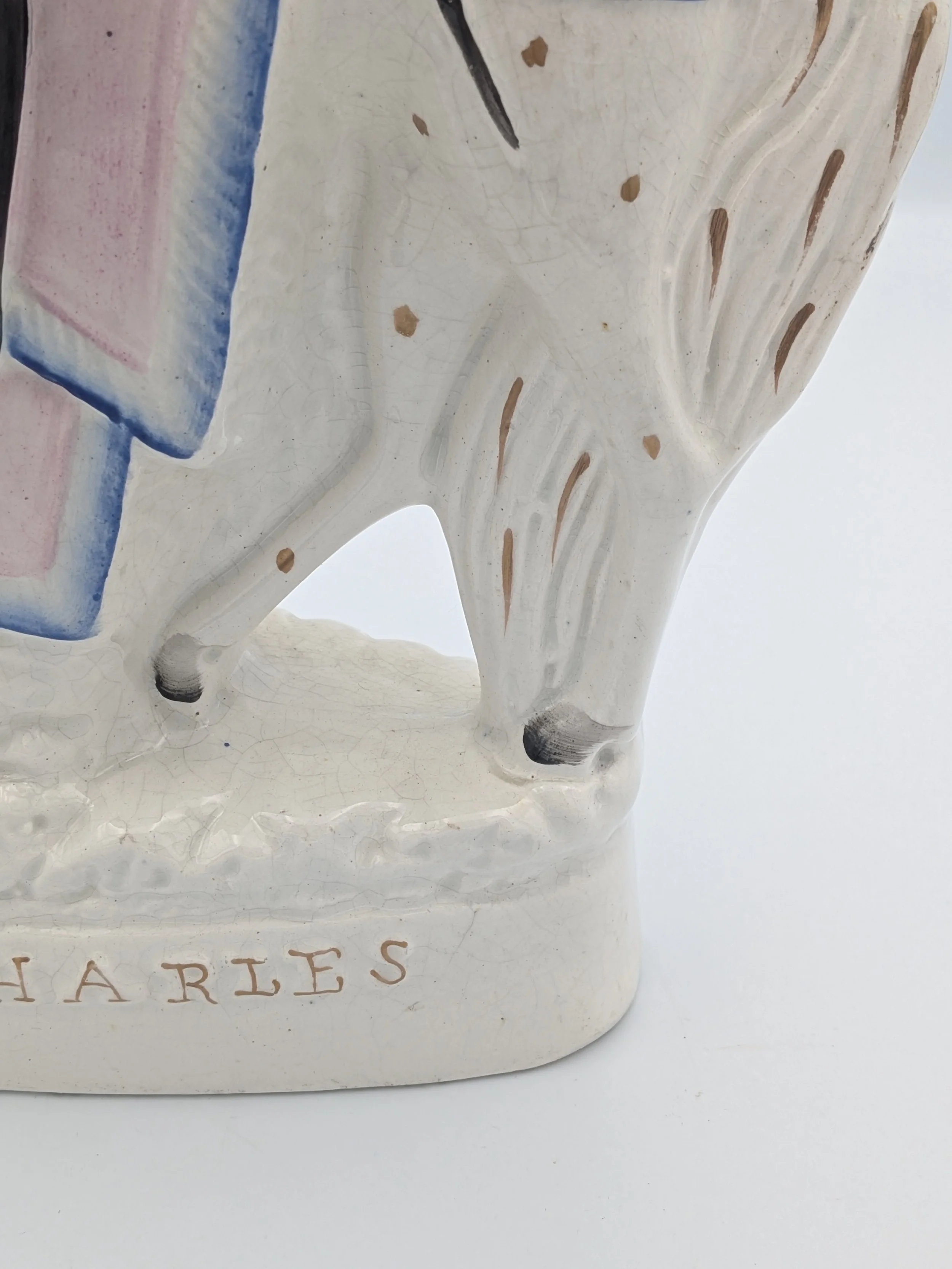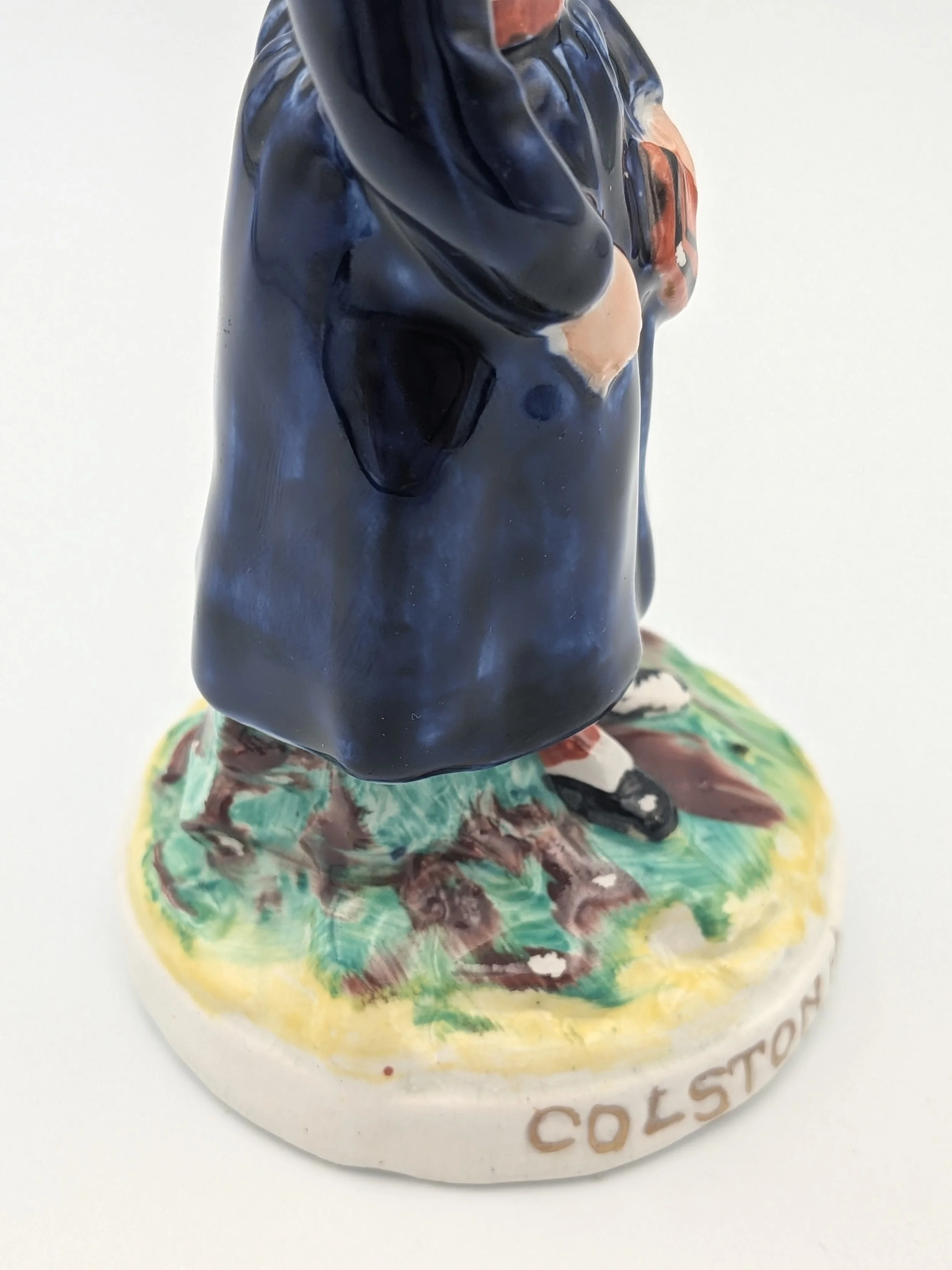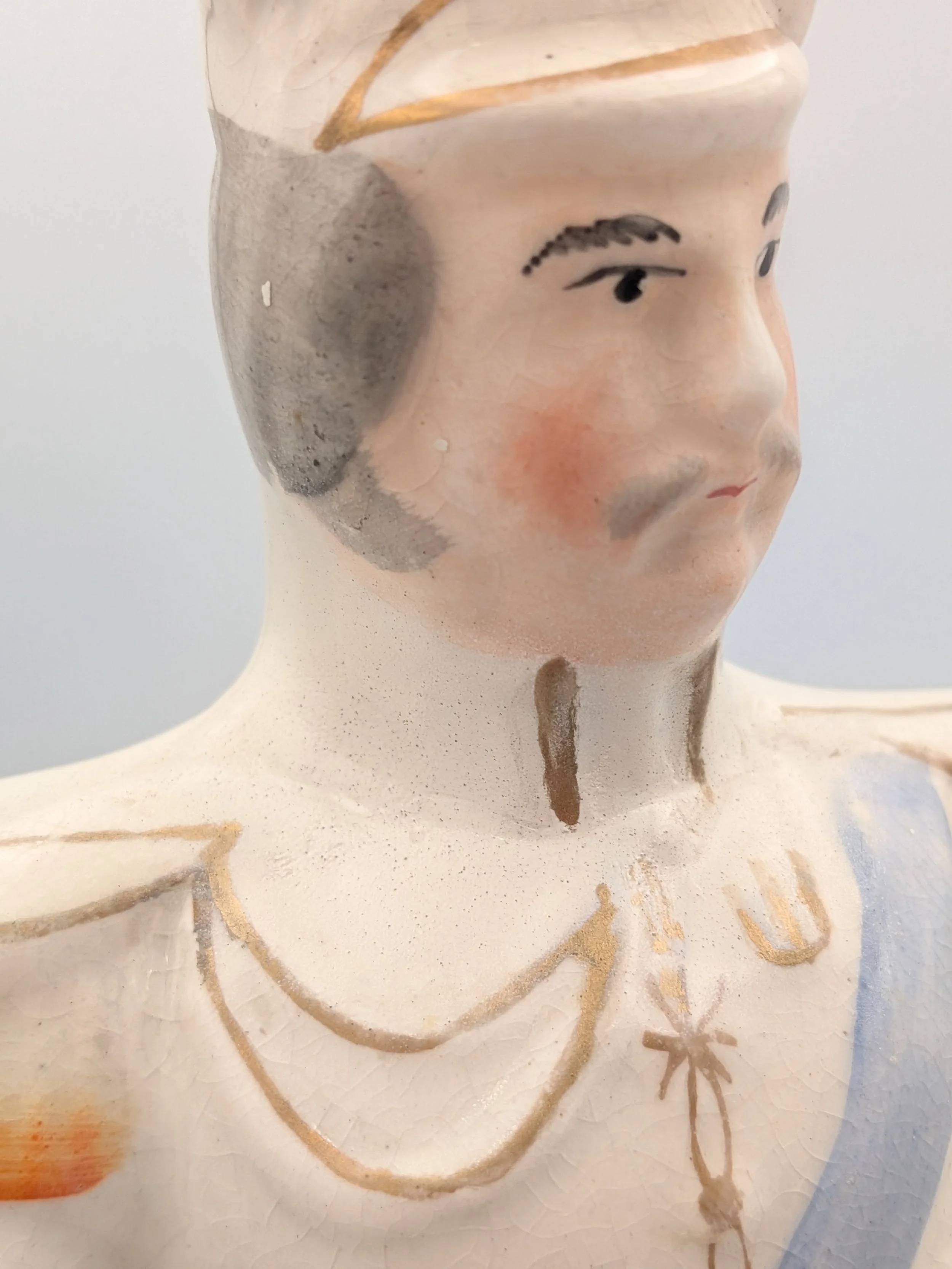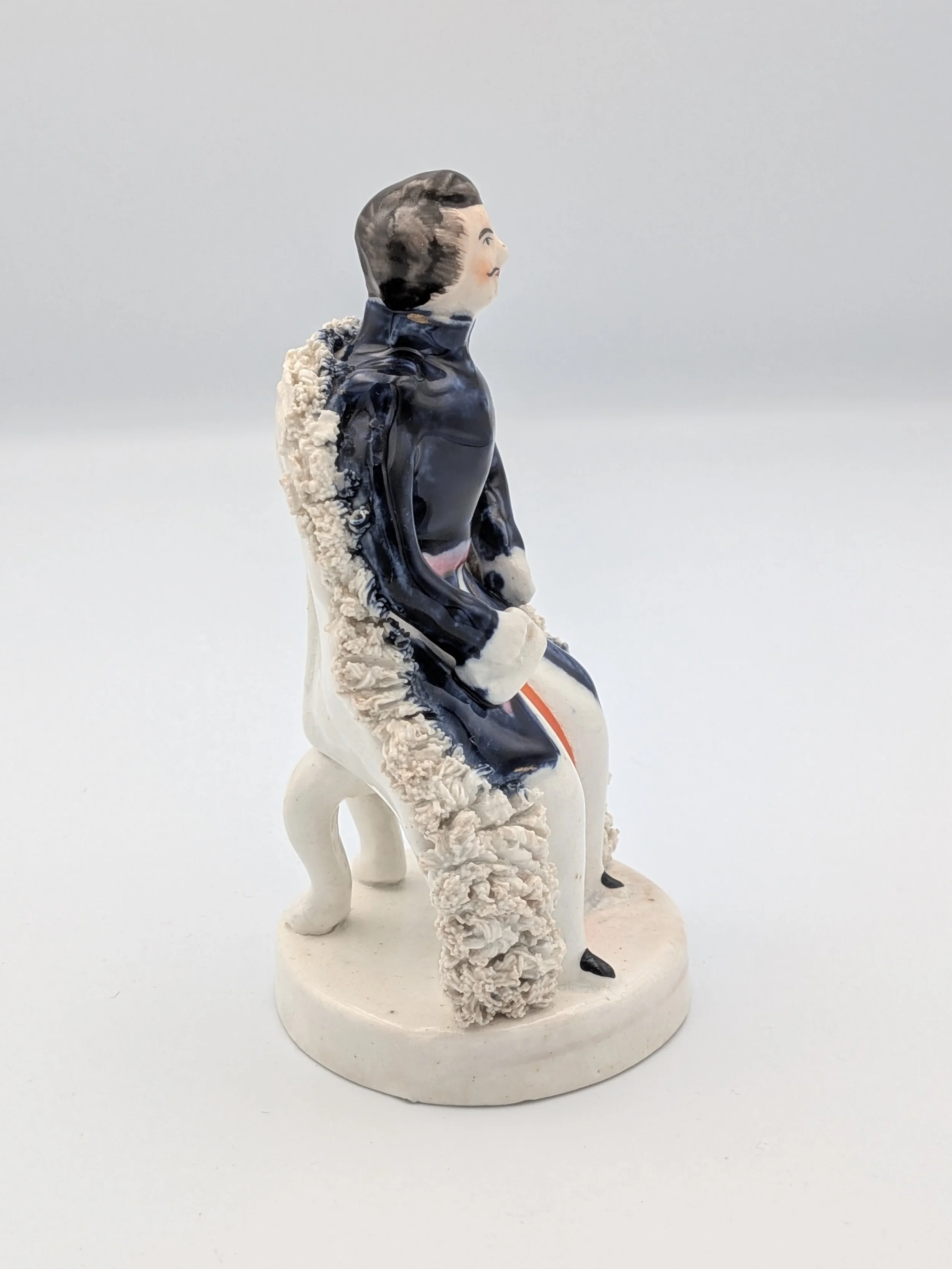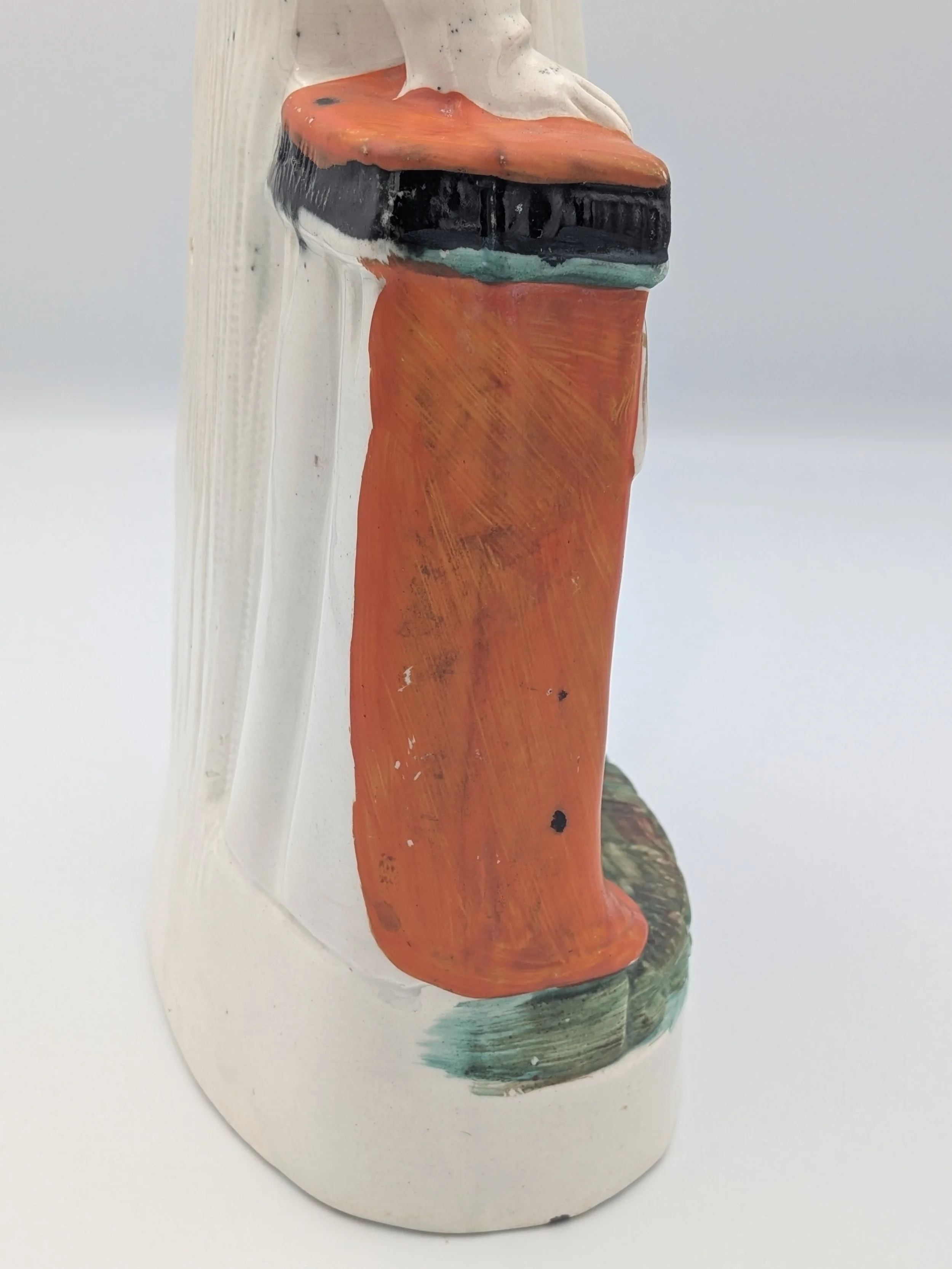 From the 1840s onwards, the market for Staffordshire figures boomed and potters moved to a simpler, more ‘streamlined’ production style, with many figures decorated on the frontside only (‘flatbacks’) and most figures being produced from a single press mould. The remarkably legible effect this simple and efficient production method could produce is one of the great attraction of Victorian Staffordshire figures.