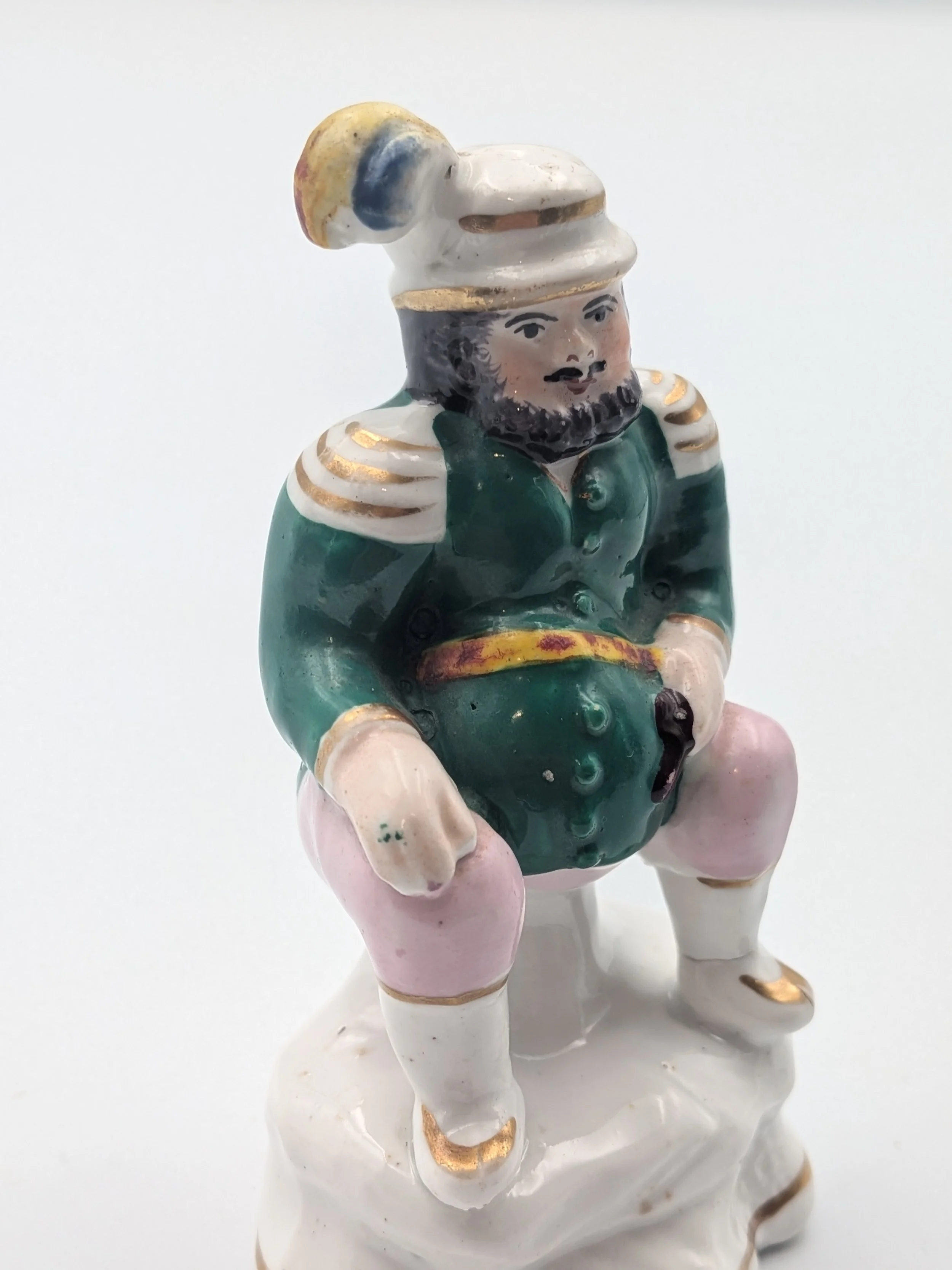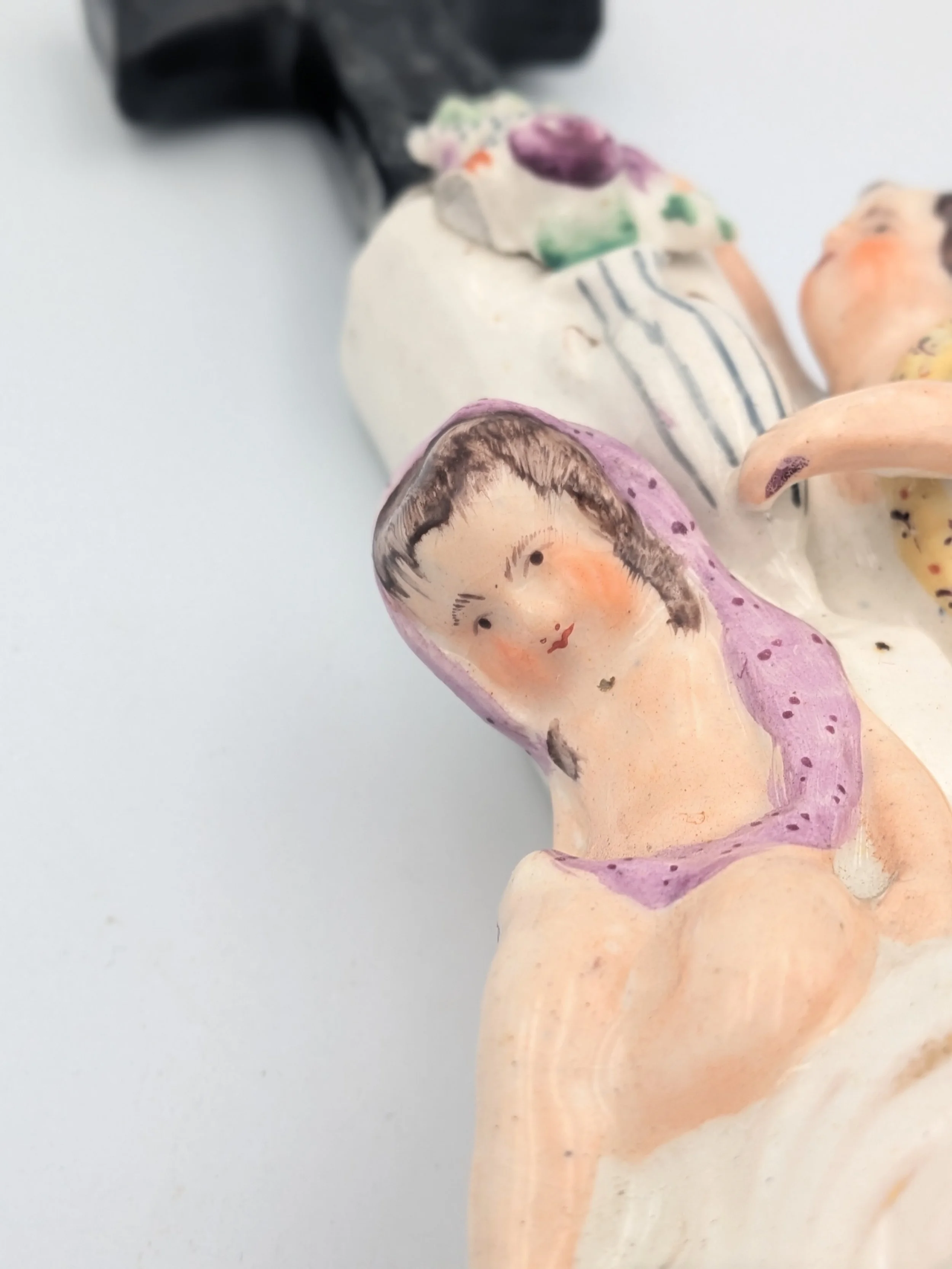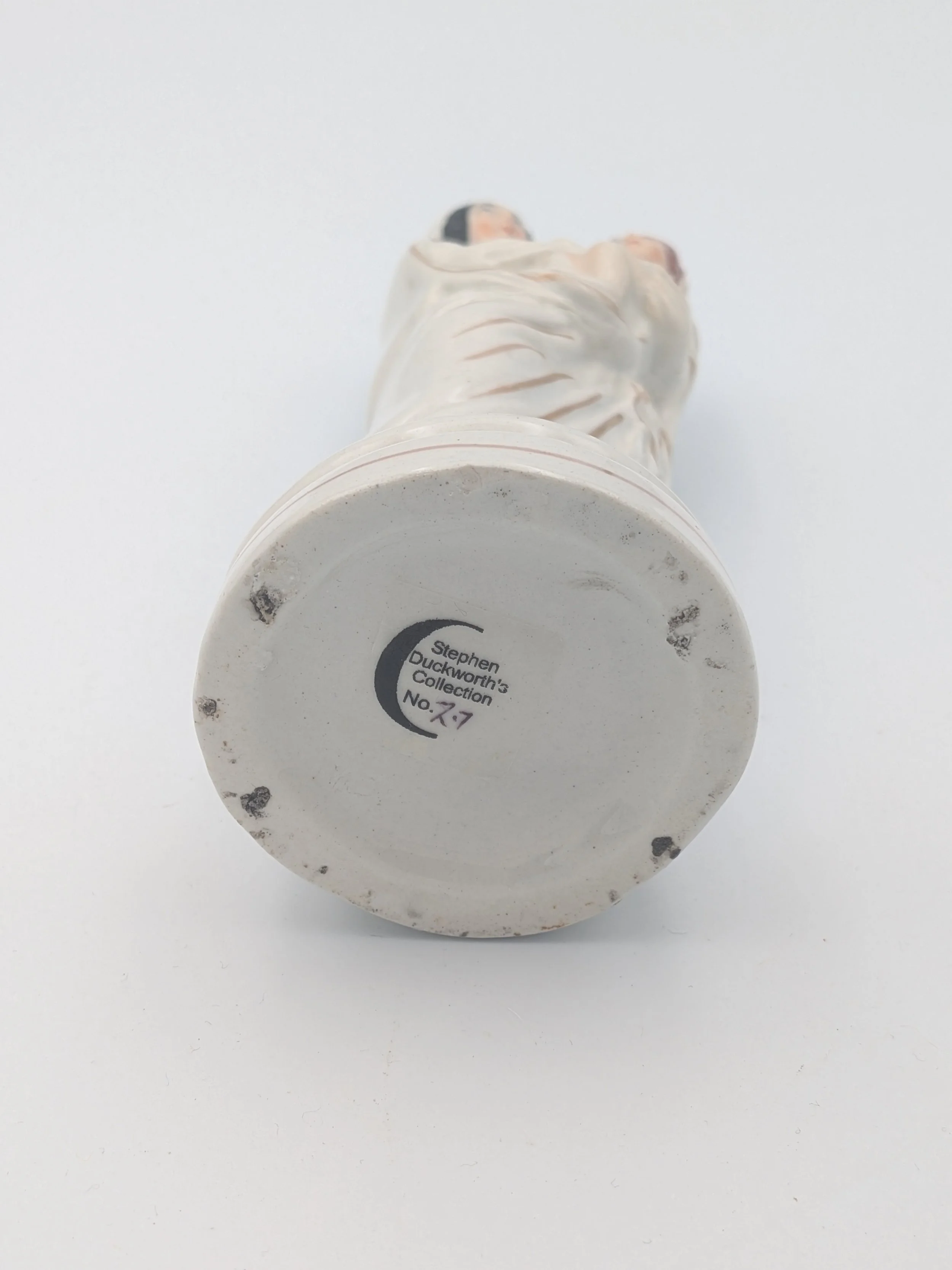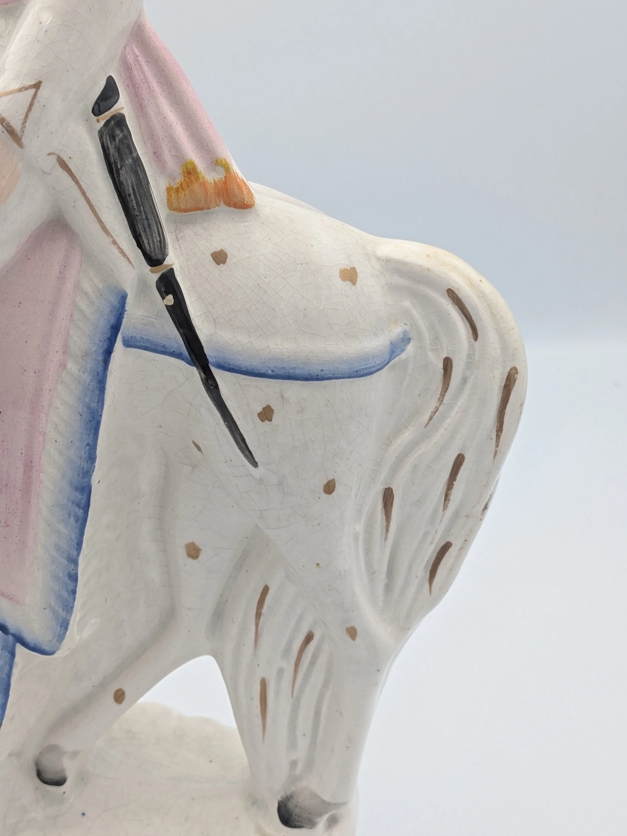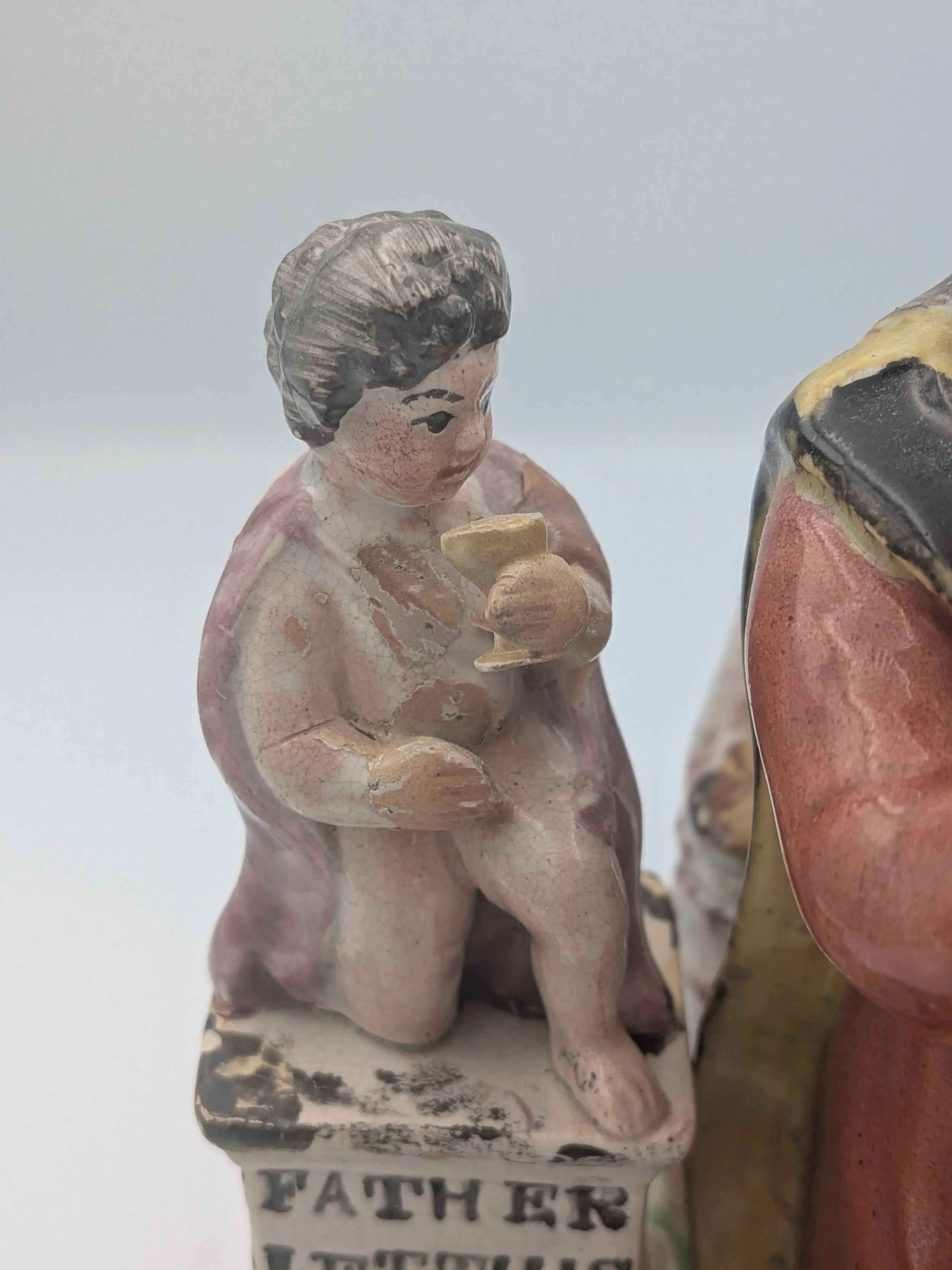 From the 1840s onwards, the market for Staffordshire figures boomed and potters moved to a simpler, more ‘streamlined’ production style, with many figures decorated on the frontside only (‘flatbacks’) and most figures being produced from a single press mould. The remarkably legible effect this simple and efficient production method could produce is one of the great attraction of Victorian Staffordshire figures.