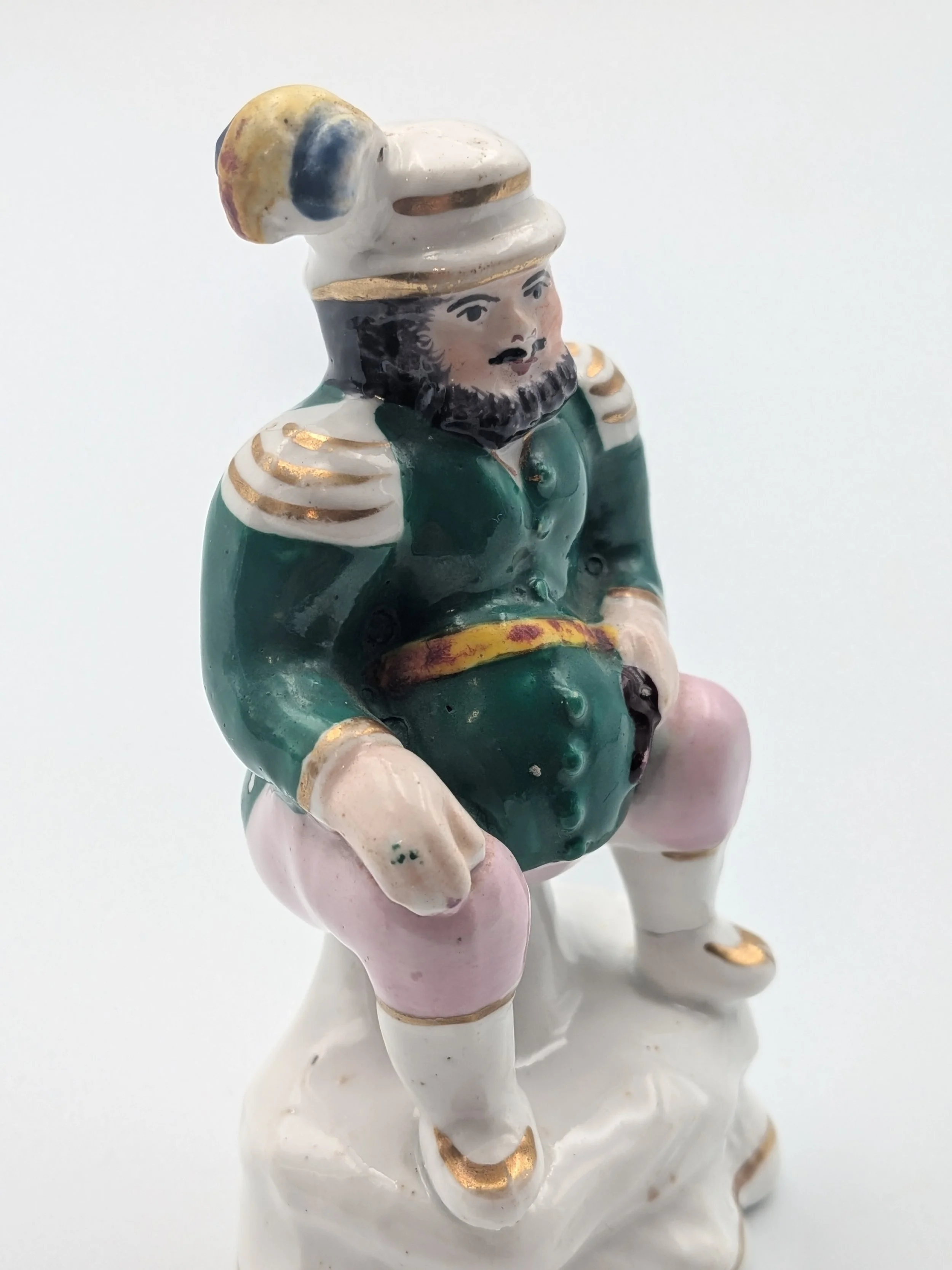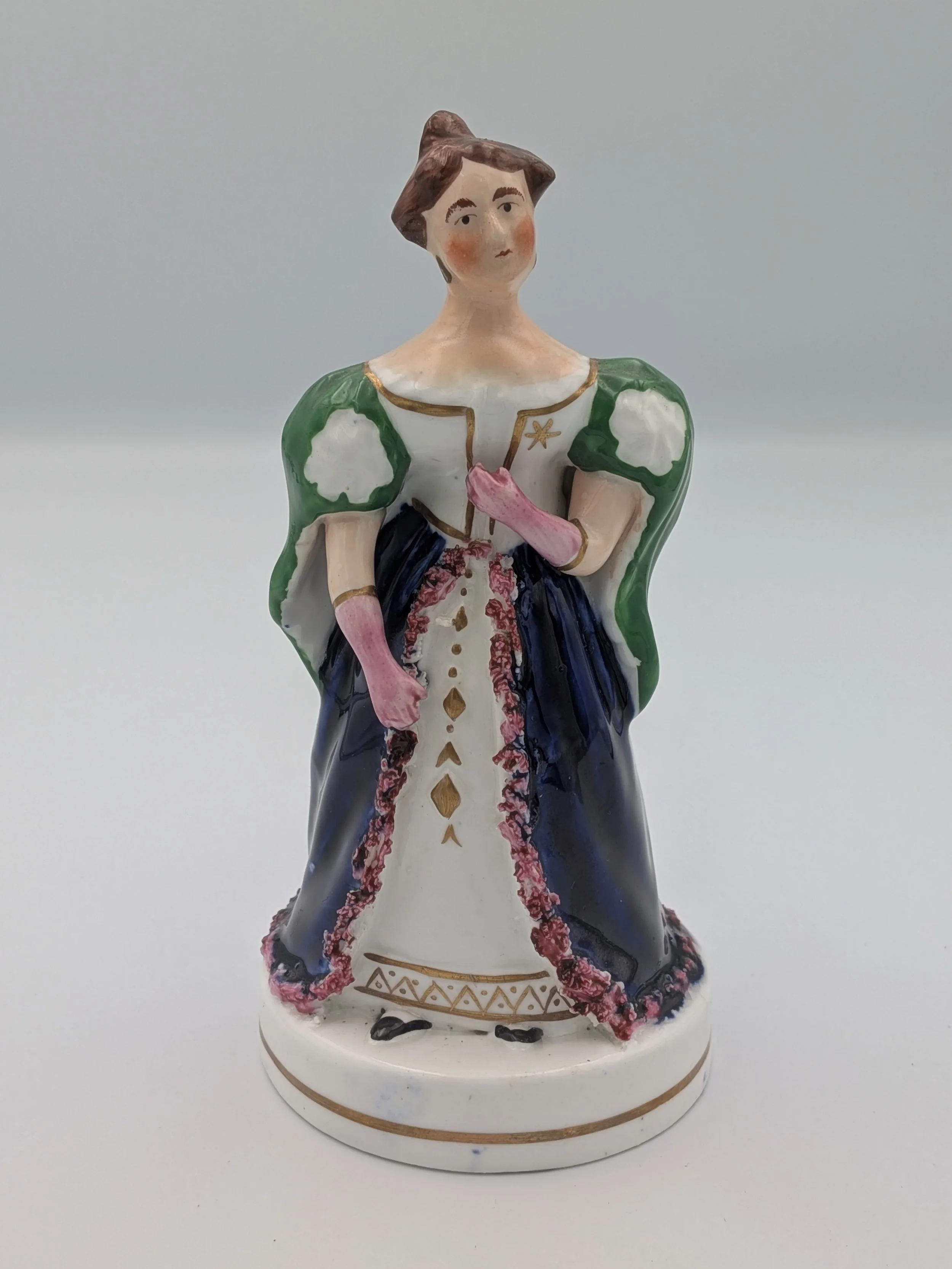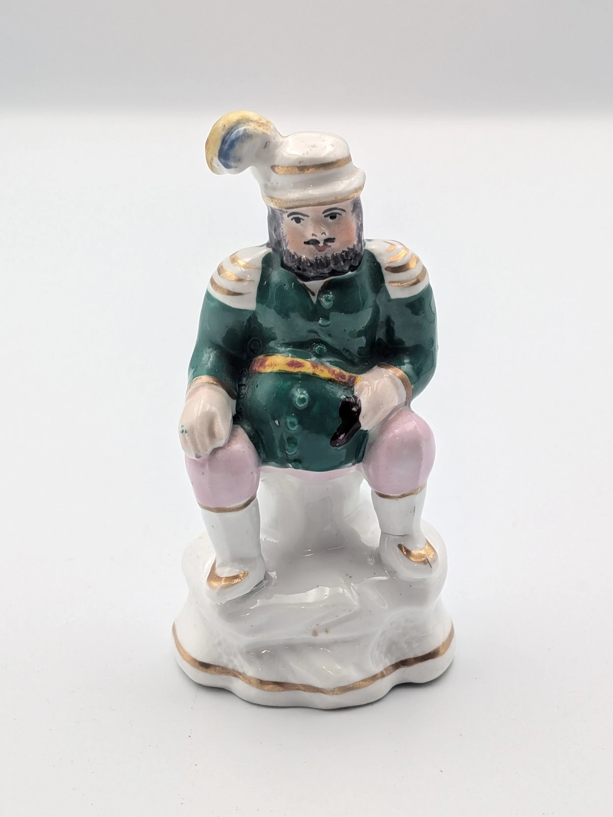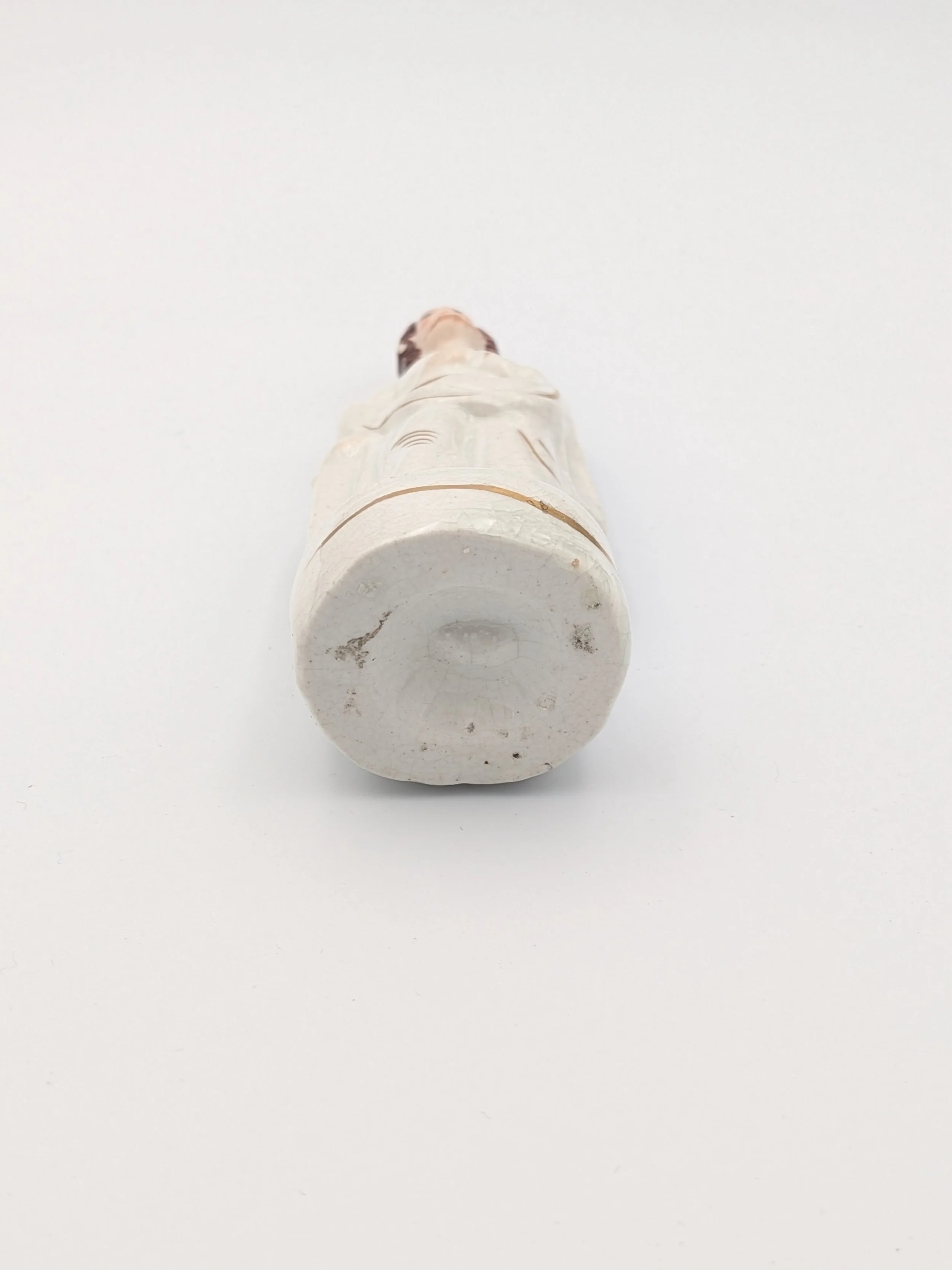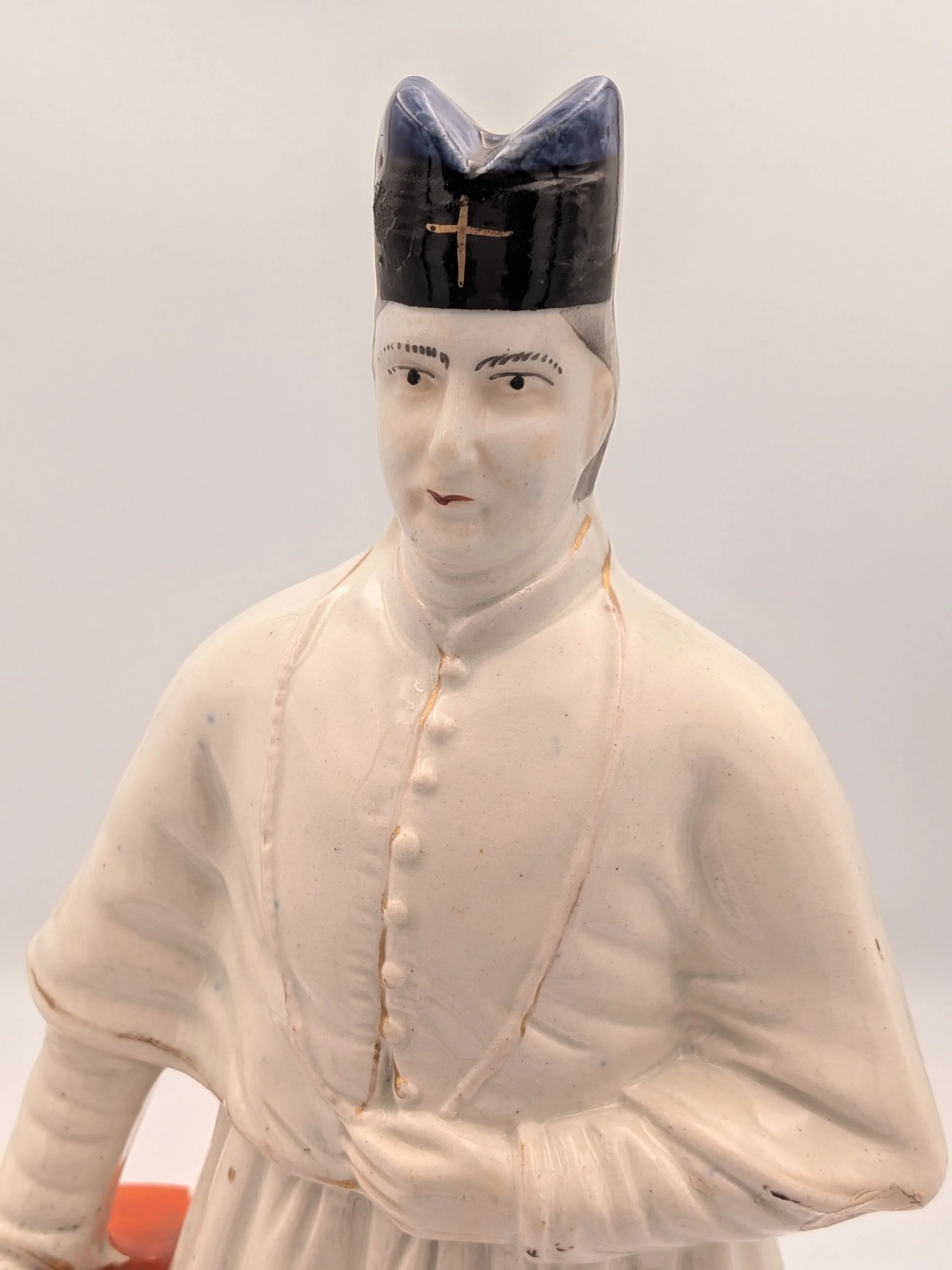From the 1840s onwards, the market for Staffordshire figures boomed and potters moved to a simpler, more ‘streamlined’ production style, with many figures decorated on the frontside only (‘flatbacks’) and most figures being produced from a single press mould. The remarkably legible effect this simple and efficient production method could produce is one of the great attraction of Victorian Staffordshire figures.
