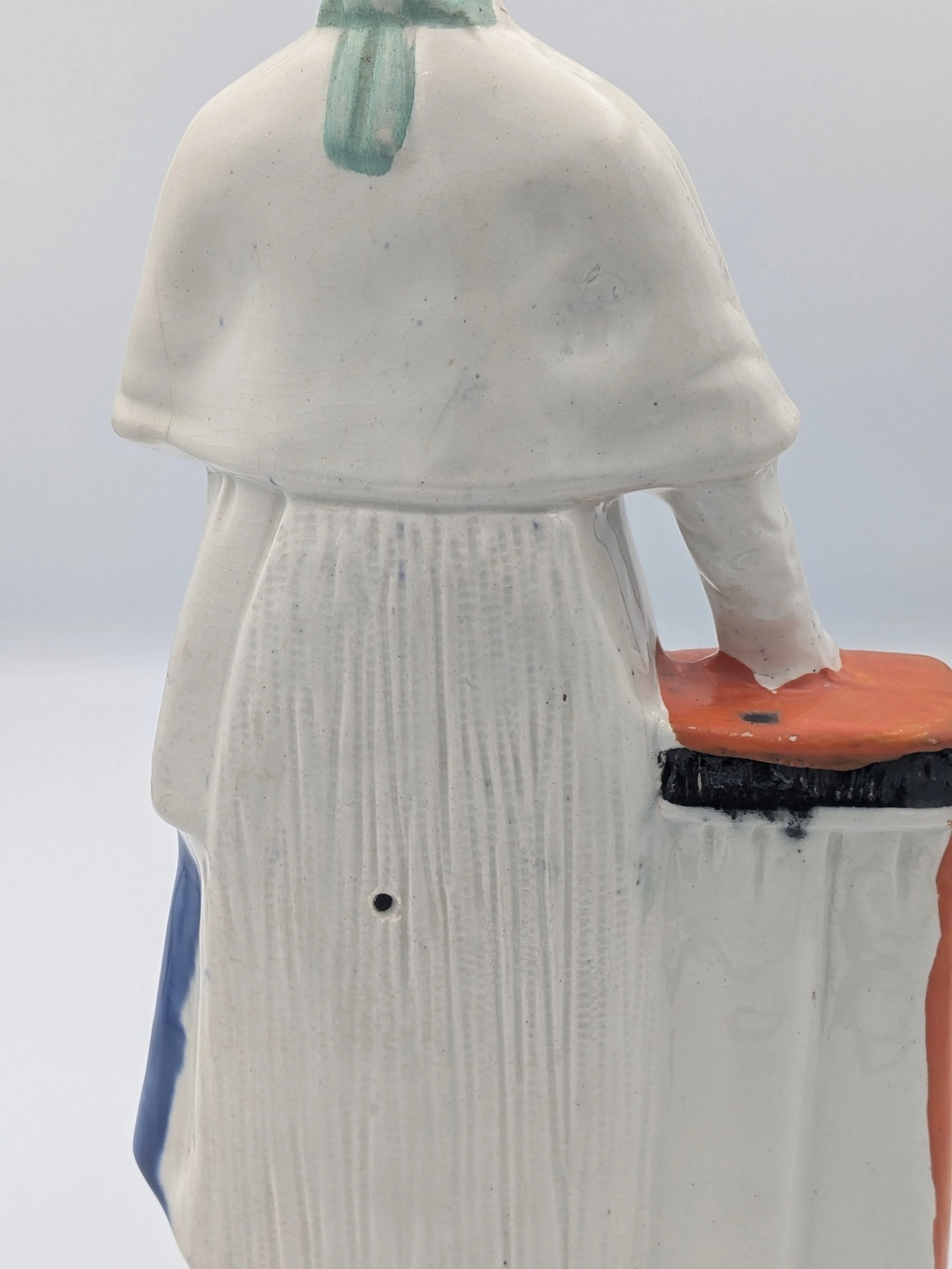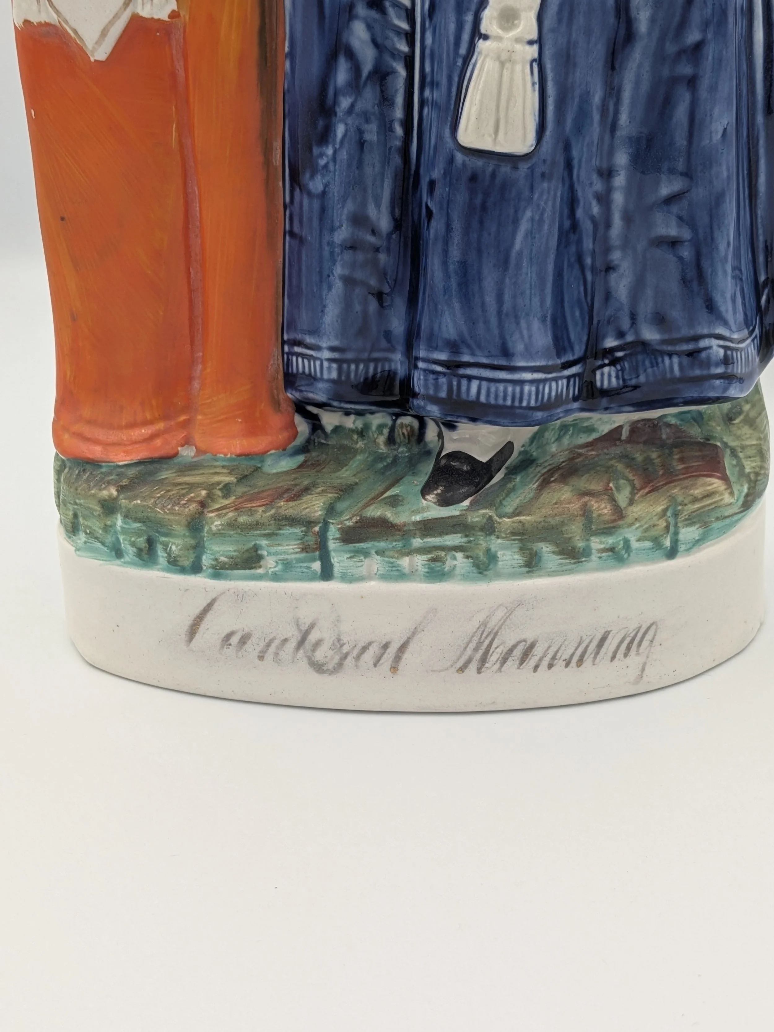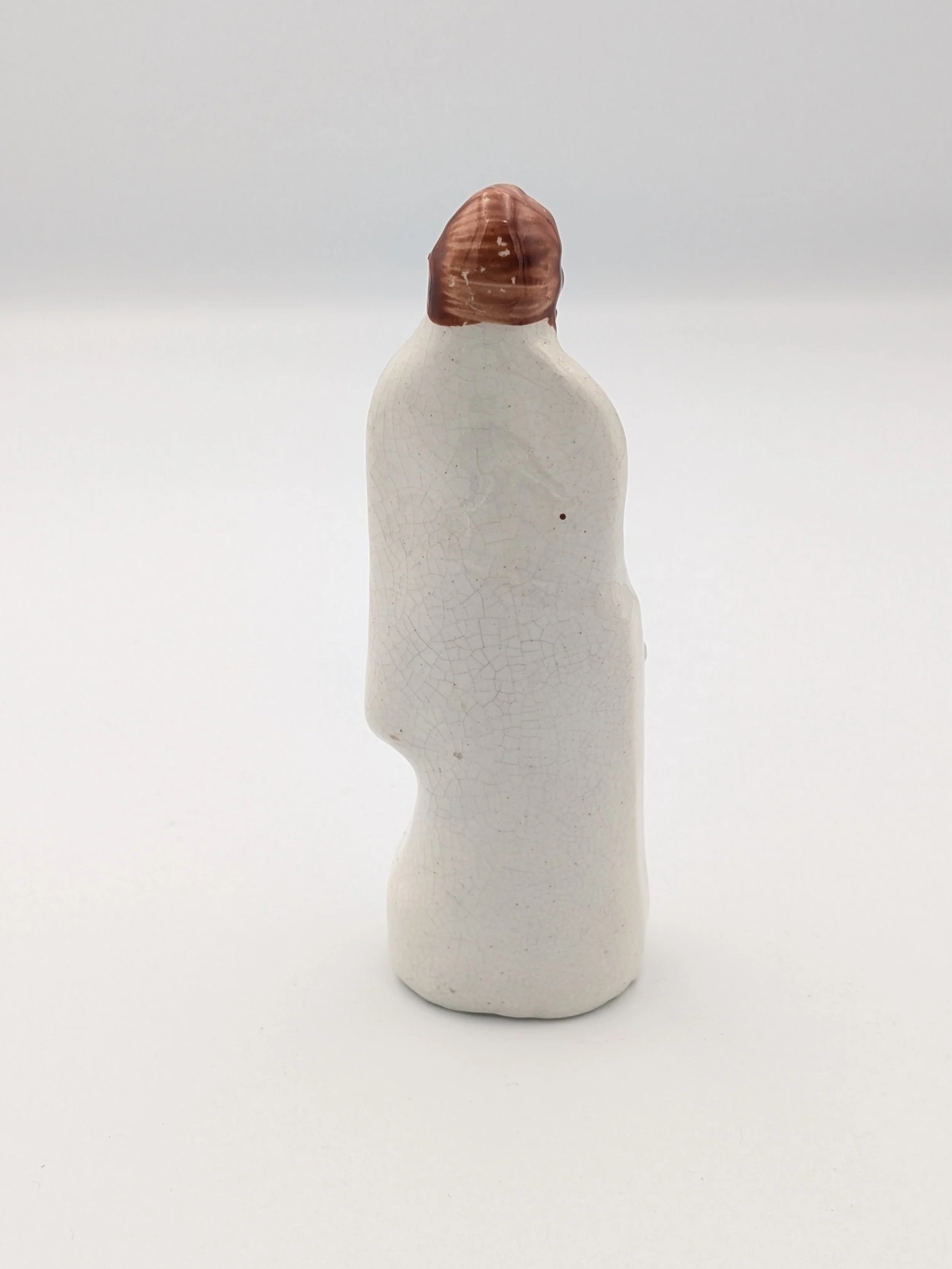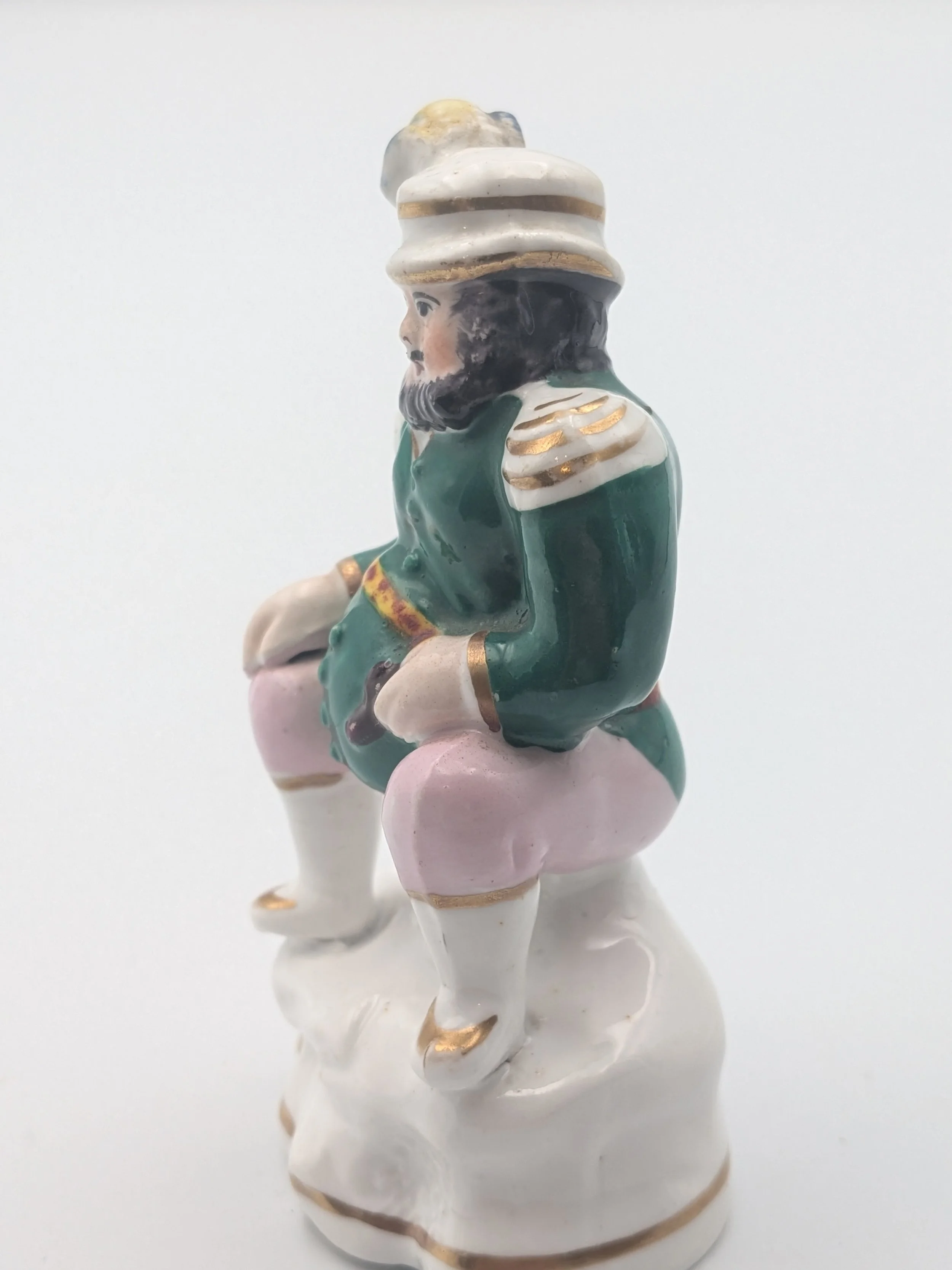 From the 1840s onwards, the market for Staffordshire figures boomed and potters moved to a simpler, more ‘streamlined’ production style, with many figures decorated on the frontside only (‘flatbacks’) and most figures being produced from a single press mould. The remarkably legible effect this simple and efficient production method could produce is one of the great attraction of Victorian Staffordshire figures.