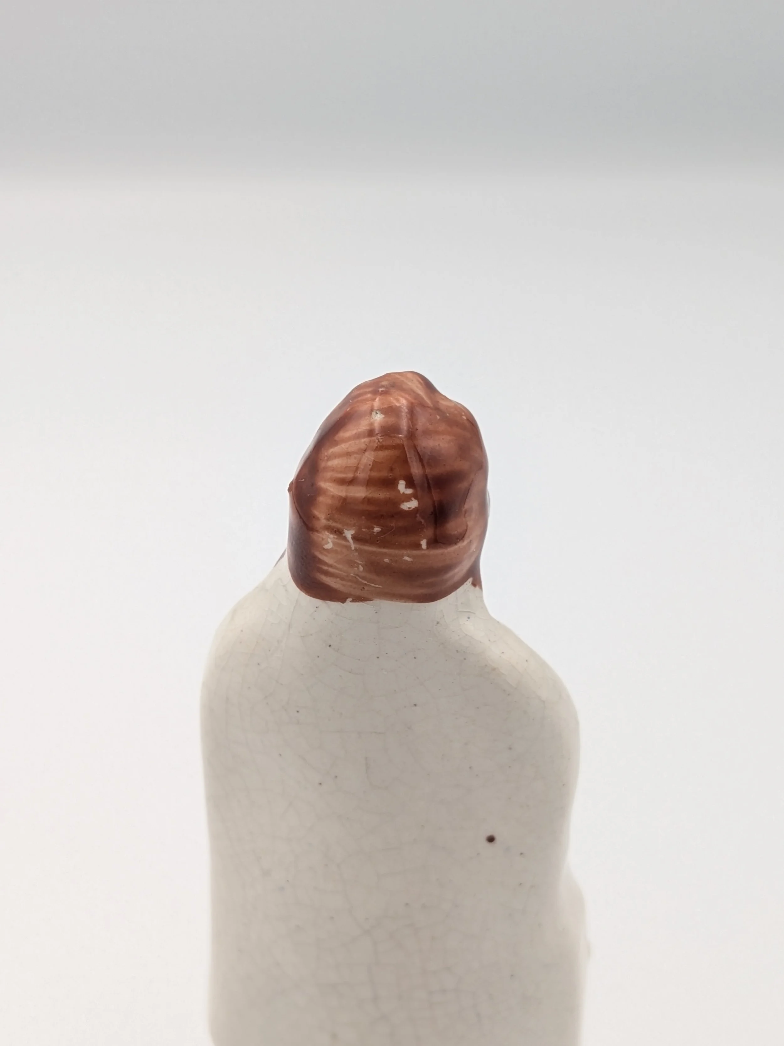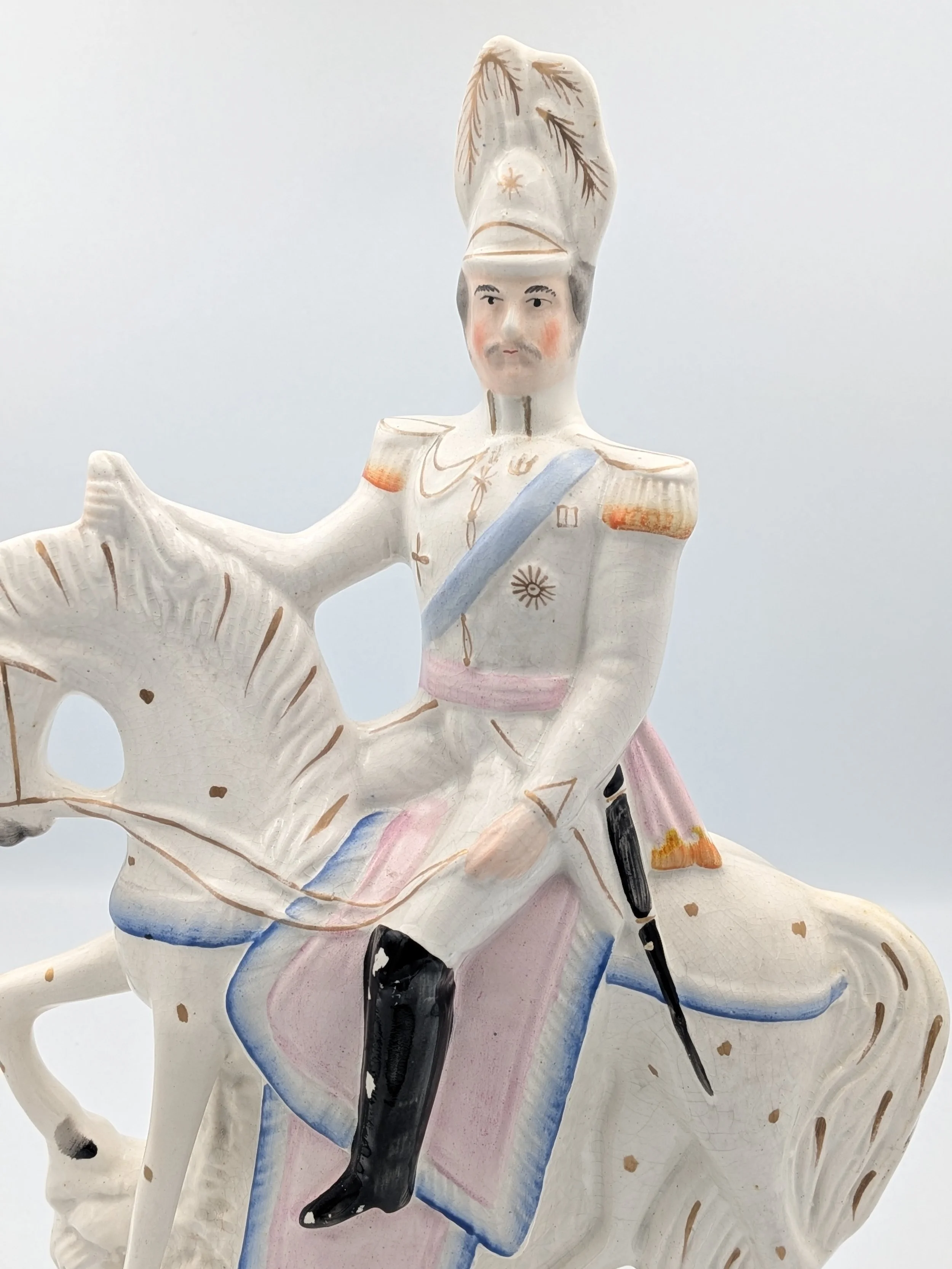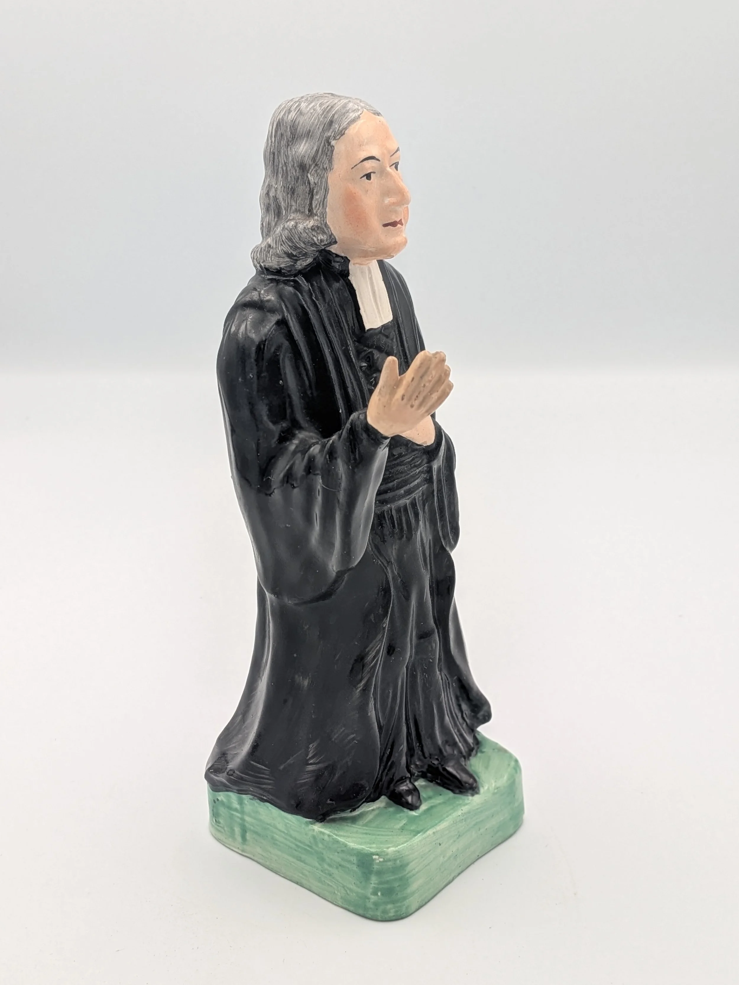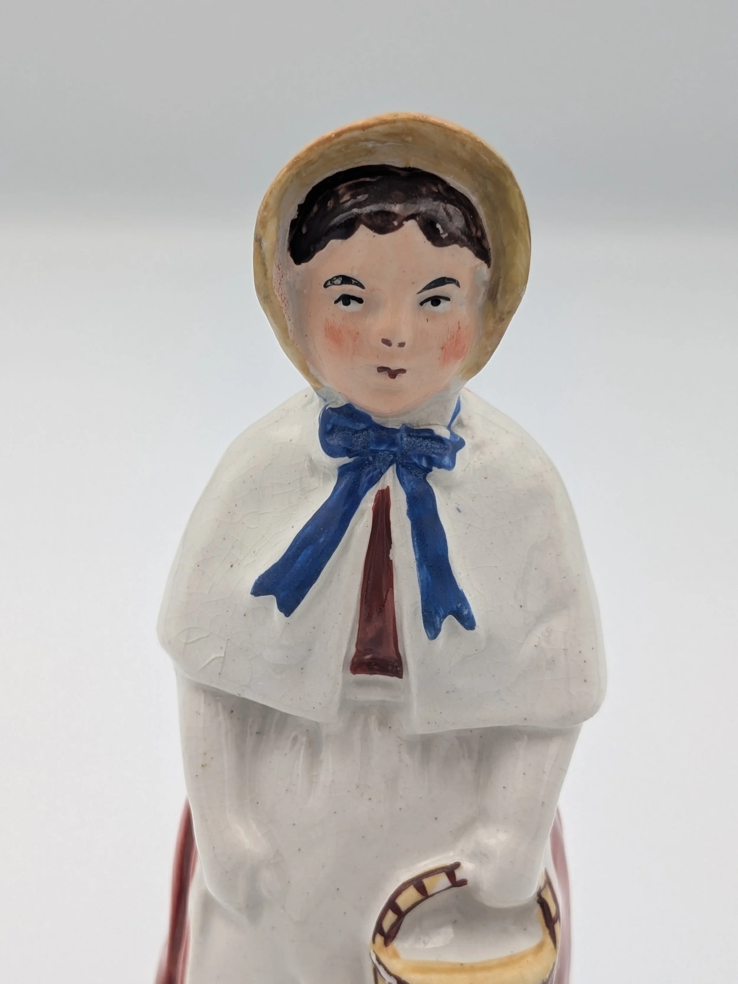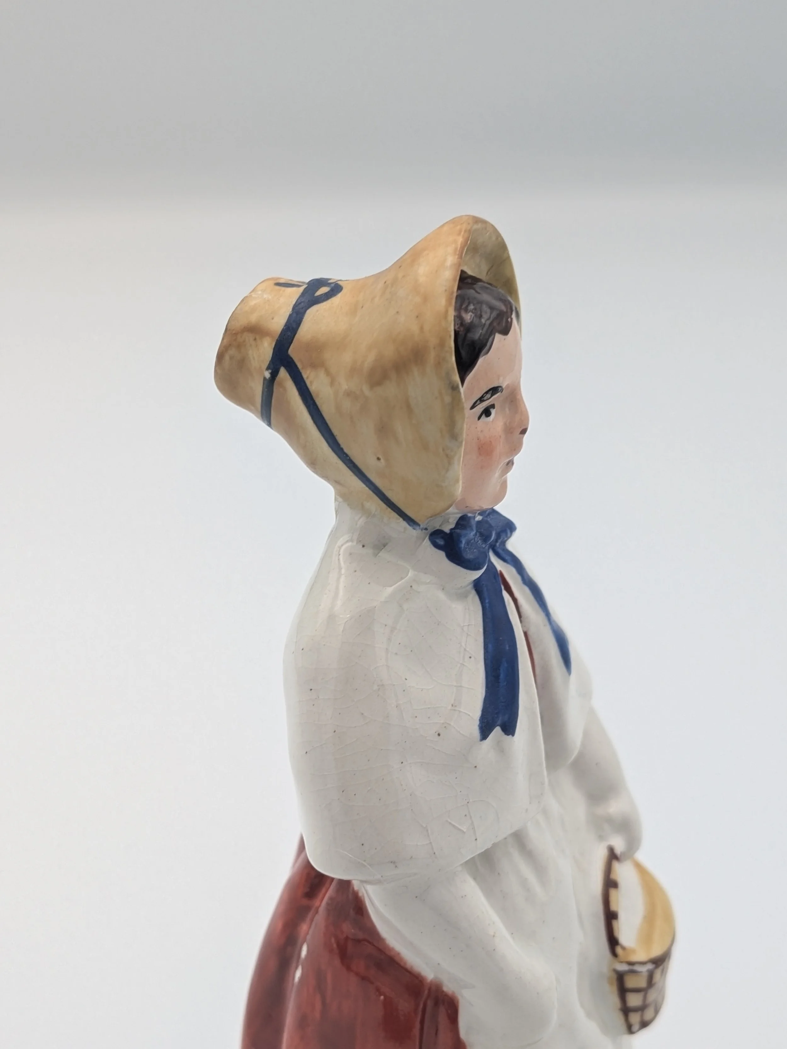 From the 1840s onwards, the market for Staffordshire figures boomed and potters moved to a simpler, more ‘streamlined’ production style, with many figures decorated on the frontside only (‘flatbacks’) and most figures being produced from a single press mould. The remarkably legible effect this simple and efficient production method could produce is one of the great attraction of Victorian Staffordshire figures.