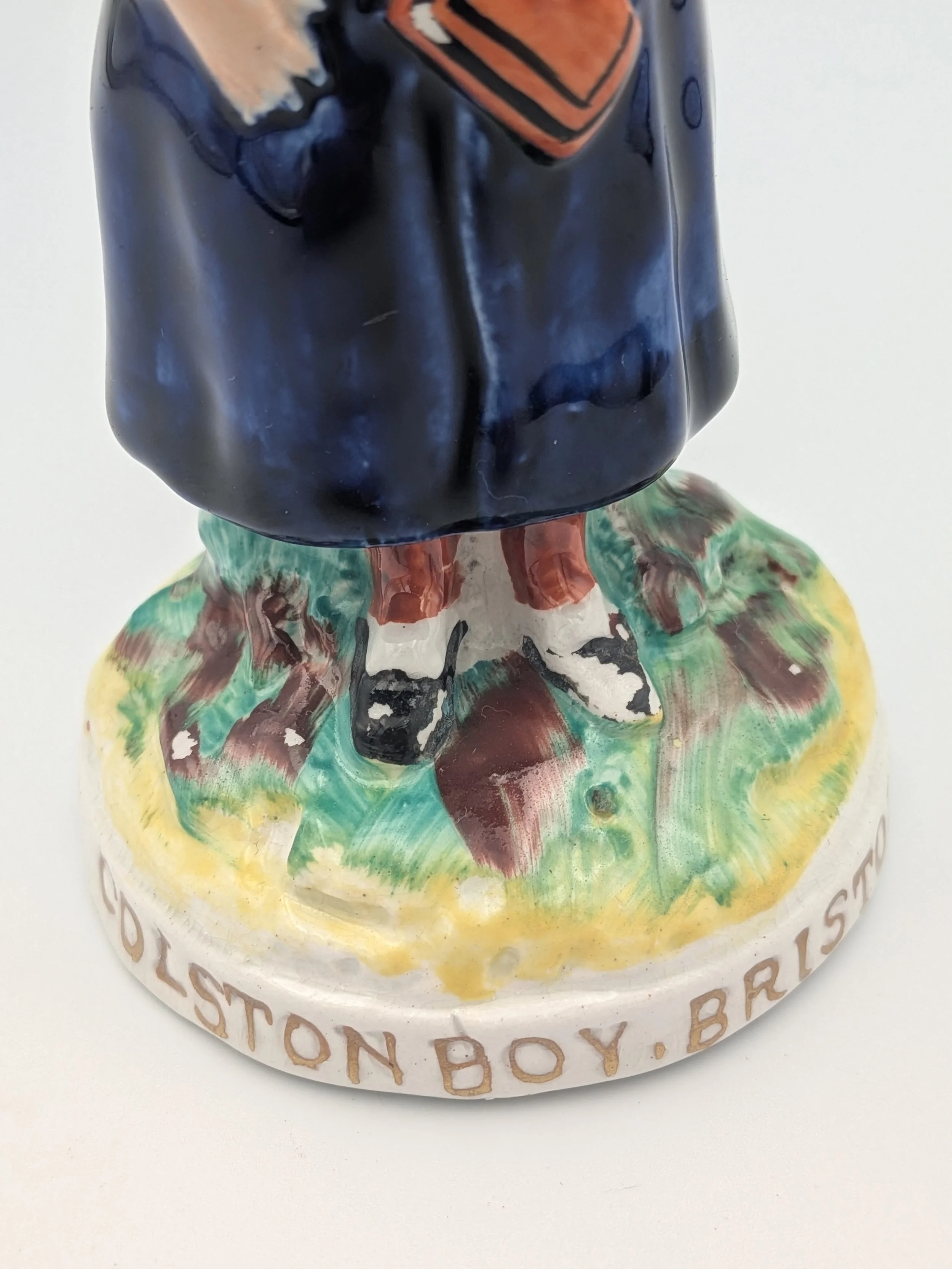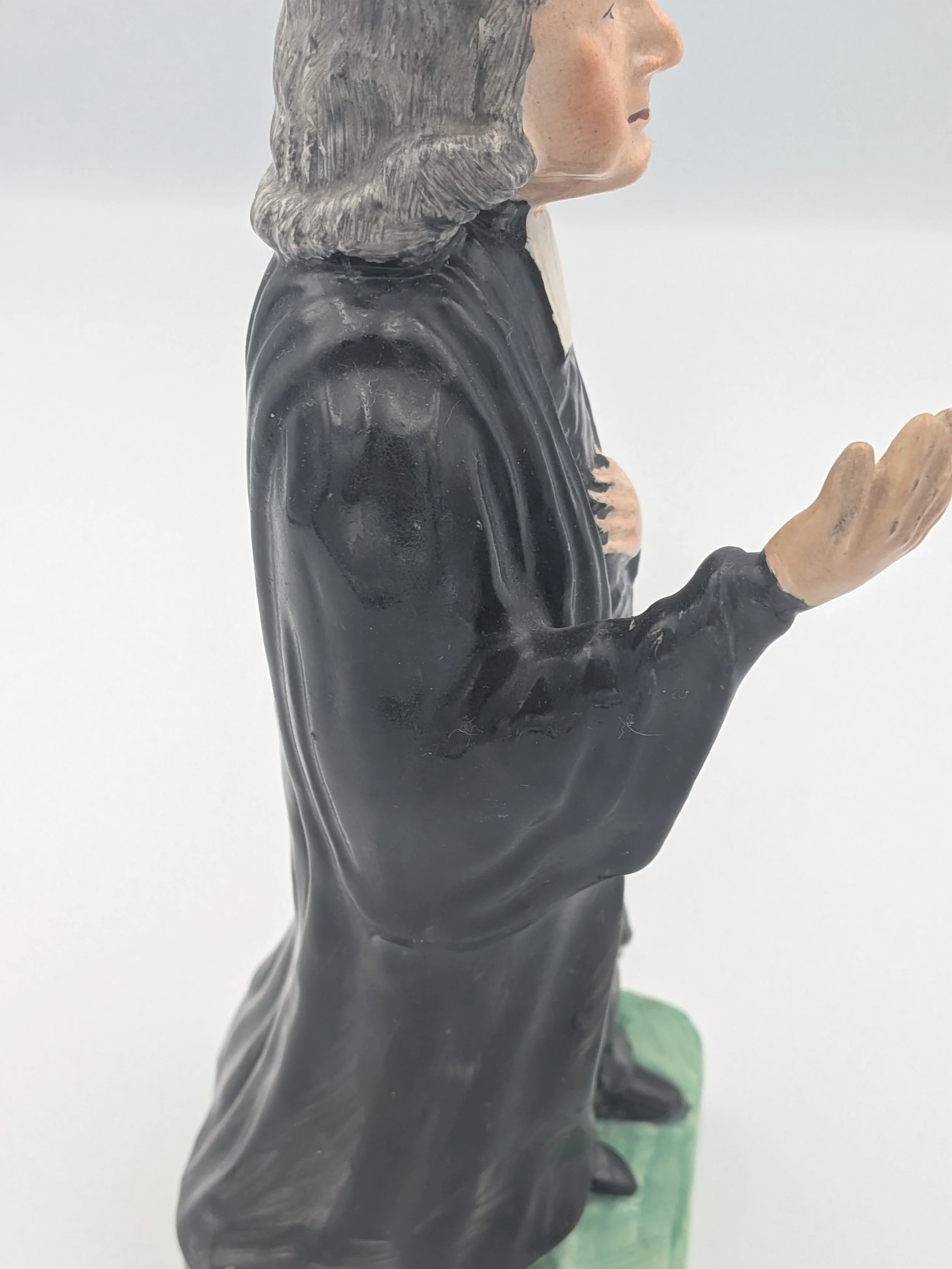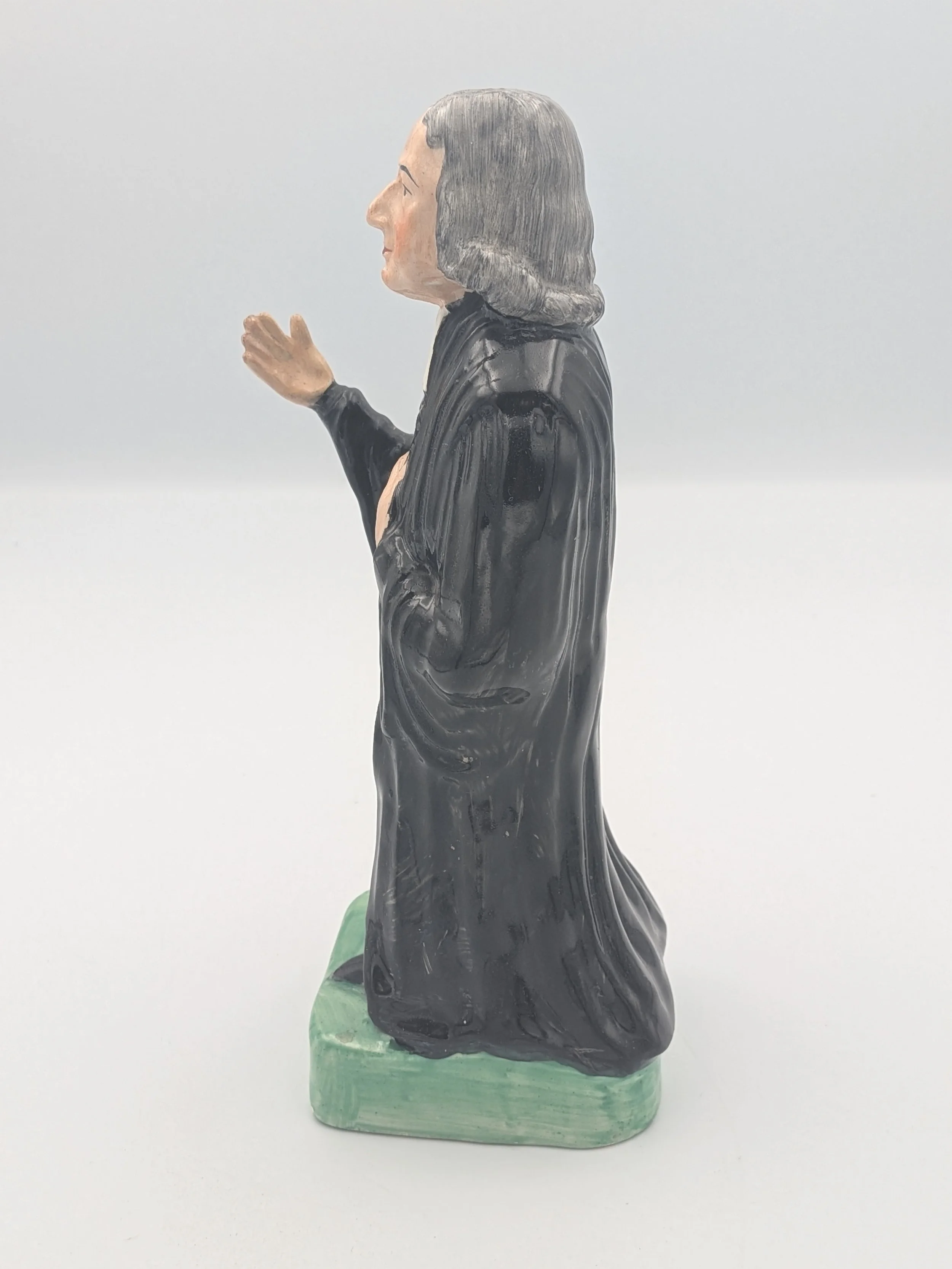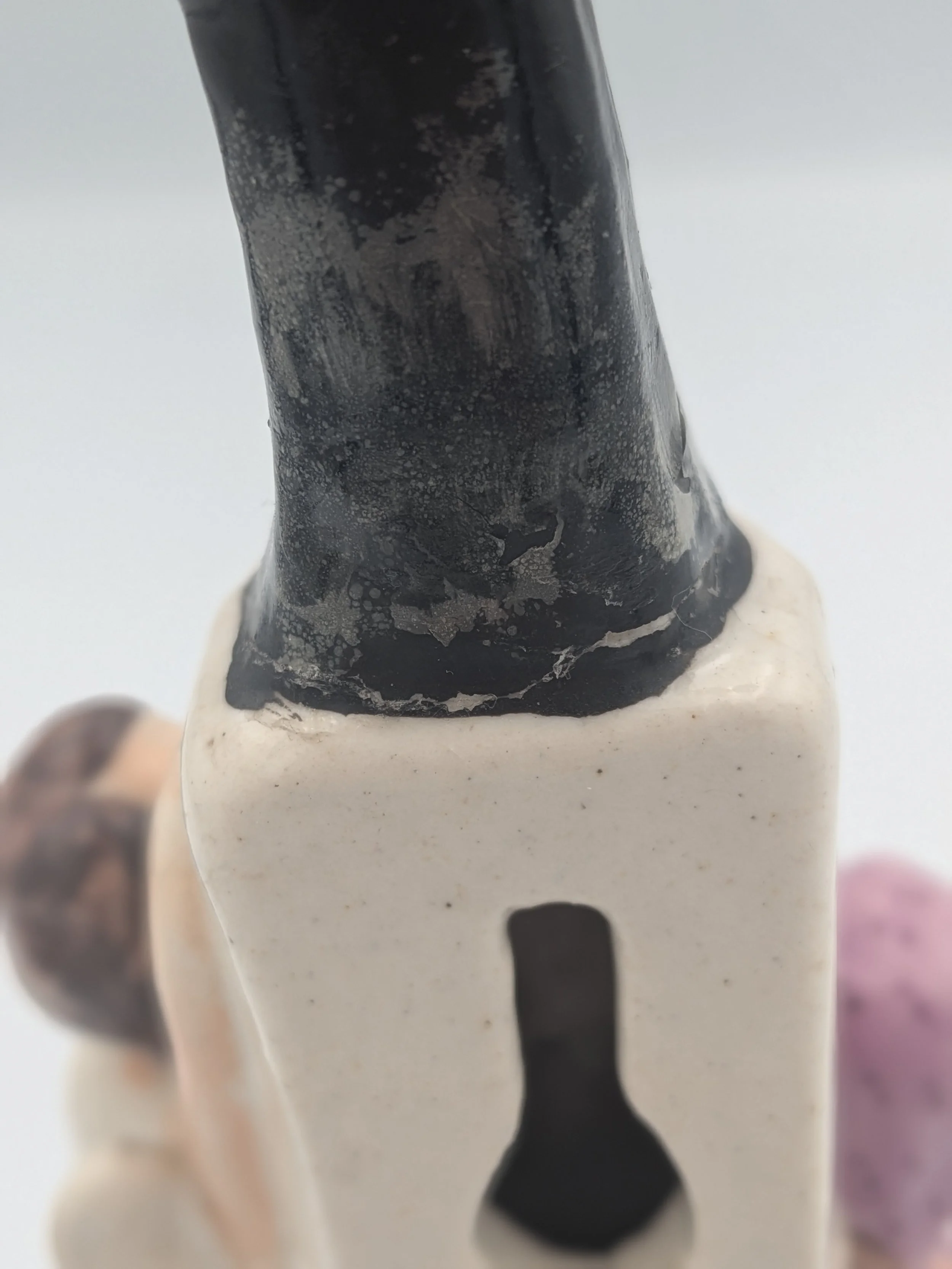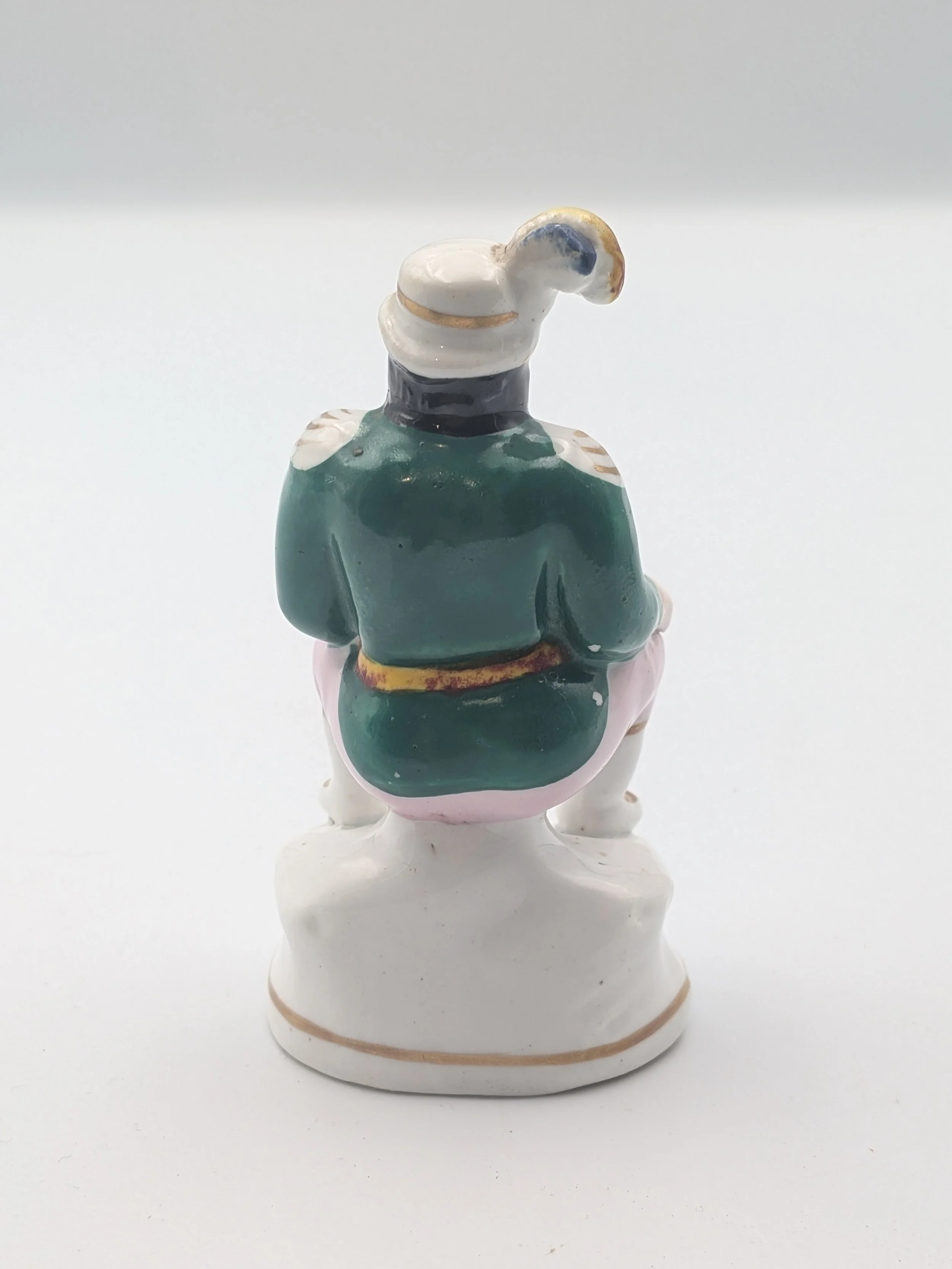 From the 1840s onwards, the market for Staffordshire figures boomed and potters moved to a simpler, more ‘streamlined’ production style, with many figures decorated on the frontside only (‘flatbacks’) and most figures being produced from a single press mould. The remarkably legible effect this simple and efficient production method could produce is one of the great attraction of Victorian Staffordshire figures.