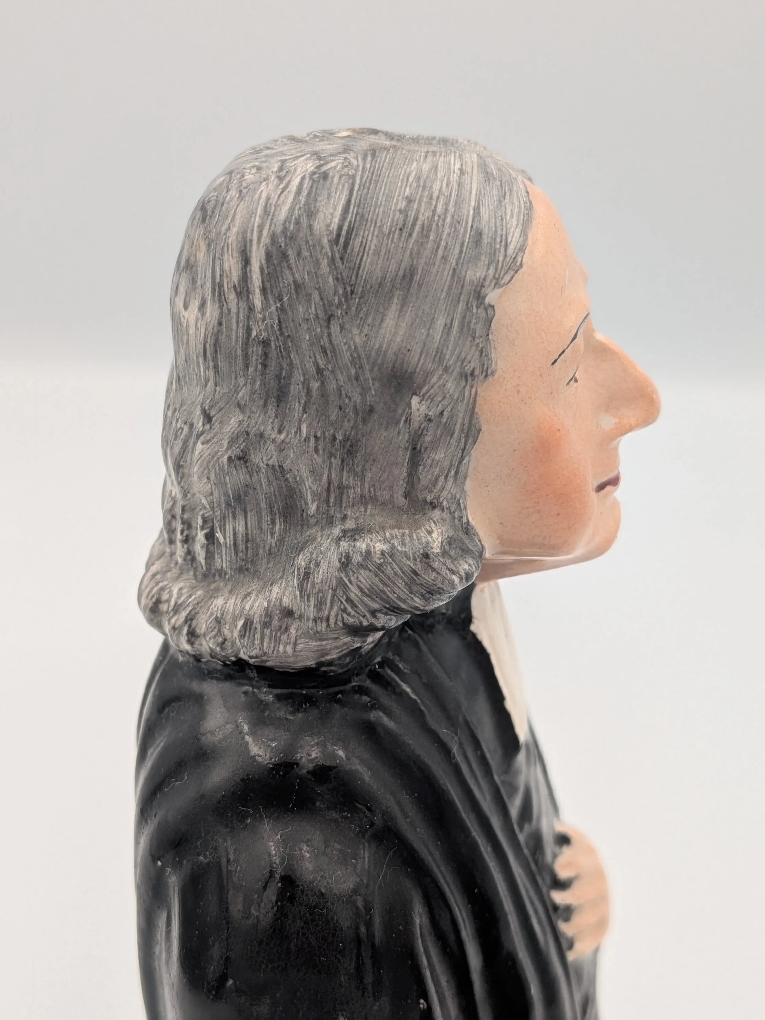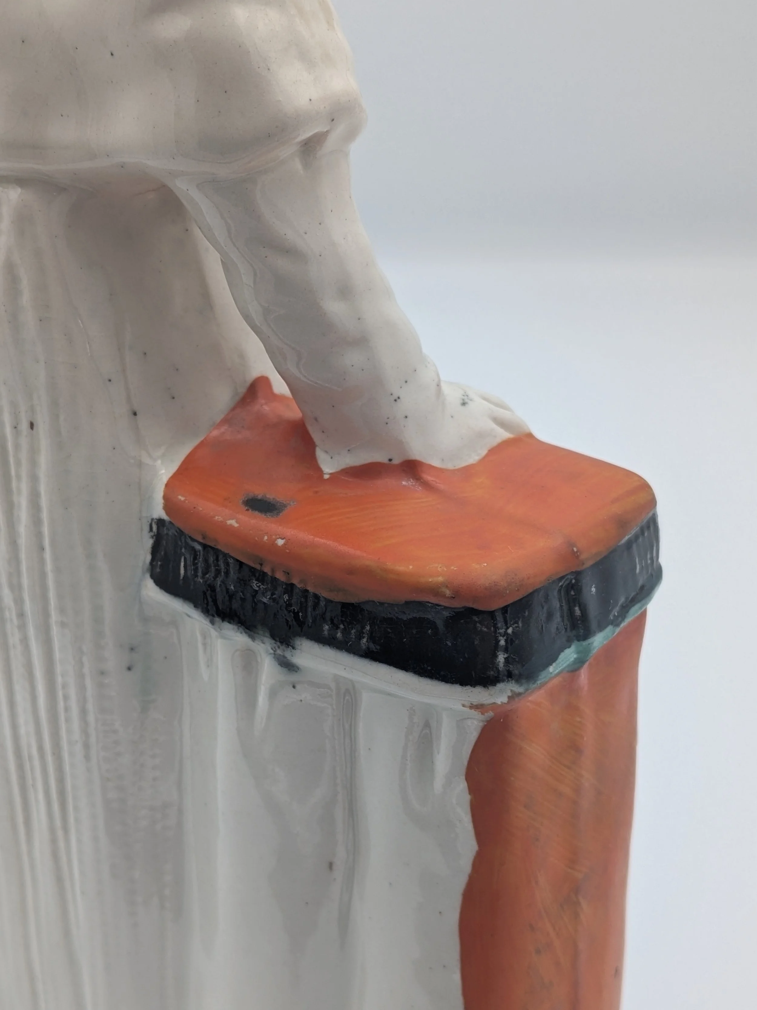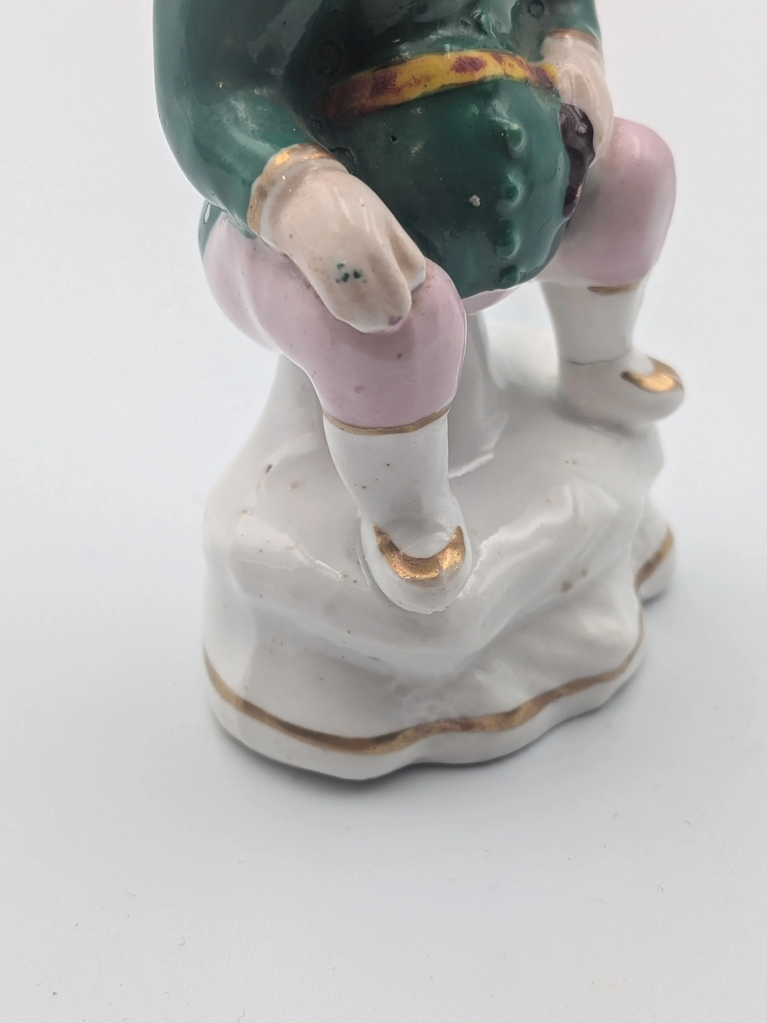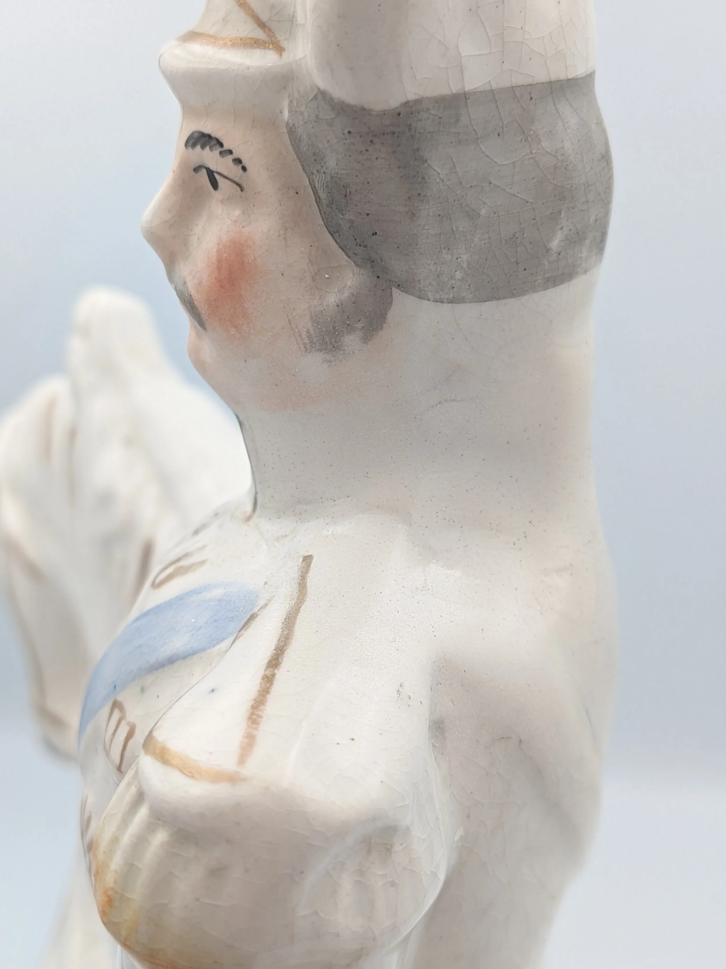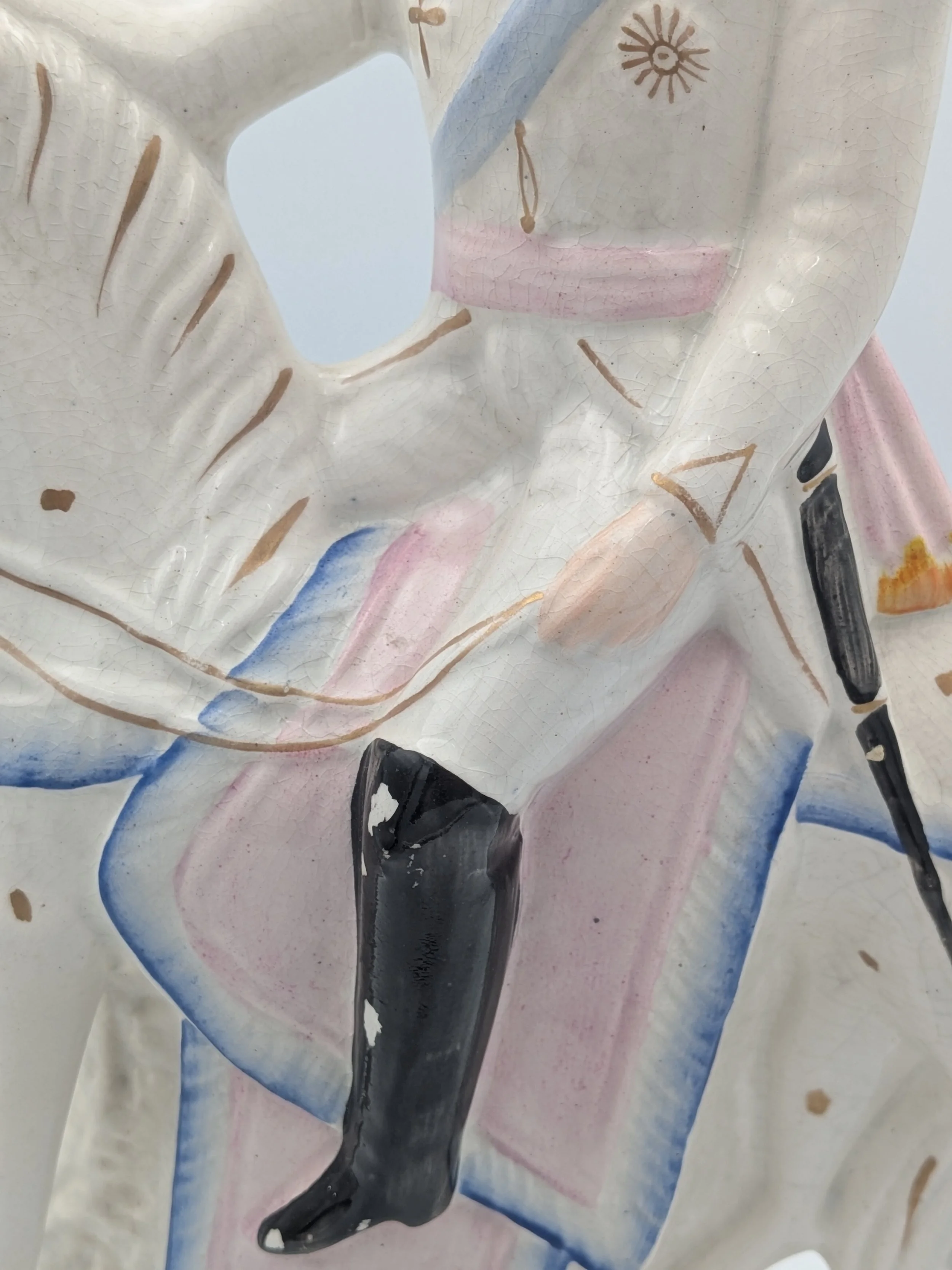 From the 1840s onwards, the market for Staffordshire figures boomed and potters moved to a simpler, more ‘streamlined’ production style, with many figures decorated on the frontside only (‘flatbacks’) and most figures being produced from a single press mould. The remarkably legible effect this simple and efficient production method could produce is one of the great attraction of Victorian Staffordshire figures.