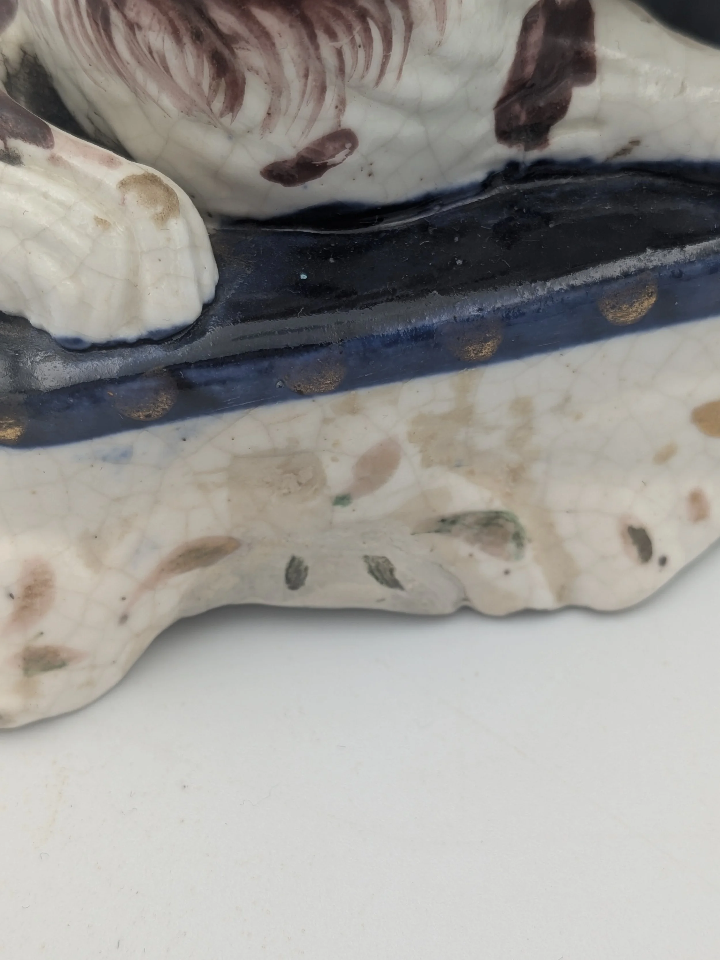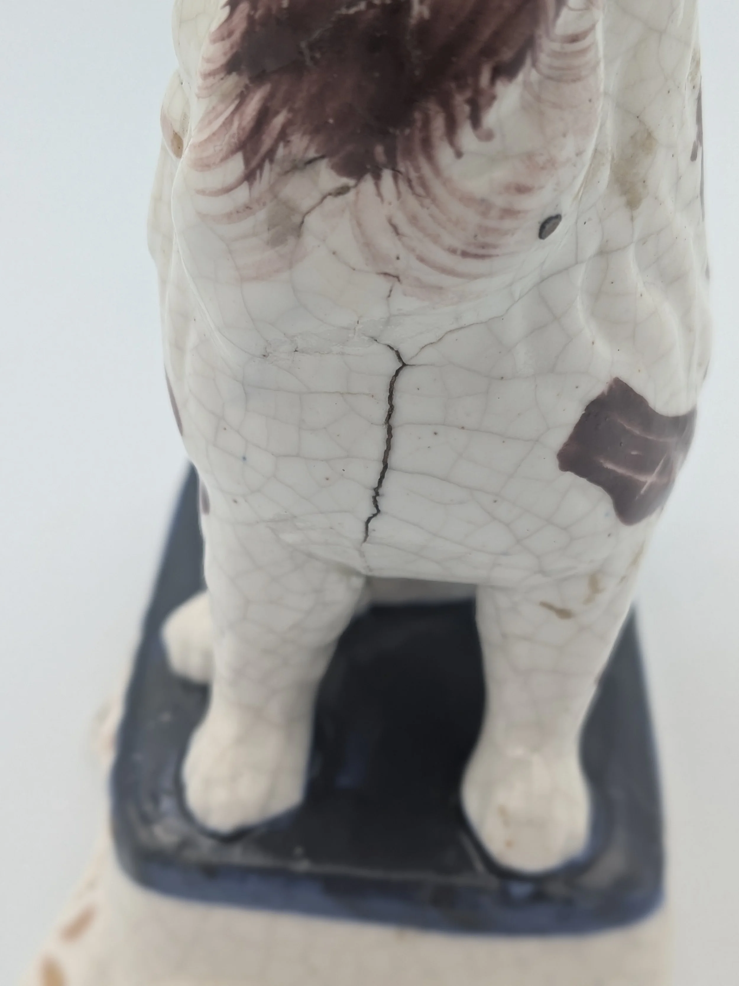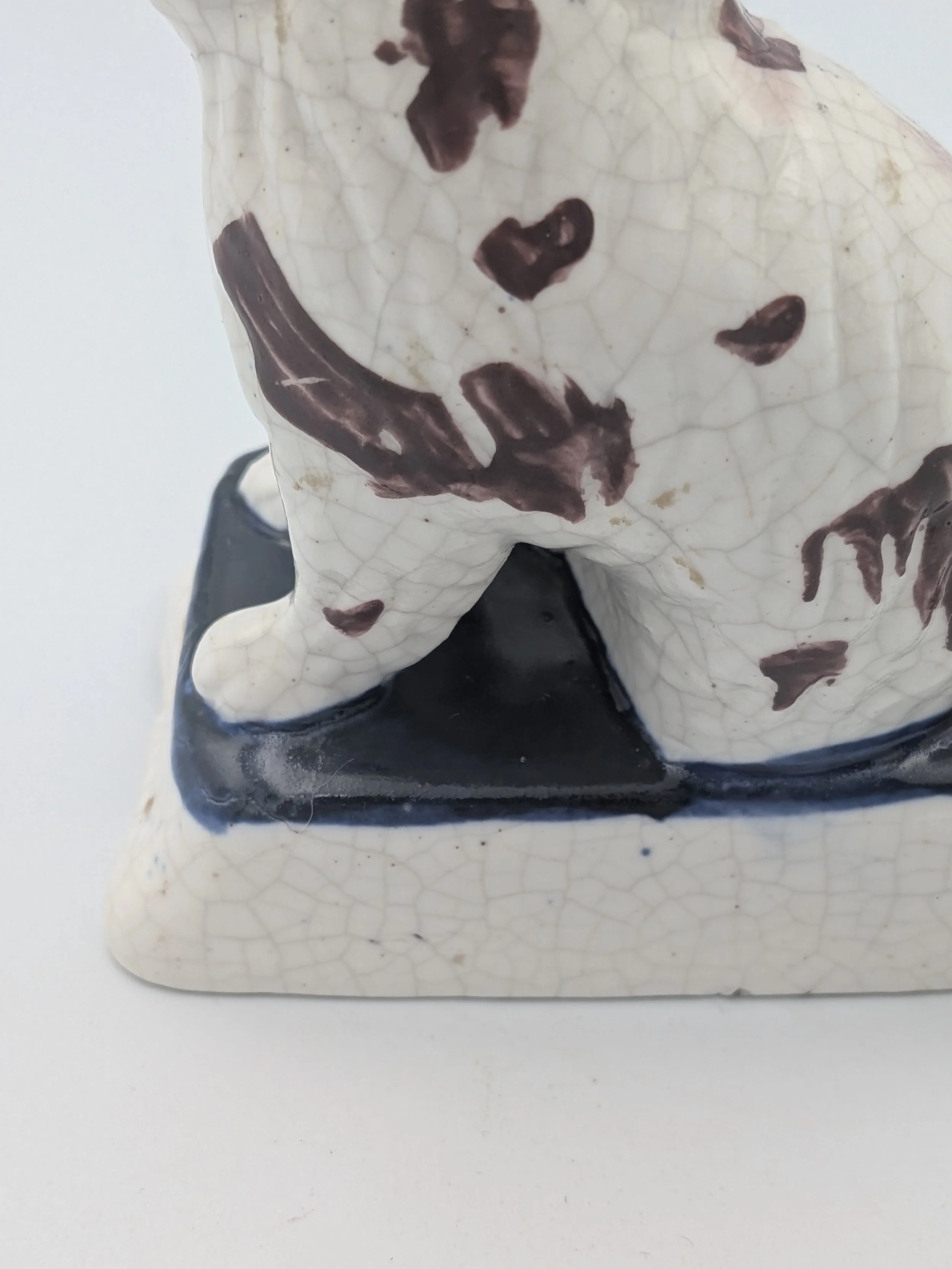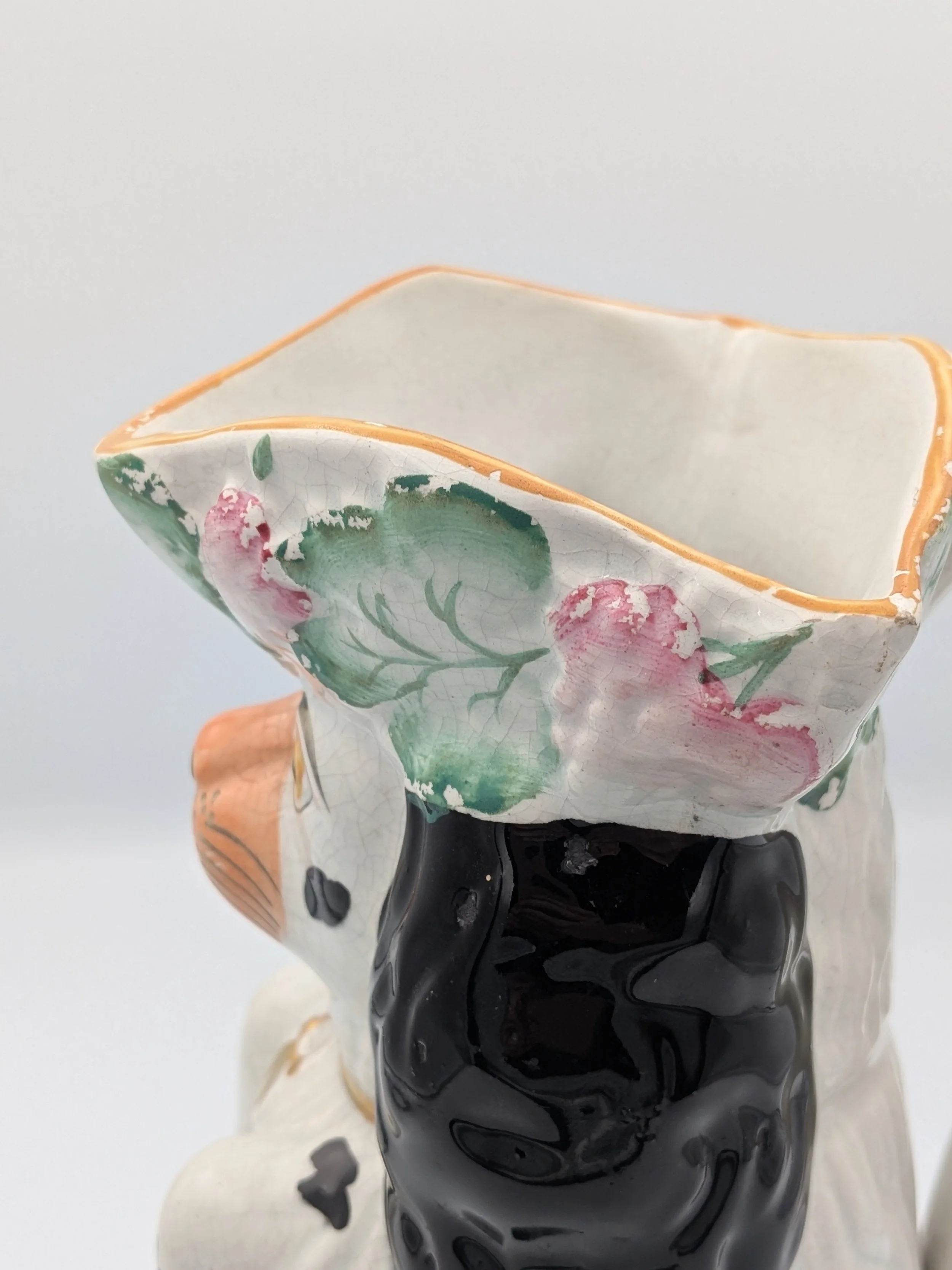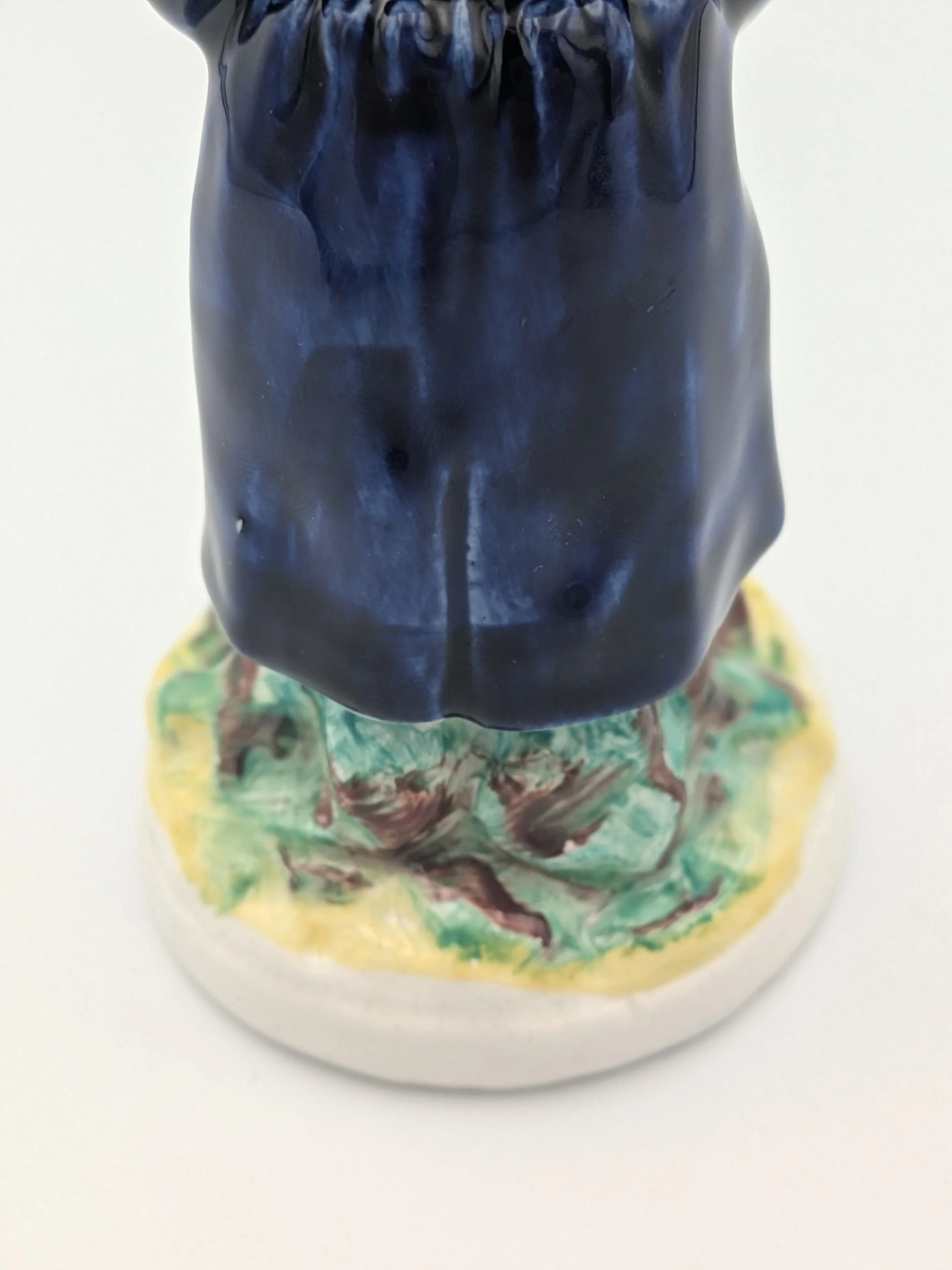 The popularity of Staffordshire figures waned towards the end of the 19th century. Figures tended to be larger and more sparsely decorated. From the end of the 19th century onwards, Staffordshire figures were ‘slip cast’ and were often spray coloured (rather than hand-painted), although the William Kent Factory continued to produce ‘Old Staffordshire Ware’ using the same production methods (and often the same moulds) as the Victorian potters well into the 20th century.