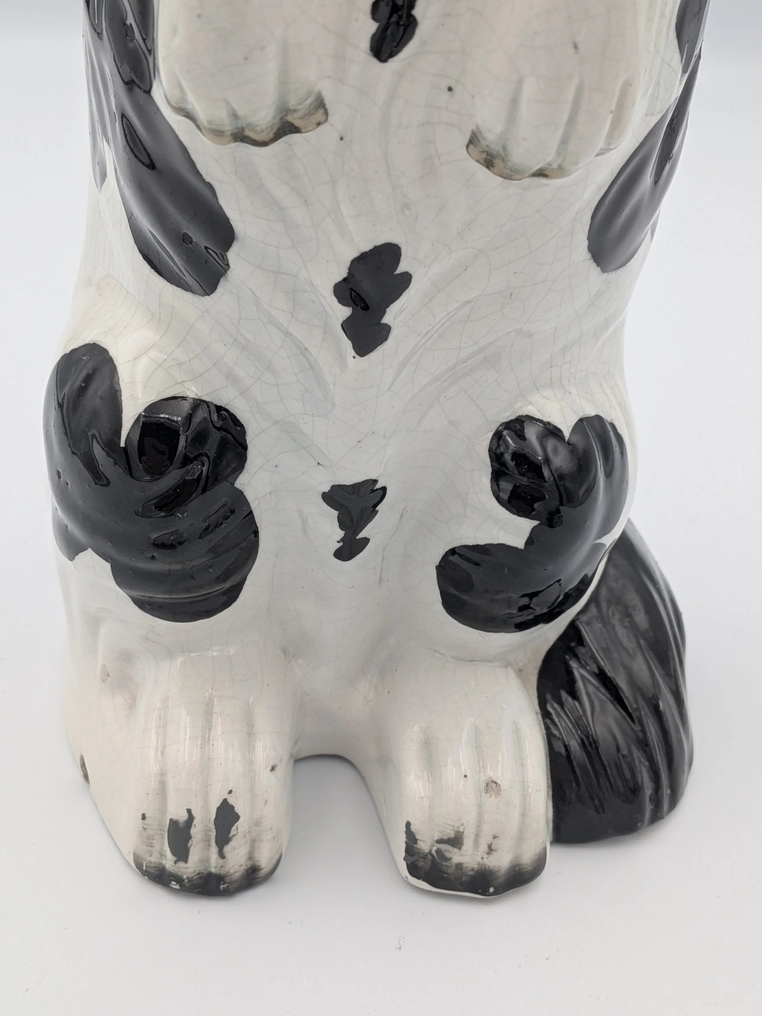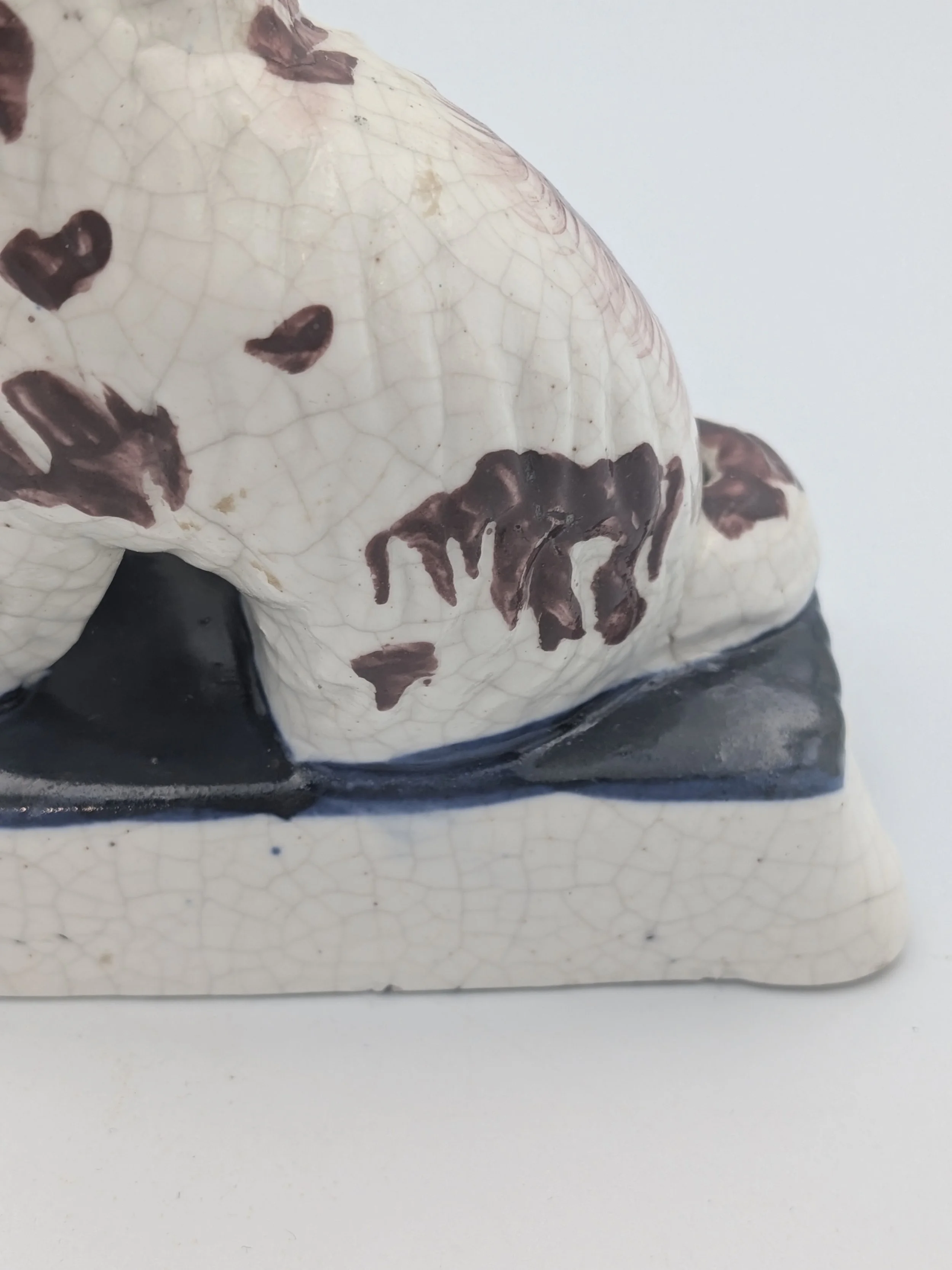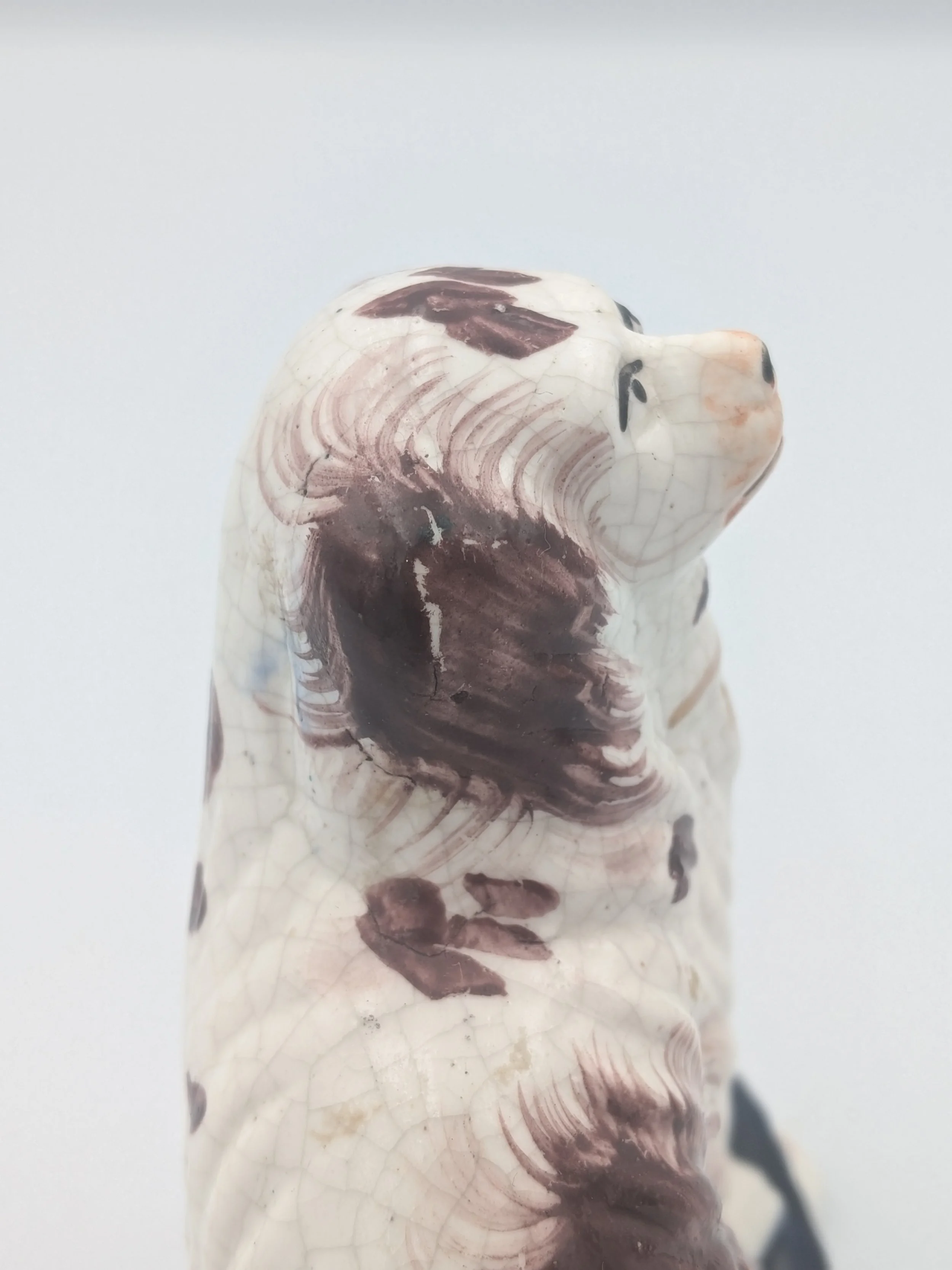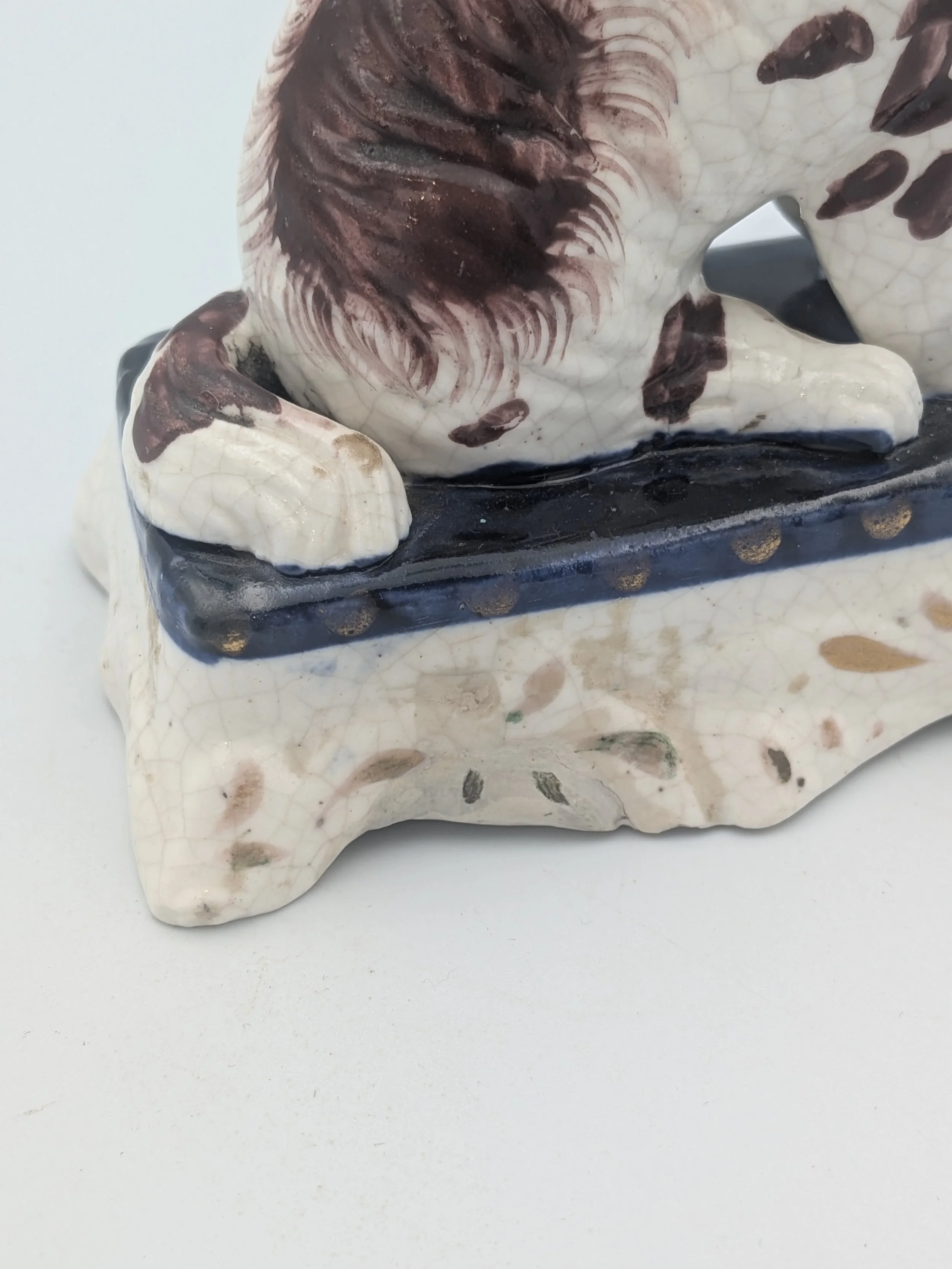The popularity of Staffordshire figures waned towards the end of the 19th century. Figures tended to be larger and more sparsely decorated. From the end of the 19th century onwards, Staffordshire figures were ‘slip cast’ and were often spray coloured (rather than hand-painted), although the William Kent Factory continued to produce ‘Old Staffordshire Ware’ using the same production methods (and often the same moulds) as the Victorian potters well into the 20th century.