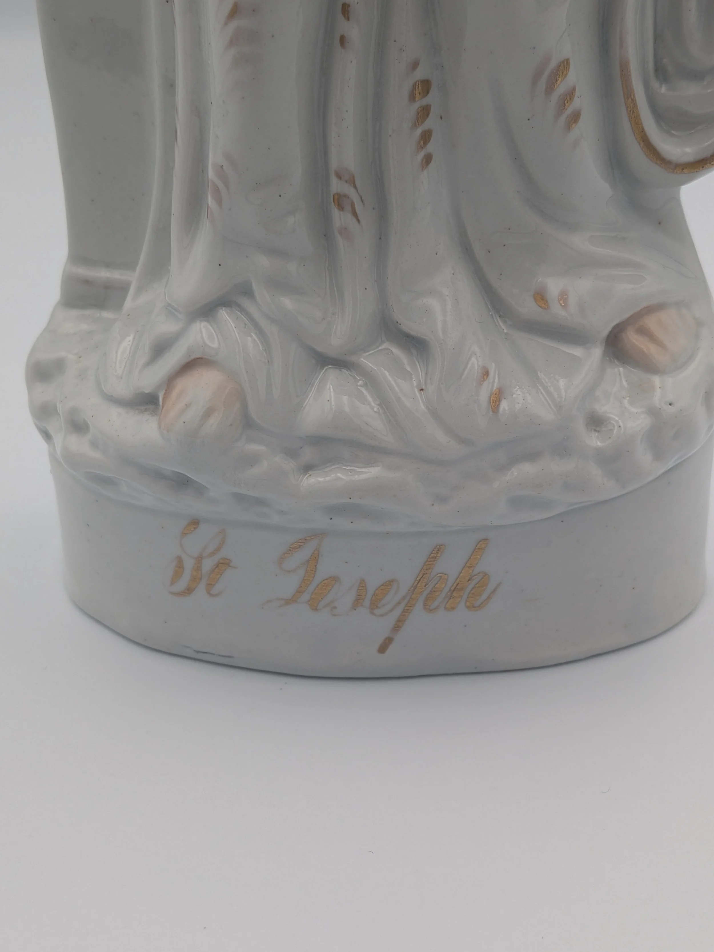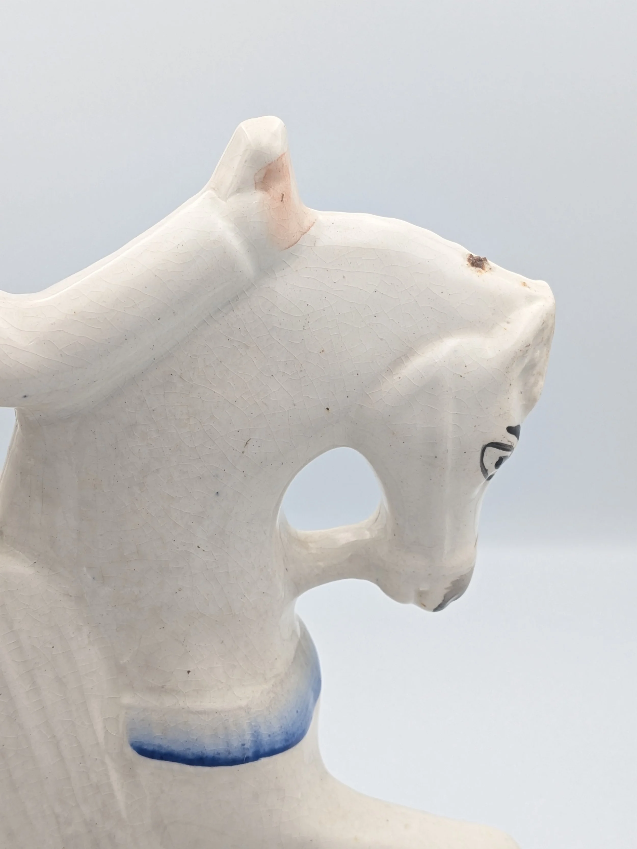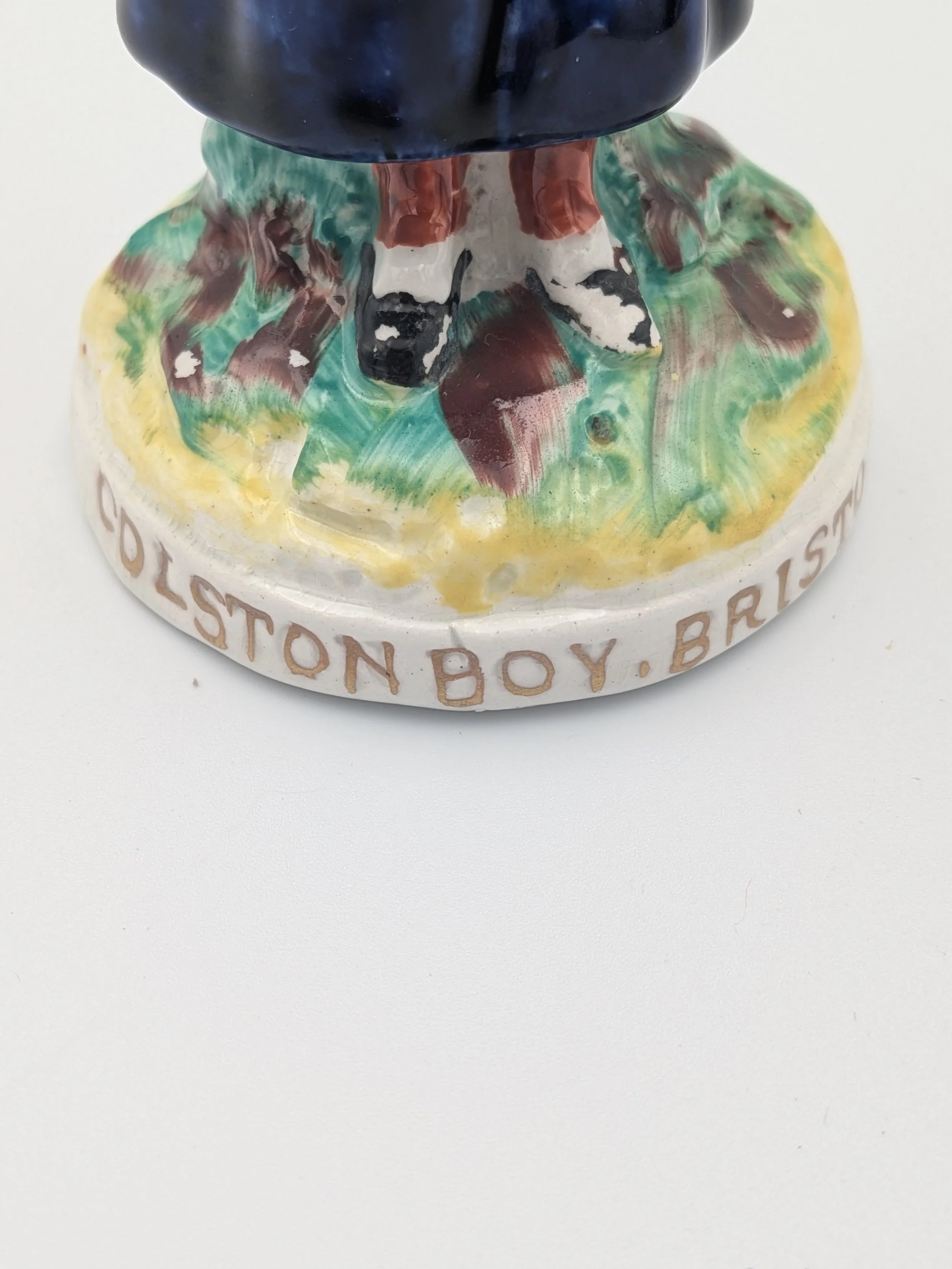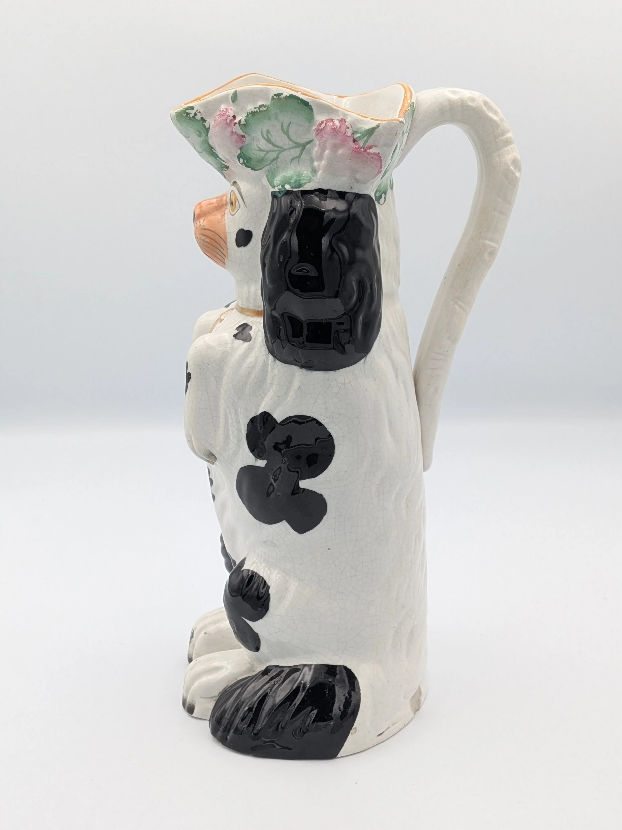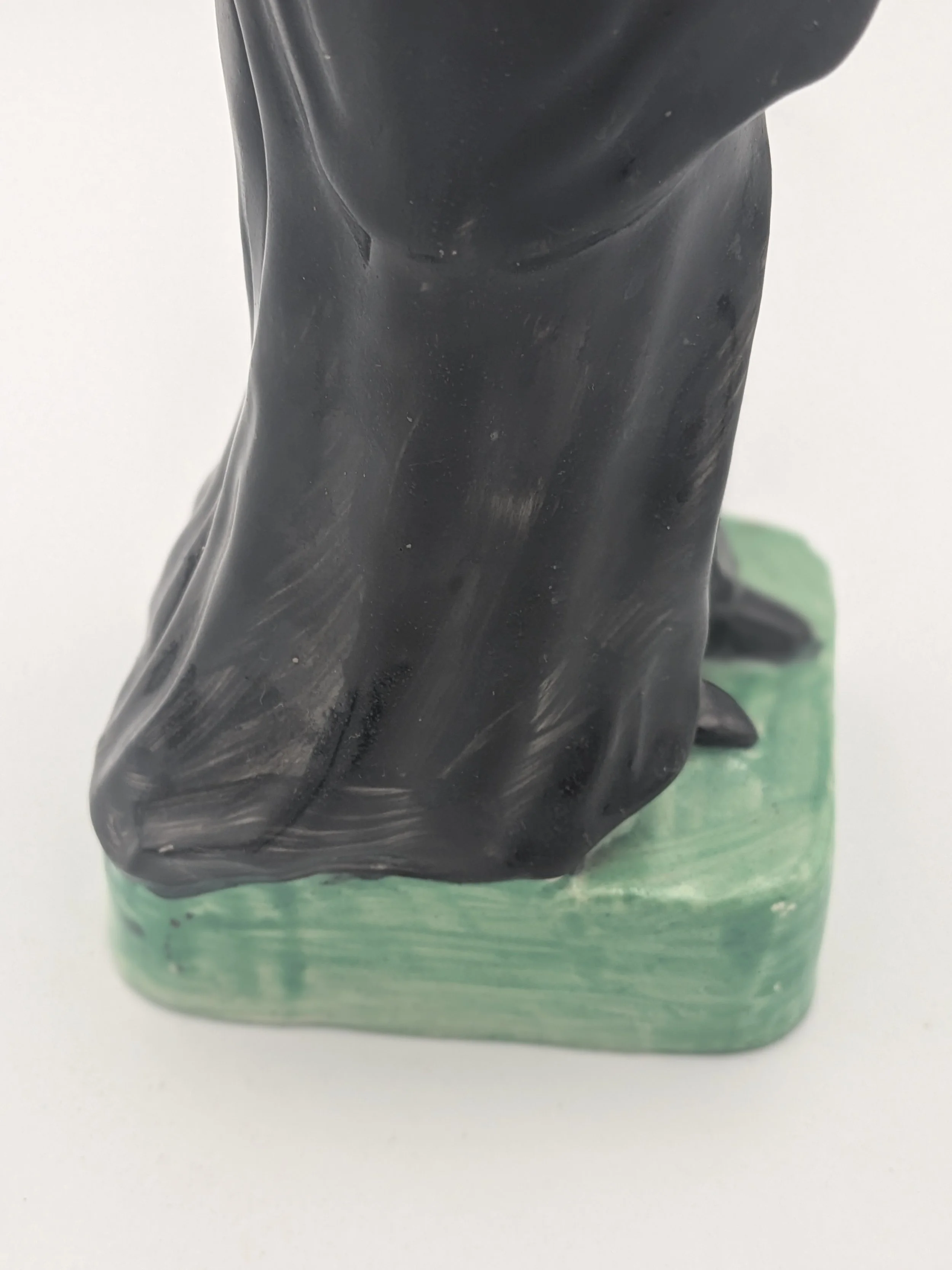 The popularity of Staffordshire figures waned towards the end of the 19th century. Figures tended to be larger and more sparsely decorated. From the end of the 19th century onwards, Staffordshire figures were ‘slip cast’ and were often spray coloured (rather than hand-painted), although the William Kent Factory continued to produce ‘Old Staffordshire Ware’ using the same production methods (and often the same moulds) as the Victorian potters well into the 20th century.