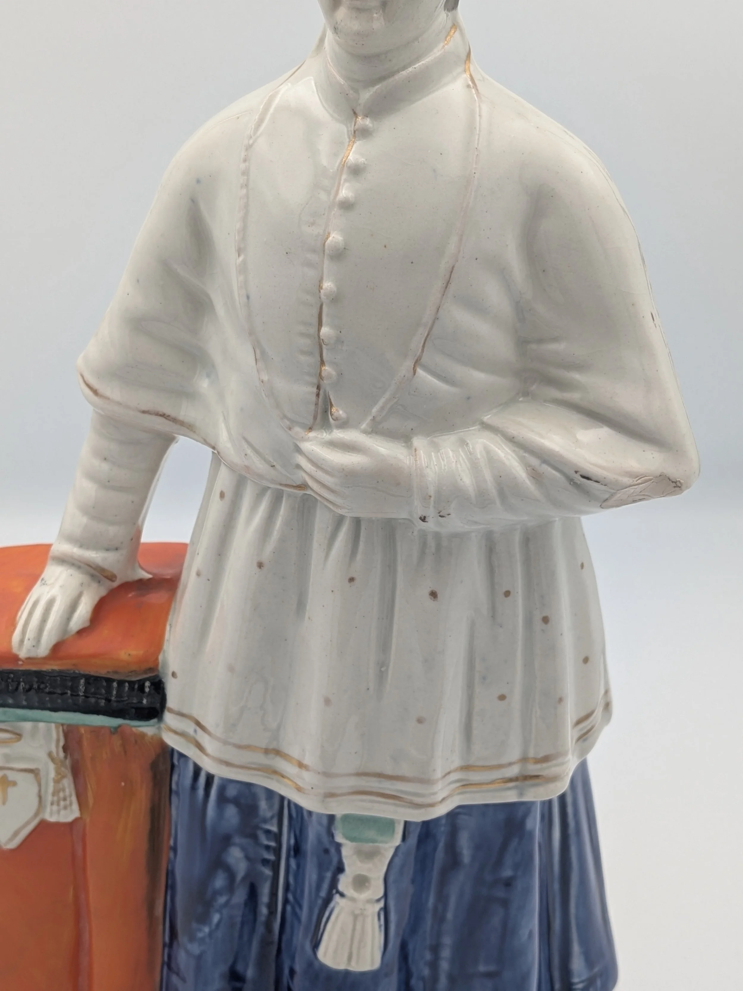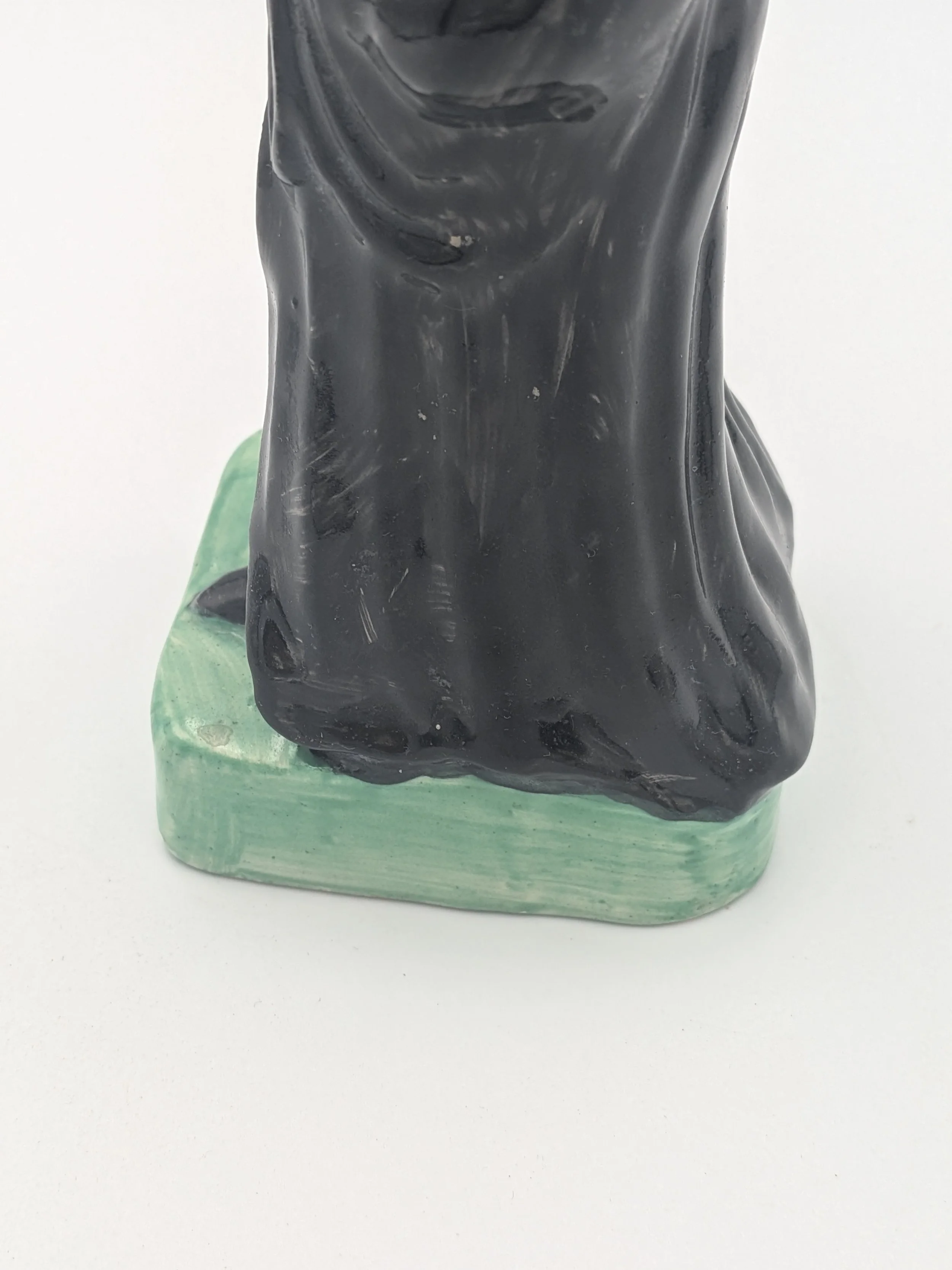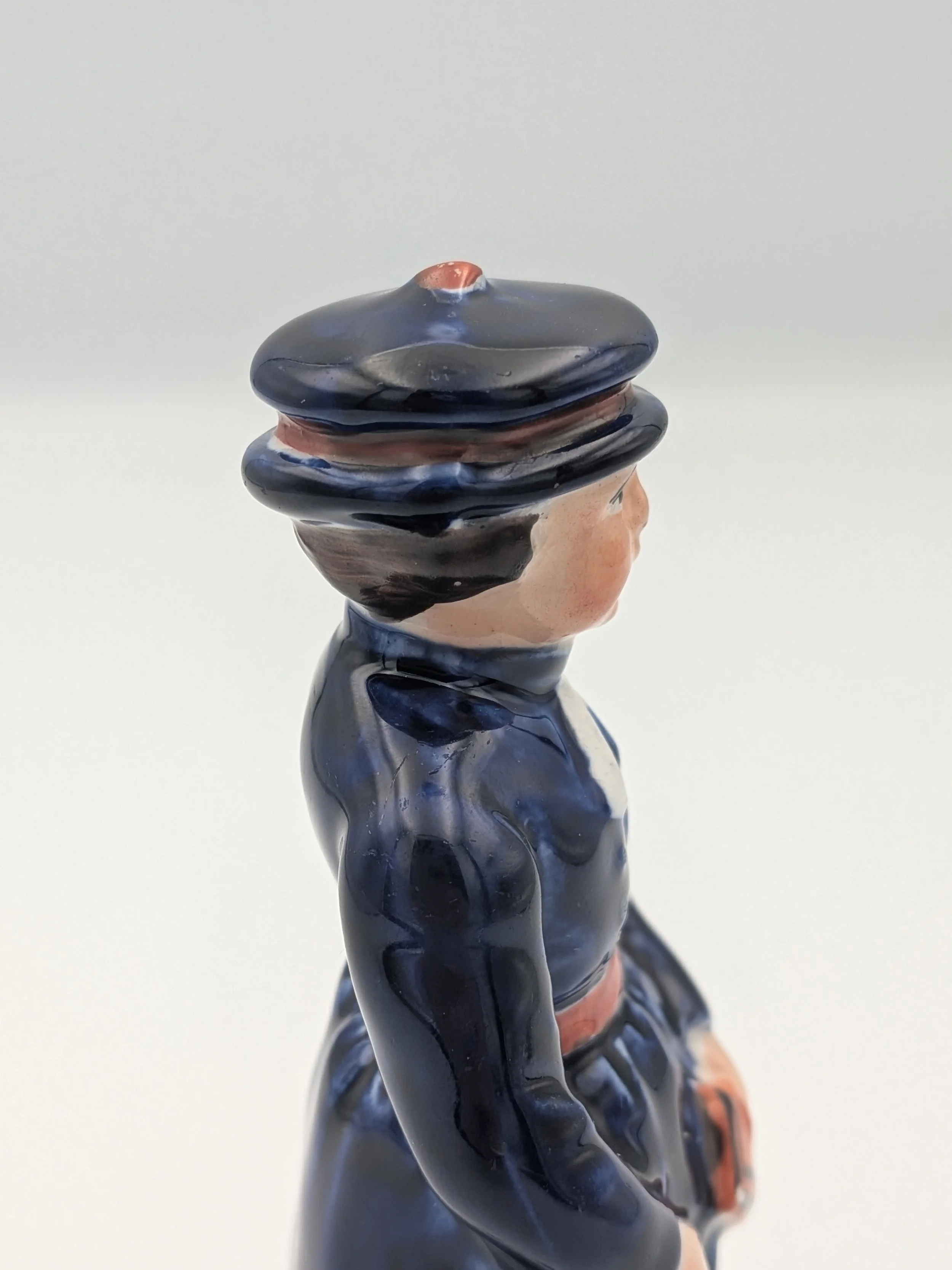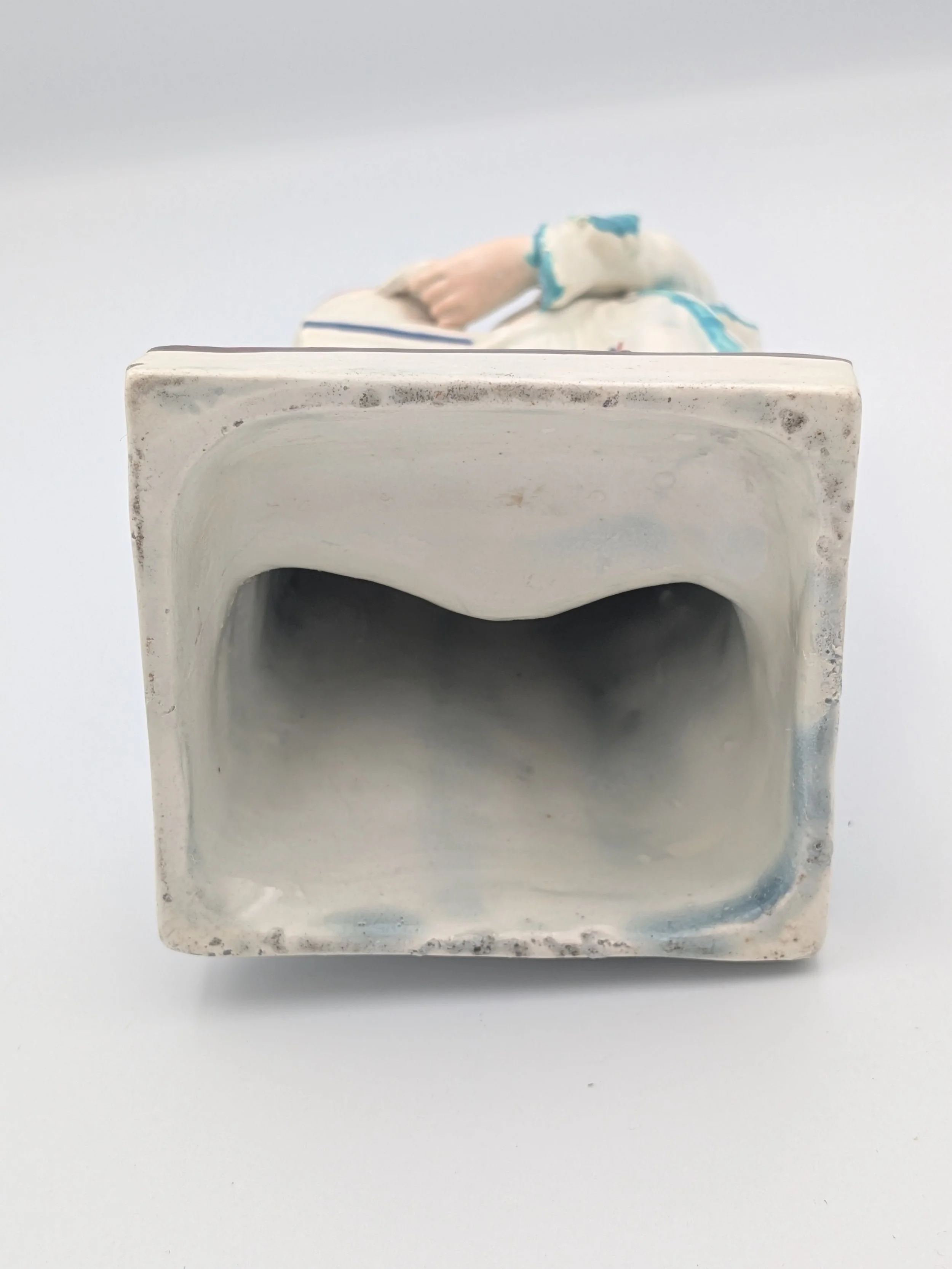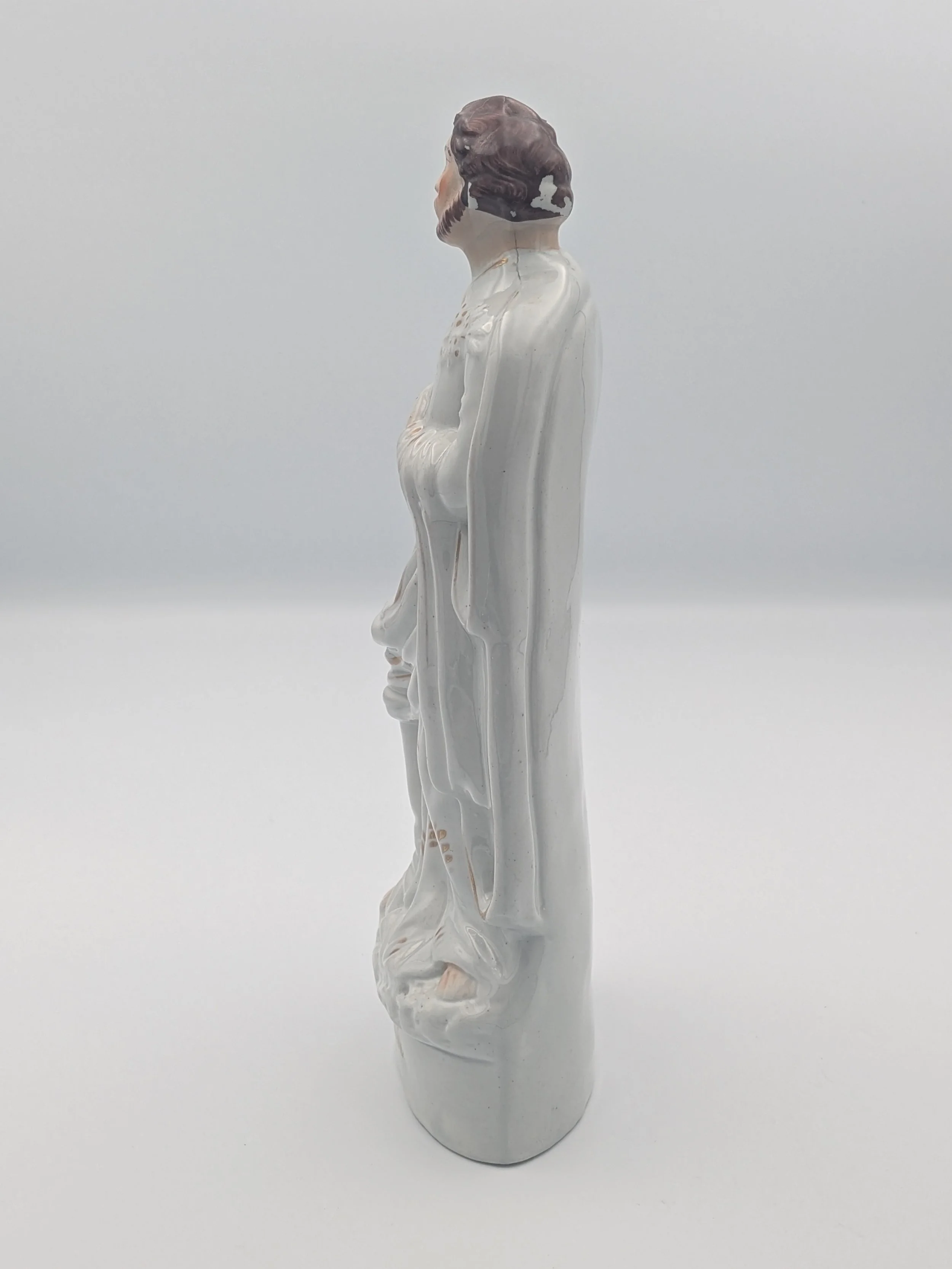 The popularity of Staffordshire figures waned towards the end of the 19th century. Figures tended to be larger and more sparsely decorated. From the end of the 19th century onwards, Staffordshire figures were ‘slip cast’ and were often spray coloured (rather than hand-painted), although the William Kent Factory continued to produce ‘Old Staffordshire Ware’ using the same production methods (and often the same moulds) as the Victorian potters well into the 20th century.